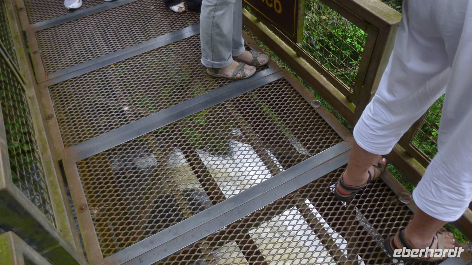 Wer jetzt noch den ultimativen Kick sucht, kann sich ganz nah an einen der Fälle herantrauen. Leider haben wir unser Duschgel nicht dabei für eine wahre Naturdusche. Wir bleiben dann doch lieber trocken. Nun sehen wir die Wasserfälle, die wir heute Vormittag von oben besichtigt haben, aus unmittelbarer Nähe. Wir laufen vorbei an Adam und Eva und den zwei Schwestern, bis wir wieder die Station der Parkbahn erreichen und unseren Weg zurück zum Hotel antreten. Dieses Naturweltwunder wird uns für immer in Erinnerung bleiben. Im Hotel zurück essen wir gemeinsam zu Abend und verabreden uns gleich zu einem Abschieds-Caipirinha auf der Dachterrasse. Diesmal in großer Runde sind gute Laune und interessante Gesprächsthemen vorprogrammiert. Unser Barkeeper jedoch ist ebenso langsam wie gestern. Diesmal bereitet er zumindest die richtige Anzahl an Getränken für uns zu. Und so feiern wir unsere vergangene Reise und stoßen an auf viele schöne Erlebnisse. Saude!