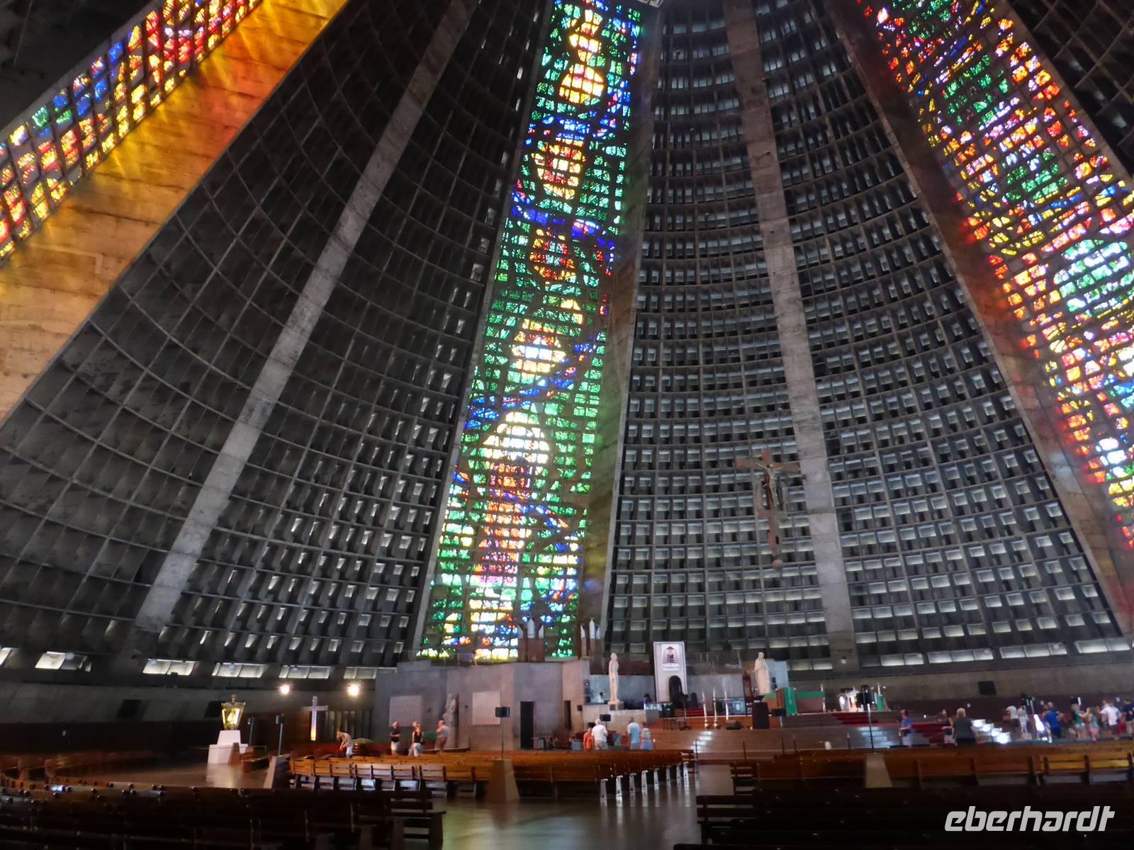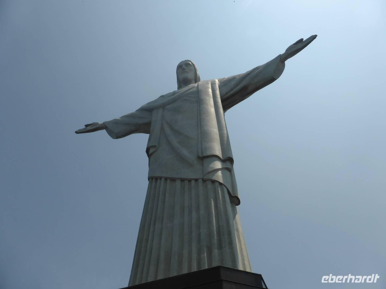 Als erstes fuhren wir zum Maracana-Stadion (Estadio Mario Filho). Einst als größtes Fußballstadion der Welt erbaut, wurde es für die Weltmeisterschaft 2014 komplett umgestaltet, verkleinert und verfügt nun über 78.000 Sitzplätze. Danach fuhren wir zum nahe gelegenen Sambodromo. Es wurde vom Architekten Oskar Niemeyer entworfen und bietet Platz für bis zu bis zu 78.000 Zuschauer und 50.000 Akteure. Seit dem Jahr 1984 feiern darin zur Faschingszeit die 12 besten Sambaschulen der 1.Liga ihren großen Auftritt. Dabei stellen die größten unter ihnen bis zu 5.000 teilnehmende Tänzerinnen und Tänzer. Vom Sambodromo fuhren wir zur Catedral Metropolitana (Catedral de Sao Sebastiao). Sie wurde während der Militärdiktatur errichtet und hat ein Fassungsvermögen von bis zu 20.000 Gläubigen. Von außen grau, einer mexikanischen Pyramide gleichend, erfreute uns im Inneren die Farbenpracht der über die gesamte Höhe reichenden gläsernen Fensterfronten, in denen abwechselnd Rot, Grün, Blau und Gelb dominierten. Von der Kathedrale fuhren wir anschließend zur Talstation des Berges Corcovado (des Buckligen). Mit einer Zahnradbahn fuhren wir durch den Parque Nacional da Tijuca hinauf zur Bergstation. Von dort ging es dann über eine Rolltreppe bis zum auf 704 Meter leigenden Sockel der Christus-Statue, deren Einweihung nach fünfjähriger Bauzeit im Jahre 1931 erfolgte. Sie zählt zu den sieben „neuen" Weltwundern. Der Erlöser breitet seine Arme aus, so als wolle er die ganze Welt begrüßen und die ihm zu Füßen liegende Stadt beschützen. Wir hatten gutes Wetter. Nur der Blick auf das Stadtzentrum und zur Copacapana war des Öfteren von Wolkenfeldern bedeckt. Von der Talstation der Bergbahn fuhren wir dann zum check in zu unserem Hotel zurück. Am Nachmittag war Freizeit zum Baden gehen, zum Ausruhen oder für einen Spaziergang am Strand. Am Abend trafen wir uns an der Hotelbar im Dachgeschoss zu einem Begrüßungs- Caipirinha und anschließend ginge es zum Abendessen in die Churrascaria "Carretao". Neben dem bereitstehenden Buffet brachten uns die Kellner große Fleischspieße an den Tisch, von denen sie an Ort und Stelle die gewünschte Menge abschnitten.