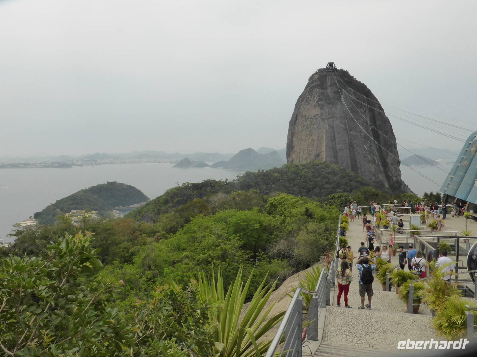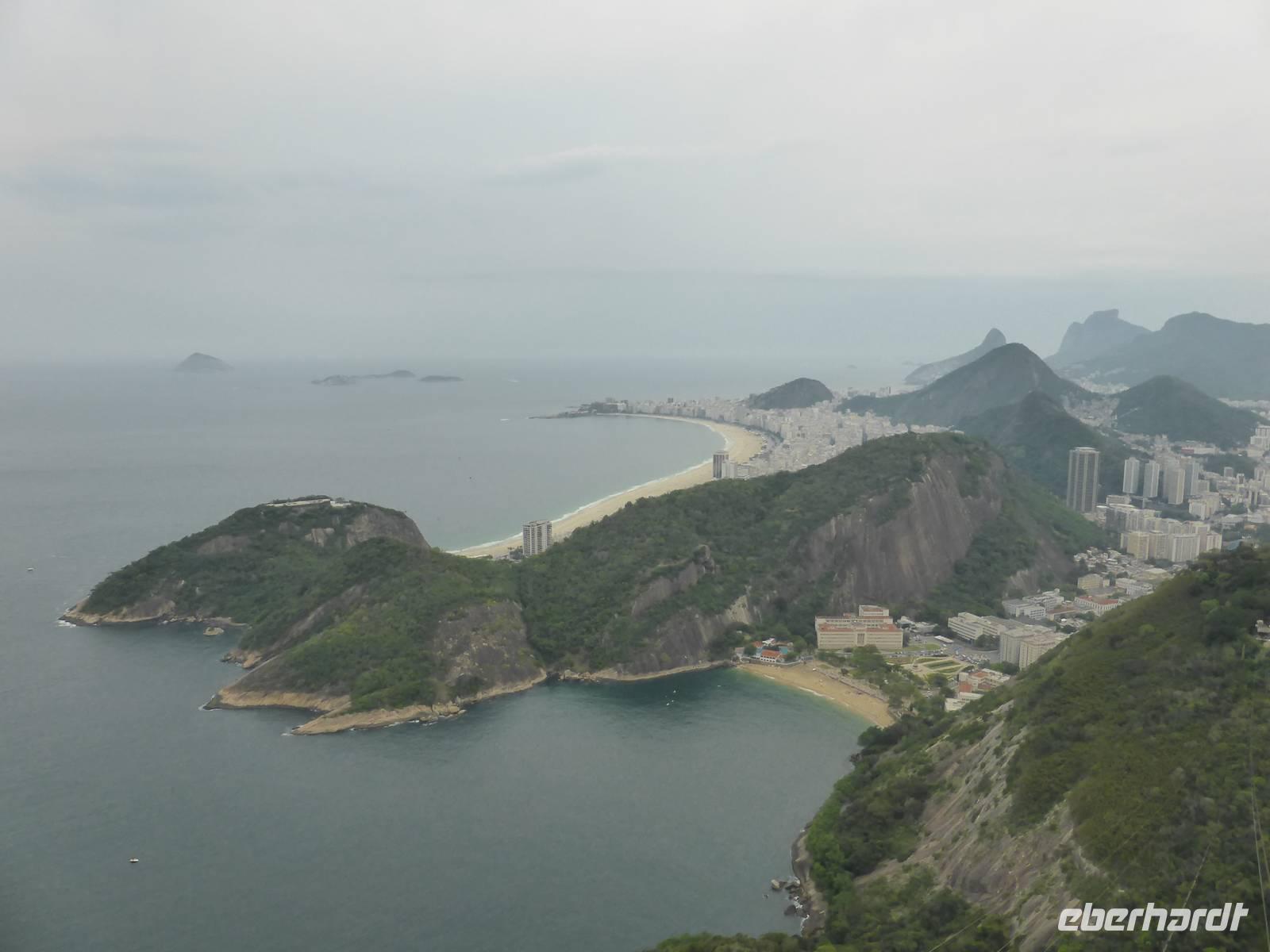 An unserem zweiten Tag in Rio fuhren wir nach dem Frühstück zum Strand von Ipanema und entlang des Lagoa Rodrigo de Freitas zum Zuckerhut. Das Gestein des Zuckerhutes besteht aus ca. 570 Millionen Jahre alten Gneis, welcher durch die Abspaltung Südamerikas von Afrika und die folgenden Bewegungen der Erdplatten an die Oberfläche gelangte. Mit zwei Seilbahnen fuhren wir bis auf knapp 400 Meter Höhe über dem Meeresspiegel und hatten einen fantastischen Blick auf das Stadtzentrum von Rio, die Nachbarstadt Niteroi, auf die Copacabana und den Corcovado. Über uns zogen Aasgeier und Fregattvögel ihre Kreise und aus den Bäumen schauten neugierige kleine Büschelaffen.