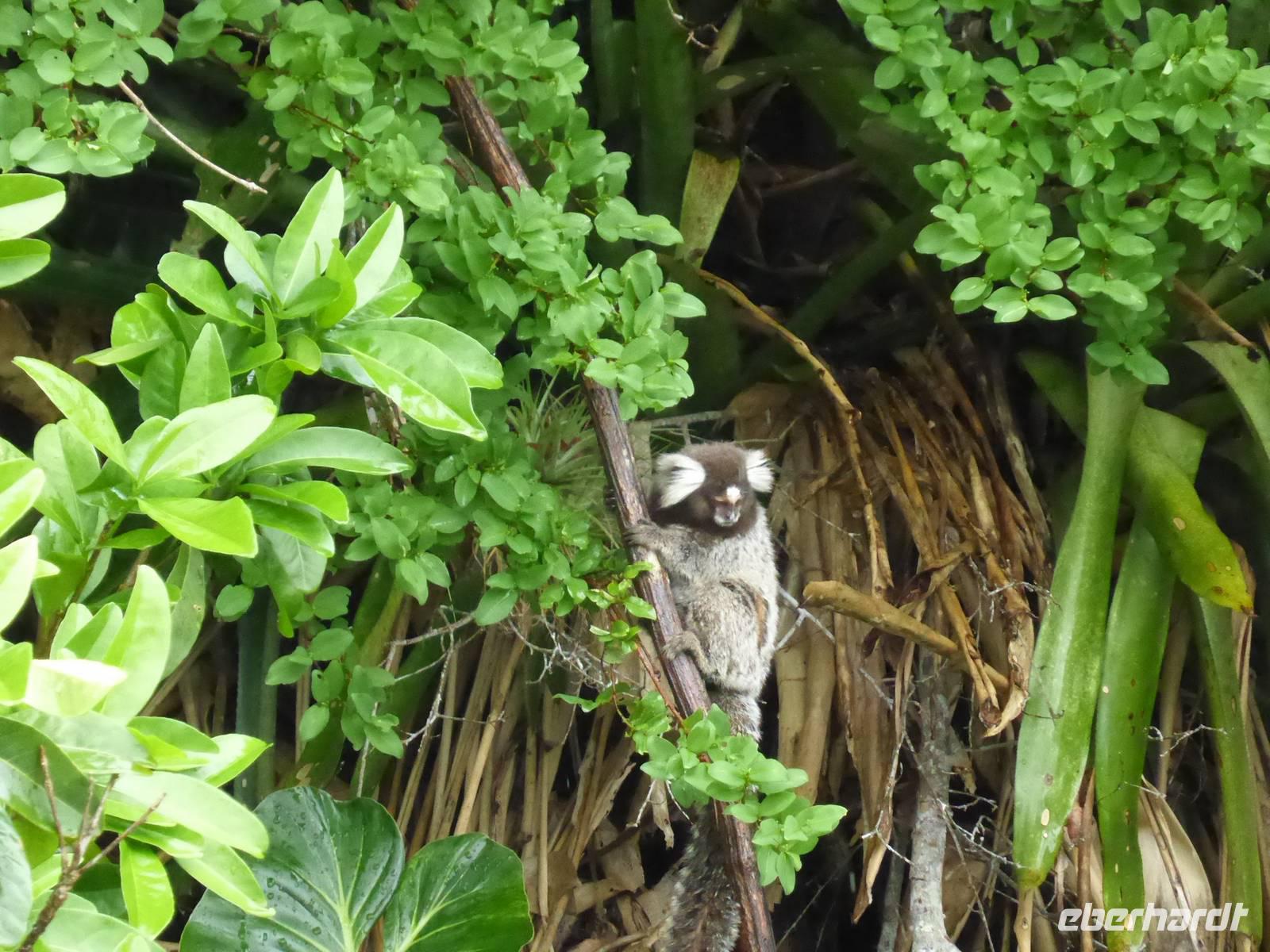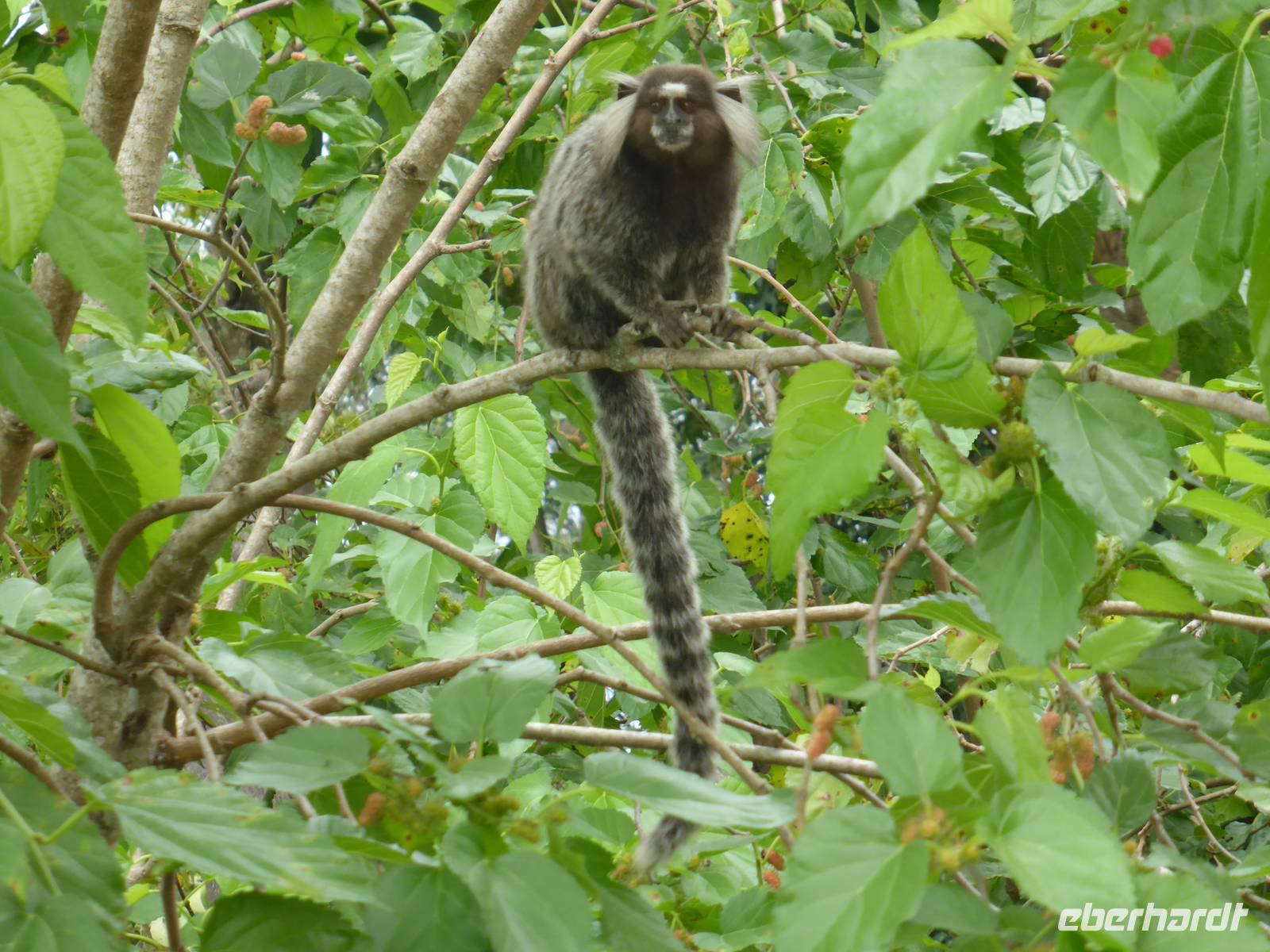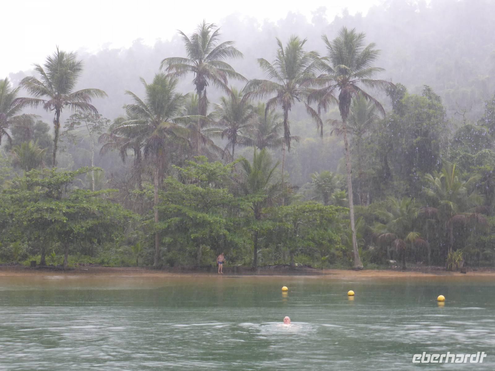 Am heutigen Tag stand ein Ausflug mit einem Segelboot auf dem Programm. Leider nieselte es schon auf dem Weg zum Schiff. Um 10.00 Uhr starteten wir unsere Bootsfahrt auf der Neptuno III. und es ging zum Strand von Jurumirin. Bei sonnigem Wetter wären an dieser paradiesischen Bucht sicherlich alle mit ins Wasser gesprungen und zum Ufer geschwommen. Da es aber regnete, trauten sich nur wenige. Das Wasser war mit circa 20 Grad Wassertemperatur angenehm warm und sehr sauber. Fische oder Korallen sahen wir allerdings nicht. Von der Bucht ging es mit dem Boot weiter zur Insel „Ilha do Mantimento". Wir ankerten vor ihr und stiegen in ein kleines Ruderboot um. Dadurch konnten wir näher an das Ufer heranfahren. Durch einige Bananen angelockt, konnten wir seltene rote Löwenäffchen, Agutis (Nagetiere) und auch Büscheläffchen sehen.