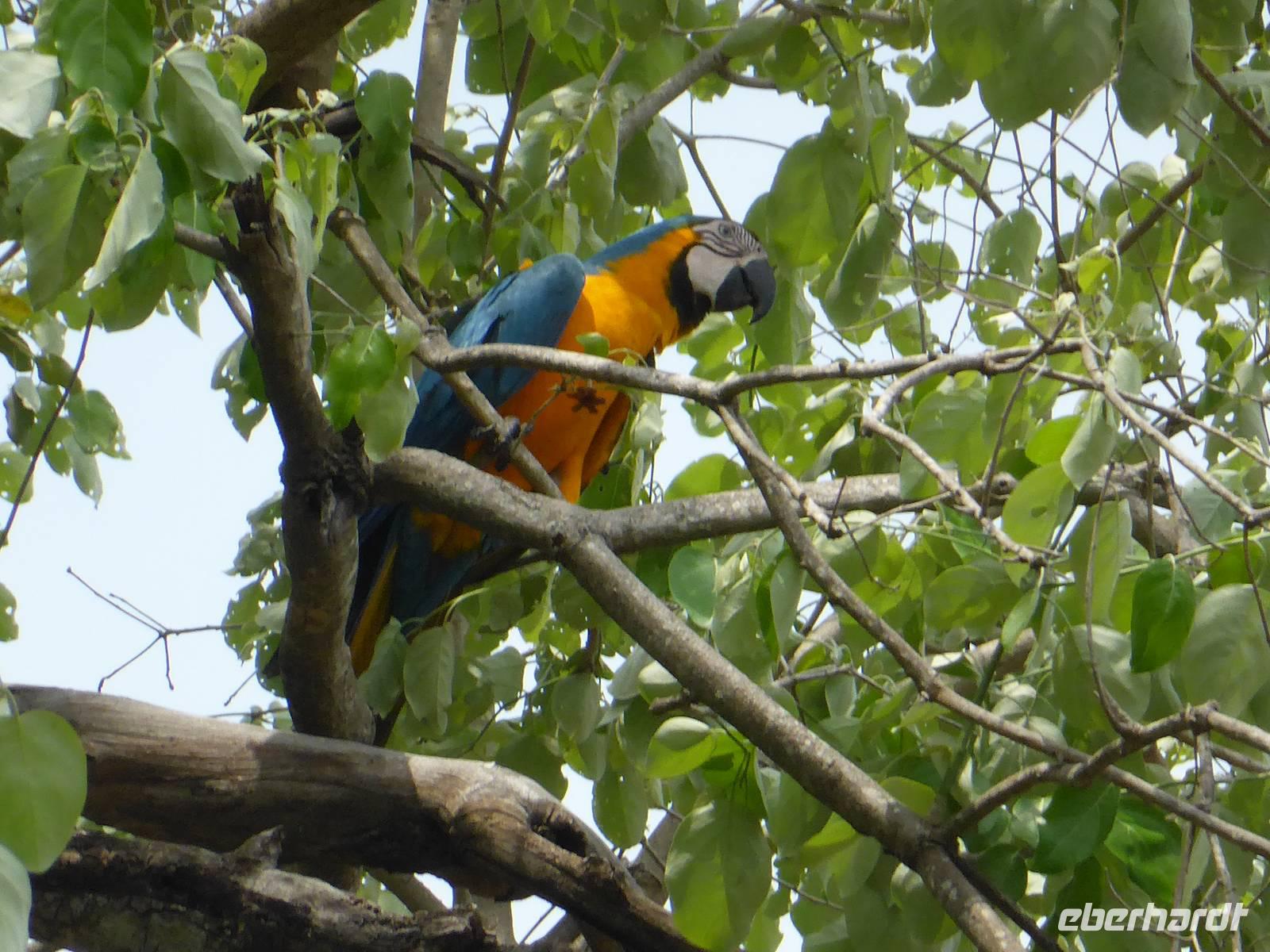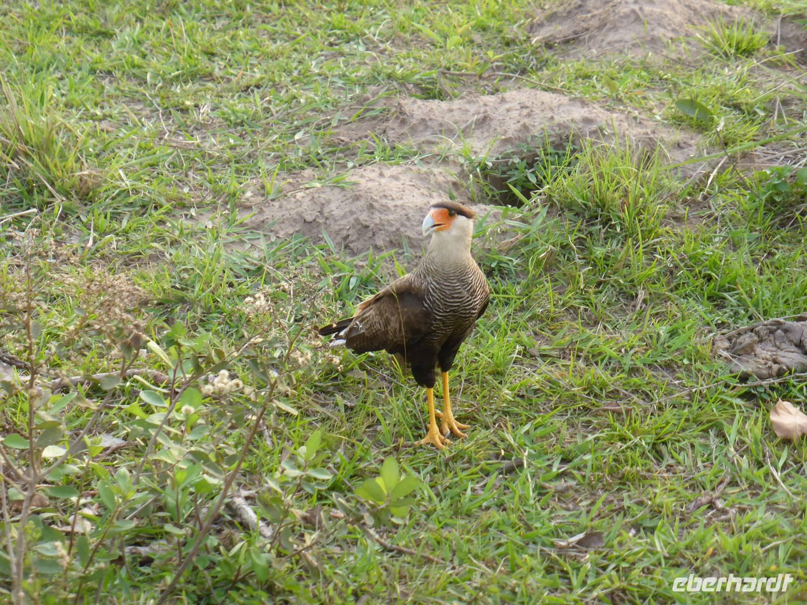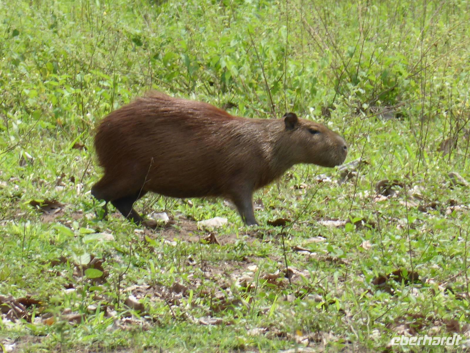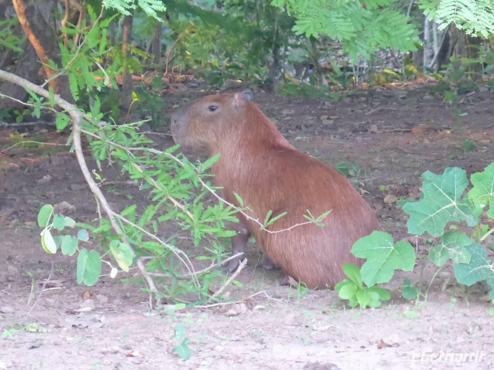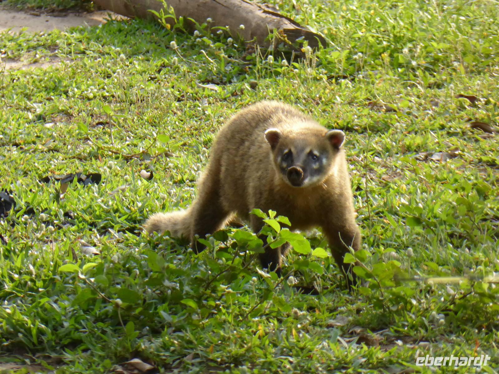 Noch vor dem Frühstück begannen wir um 05.30 Uhr mit unseren Wanderungen. Die Zeit war gut gewählt, da später die Temperaturen auf über 35 Grad ansteigen und die Luftfeuchtigkeit bis zu 60% beträgt. Wir wurden in zwei Gruppen aufgeteilt, wobei jede Gruppe bei der Wanderung unterschiedlich viele Tiere zu sehen bekam. Auf der Wanderung meiner Gruppe sahen wir Wasserschweine, Tukane, einen Schopf-Caracara (port. Carcara), Nasenbären (Coatis) und auch Affen. Nach der Wanderung folgte das Frühstück in der Pousada und danach spazierten einige unserer Gruppe mit Valdir zum Fluss Rio Aquidauana. Dabei sahen wir nochmal einige Tiere wie den Vogel Seriema, ein Gürteltier, ein Aguti (Nagetier), einen großen blauen und einen blau-gelben Ara.