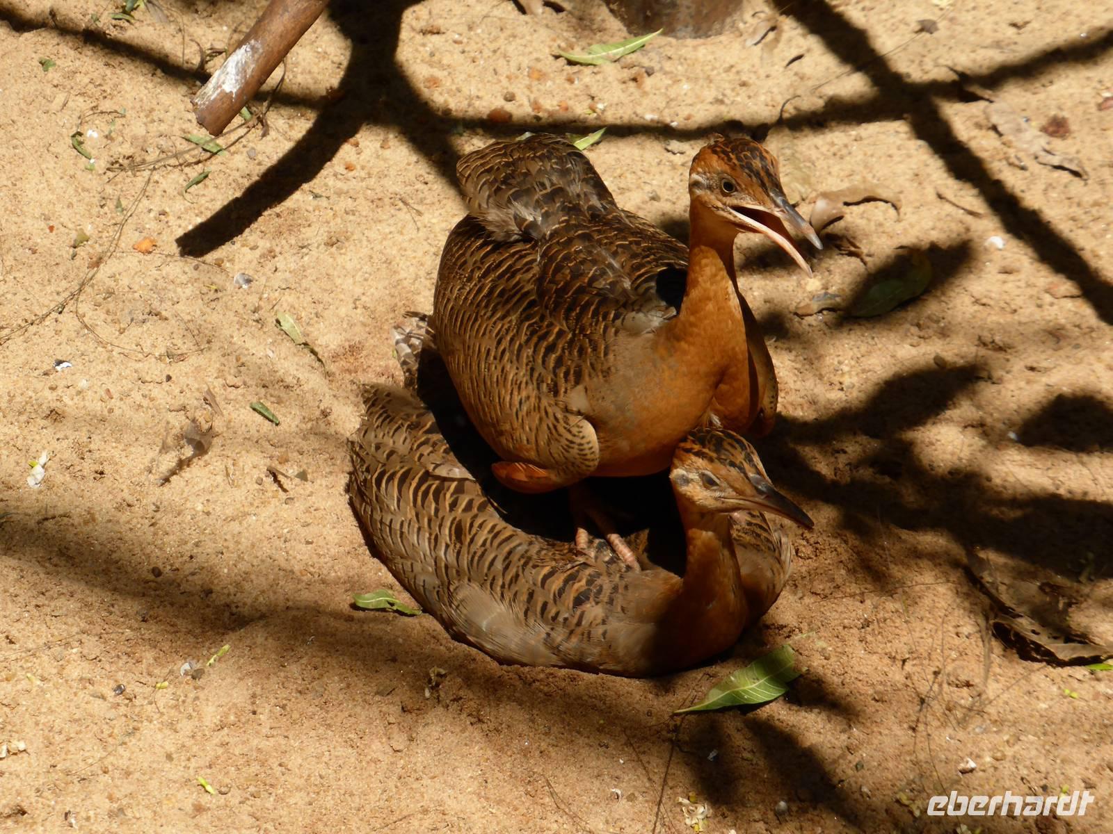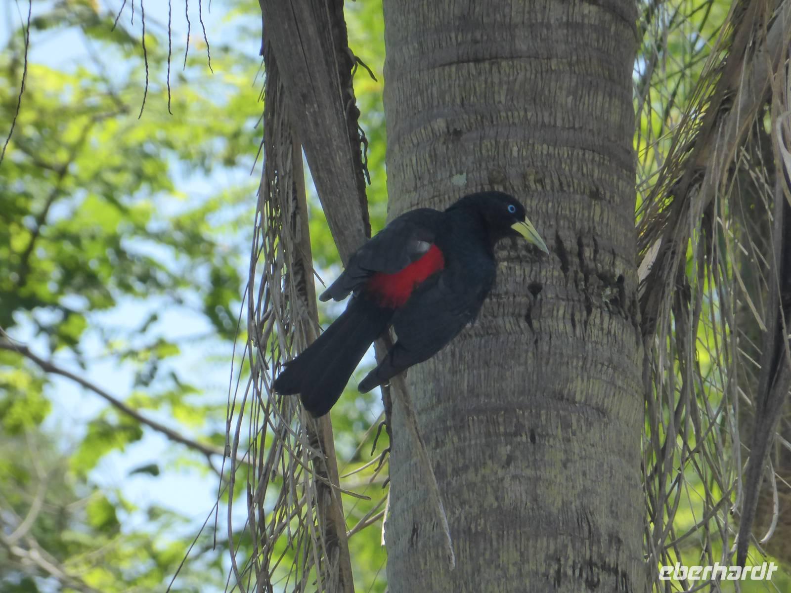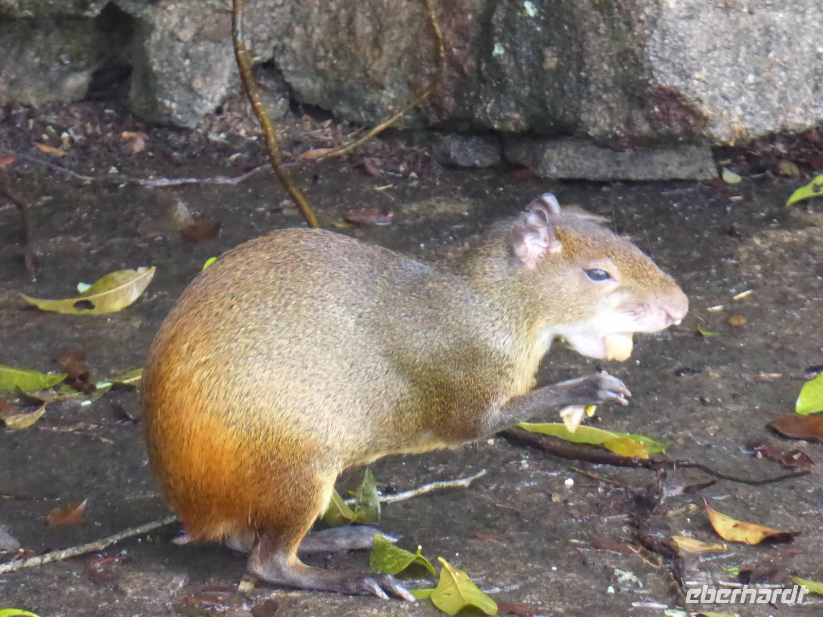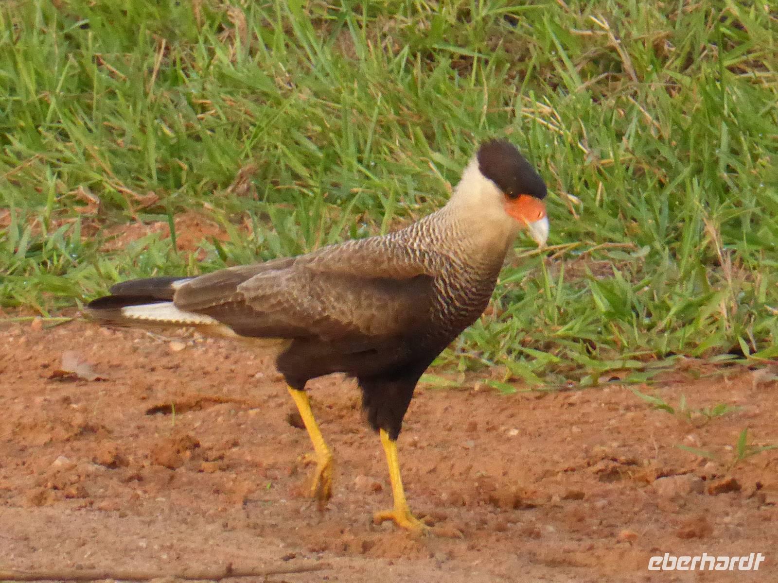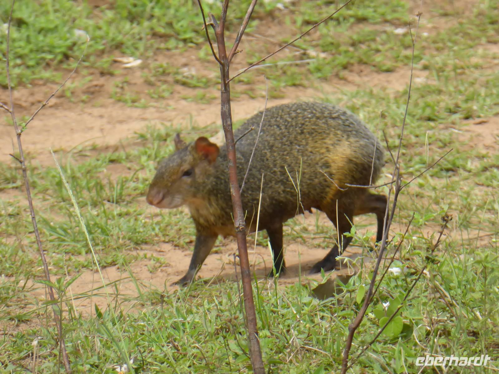 Noch vor dem Frühstück begannen wir um 05.30 Uhr mit unseren Wanderungen. Die Zeit war gut gewählt, da später die Temperaturen auf über 35 Grad ansteigen und die Luftfeuchtigkeit bis zu 60% beträgt. Wir wurden in zwei Gruppen aufgeteilt, wobei jede Gruppe bei der Wanderung unterschiedlich viele Tiere zu sehen bekam. Auf der Wanderung meiner Gruppe sahen wir Wasserschweine, Tukane, einen Schopf-Caracara (port. Carcara), Nasenbären (Coatis) und auch Affen. Nach der Wanderung folgte das Frühstück in der Pousada und danach spazierten einige unserer Gruppe mit Valdir zum Fluss Rio Aquidauana. Dabei sahen wir nochmal einige Tiere wie den Vogel Seriema, ein Gürteltier, ein Aguti (Nagetier), einen großen blauen und einen blau-gelben Ara.