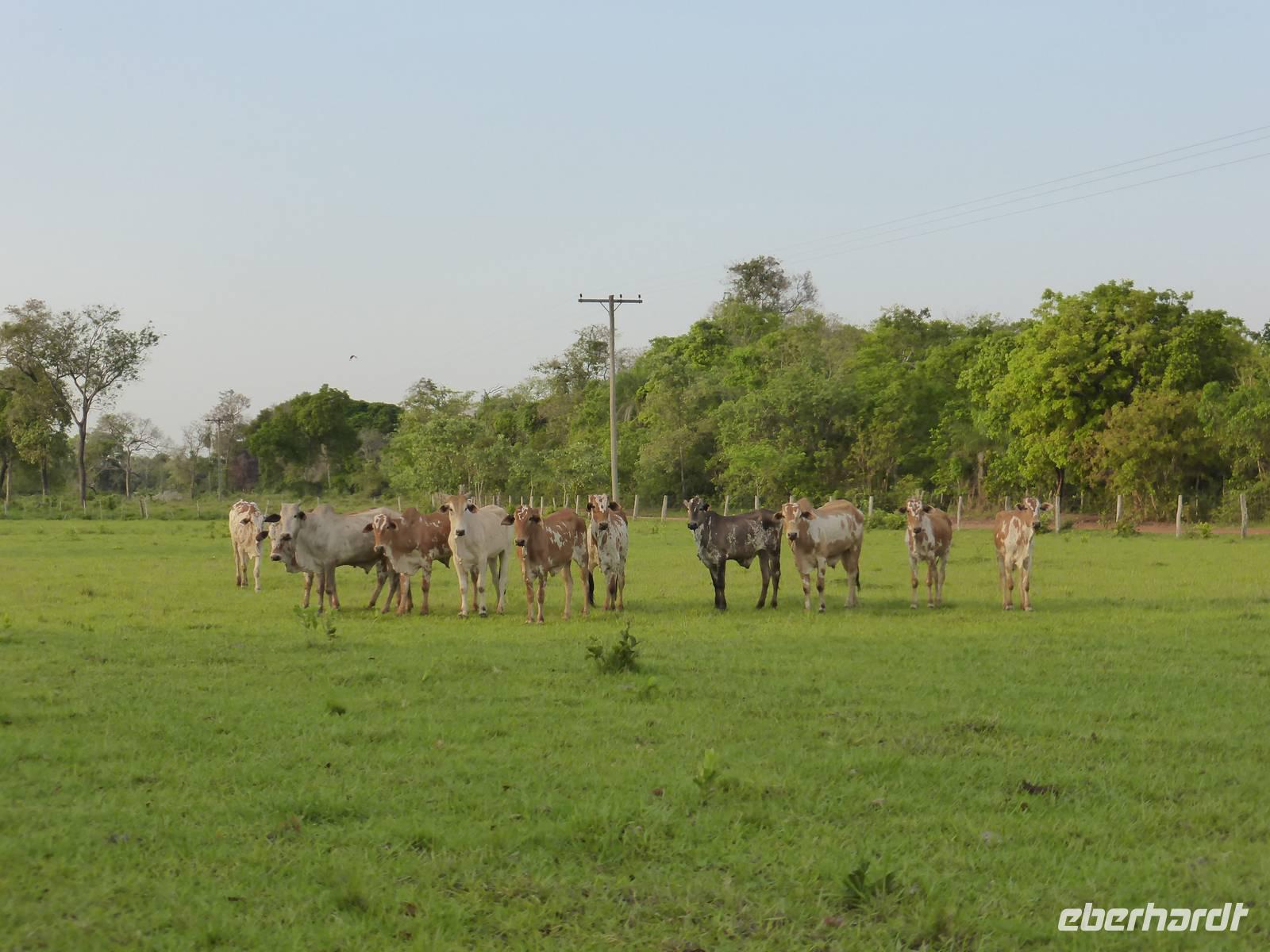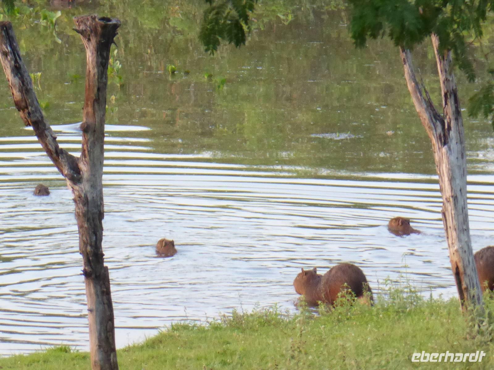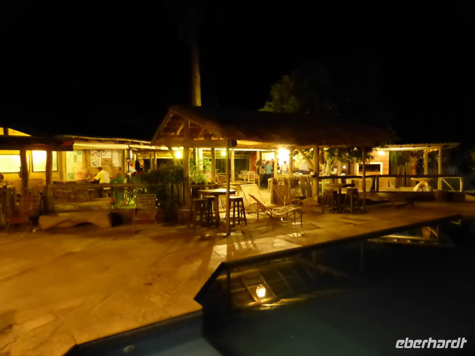 Am Flughafen erwarteten uns bereits unsere beiden neuen Reiseleiter Blasido Müller und Valdir Dänecke. Die Busfahrt führte uns zunächst zwei Stunden über eine asphaltierte Straße und danach zwei Stunden über eine unbefestigte Straße bis zu unserer Pousada „Aquape". Schon auf der Fahrt sahen wir Ameisenbären, Gürteltiere und Wildschweine. Der Pantanal ist die größte Feuchtsavanne der Welt und vereint auf kleinstem Raum eine Vielzahl von Tieren und Pflanzen. Er erstreckt sich über ein Gebiet von 230.000 km². Auf dem Gelände der Pousada (Unterkunft, Gasthaus) wurden wir von Milla begrüßt und nahmen von ihr unsere Schlüssel entgegen. Die Unterkünfte waren nicht nummeriert, sondern hatten Namen einheimischer Vögel. Nach dem Zimmerbezug trafen wir uns zum gemeinsamen Abendessen. Der Außenbereich war romantisch gestaltet: Bänke, Tische und das Buffet standen unter einer großen hölzernen Dachkonstruktion. Daran schlossen sich die Bar und der Pool an.