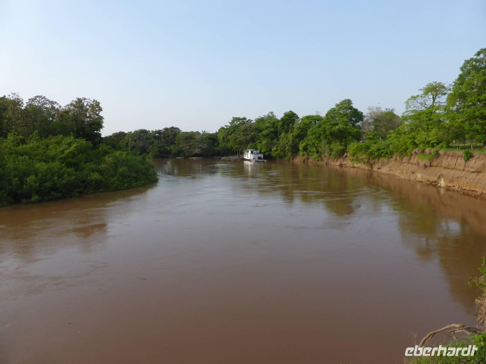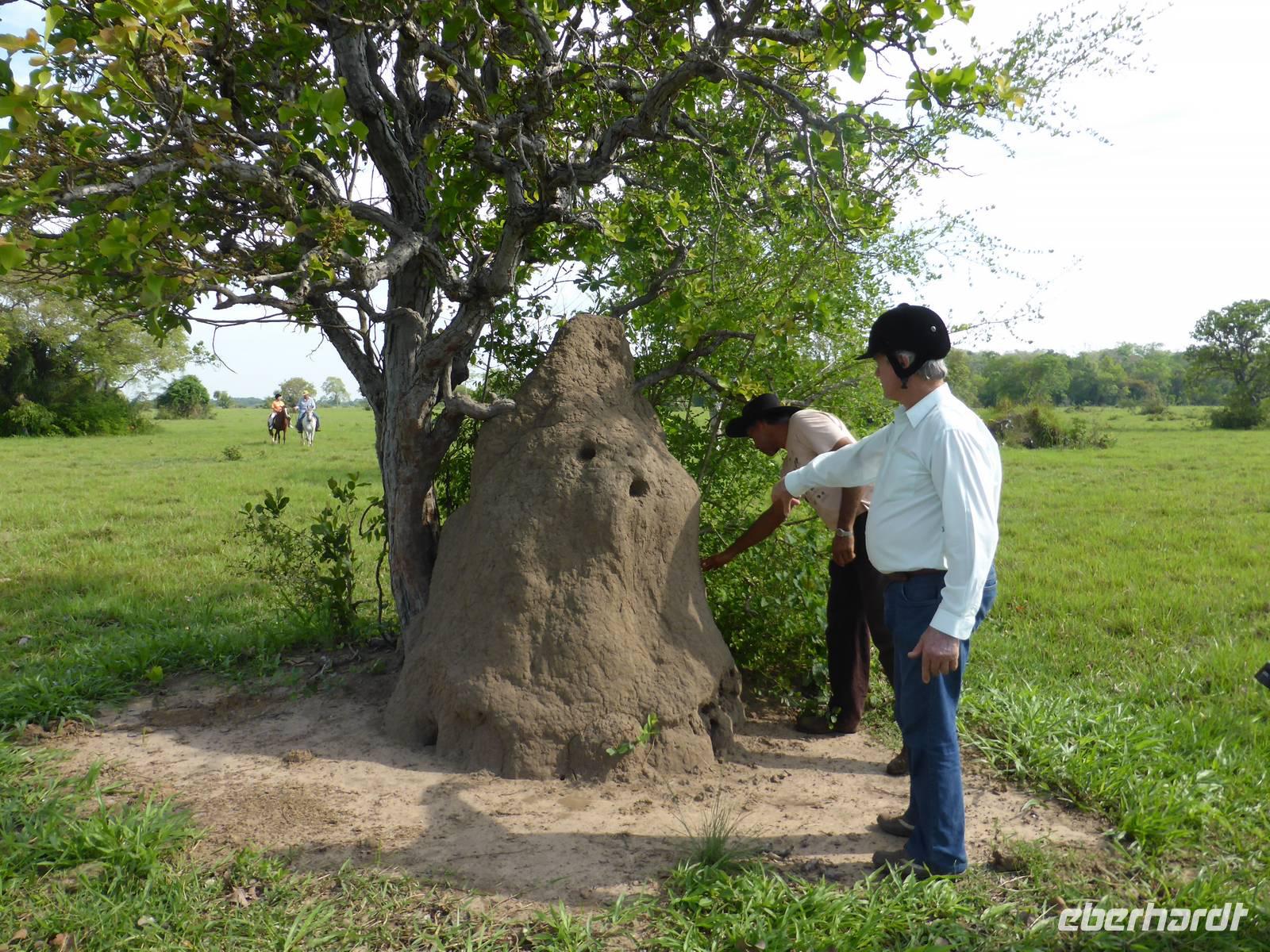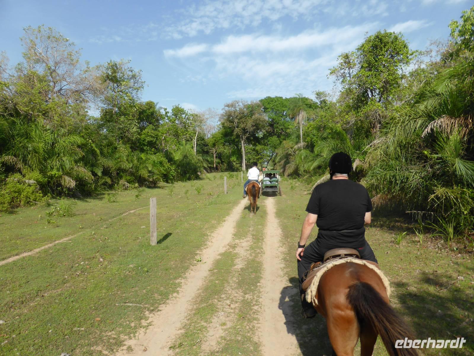 Nach dem Frühstück begann die erste Gruppe mit dem Reitausflug, während sich die zweite Gruppe für die Bootsexkursion bereit machte. Beim Reitausflug konnten wir wählen, ob wir lieber reiten oder in einer Kutsche mitfahren wollen. Unsere Pferde waren sehr geduldig und wir benötigten keinerlei Reitkenntnisse für das „Wanderreiten". Nach einer kurzen Einweisung ging es los und es war mit das Schönste, was man bei einem Aufenthalt im Pantanal erleben kann. Mein Pferd hieß Lascha und war ein Engel an Geduld und Aufmerksamkeit. Im Schritt-Tempo folgten wir den beiden Kutschen, dabei sahen wir Emus, Tukane, Rehe und Wildschweine. Auf halber Strecke legten wir eine Pause ein und entdeckten unweit einen mannshohen Termitenbau, dessen Funktion uns unser Reiseleiter Blasido erklärte. Nach drei Stunden trafen wir wieder an unserer Unterkunft (Pousada) ein. Es folgte das Mittagessen, die Mittagspause (Während dieser Zeit ist es viel zu heiß, um etwas zu unternehmen.) und das Kaffetrinken.