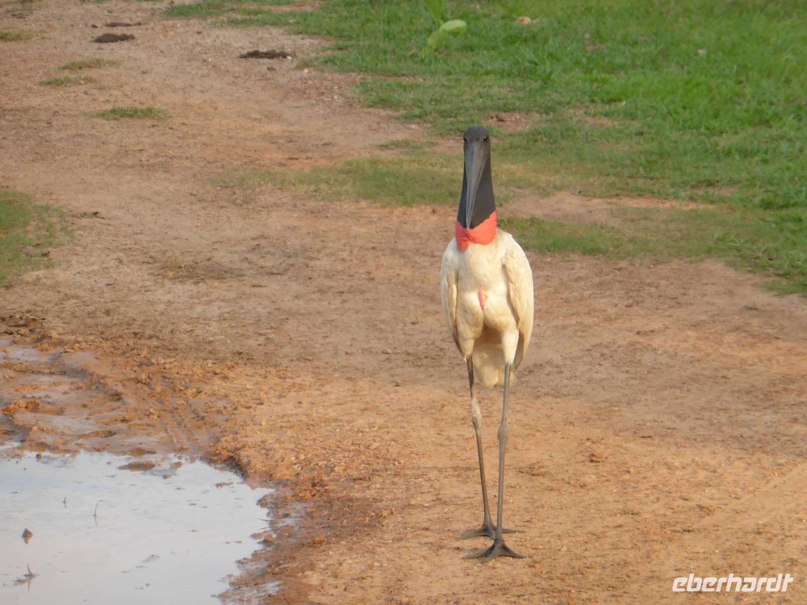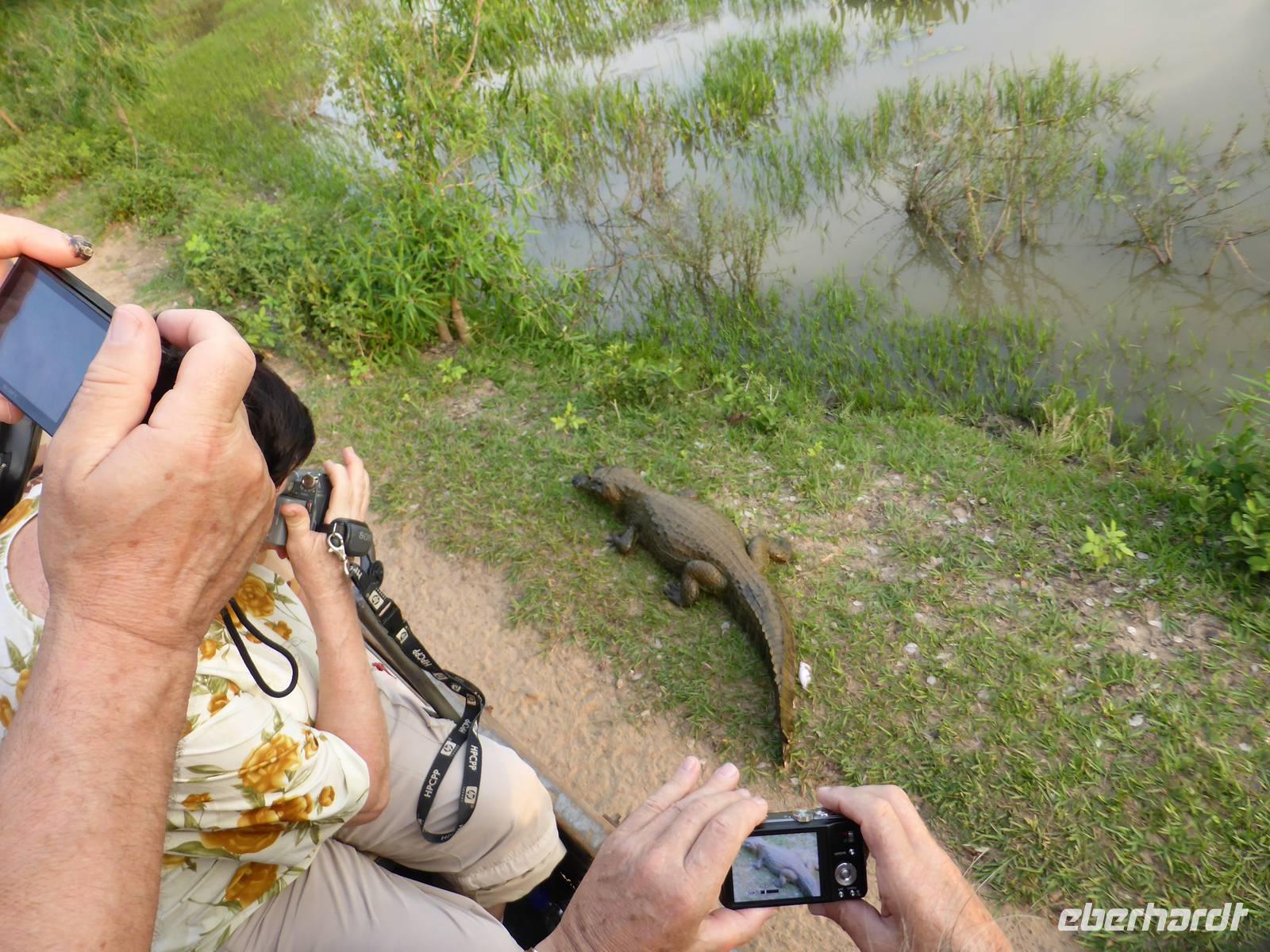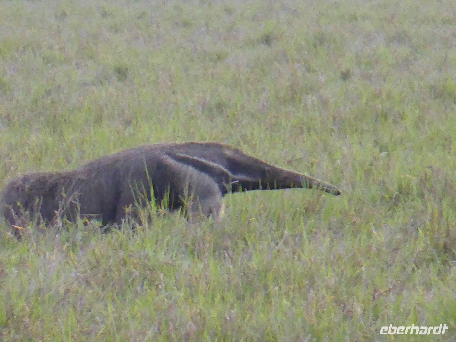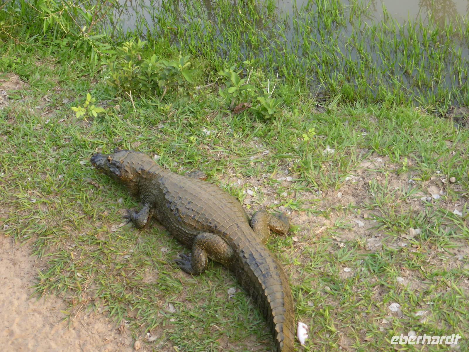 Anschließend folgte das Mittagessen, die Mittagspause, das Kaffetrinken und um 16.00 Uhr starteten wir zu unserer Fotosafari mit einem großen Geländewagen. Wir wurden nicht enttäuscht. Zuerst sahen wir Wildschweine, die sofort die Flucht ergriffen, sobald sie uns bemerkten. Danach lockte der uns begleitende Ranger einen Jabiru-Storch mit einem großen Piranha-Köder an. Es war ein Schauspiel, wie der Storch auf den ca. 20 cm großen Fisch so lange einhackte, bis er ihn in verschlingbare kleinere Stücke zerlegt hatte. Unmittelbar danach sahen wir in einem Wassergraben einen ca. 2 Meter langen Kaiman, welcher ebenfalls mit einem Fischköder auf den Weg gelockt werden konnte. Ein Wunder, wie ein solch großes Exemplar in diesem Wassergraben, welcher gerade mal ein paar Meter breit und einige dutzend Meter lang ist, überleben kann. In der Ferne sahen wir dann noch einen großen Ameisenbär, dem wir uns mit dem Fahrzeug so weit wie möglich näherten. Auch er suchte sofort das Weite, als er uns bemerkte. Zum ersten Mal wurden wir hier auch von Moskitos gestochen. Die Schwellungen jucken allerdings nicht lange und sind spätestens nach ein paar Stunden wieder vergessen. Auf der Weiterfahrt in die Dämmerung sahen wir noch eine Gruppe Wasserschweine und Rehe. Interessant war auch die Rückfahrt in völliger Dunkelheit. Nur die Scheinwerfer unseres Fahrzeuges und ein schwenkbarer Suchscheinwerfer des Rangers durchbrachen die Nacht. Einige Tiere, wie zum Beispiel den Maikong-Grabbenfuchs, sahen wir trotzdem, aber vor allem waren die nächtlichen Geräusche und die Vielzahl der durch das Scheinwerferlicht aufgeschreckten Insekten eindrucksvoll. Gegen Ende der Fotosafari hielten wir auf einem Campingplatz, auf welchem in letzter Zeit ein Ozelot gesichtet wurde. Immer zur gleichen Zeit holte er sich abends die Fischreste ab. Nach einer Viertelstunde inmitten unzähliger Moskitos brachen wir die Warterei ab und fuhren zu unserer Unterkunft zurück.