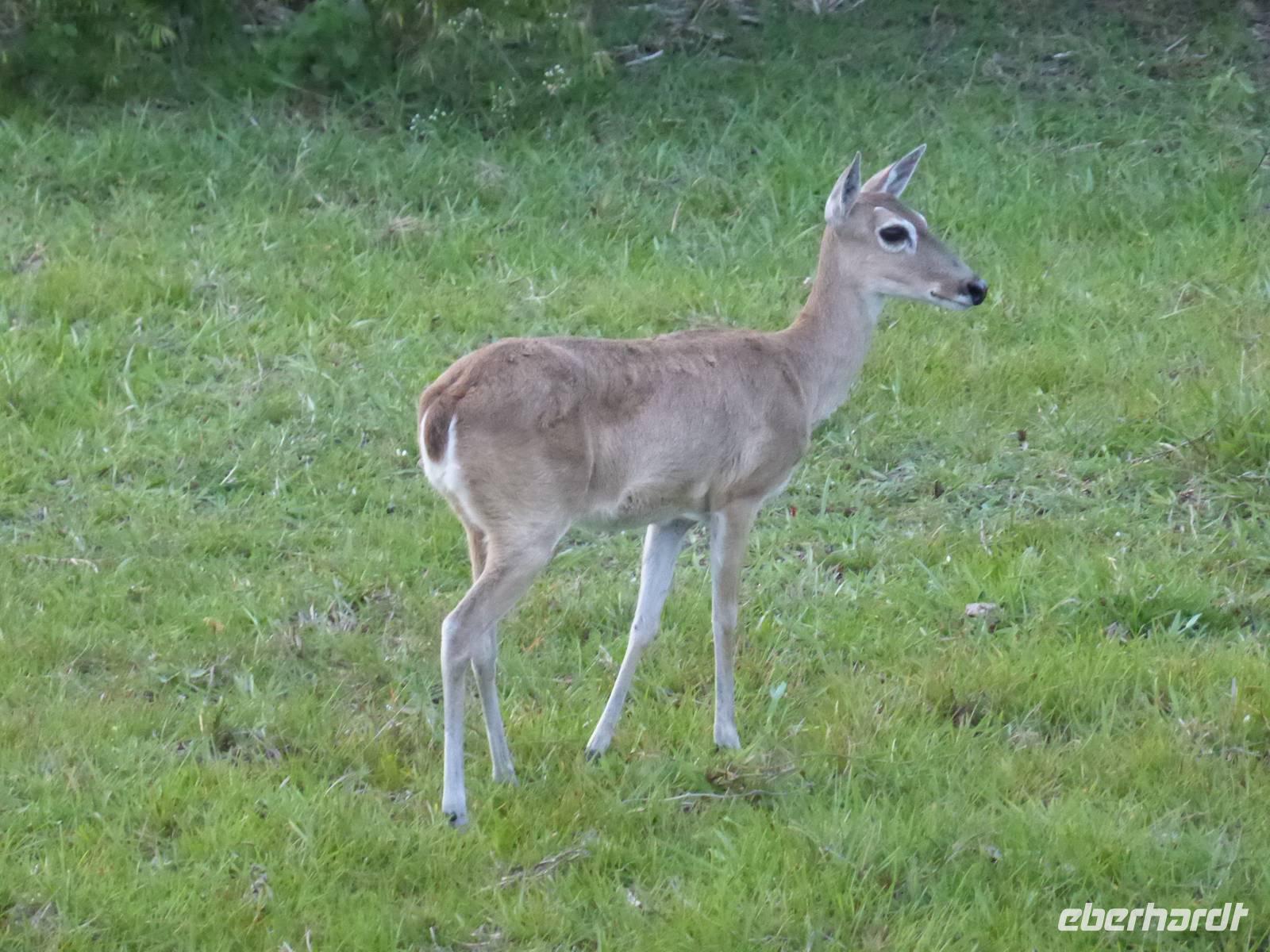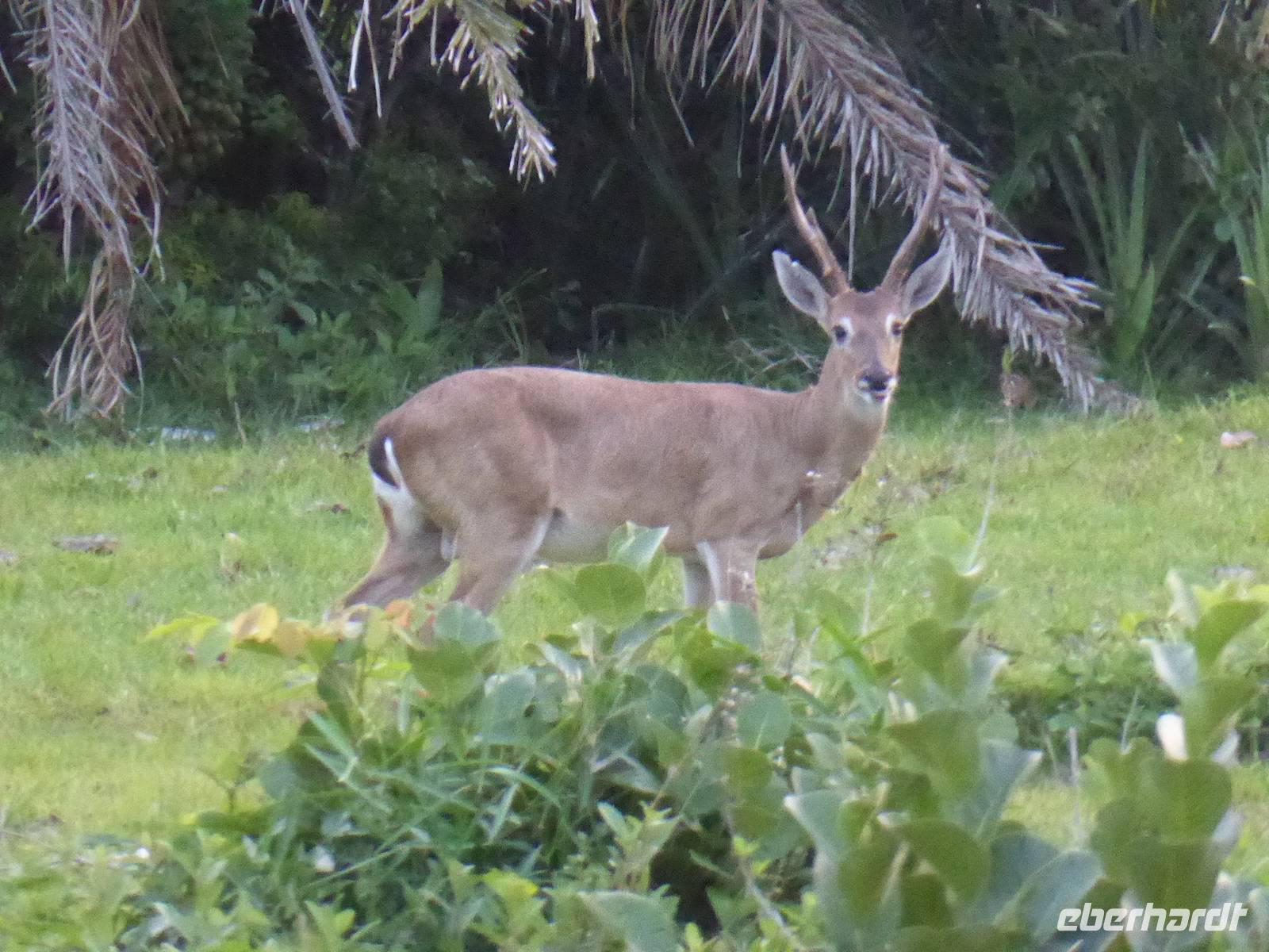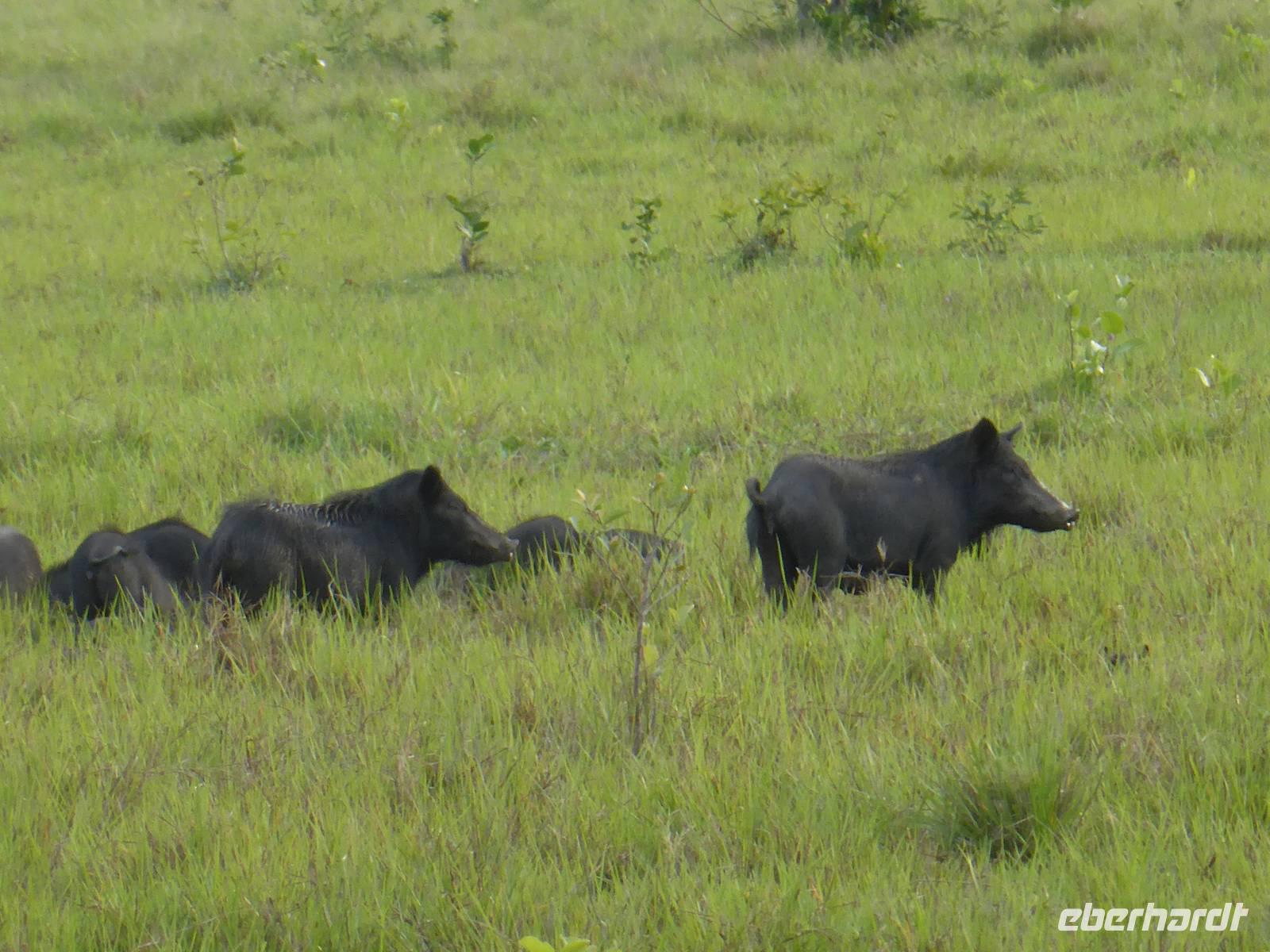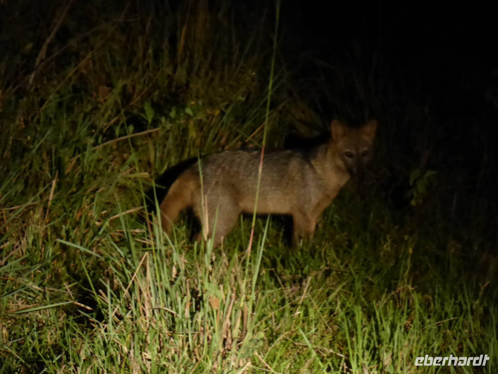 Anschließend folgte das Mittagessen, die Mittagspause, das Kaffetrinken und um 16.00 Uhr starteten wir zu unserer Fotosafari mit einem großen Geländewagen. Wir wurden nicht enttäuscht. Zuerst sahen wir Wildschweine, die sofort die Flucht ergriffen, sobald sie uns bemerkten. Danach lockte der uns begleitende Ranger einen Jabiru-Storch mit einem großen Piranha-Köder an. Es war ein Schauspiel, wie der Storch auf den ca. 20 cm großen Fisch so lange einhackte, bis er ihn in verschlingbare kleinere Stücke zerlegt hatte. Unmittelbar danach sahen wir in einem Wassergraben einen ca. 2 Meter langen Kaiman, welcher ebenfalls mit einem Fischköder auf den Weg gelockt werden konnte. Ein Wunder, wie ein solch großes Exemplar in diesem Wassergraben, welcher gerade mal ein paar Meter breit und einige dutzend Meter lang ist, überleben kann. In der Ferne sahen wir dann noch einen großen Ameisenbär, dem wir uns mit dem Fahrzeug so weit wie möglich näherten. Auch er suchte sofort das Weite, als er uns bemerkte. Zum ersten Mal wurden wir hier auch von Moskitos gestochen. Die Schwellungen jucken allerdings nicht lange und sind spätestens nach ein paar Stunden wieder vergessen. Auf der Weiterfahrt in die Dämmerung sahen wir noch eine Gruppe Wasserschweine und Rehe. Interessant war auch die Rückfahrt in völliger Dunkelheit. Nur die Scheinwerfer unseres Fahrzeuges und ein schwenkbarer Suchscheinwerfer des Rangers durchbrachen die Nacht. Einige Tiere, wie zum Beispiel den Maikong-Grabbenfuchs, sahen wir trotzdem, aber vor allem waren die nächtlichen Geräusche und die Vielzahl der durch das Scheinwerferlicht aufgeschreckten Insekten eindrucksvoll. Gegen Ende der Fotosafari hielten wir auf einem Campingplatz, auf welchem in letzter Zeit ein Ozelot gesichtet wurde. Immer zur gleichen Zeit holte er sich abends die Fischreste ab. Nach einer Viertelstunde inmitten unzähliger Moskitos brachen wir die Warterei ab und fuhren zu unserer Unterkunft zurück.