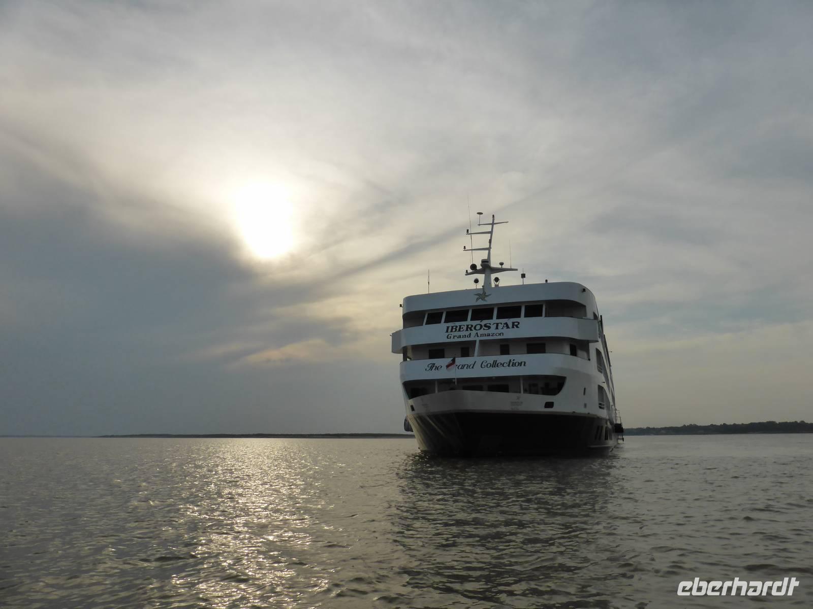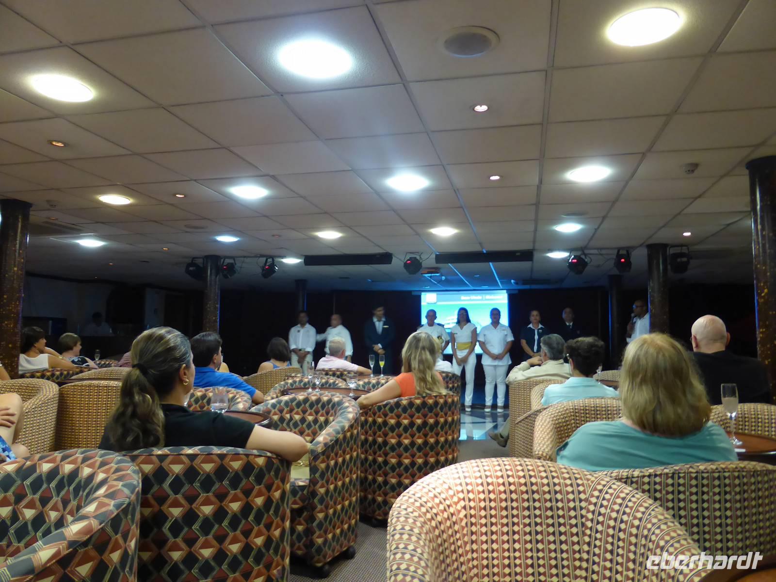 In der Ankunftshalle erwartete uns bereits unsere örtliche Reiseleiterin Carla. Mit ihr fuhren wir vom Flughafen direkt zum Hafen, wo unser Kreuzfahrtschiff „Iberostar" bereitstand. Auf dem Schiff wurden wir von unserem Guide Jefferson mit einem Cocktail und Informationsmaterial begrüßt. Gegen 18.00 Uhr legte das Schiff mit eintretender Dämmerung vom Hafen ab. Es war ein emotionales Erlebnis, da der Vorgang von Michael Gretu's „In nomine" musikalisch in Szene gesetzt wurde. Um 19.00 Uhr folgte dann die Vorstellung der Besatzungsmitglieder inklusive Kapitän sowie Ausflugs-Guides und im Anschluss stand im Restaurant das Buffet zum Abendessen bereit.