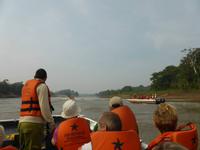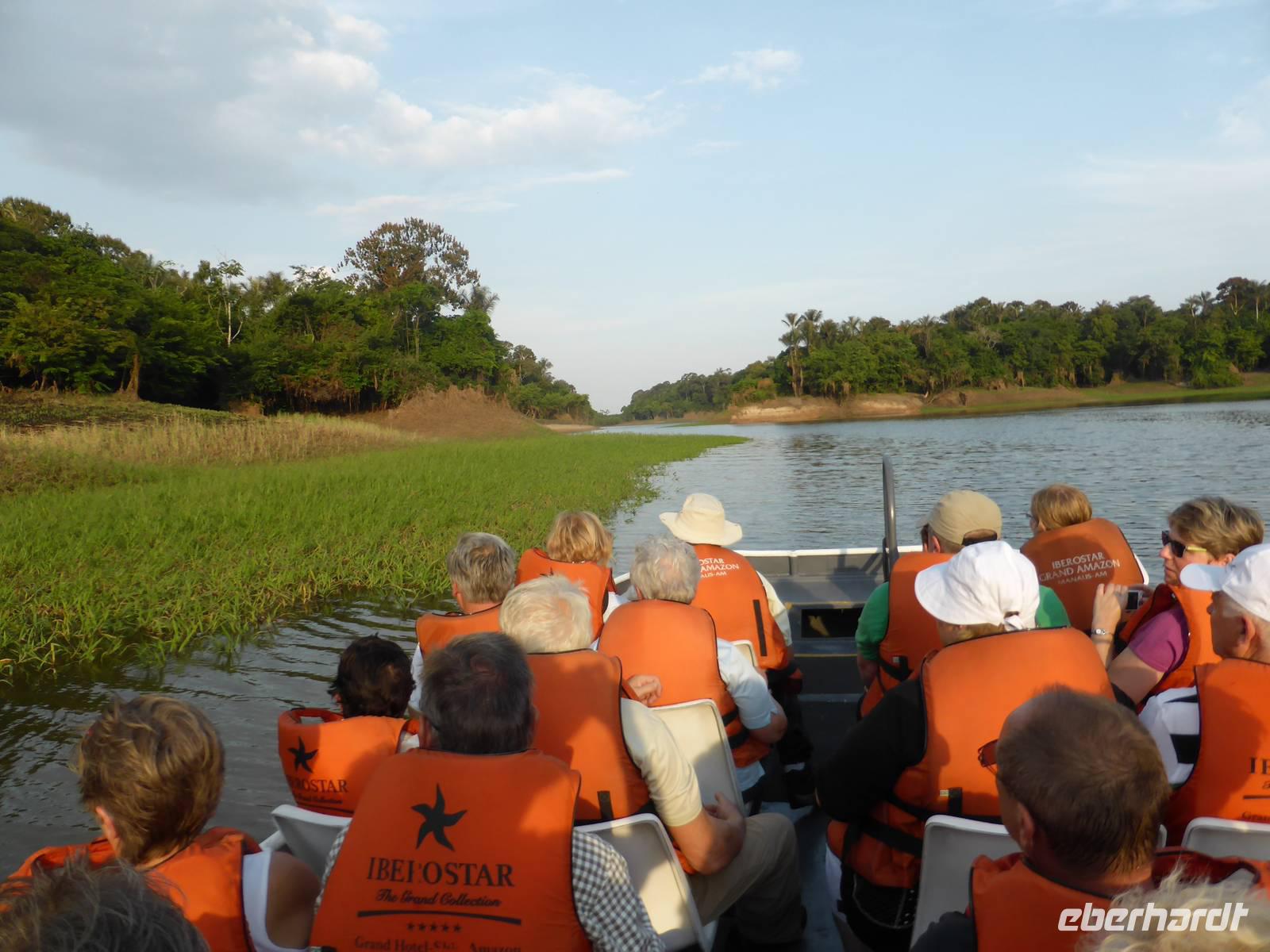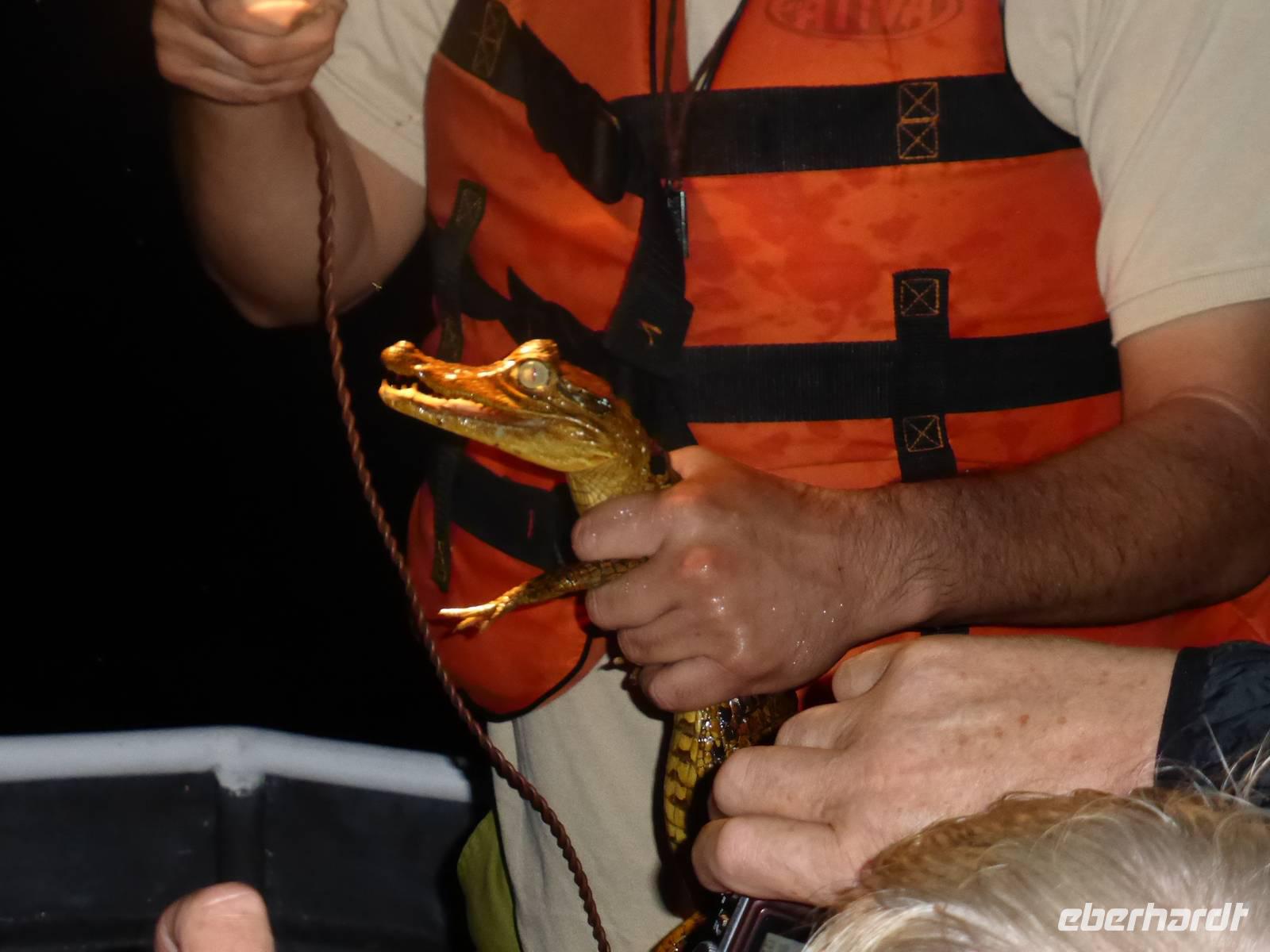 Nach dem Abendessen bestand die Möglichkeit, mit dem Boot auf Kaiman-Safari zu gehen. Mit Hilfe eines Suchscheinwerfers suchte Jefferson den Uferstreifen ab. Oft konnten wir das Scheinwerferlicht in den Augen der Kaimane reflektieren sehen, aber sobald wir näher kamen, tauchten sie ab. Letztendlich fing Jefferson doch noch ein sehr junges Tier. Wahnsinn! In der einen Hand den Suchscheinwerfer und mit der anderen Hand zog er im Halbdunkel den Kaiman aus dem Wasser! Dabei musste der Bootsführer noch aufpassen, dass das Boot beim Heranfahren ans Ufer weder den Kaiman noch die Hand von Jefferson zerquetschte! An Bord verhielt sich der Kaiman in den ersten Minuten ruhig, so dass wir ihn alle in Ruhe fotografieren konnten. Als ihm das „Herumreichen" zu viel wurde, versuchte er, sich unter schnellen windenden Bewegungen der Umklammerung zu entziehen, und Jefferson setzte ihn wieder ins Wasser.