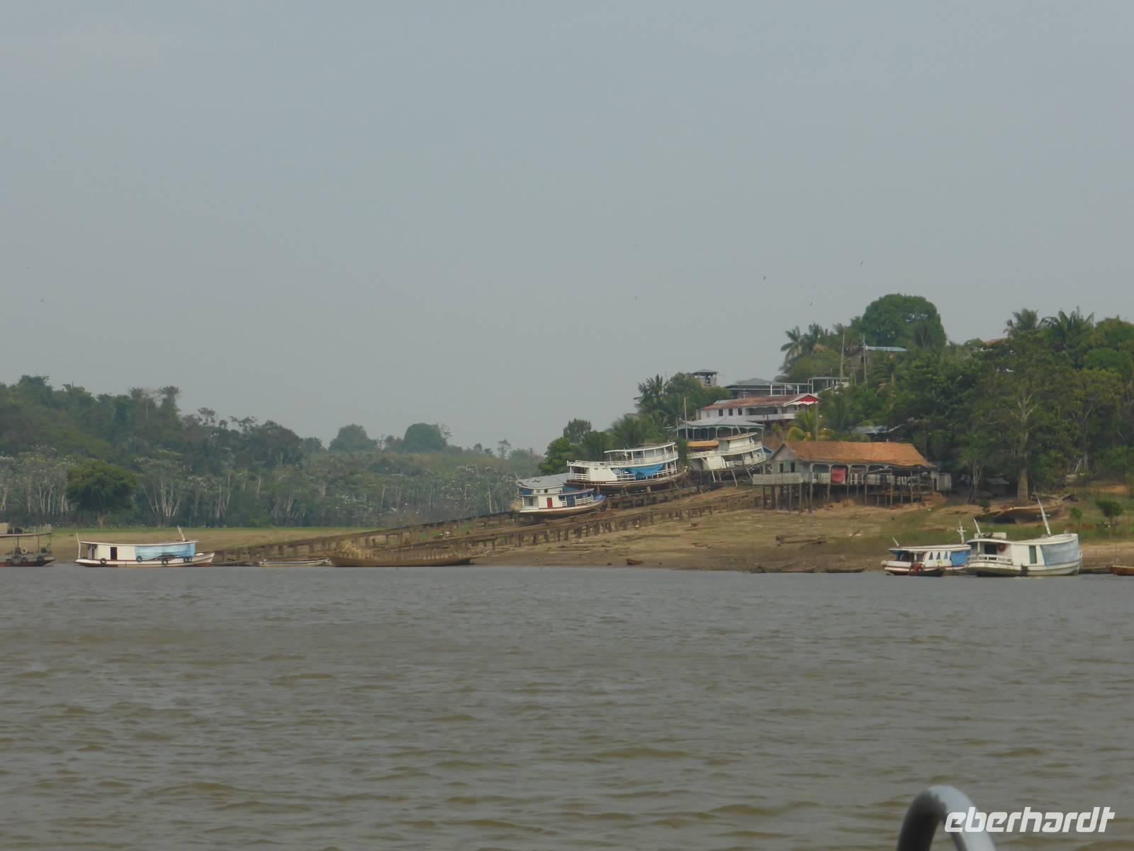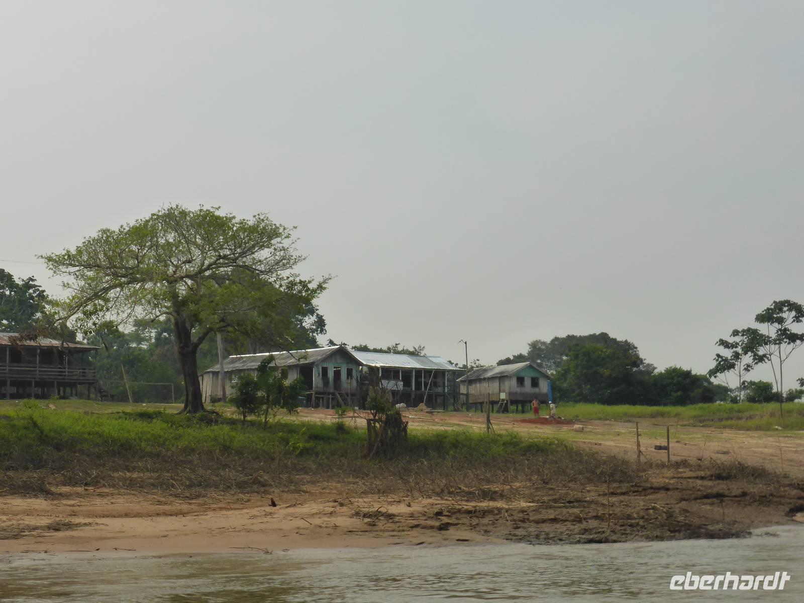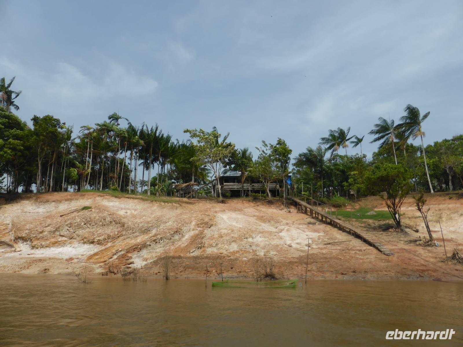 Bereits ab der ersten Minute unserer Ankunft in Amazonien beeindruckten uns die gewaltigen Wasserflächen und die gewaltige Flussbreite. Am Samstagmorgen stand ein Bootsausflug zu einer Farm in der Region des Janauaca-Sees, einem Teilstück des Rio Solimoes/Amazonas auf dem Programm. Der Amazonas kommt aufgrund seines geringen Gefälles nur langsam voran und überschwemmt ein riesiges Gebiet auf seinem Weg in den Atlantik. Ursprünglich mündete er in den Pazifik. Durch die Landhebung wurde ihm vor Jahrmillionen dieser Abfluss versperrt und seither fließt er in die entgegengesetzte Richtung. Wir fuhren zunächst an vielen Hausbooten vorbei, in denen bevorzugt Fischerfamilien leben, und legten dann an einem hölzernen Bootssteg an, um die Farm von Familie Alvaro zu besuchen. Zuerst zeigte uns Jefferson die Öfen zum Backen des Maniokmehls. Maniok-Pflanzen sind giftig, weshalb die Wurzelknollen geschält und drei Tage gewässert werden müssen, um genießbar zu sein. Anschließend werden sie gepresst und im Ofen gebacken. Bei einem Rundgang über die relativ kleine landwirtschaftliche Nutzfläche der Farm erzählte uns Jefferson von den Problemen beim Anbau der Pflanzen und aus welchen Gründen ein Anbau in großen Plantagen im Amazonasgebiet nicht möglich ist. Im Haus von Familie Alvaro probierten wir dann verschiedene Früchte und waren berührt von der einfachen Ausstattung der Wohnräume.