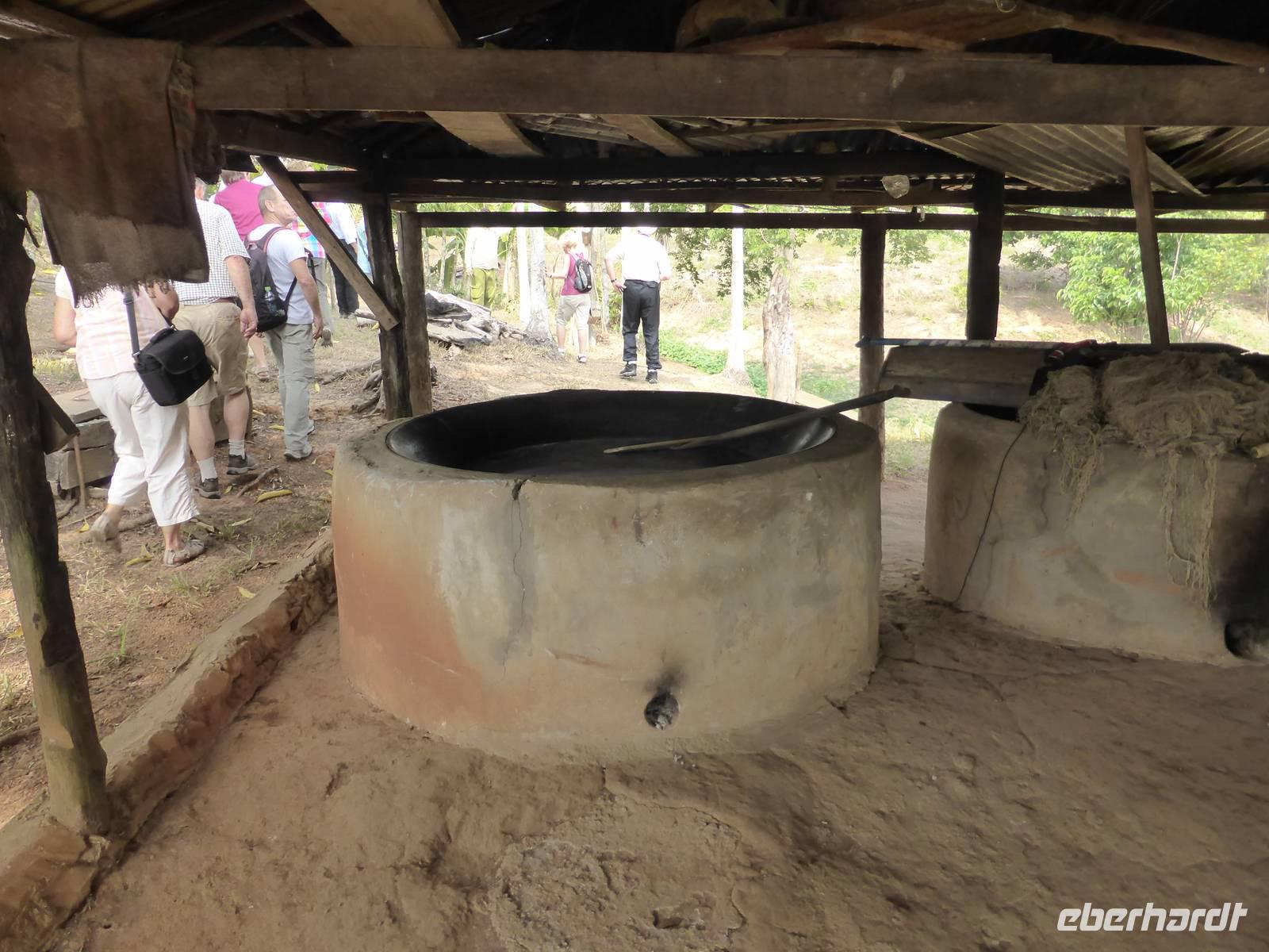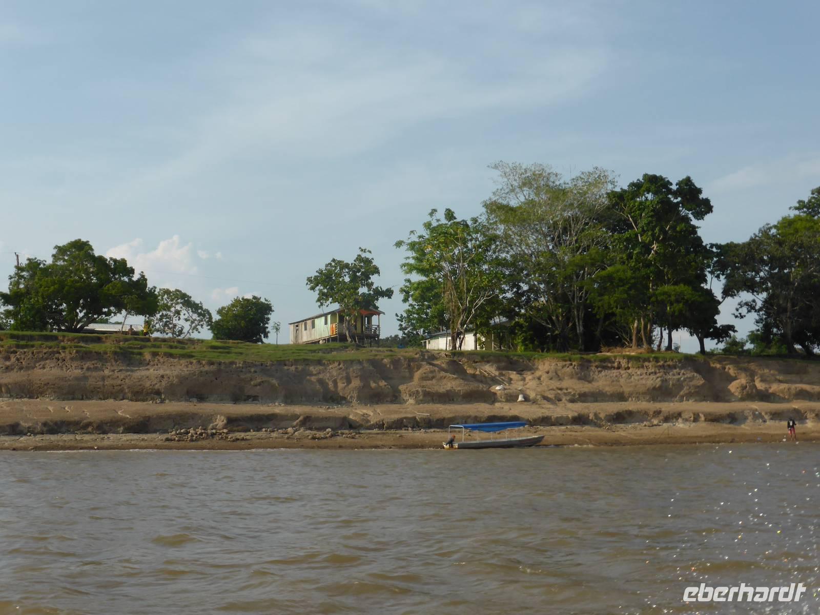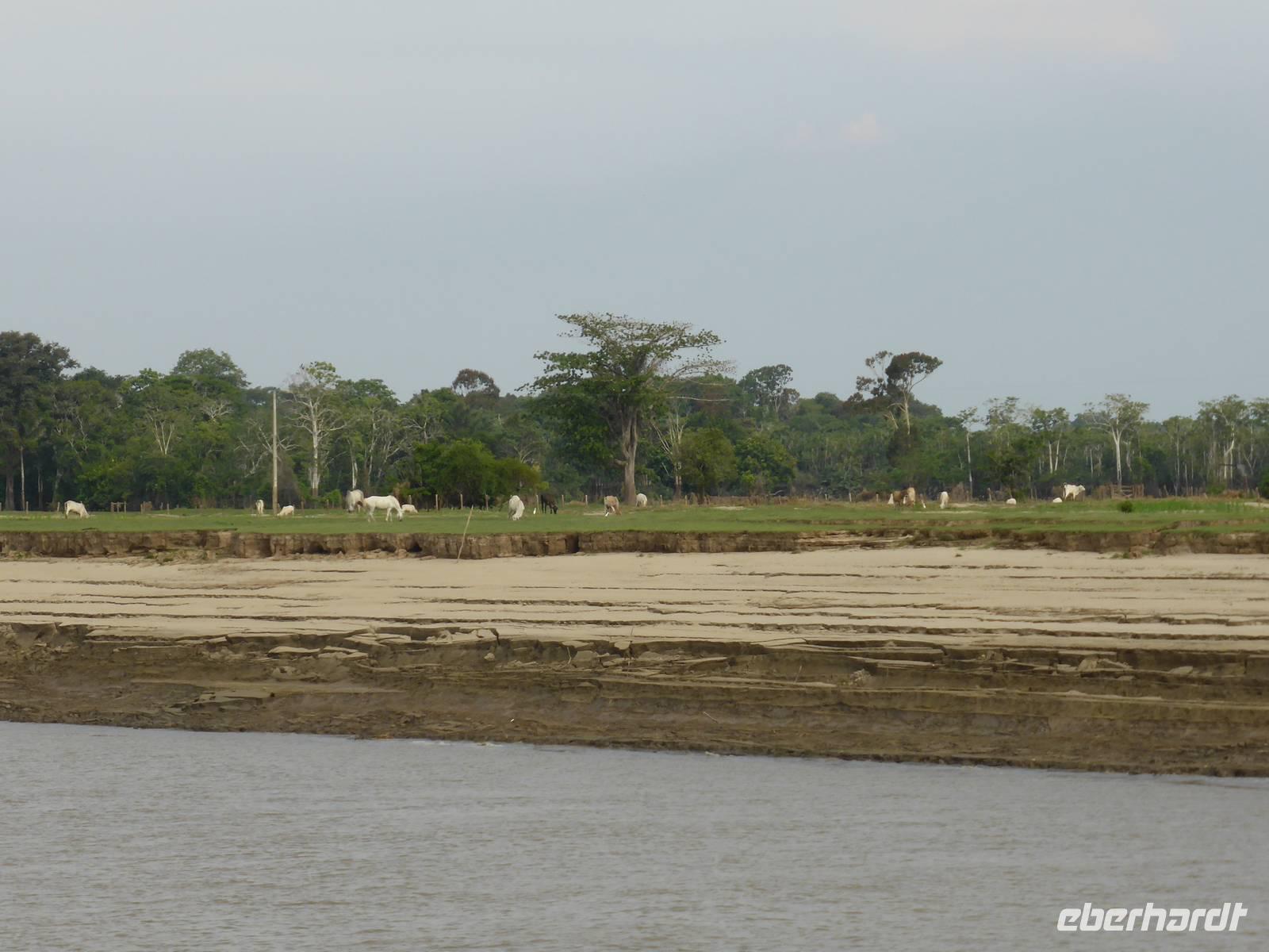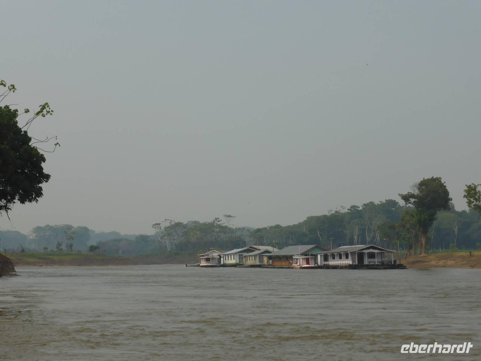 Bereits ab der ersten Minute unserer Ankunft in Amazonien beeindruckten uns die gewaltigen Wasserflächen und die gewaltige Flussbreite. Am Samstagmorgen stand ein Bootsausflug zu einer Farm in der Region des Janauaca-Sees, einem Teilstück des Rio Solimoes/Amazonas auf dem Programm. Der Amazonas kommt aufgrund seines geringen Gefälles nur langsam voran und überschwemmt ein riesiges Gebiet auf seinem Weg in den Atlantik. Ursprünglich mündete er in den Pazifik. Durch die Landhebung wurde ihm vor Jahrmillionen dieser Abfluss versperrt und seither fließt er in die entgegengesetzte Richtung. Wir fuhren zunächst an vielen Hausbooten vorbei, in denen bevorzugt Fischerfamilien leben, und legten dann an einem hölzernen Bootssteg an, um die Farm von Familie Alvaro zu besuchen. Zuerst zeigte uns Jefferson die Öfen zum Backen des Maniokmehls. Maniok-Pflanzen sind giftig, weshalb die Wurzelknollen geschält und drei Tage gewässert werden müssen, um genießbar zu sein. Anschließend werden sie gepresst und im Ofen gebacken. Bei einem Rundgang über die relativ kleine landwirtschaftliche Nutzfläche der Farm erzählte uns Jefferson von den Problemen beim Anbau der Pflanzen und aus welchen Gründen ein Anbau in großen Plantagen im Amazonasgebiet nicht möglich ist. Im Haus von Familie Alvaro probierten wir dann verschiedene Früchte und waren berührt von der einfachen Ausstattung der Wohnräume.
