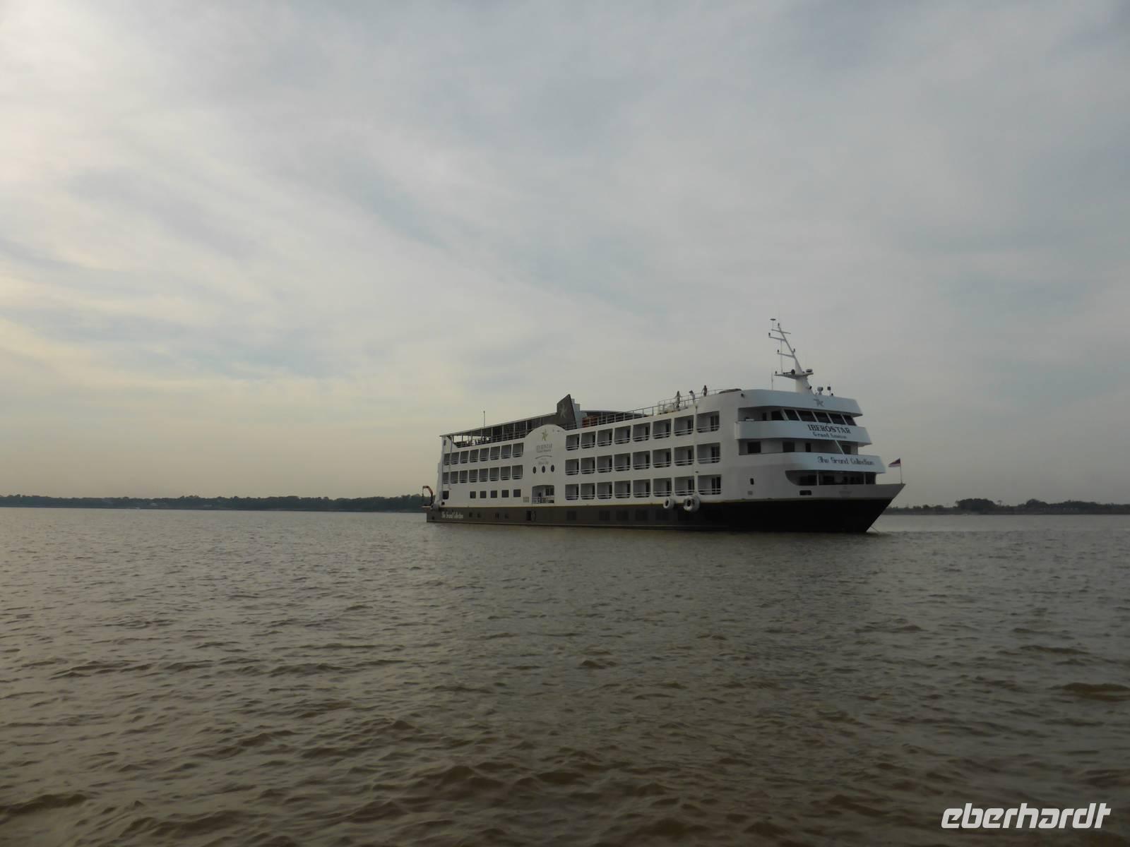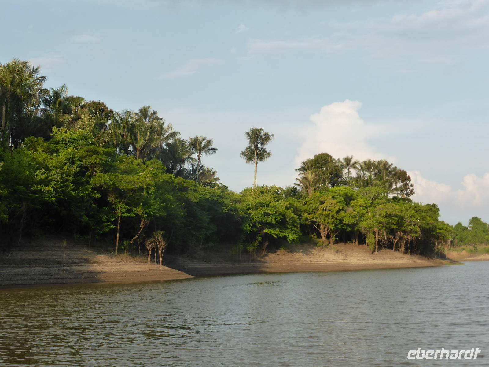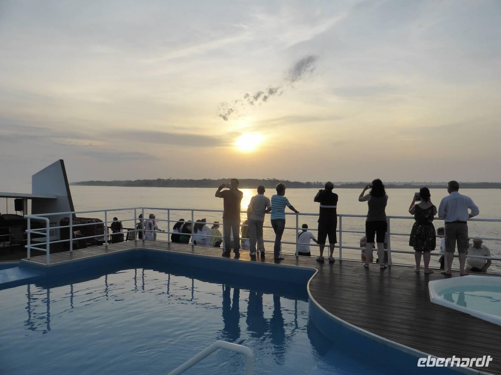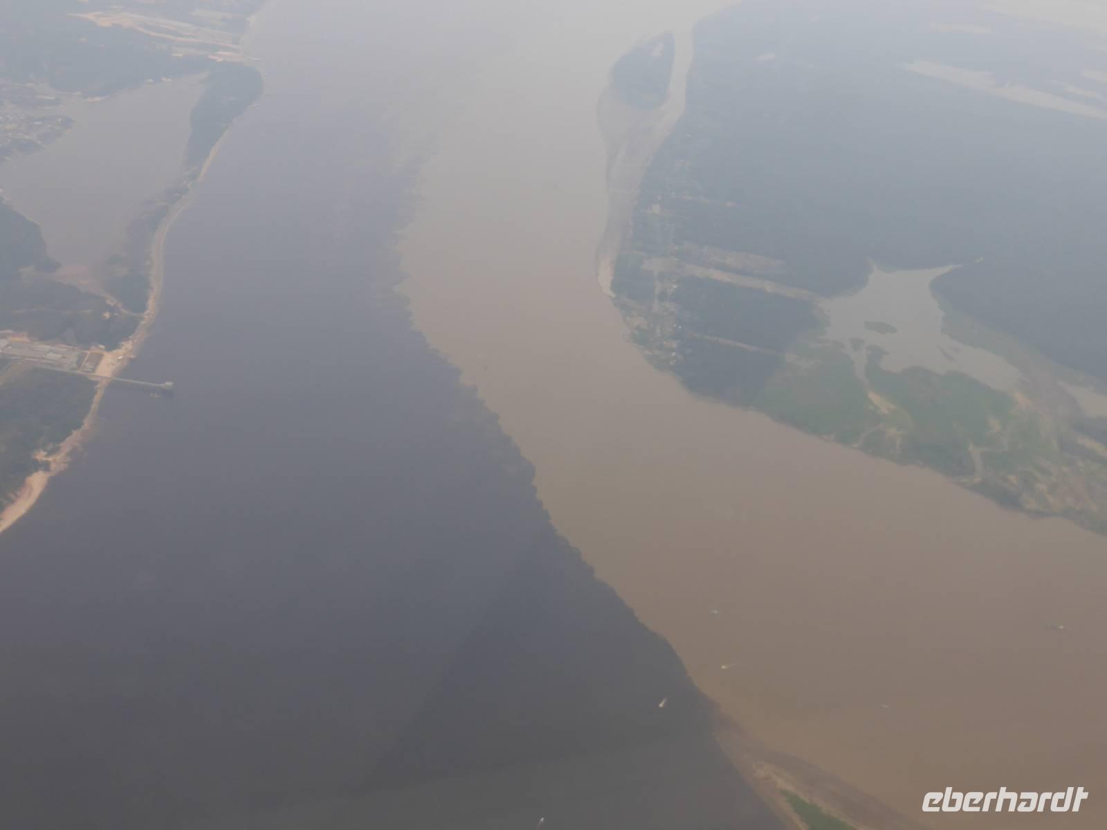 Vor dem Frühstück bestand die Möglichkeit, das Zusammentreffen zwischen Rio Negro und Rio Solimoes/ Amazonas vom Sonnendeck aus zu genießen. Deutlich hob sich der dunkelbraune Rio Negro vom helleren gold-bräunlichen Amazonas ab. Beide Flussfarben bilden auf fast 20 Kilometer Länge eine deutlich erkennbare Trennlinie.