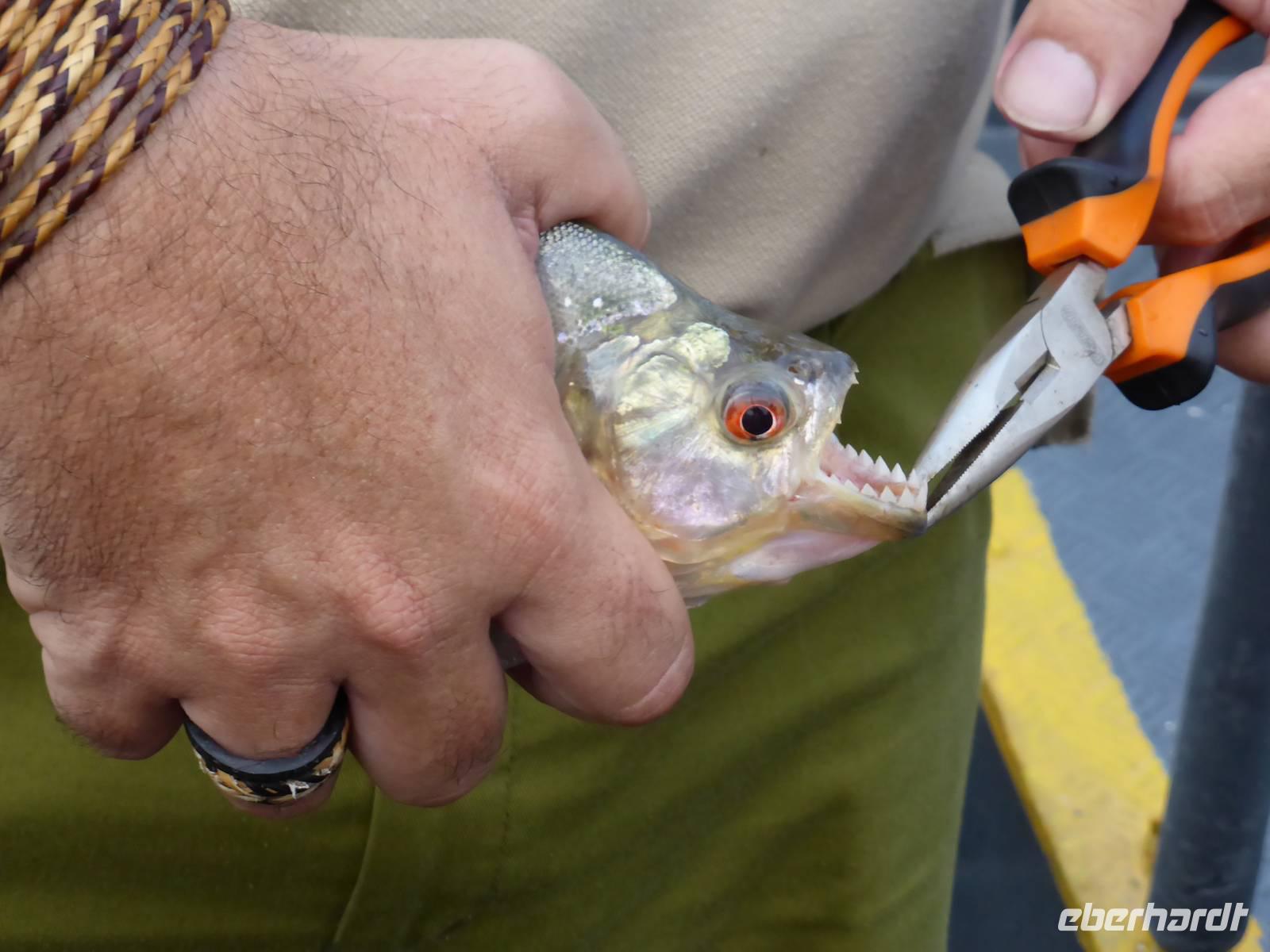 Nach dem Mittagessen an Bord konnten wir wählen, ob wir an einem weiteren Bootsausflug oder an einem Ausflug zum Piranha-Angeln teilnehmen wollten. Die Hälfte unserer Gruppe entschied sich für das Piranha-Angeln. Dazu fuhren wir mit dem Boot nach Manaquiri in einen durch eine Landzunge vom Amazonas abgetrennten Seitenarm mit fast still stehendem Gewässer. Geangelt wurde mit Rindfleisch und es dauerte nicht lange, bis sich der erste Fisch anbiss. Einige Angler waren so erfolgreich, dass ständig Piranhas anbissen. Meistens war jedoch kein Fisch an der Angel, dafür der Köder vom Angelhaken verschwunden. Welch kräftiges Gebiss Piranhas haben, sahen wir, als der Bootsführer einen in der Hand hielt und dessen Maul weit öffnete. Obwohl ich keinen Erfolg beim Angeln hatte, so war es doch ein tolles und eindrucksvolles Erlebnis! Alle gefangenen Fische wurden wieder ins Wasser gesetzt, bevor wir unsere Rückfahrt antraten.