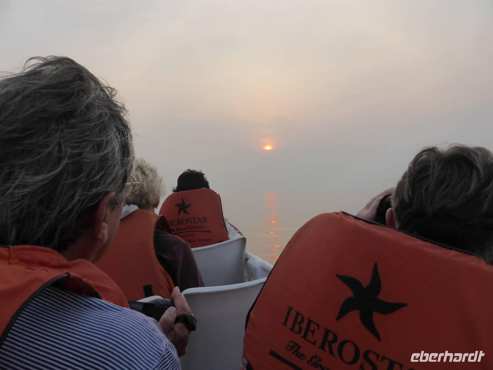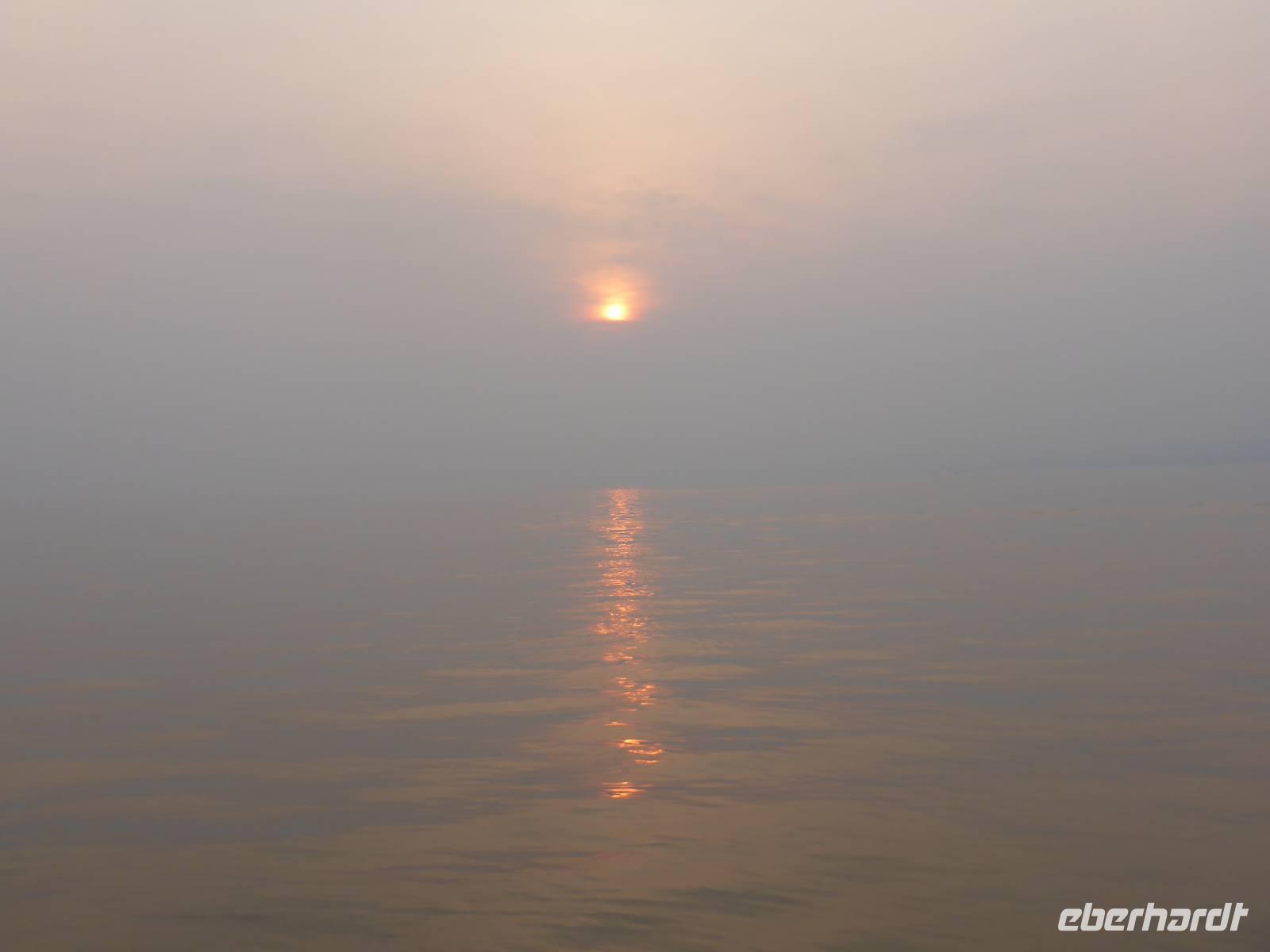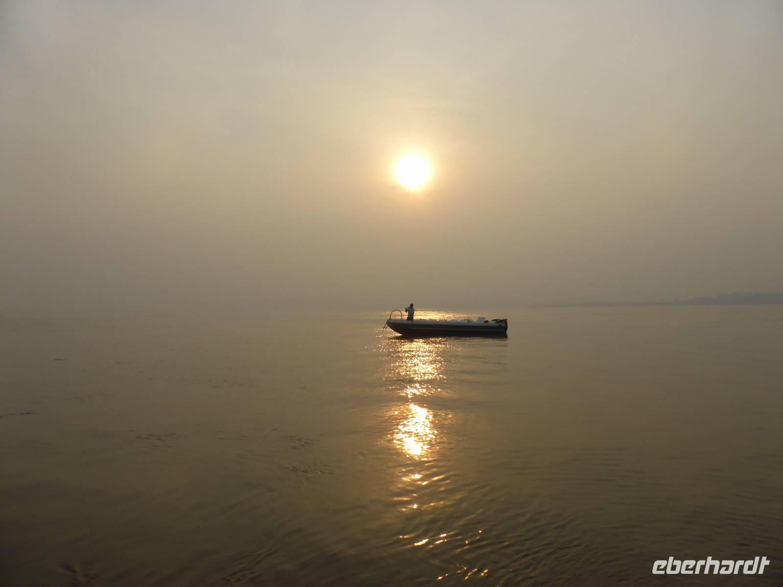 Vor dem Frühstück startete unser Bootsausflug in den Sonnenaufgang. Der Himmel war nicht ganz wolkenfrei, wodurch das Sonnenlicht auf der Wasserfläche auch nicht so intensiv wie erhofft reflektiert wurde. Es war dann schließlich doch noch ein interessanter Ausflug, da wir auf der Rückfahrt an vielen Bootshäusern vorbeifuhren und uns die Fischer stolz ihren Fang präsentierten.