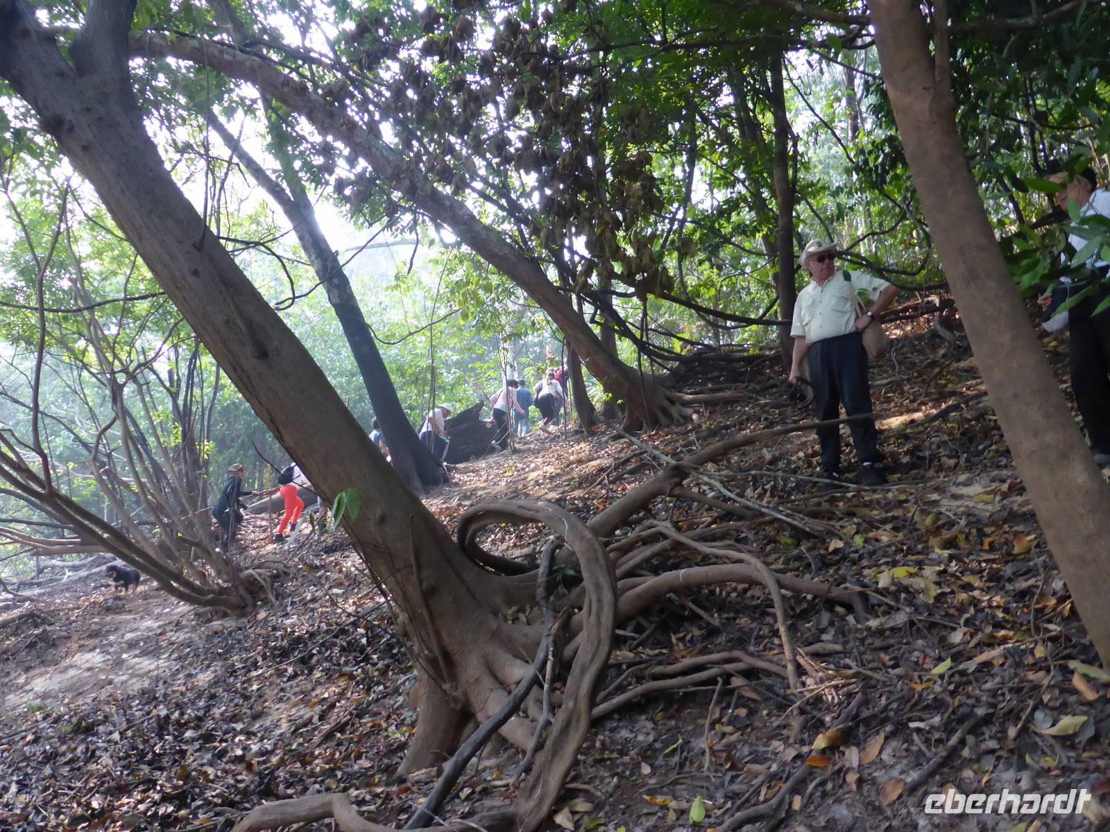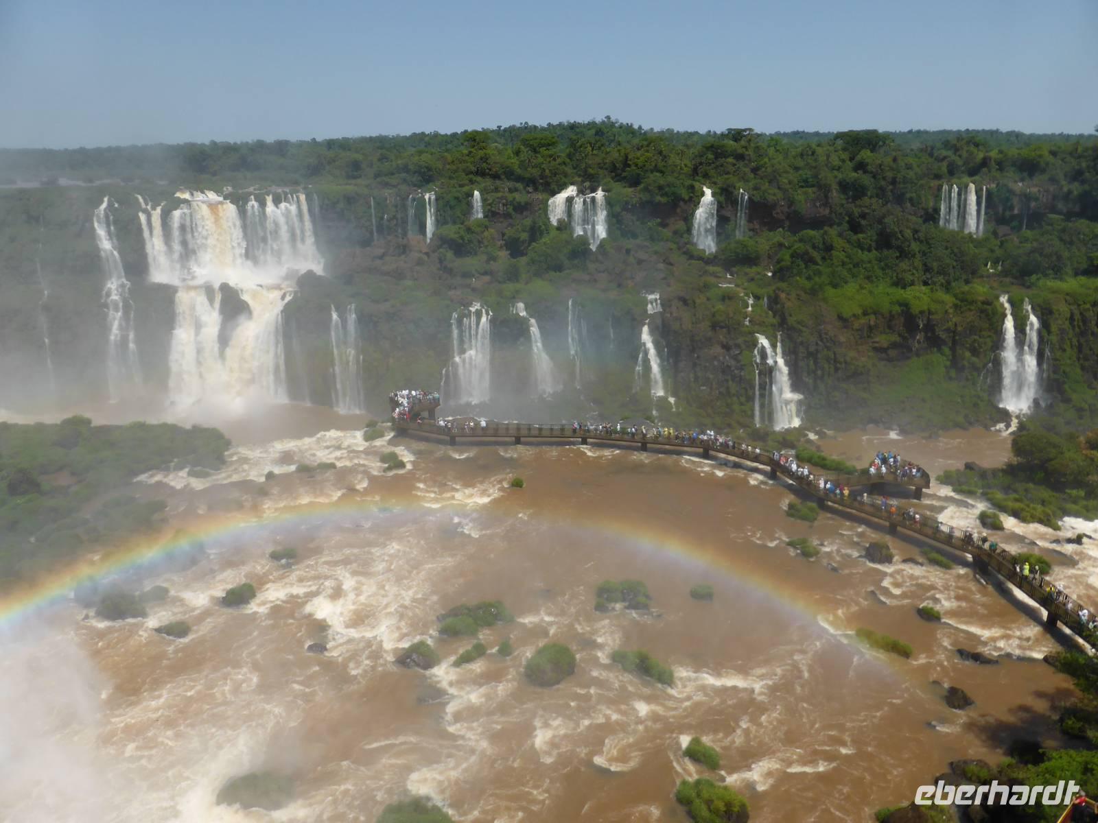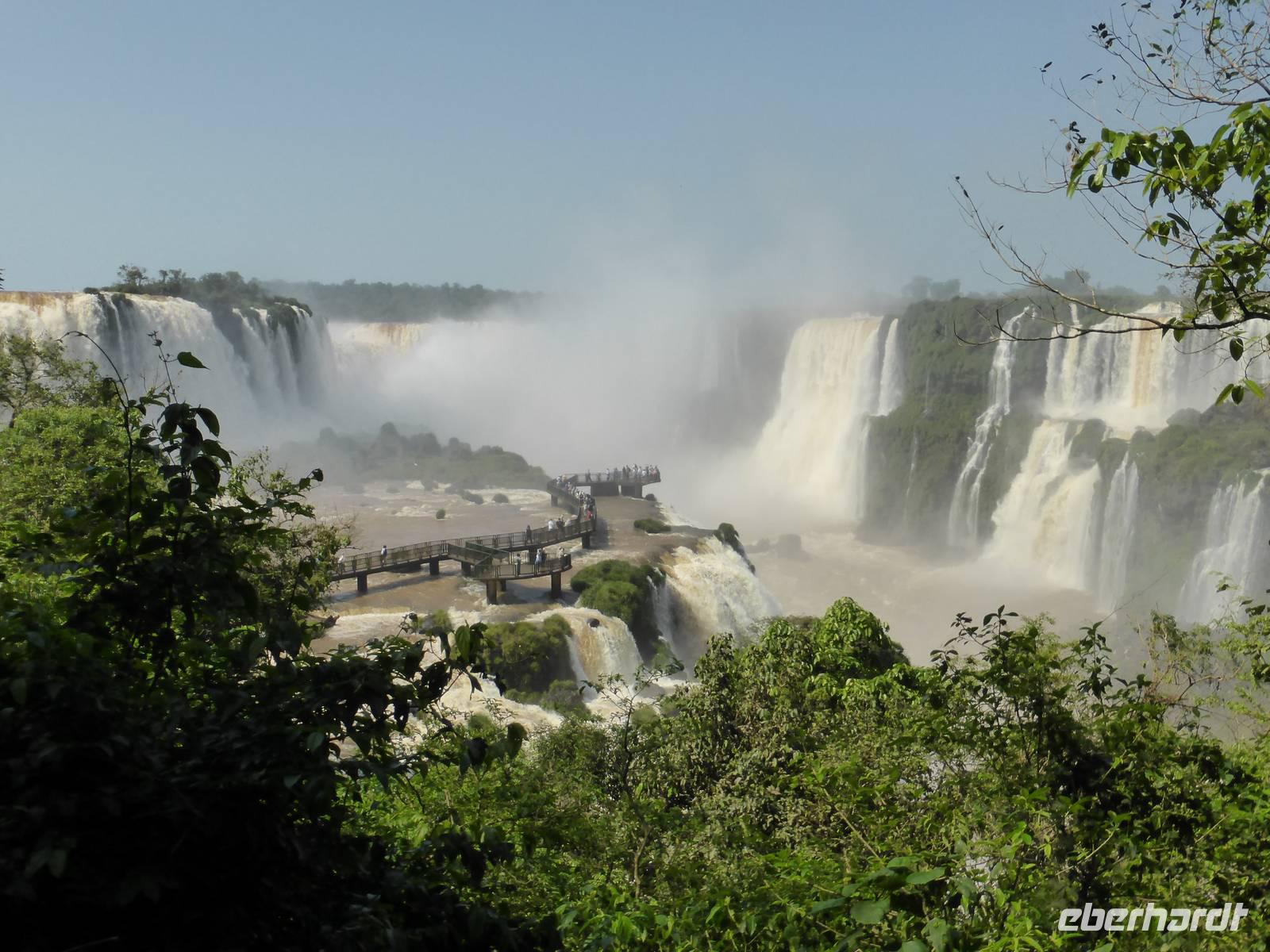 Die Iguazu-Wasserfälle auf der brasilianischen Seite bieten noch einmal einen völlig anderen Eindruck dieses einmaligen Naturschauspiels. Mit unserem Bus fuhren wir wieder in den Nationalpark hinein und hielten an einer großen Übersichtstafel, an welcher uns Heldio den Weg zu den Wasserfällen und zum anschließenden gemeinsamen Treffpunkt zeigte. Das Panorama der Wasserfälle im Hintergrund war so beeindruckend, dass wir uns gleich noch einmal zu einem Gruppenfoto versammelten. Anschließend ging es den Weg hinunter bis zum Iguazu-Fluss. Unterwegs boten sich immer wieder fantastische Fotomotive. An den Wasserfällen angekommen, führte ein Steg bis an die Wasser-Bruchkante heran. Es war empfehlenswert, vorher die Regencapes überzuziehen, da einen sofort der Sprühnebel erfasste, sobald ein wenig Wind aufkam. Vorn an der Wasserkante war es fast windstill und man konnte leicht ein paar Minuten verweilen, um das Donnern der Wassermassen in sich aufzunehmen und um Fotos von unzähligen Regenbögen zu machen. Vom Holzsteg führte anschließend ein Fahrstuhl zur Aussichtsplattform, von deren Höhe aus die Wasserfälle am vollständigsten zu sehen waren.