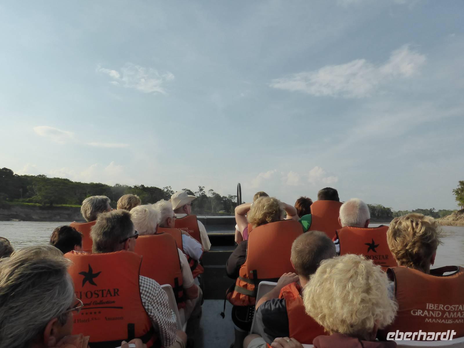 Nach dem Frühstück im Restaurant der Iberostar, fuhren wir mit den Booten nach Manacapuru zum Dschungelspaziergang. Unterwegs sahen wir viele Uferbewohner, die im Fluss badeten. Während des Spaziergangs bei tropisch heißen Temperaturen und hoher Luftfeuchte zeigte uns Jefferson, wie man sich mit der Machete einen einfachen Unterstand bauen kann. An einem Farn blieb er stehen, um aus einem Blatt eine Krone zu flechten. Am interessantesten war es aber zu erfahren, wie eine Wasser-Liane aussieht, wie sie sich anfasst und wie man das Wasser aus ihr trinken kann. Nach unserem Dschungelspaziergang fuhren wir mit den Ausflugsbooten wieder zu unserem Kreuzfahrtschiff „Iberostar" zurück. Auf dem Schiff trafen wir uns um die Kommandobrücke zu besuchen und anschließend stellte uns Jefferson die indigenen Völker des Amazonasgebietes und deren Geschichte im Rahmen eines Vortrages vor. Über die Mittagszeit wurde auf dem Sonnendeck Livemusik gespielt. Die Melodien gingen sofort ins Blut über und selbst im Pool wurde mitgetanzt und mitgesungen.