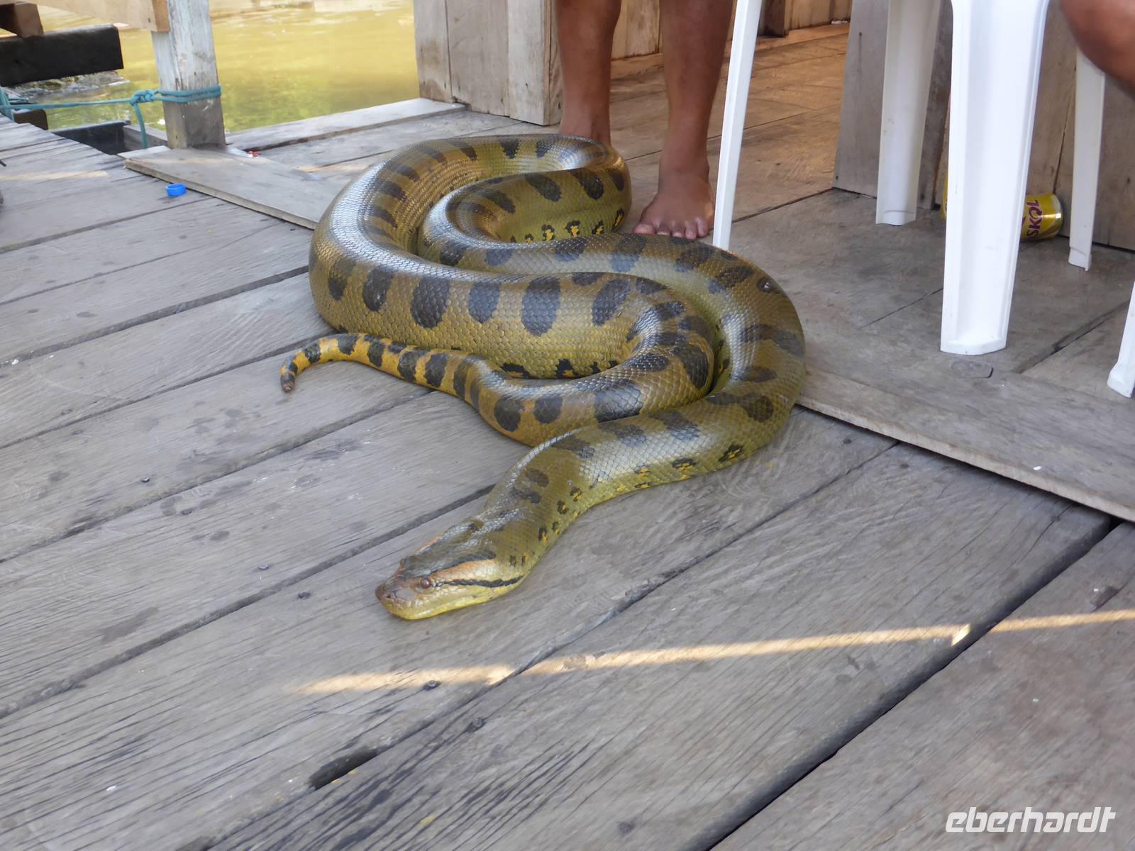 Am Nachmittag fuhren wir mit dem Ausflugsboot in die Region des Janauri-Sees, einem kleinen Bereich des Rio Solimoes/ Amazonas. Dort besuchten wir auf einem Hausboot eine Familie, welche als Attraktion eine junge Anakonda und ein junges Faultier für die Besucher bereit hält. Wir waren erstaunt, wie weich sich das Fell des Faultiers anfühlte und wie schwer die junge Anakonda war! Nach dem Besuch des Hausboots fuhren wir entlang kleiner Buchten und sahen Affen sowie viele Vogelarten. Die Wellen unseres Bootes führten dazu, dass Fische aus dem Wasser sprangen, kurz bevor die Wellen das Ufer erreichten. Vielleicht hatten sie Angst durch die Wellen an Land gespült zu werden. All dem zuzusehen war ein Vergnügen! Dazu das beste Licht, was man sich zum Fotografieren wünschen konnte! Der Abend endete mit dem großen Galadinner im Restaurant unseres Kreuzfahrtschiffes. Das Buffet war mit aus Früchten gestalteten Tukanen und Garnelen dekoriert. Danach erwartete uns eine Folklore-Show und wer Lust hatte, konnte anschließend bis in die Nacht hinein tanzen.