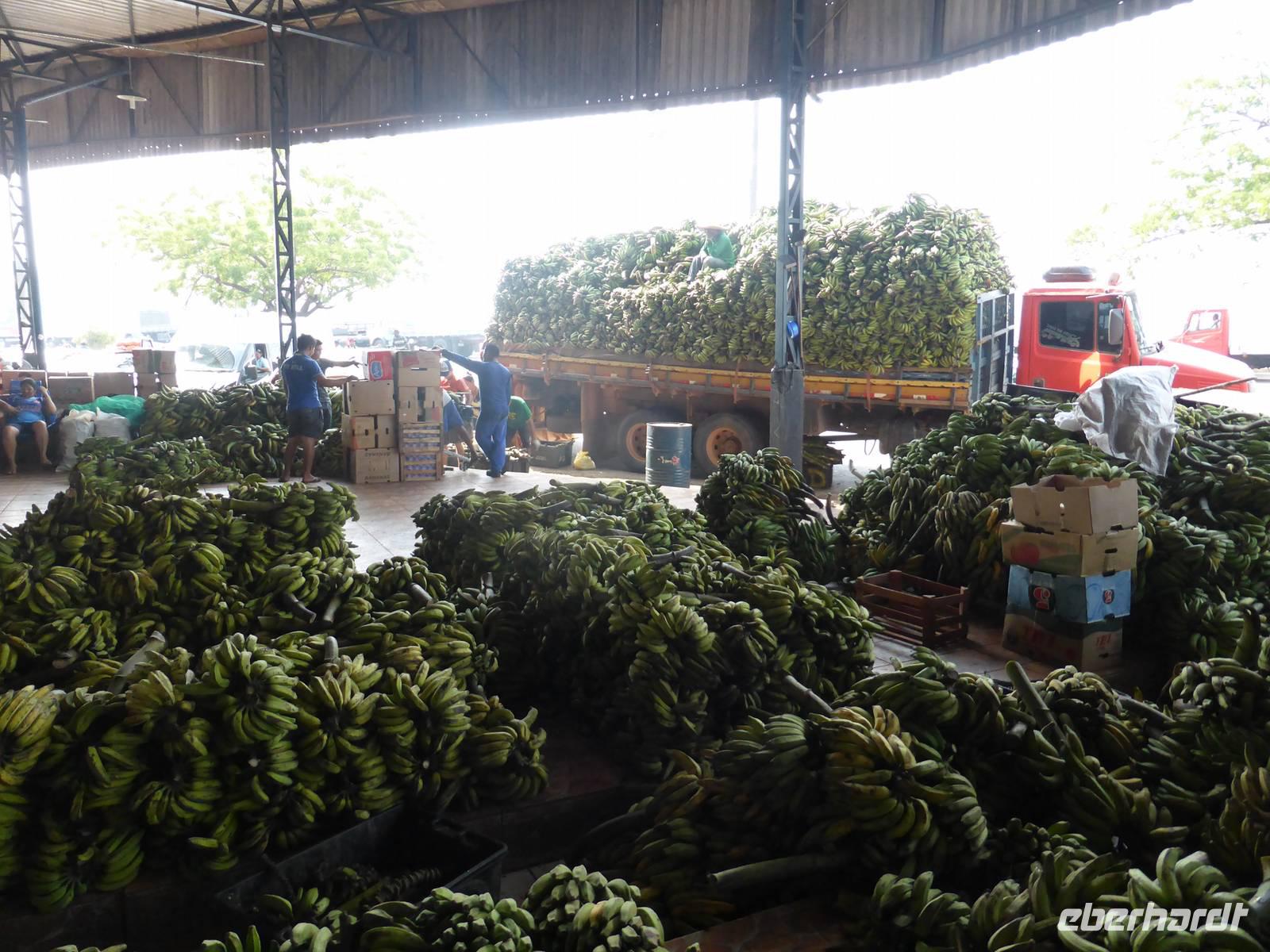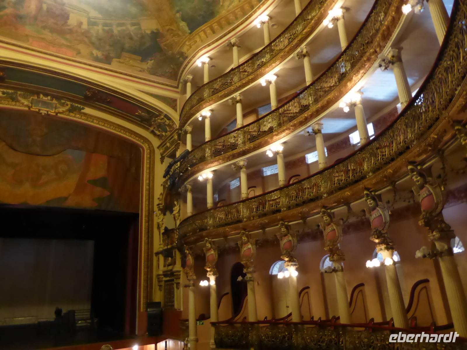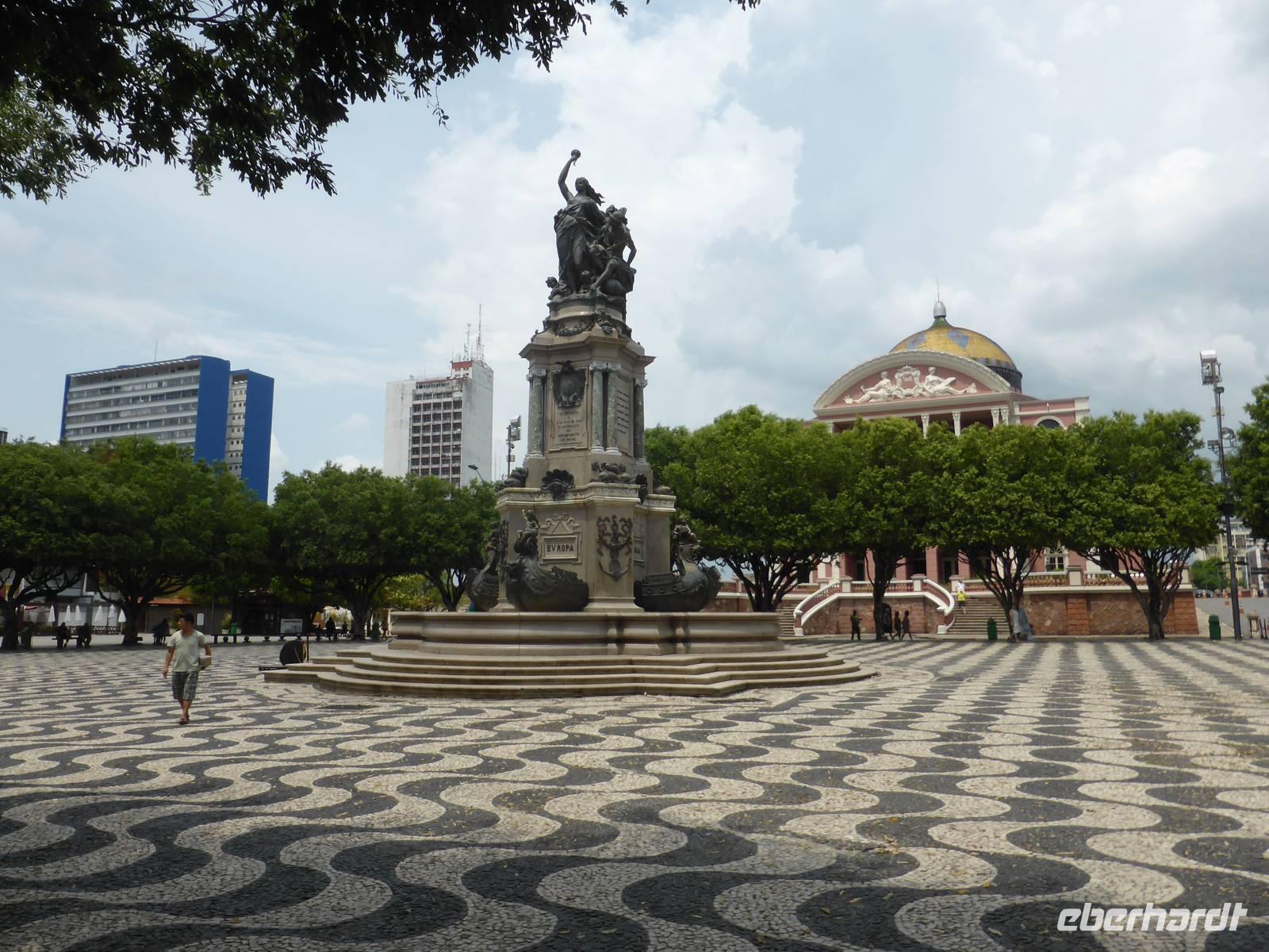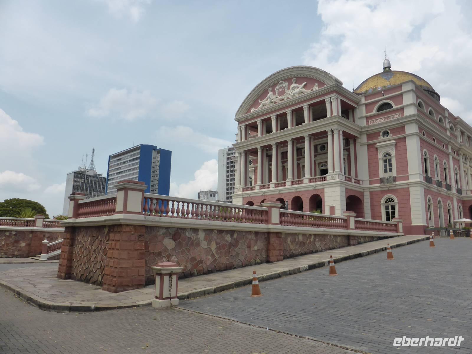 Nach der kleinen Rundfahrt stiegen wir aus. Es war sehr heiß. Ungefähr 37 Grad bei 75-80% Luftfeuchte. Carla zeigte uns den Wochenmarkt, auf dem vorwiegend mit Obstsorten, besonders Bananen, gehandelt wird. Anschließend gingen wir in die Markthalle, in der es alles Mögliche gibt. Wir besuchten die große Fischabteilung, in der die Ware ohne Kühlung weiter verarbeitet wird. Dennoch ist alles frisch und riecht auch nicht unangenehm. Danach zeigte uns Carla die Anlegestellen der Linienschiffe, auf denen Passagiere und Waren befördert werden. Da es oftmals keine Kabinen gibt, schlafen die Passagiere in Hängematten, welche sie an Bord aufhängen können. Vom Hafen ging es dann noch in den Mercado Municipal, einem nach Plänen Gustav Eifels errichteten, gusseisernen Bauwerk aus dem Jahre 1882. Die meisten Läden dieser Markthalle haben sich auf Touristen eingestellt und bieten ein entsprechendes Warenangebot an, welches den Reiz des Besuches ein wenig schmälert. Von dort fuhren wir anschließend zum Teatro Amazonas am Platz „Largo Sao Sebastiao". Hier stiegen wir aus und besuchten zunächst einen Kunsthandwerkladen, in dem ausschließlich Produkte aus indigener Produktion zum Verkauf stehen. Auf jedem Preisschild steht der Name des Stammes, aus welchem der Künstler und Hersteller des Objektes stammt. Nach diesem Besuch gingen wir zum Teatro Amanzonas. 1896 wurde dieses Bauwerk beinahe mitten im Regenwald Amazoniens für die damals 30.000 Einwohner der Stadt erbaut. Es bietet Platz für 700 Gäste und ist Zeugnis der glorreichsten Epoche Manaus, der Zeit des Kautschuk-Booms. Das Teatro Amazonas ist außerordentlich prunkvoll ausgestattet und soll die weltweit viertbeste Akustik besitzen.