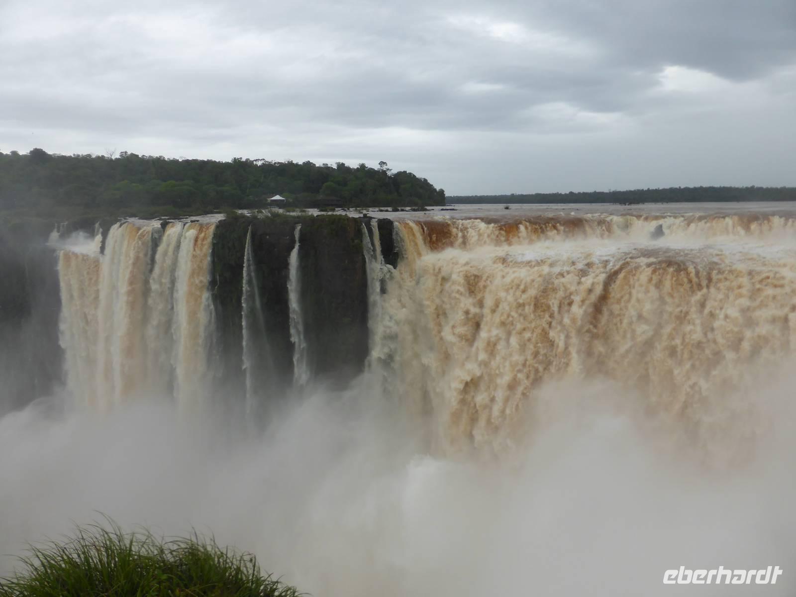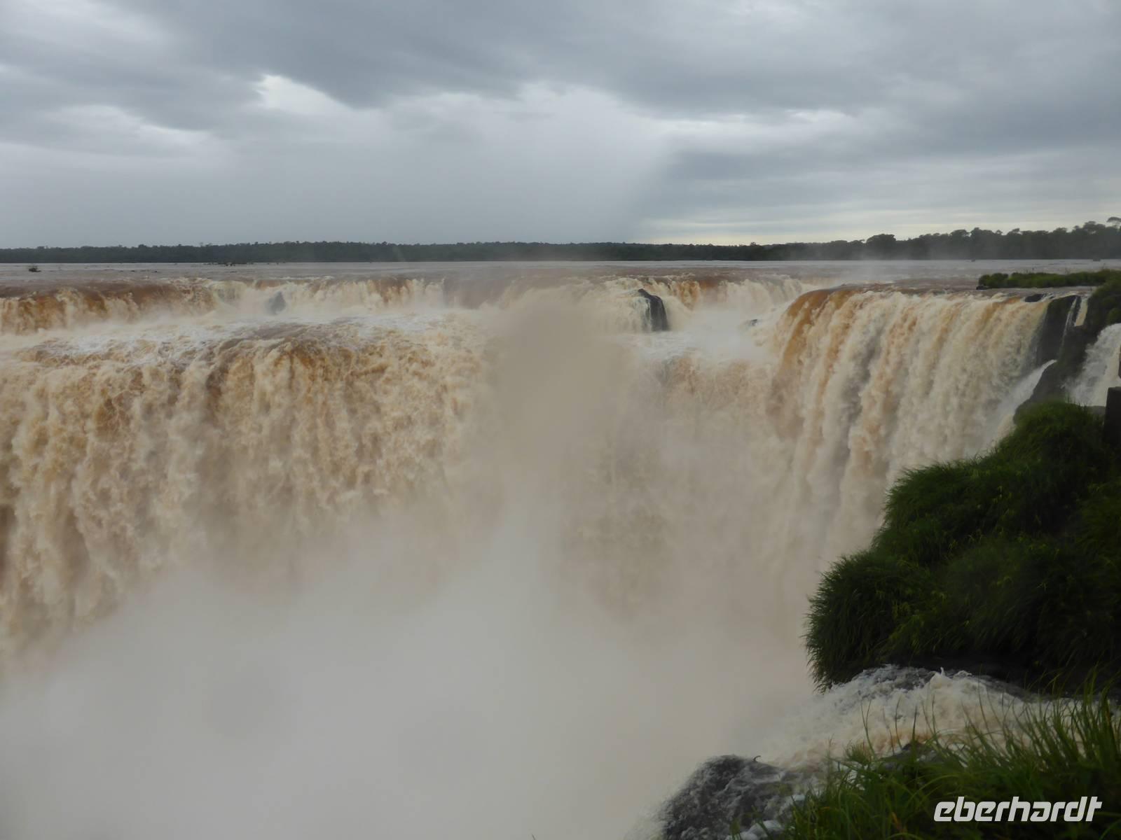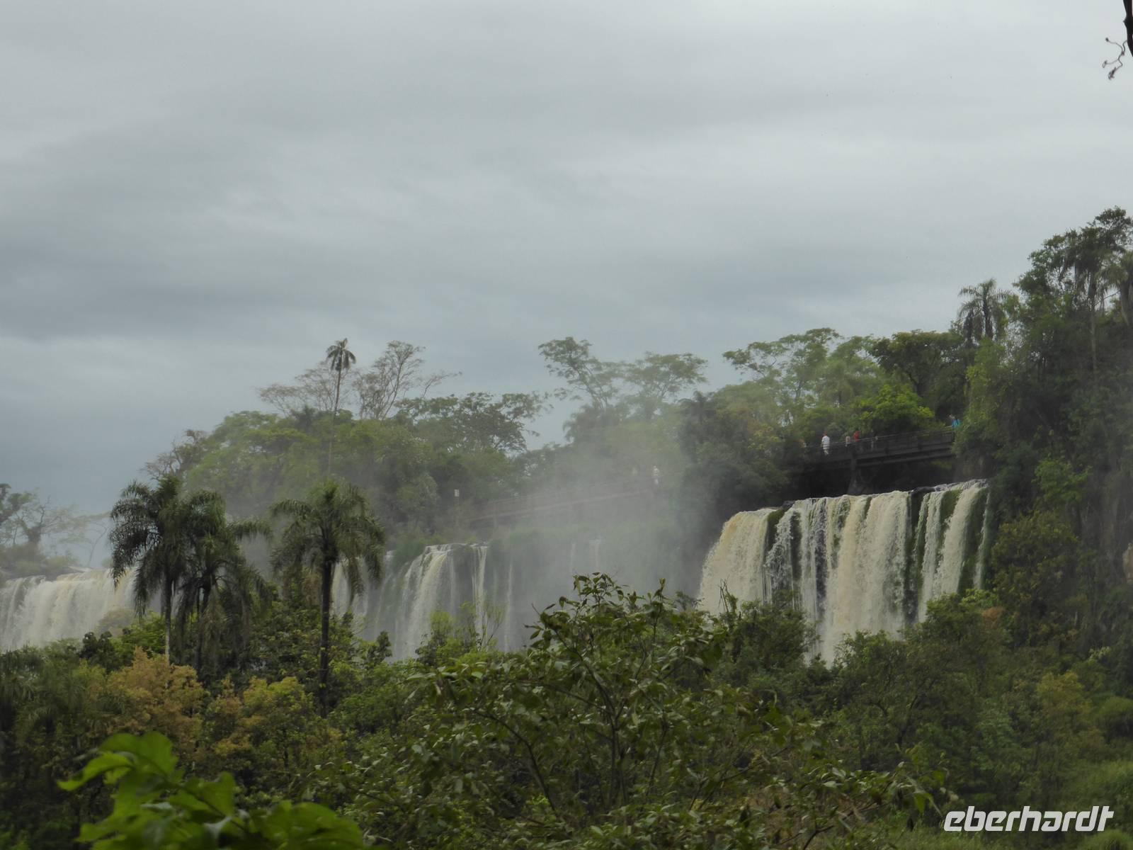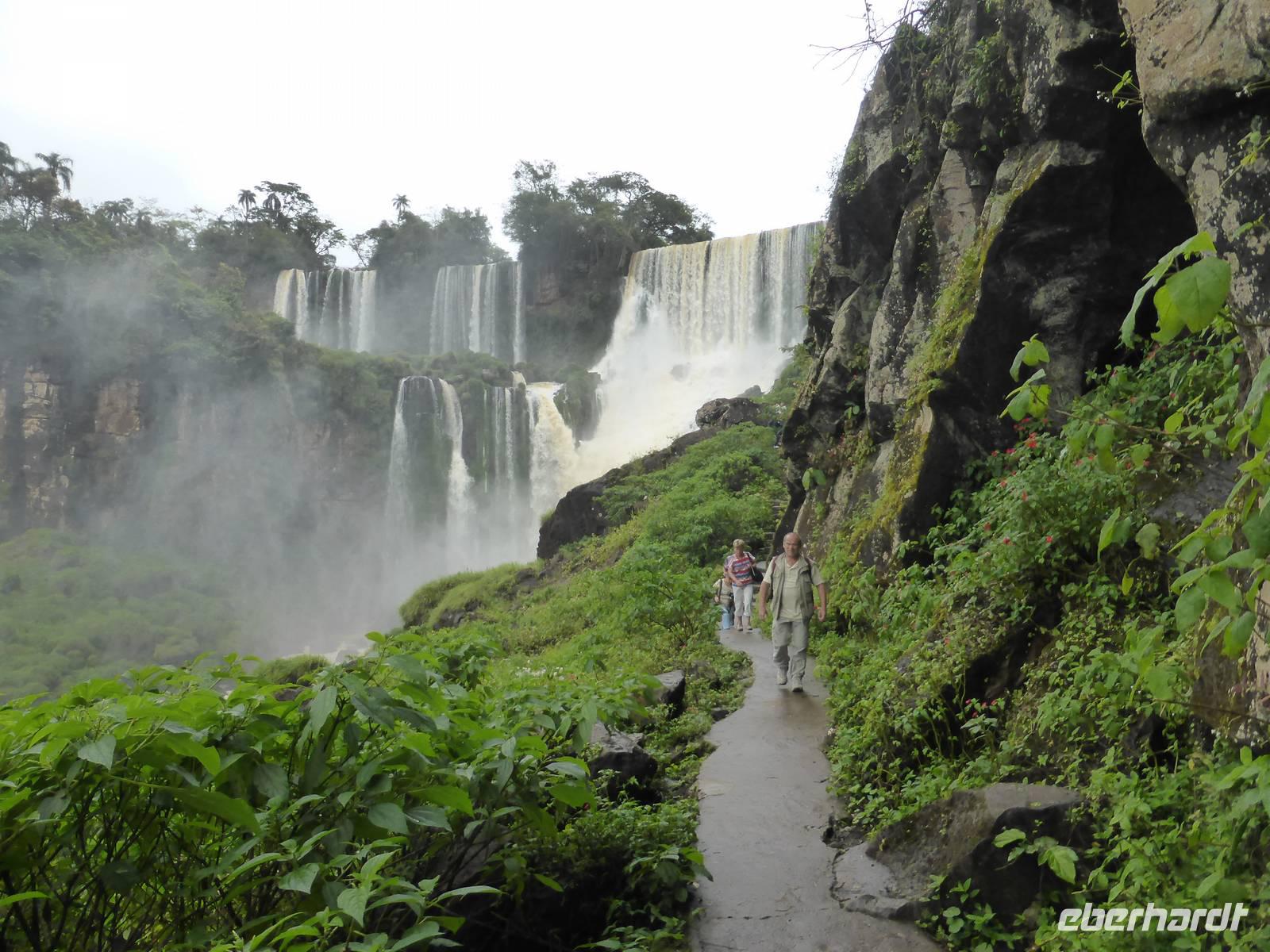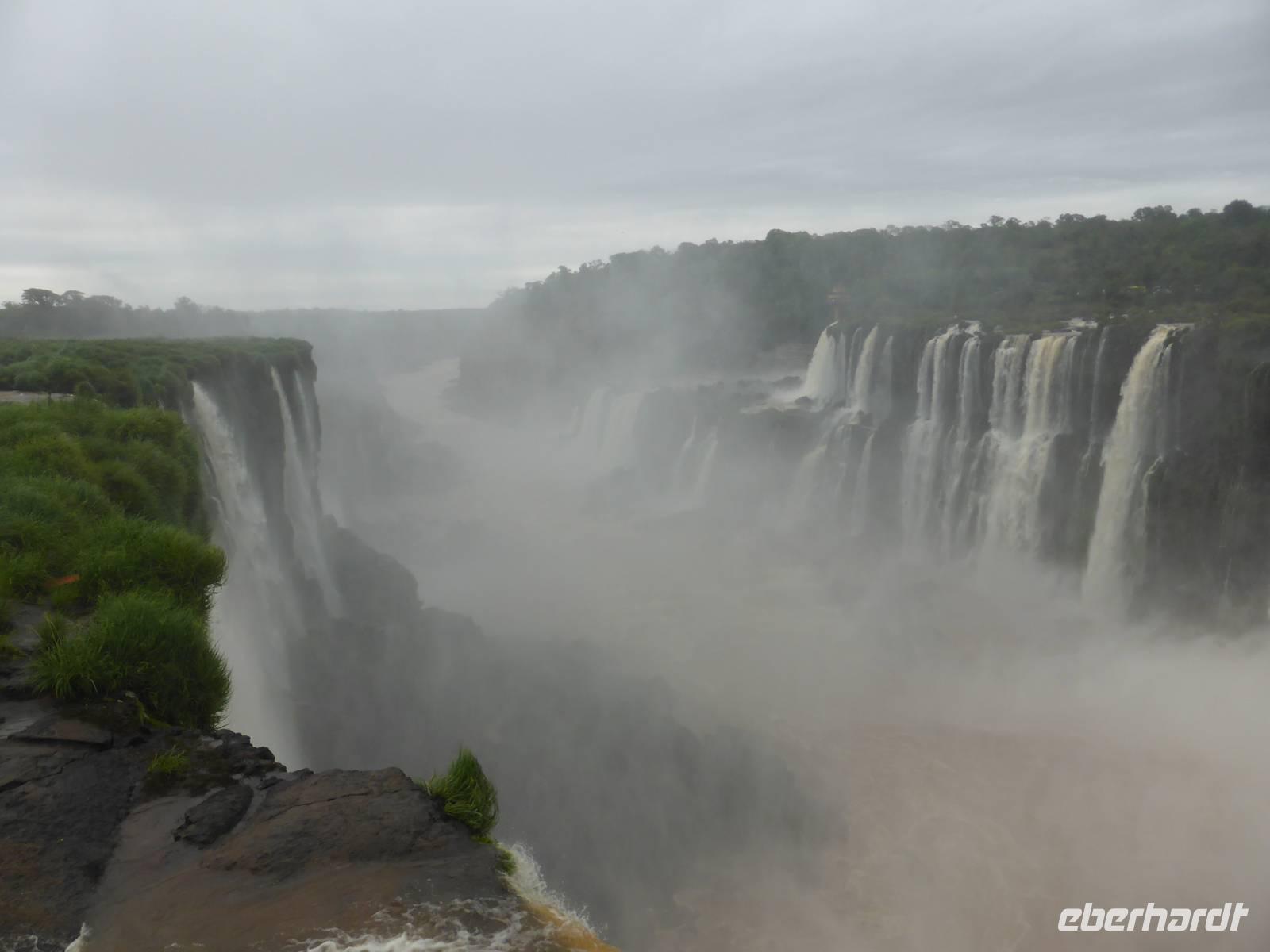 Nach einem späten Frühstück holten uns Heldio und unser Fahrer Ramon vom Hotel ab. Bereits bei unserer Ankunft im Hotel hatte Heldio unsere Pässe eingesammelt, damit die Abfertigung an der Grenze zu Argentinien nicht zu viel Zeit in Anspruch nimmt. Es ging dann auch recht schnell, nach 15 Minuten konnten wir weiterfahren. Gegen 11.00 Uhr erreichten wir den Eingang zum Iguazu- Nationalpark auf der argentinischen Seite. Zu Fuß und mit der Park-Bahn ging es zur „Garganta de Diablo, der „Schlucht des Teufels". Nach dem Ausstieg aus der Bahn führte uns der Weg über Holzstege bis zu den Wasserfällen. Dort angekommen, begann es zu regnen, obwohl der Wetterbericht nichts dergleichen vorausgesagt hatte. Trotz des Regens war es ein Erlebnis vor den hinunter donnernden Wassermassen zu stehen! Das ohrenbetäubende Rauschen des Wassers lag einem ständig in den Ohren.
