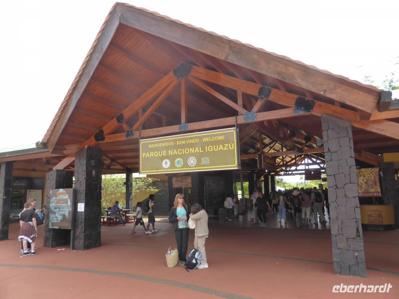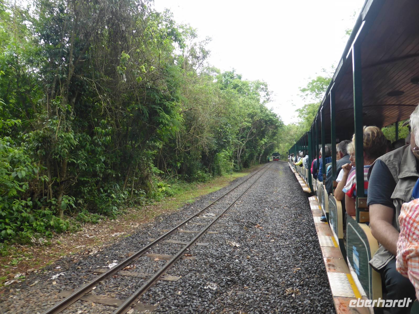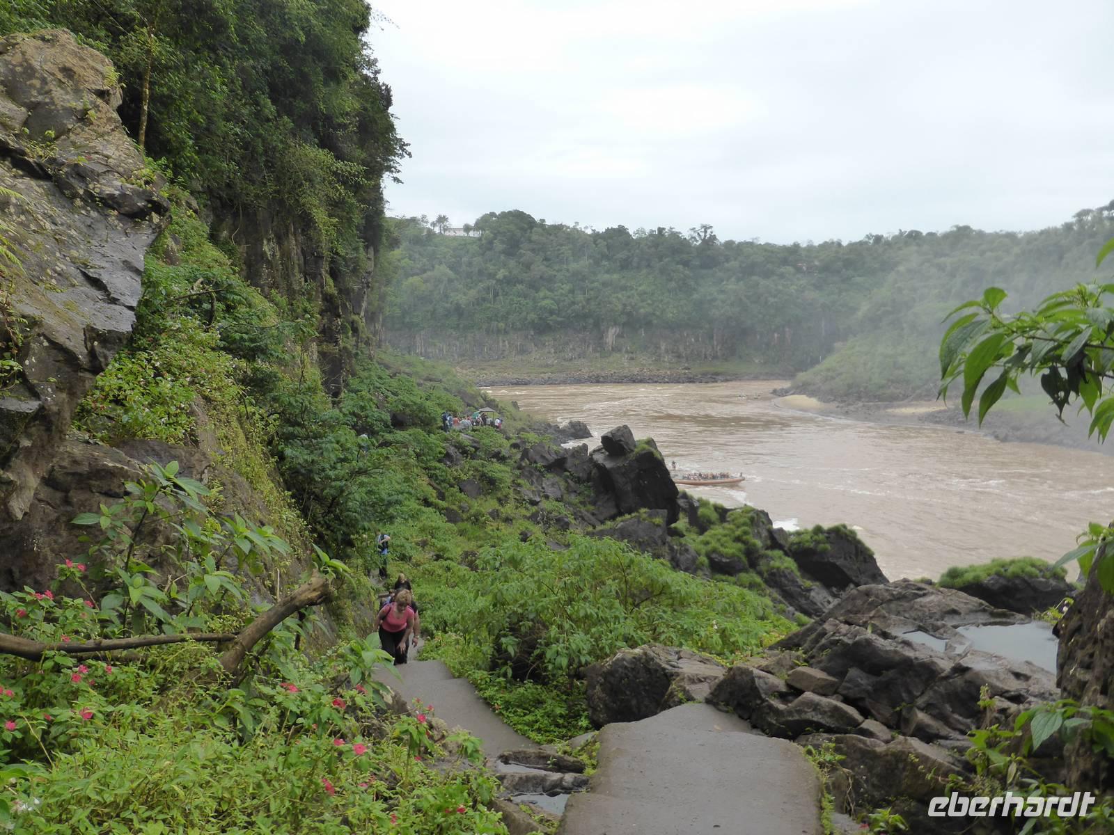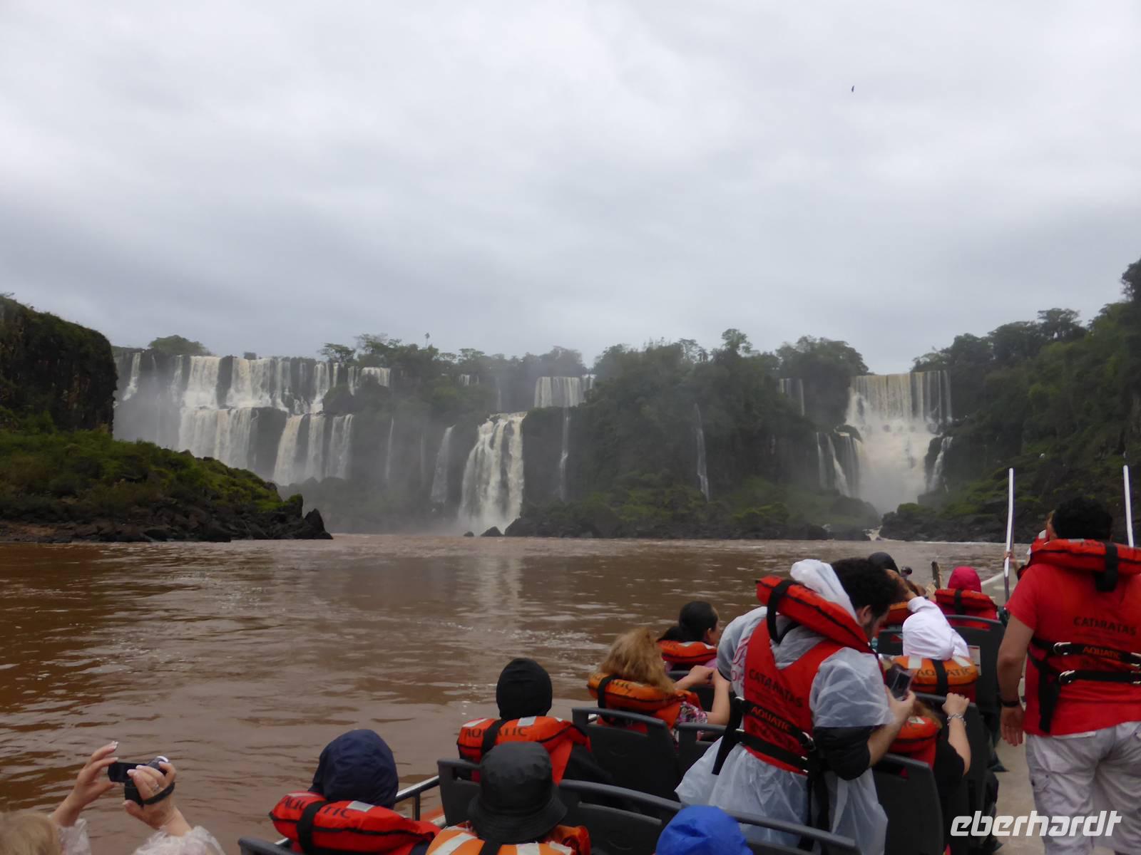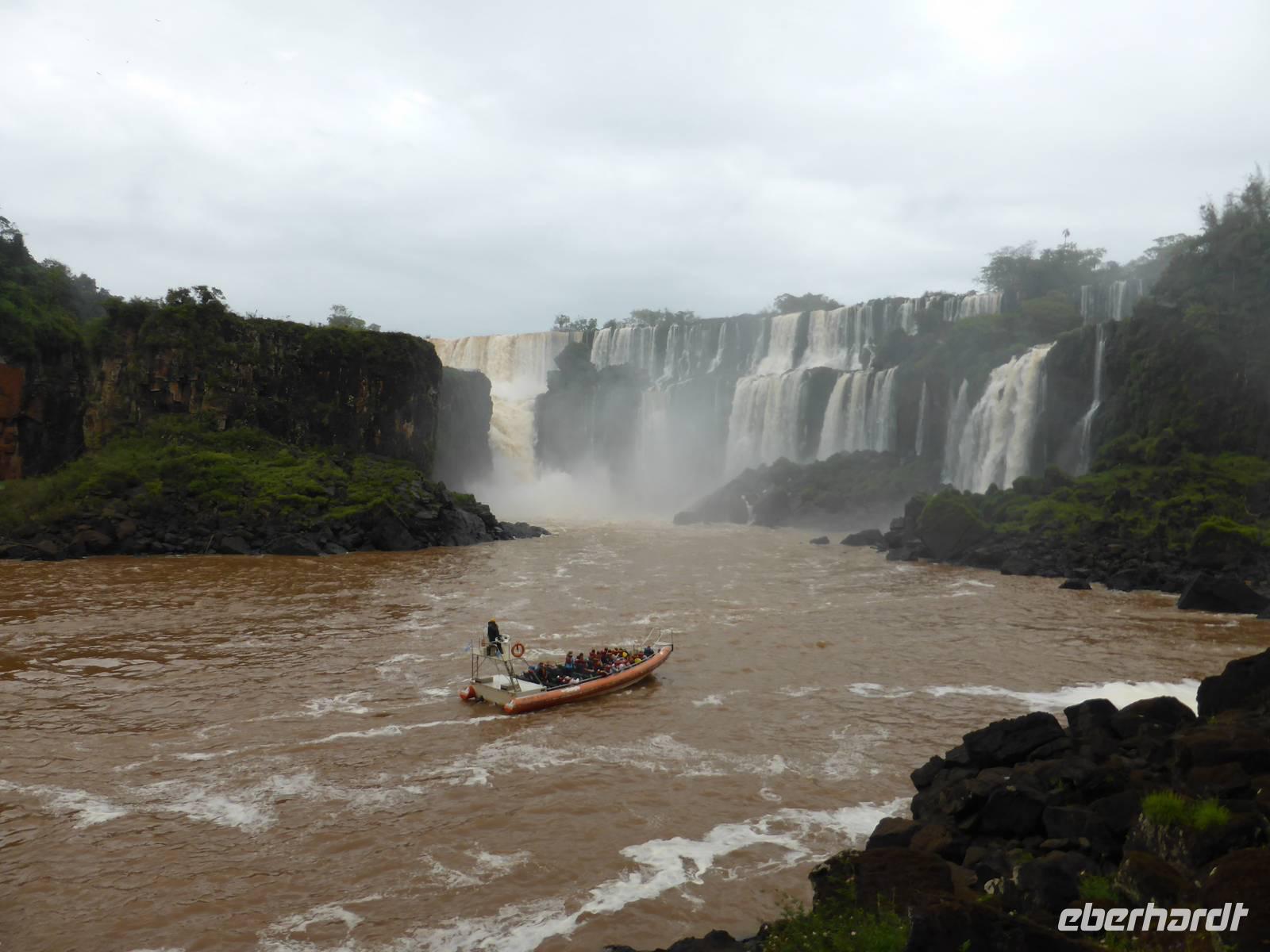 Nach einem späten Frühstück holten uns Heldio und unser Fahrer Ramon vom Hotel ab. Bereits bei unserer Ankunft im Hotel hatte Heldio unsere Pässe eingesammelt, damit die Abfertigung an der Grenze zu Argentinien nicht zu viel Zeit in Anspruch nimmt. Es ging dann auch recht schnell, nach 15 Minuten konnten wir weiterfahren. Gegen 11.00 Uhr erreichten wir den Eingang zum Iguazu- Nationalpark auf der argentinischen Seite. Zu Fuß und mit der Park-Bahn ging es zur „Garganta de Diablo, der „Schlucht des Teufels". Nach dem Ausstieg aus der Bahn führte uns der Weg über Holzstege bis zu den Wasserfällen. Dort angekommen, begann es zu regnen, obwohl der Wetterbericht nichts dergleichen vorausgesagt hatte. Trotz des Regens war es ein Erlebnis vor den hinunter donnernden Wassermassen zu stehen! Das ohrenbetäubende Rauschen des Wassers lag einem ständig in den Ohren.