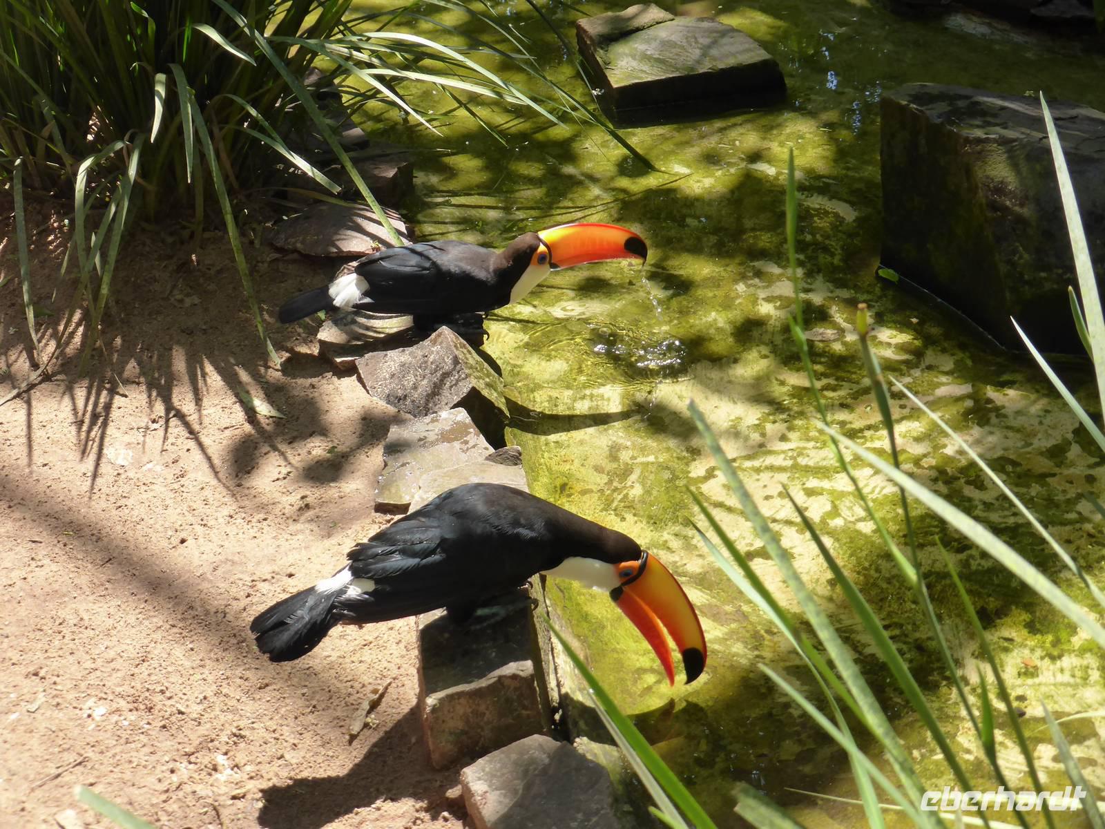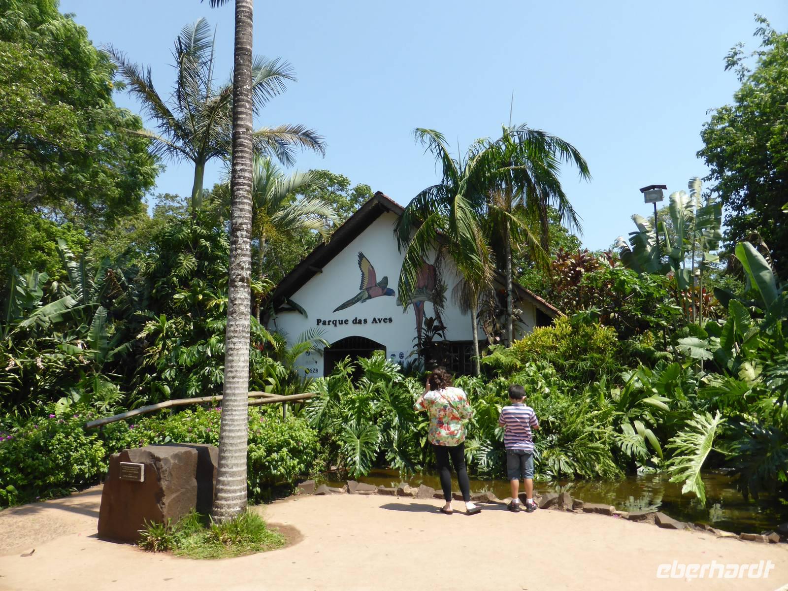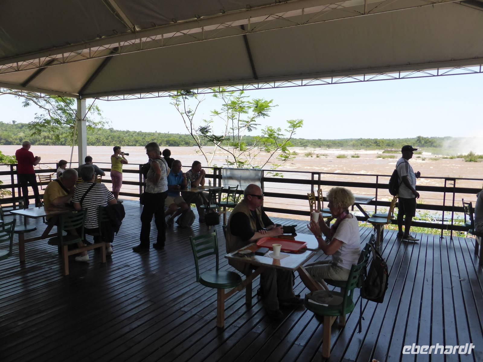 Am vereinbarten Treffpunkt bestand die Möglichkeit letzte Souvenirs und Briefmarken zu kaufen und gleich daneben warteten ein Restaurant und ein Cafe auf hungrige Besucher. Den schönsten Blick auf den Iguazu-Fluss oberhalb der Wasserfälle hatten wir vom schattigen Garten des Restaurants aus. Einzig auf die allgegenwärtigen Coatis (Nasenbären) mussten wir Acht geben. Am Nachbartisch sprang ein Tier auf den Esstisch und schnappte sich das Mittagessen, währenddessen die Gäste diese frechen Manieren noch gar nicht fassen konnten. Zum Glück bekamen sie vom Restaurant ihren Verlust ersetzt und waren beim zweiten Mal vorsichtiger. Mit dem Bus fuhren wir anschließend zu unserer Hotelanlage zurück. Der Nachmittag war frei, für das Entspannen am Pool oder für eine Besichtigung des Vogelparks. Viele Gäste besuchten ihn und wurden mit Nahaufnahmen von Tukanen, Papageien und Aras belohnt. Am Abend mussten wir die Koffer packen, denn am nächsten Morgen war unsere Abreise. Zum letzten gemeinsamen Abendessen stießen wir noch einmal mit Caipirinha an, dem berühmten brasilianischen Zuckerrohrschnaps, der als Cocktail mit Limettensaft, Zucker und Eis serviert wird.