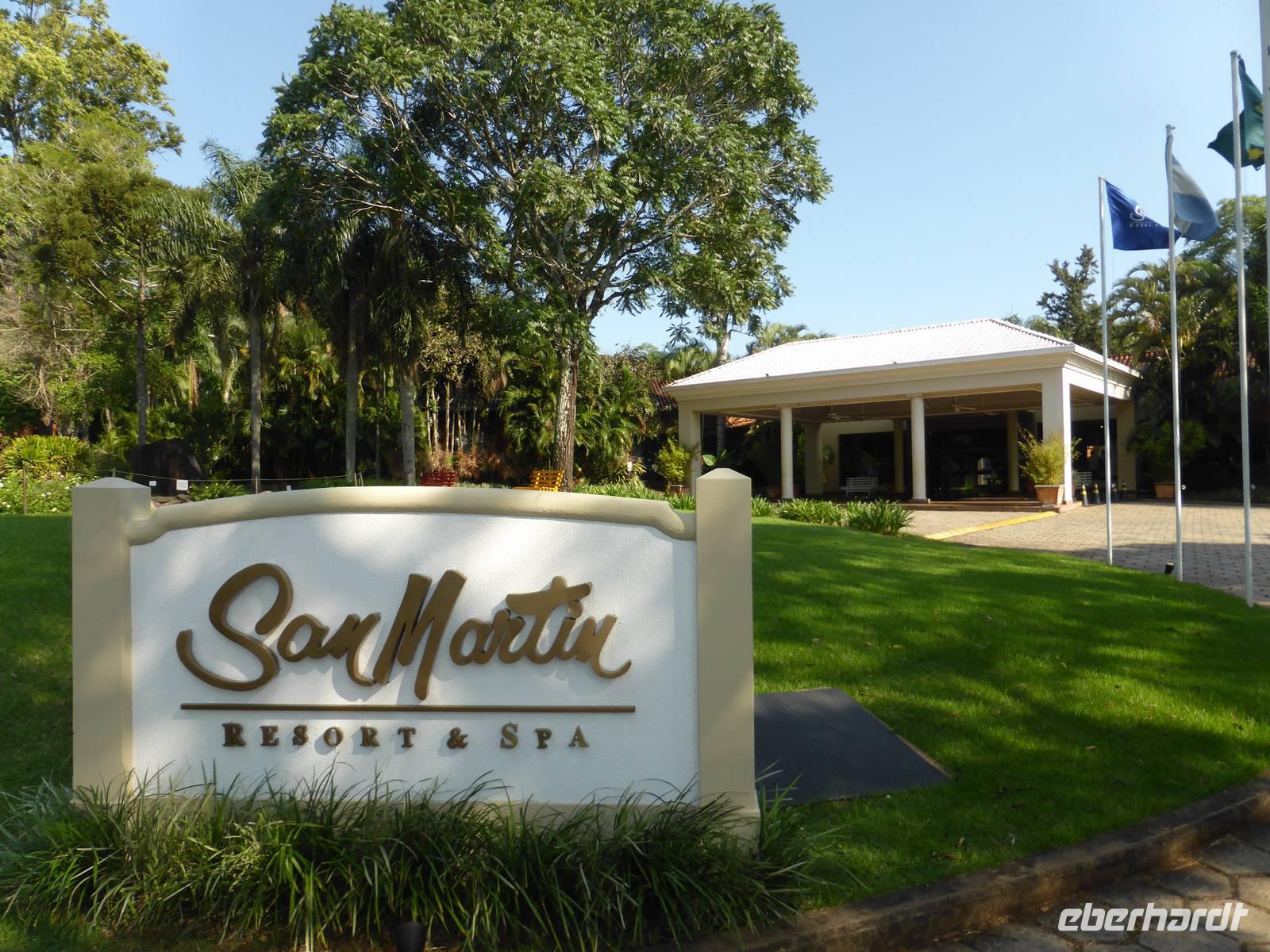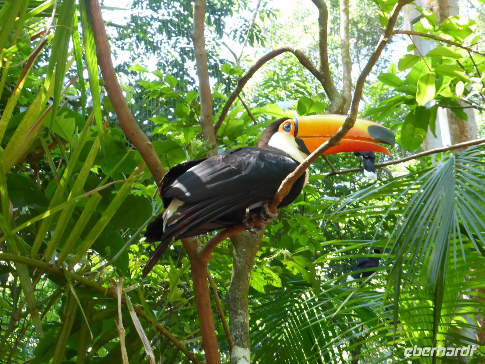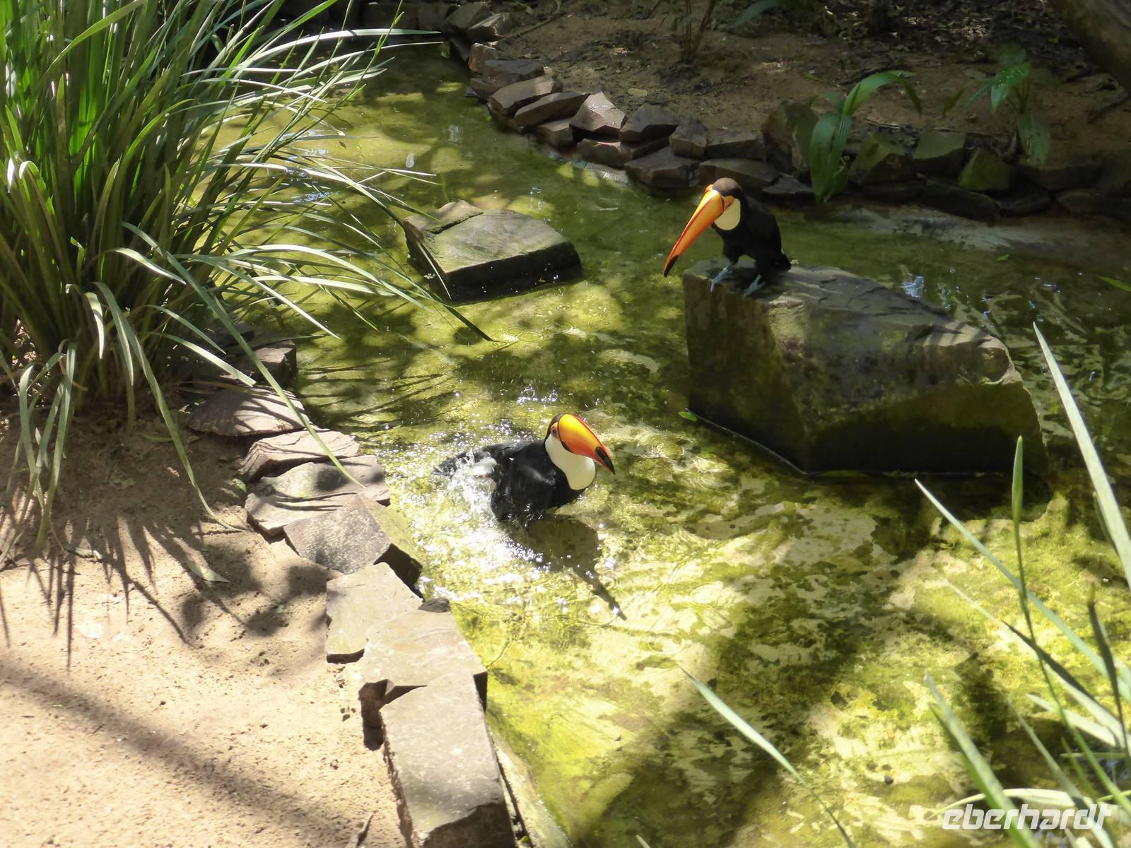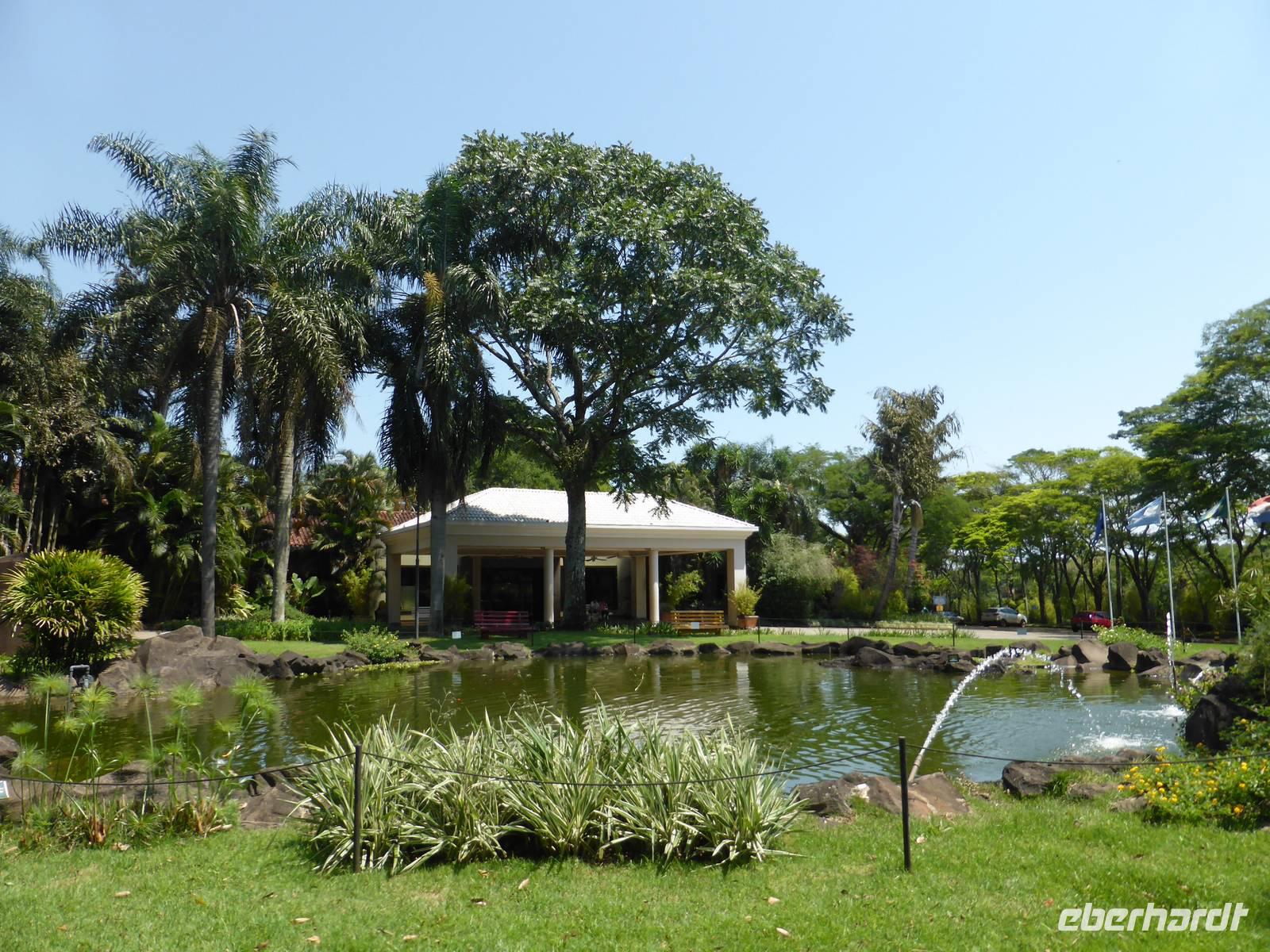 Am vereinbarten Treffpunkt bestand die Möglichkeit letzte Souvenirs und Briefmarken zu kaufen und gleich daneben warteten ein Restaurant und ein Cafe auf hungrige Besucher. Den schönsten Blick auf den Iguazu-Fluss oberhalb der Wasserfälle hatten wir vom schattigen Garten des Restaurants aus. Einzig auf die allgegenwärtigen Coatis (Nasenbären) mussten wir Acht geben. Am Nachbartisch sprang ein Tier auf den Esstisch und schnappte sich das Mittagessen, währenddessen die Gäste diese frechen Manieren noch gar nicht fassen konnten. Zum Glück bekamen sie vom Restaurant ihren Verlust ersetzt und waren beim zweiten Mal vorsichtiger. Mit dem Bus fuhren wir anschließend zu unserer Hotelanlage zurück. Der Nachmittag war frei, für das Entspannen am Pool oder für eine Besichtigung des Vogelparks. Viele Gäste besuchten ihn und wurden mit Nahaufnahmen von Tukanen, Papageien und Aras belohnt. Am Abend mussten wir die Koffer packen, denn am nächsten Morgen war unsere Abreise. Zum letzten gemeinsamen Abendessen stießen wir noch einmal mit Caipirinha an, dem berühmten brasilianischen Zuckerrohrschnaps, der als Cocktail mit Limettensaft, Zucker und Eis serviert wird.