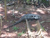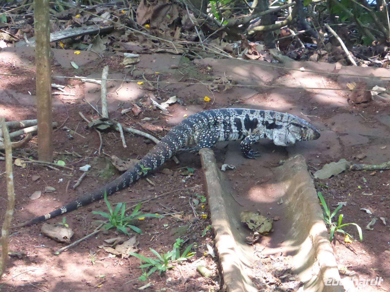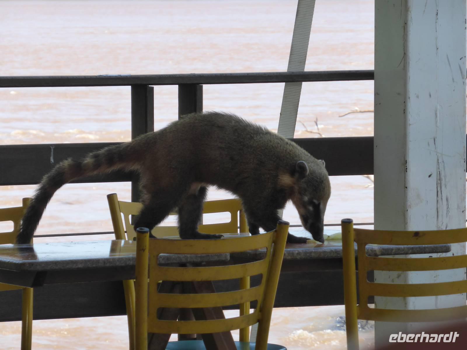 Nach dem Besuch der Teufelsfälle und der Rückfahrt mit dem Zug besuchten wir den „Lower Trail", den „Unteren Weg", welcher uns wieder dicht an die Wasserfälle heranführte. Unterwegs kamen uns Coatis (Nasenbären) auf dem hölzernen Handlauf des Geländers entgegen spaziert. Anfassen sollte man sie lieber nicht, denn überall im Park wird auf Bildern vor den Verletzungen gewarnt, welche die scharfen Zähne der sonst so possierlichen Tiere anrichten können.