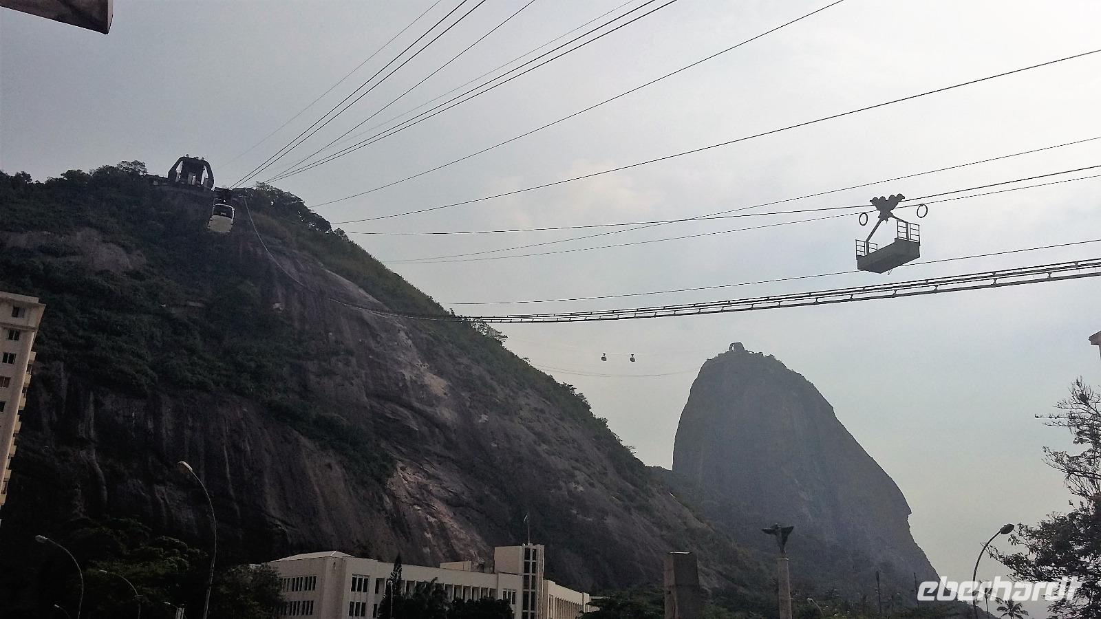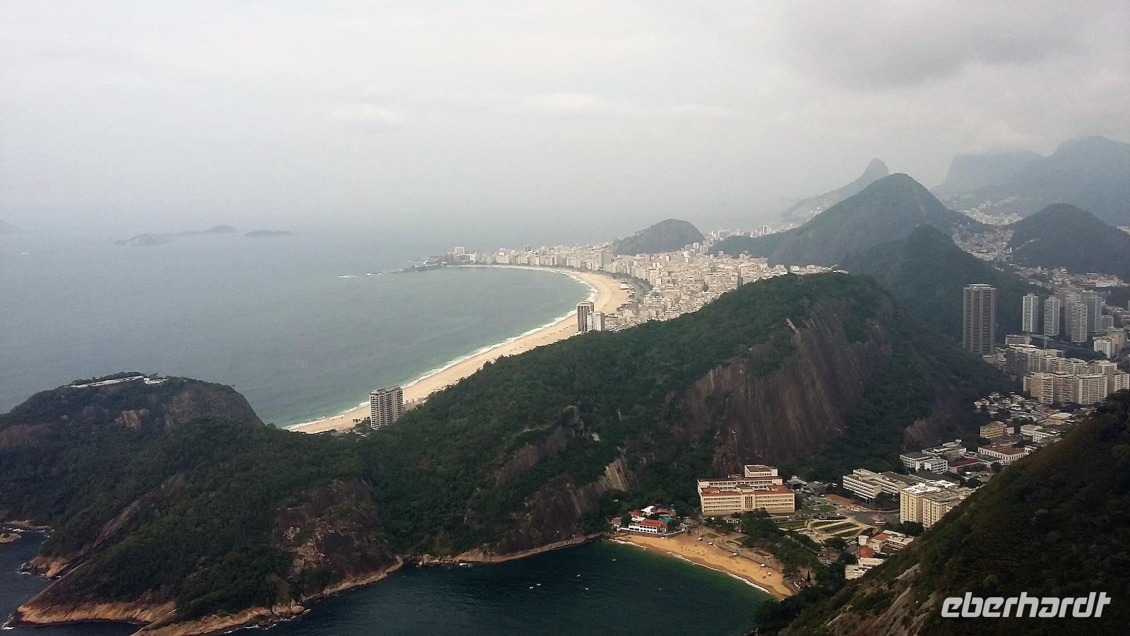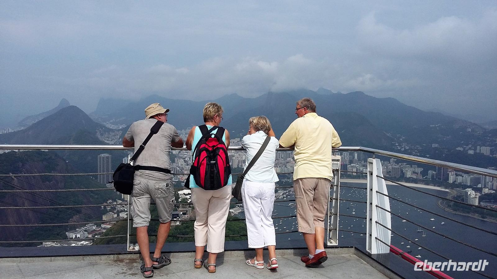 Guten Morgen Rio! Überpünktlich landeten wir in der Stadt des Zuckerhuts und der Copacabana. Ein langer Weg, auf den wir gar nicht eingestellt waren, wartete auf uns vom Ausstieg bis zum Gepäckband. Nach jeder Kurve kam wieder ein langer Gang. Aber was soll's wir hatten ja Zeit. Große Freude herrschte bei allen, als auch der letzte Koffer auf dem Gepäckband zu sehen war. Ganz unkompliziert konnten wir die Zollkontrolle passieren, auch wenn einige von uns nochmal die Koffer durchleuchten lassen mussten. Am Ausgang wartete bereits unsere Reiseleiterin Natalina auf uns. Sie hatte sich schon Sorgen gemacht, da zwischen Ankunft des Fluges und unserer Ankunft bei ihr mittlerweile 1 Stunde ins Land gegangen war und sie extra zeitiger aufgestanden war, weil sie gesehen hatte, dass Lufthansa zeitiger in Rio sein würde. Aber so ist es halt, wenn man unterwegs ist, es lässt sich nicht alles minutiös planen. Mit einem Kleinbus, in dem wir alle bequem Platz hatten, ging es dann zu unserem Hotel Windsor an der Copacabana. Bereits auf der Fahrt über die Schnellstraße sahen wir den Corcovado mit der Christusstatue in der Ferne. Durch den über 4 km langen Tunnel, fuhren wir sogar direkt unter der Statue hindurch und Christus breitete sein Arme im wahrsten Sinne des Wortes über uns aus. Einen ersten Eindruck bekamen wir auch schon von den Favelas, die entlang der Straße immer wieder zu sehen waren. Natalina erzählte uns, dass hier nicht nur Obdachlose uns Kriminelle wohnten, sondern auch viele normale Arbeiter, die sich die teuren Eigentumswohnungen der Innenstadt und an den Stränden nicht leisten können. Natürlich stand unser Blickwinkel auf Rio immer noch unter dem Eindruck der Olympiade. An der Lagune, wo die Ruder- und Kanuwettbewerbe ausgetragen wurden, erinnerten wir uns daran, wie das Wasser erstmal gereinigt werden musste. Aber es war schön zu sehen, dass es hier auch einen einheimischen Ruderclub gibt, der hier schon am frühen Morgen fleißig trainierte. Noch eine kurze Fahrt und wir waren bereits um 8.00 Uhr im Hotel. Mit ganz viel Glück bekamen wir sogar schon alle unsere Zimmer, womit wir gar nicht gerechnet hatten. Was für ein Luxus! Etwas Zeit zum Frischmachen und dann ging es schon kurz vor um 9 zu den ersten Erkundungen. Zunächst fuhren wir zum Zuckerhut, um mit der Seilbahn den Gipfel zu erklimmen. Unser erstes Teilstück führte uns bis auf yy m Höhe, wo wir bereits einen wunderbaren Ausblick auf die Bucht hatten, auch wenn sich die Christusstatue auf dem Corcovado gegenüber nur ab und zu zeigte. Weiter ging es dann auf dem zweiten Teilstück hinauf auf den Berg. Wir erfuhren, dass der Zuckerhut in allen anderen Sprachen Zuckerbrot heißt, da er einer Süßigkeit ähnelt. Nur die Deutschen verwenden den Namen Zuckerhut. Natürlich durfte ein Foto von jedem mit Blick auf die Copacabana nicht fehlen. Geduldig warteten wir, bis sich die Christusstatue auf der anderen Seite zwischen den Wolken hervorschob. Zusätzlich kamen wir noch in den Genuss, den majestätisch dahinschwebenden Fregattvögeln zuzuschauen. Weiter führte uns unsere kleine Rundfahrt durch die Altstadt bis zur neuen Kathedrale von Rio. Ein komisches Gebäude von außen, aber sehr interessant von innen. Schade, dass es kein Konzert gab, um die Akustik zu testen. Und nun stand noch das Sambadrom auf dem Programm. Wir waren überrascht, dass die Strecke für die Umzüge nur so kurz ist. Sogar von hier aus hatte man einen Blick direkt zu einer Favela, die aber von den Bewohnern bunt angemalt wurde, damit es schöner aussieht. Beim nächsten Karneval werden wir bestimmt ganz genau im Fernsehen den Umzug anschauen. Beim Ausstieg gab es die Möglichkeit, eines der Kostüme anzuprobieren, aber wir begnügten uns damit, den anderen Touristen dabei zuzusehen und das eine oder andere Foto zu schießen. Im Hotel zurück, trafen wir uns auf der Dachterrasse zu einem Begrüßungs-Caipirinha. Hoch über der Stadt genossen wir das für Rio und Brasilien so typische Getränk. Danach konnte sich jeder erstmal etwas einrichten und frisch machen, bevor wir uns zu einem Strandspaziergang trafen. Gemeinsam machten wir uns auf zur Copacabana. Da es doch etwas windig war und die Sonne nicht ständig schien, gingen wir nur mit den Füßen ins Wasser, aber die Wellen überraschten uns doch immer mal und so mancher hatte nasse Hosenbeine oder Schuhe. Auf dem Rückweg zum Hotel gingen wir entlang der Avenida und spätestens am 3. Kiosk kam der Durst auf ein frischgezapftes Bier. Also suchten wir uns einen netten Kiosk aus und stießen auf unsere gemeinsame Reise an.