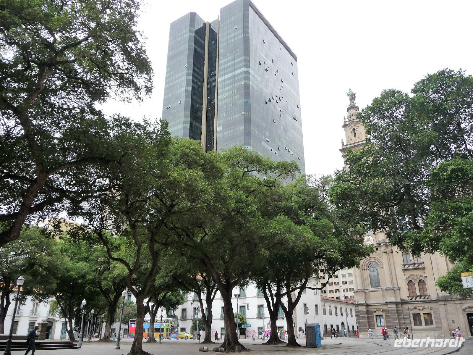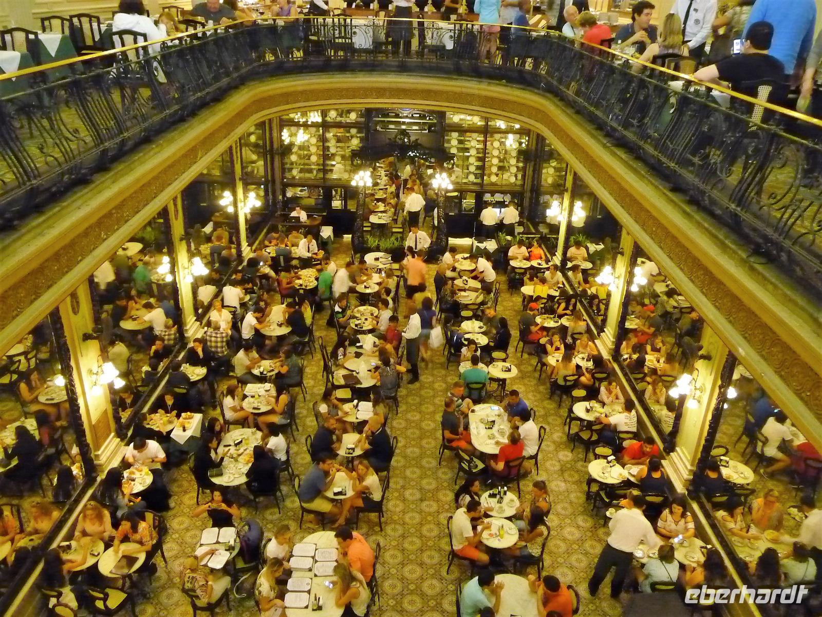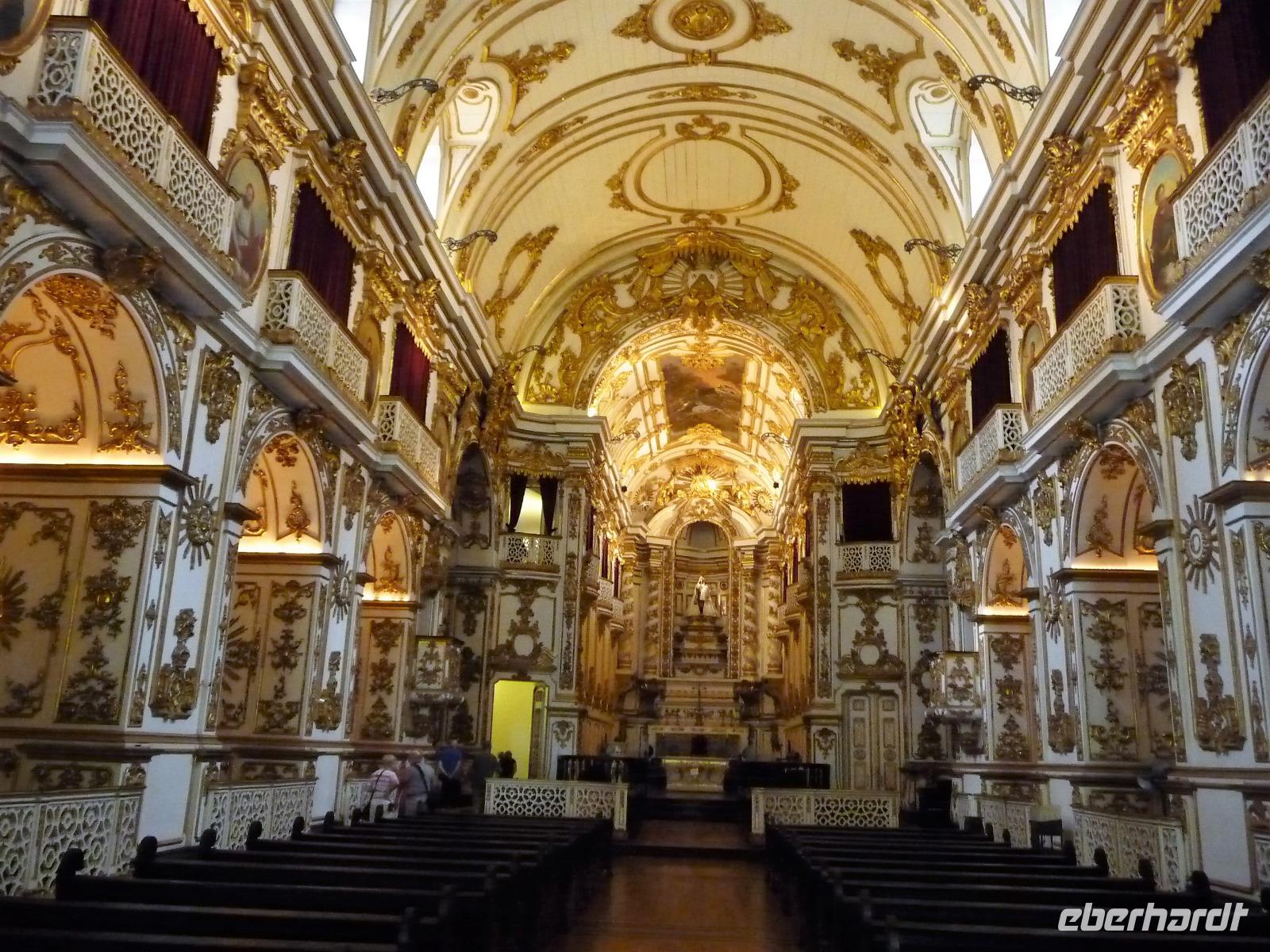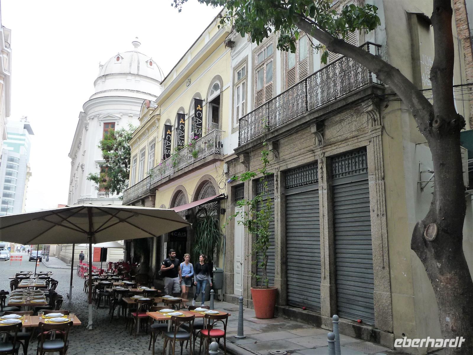 Der heutige Tag stand ganz im Zeichen von Rio. Gut gestärkt vom ausgezeichneten Frühstücksbüffet wollten wir heute den Corcovado erkunden. Da es aber wettermäßig nicht so gut aussah, hatte Natalina unsere Auffahrt auf den Nachmittag verschoben und wir fuhren zuerst in die Altstadt. Am Platz des 15. November, der für die Cariocas ein ganz besondere historische Bedeutung hat, stiegen wir aus. Natalina gab uns eine Einführung in die Geschichte der Stadt, dabei standen wir direkt auf den Straßenbahnschienen, die eigentlich zur Olympiade fertig sein sollten. Bisher ist nur ein Teil der Strecke in Betrieb, mal sehen, ob bei unserem nächsten Besuch in Rio alle Strecken befahren werden. Ein kurzer Abstecher führte uns zu einem Kanonenkugelbaum, den einige von uns bereits auf anderen Reisen gesehen hatten, aber noch niemand in voller Blüte. Toll!!! Wunderschön und völlig überrascht waren wir vom Inneren der alten Kathedrale. Wunderbar die komplette Innenausstattung aus Holz mit goldener Bemalung, prunkvoll aber nicht zu überladen. Hier konnten wir uns alle vorstellen, dass so mancher seine Hochzeit gern hier feiert. Unser Spaziergang führte uns weiter durch die Altstadt von Rio, wo doch noch so manches alte Gebäude zwischen den meist nicht so ansehnlichen Hochhäusern zu finden war. Leider sind die meisten der kleinen Häuser nicht restauriert, schön, dass sie aber wenigstens von vielen Restaurants entdeckt wurden. Entlang der zur Olympiade angelegten Promenade am Meer spazierten wir vorbei am alten Hafen bis zum modernen Gebäude des Museums der Zukunft. Futuristisch ragt das Schiff auf einer Länge von bis über die Bucht. Da es nach Regen aussah, entschied sich Natalina noch vor dem Mittagessen mit uns zum Maracana-Stadion zu fahren. Leider durften wir nur von außen ein Foto machen, da das Stadion erst am nächsten Tag mit einem Fußballspiel nach der Olympiade wiedereröffnet wurde. So blieb nur für ein kurzes Foto und den Kauf einiger Neymar-Shirts für die Enkel. Unser Mittagessen war heute im Programm enthalten. In einer der ältesten Kaffeehäuser Rios fuhren wir mit einer Art Paternoster in die erste Etage, natürlich von einem Liftboy begleitet. Die historischen Räume begeisterten uns alle und dazu hatten wir das Glück, dass am Samstag Fejada-Tag ist und wir uns nach Herzenslust am Büffet bedienen durften. Die Schweineohren und -schwänze fanden aber den Weg auf unsere Teller nicht. Dafür genossen wir die anderen Leckereien.