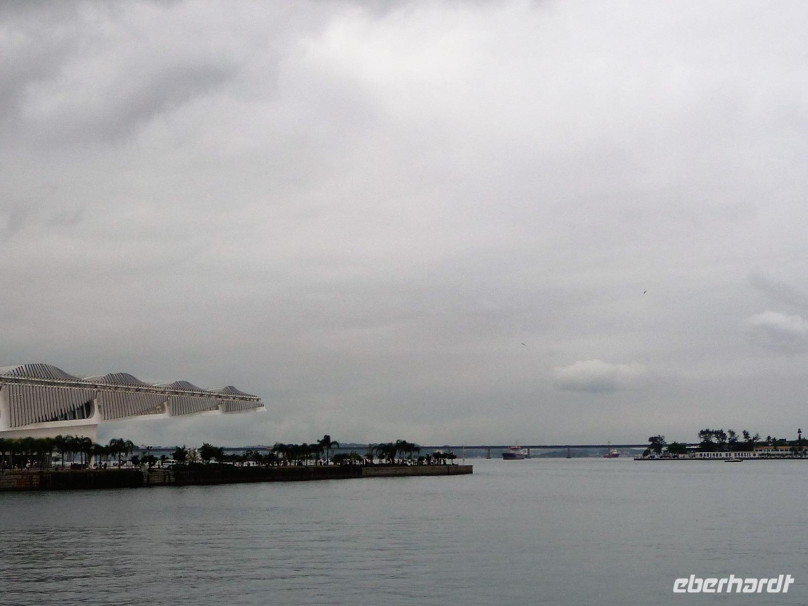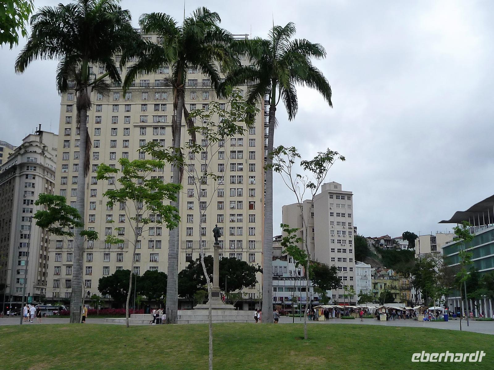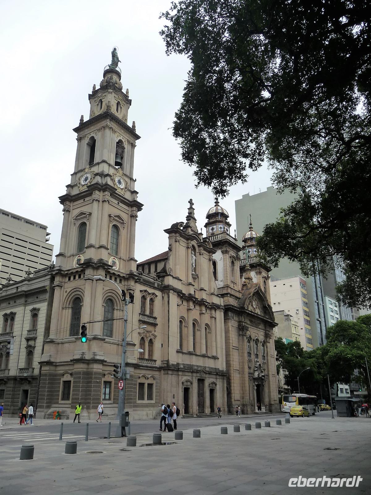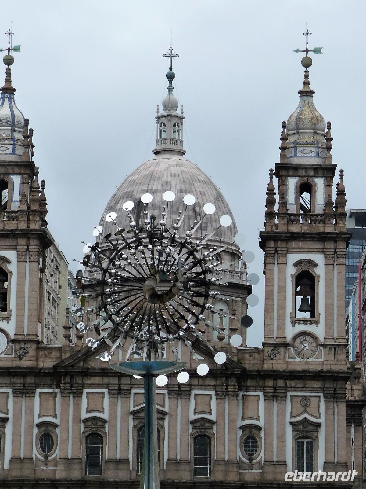 Der heutige Tag stand ganz im Zeichen von Rio. Gut gestärkt vom ausgezeichneten Frühstücksbüffet wollten wir heute den Corcovado erkunden. Da es aber wettermäßig nicht so gut aussah, hatte Natalina unsere Auffahrt auf den Nachmittag verschoben und wir fuhren zuerst in die Altstadt. Am Platz des 15. November, der für die Cariocas ein ganz besondere historische Bedeutung hat, stiegen wir aus. Natalina gab uns eine Einführung in die Geschichte der Stadt, dabei standen wir direkt auf den Straßenbahnschienen, die eigentlich zur Olympiade fertig sein sollten. Bisher ist nur ein Teil der Strecke in Betrieb, mal sehen, ob bei unserem nächsten Besuch in Rio alle Strecken befahren werden. Ein kurzer Abstecher führte uns zu einem Kanonenkugelbaum, den einige von uns bereits auf anderen Reisen gesehen hatten, aber noch niemand in voller Blüte. Toll!!! Wunderschön und völlig überrascht waren wir vom Inneren der alten Kathedrale. Wunderbar die komplette Innenausstattung aus Holz mit goldener Bemalung, prunkvoll aber nicht zu überladen. Hier konnten wir uns alle vorstellen, dass so mancher seine Hochzeit gern hier feiert. Unser Spaziergang führte uns weiter durch die Altstadt von Rio, wo doch noch so manches alte Gebäude zwischen den meist nicht so ansehnlichen Hochhäusern zu finden war. Leider sind die meisten der kleinen Häuser nicht restauriert, schön, dass sie aber wenigstens von vielen Restaurants entdeckt wurden. Entlang der zur Olympiade angelegten Promenade am Meer spazierten wir vorbei am alten Hafen bis zum modernen Gebäude des Museums der Zukunft. Futuristisch ragt das Schiff auf einer Länge von bis über die Bucht. Da es nach Regen aussah, entschied sich Natalina noch vor dem Mittagessen mit uns zum Maracana-Stadion zu fahren. Leider durften wir nur von außen ein Foto machen, da das Stadion erst am nächsten Tag mit einem Fußballspiel nach der Olympiade wiedereröffnet wurde. So blieb nur für ein kurzes Foto und den Kauf einiger Neymar-Shirts für die Enkel. Unser Mittagessen war heute im Programm enthalten. In einer der ältesten Kaffeehäuser Rios fuhren wir mit einer Art Paternoster in die erste Etage, natürlich von einem Liftboy begleitet. Die historischen Räume begeisterten uns alle und dazu hatten wir das Glück, dass am Samstag Fejada-Tag ist und wir uns nach Herzenslust am Büffet bedienen durften. Die Schweineohren und -schwänze fanden aber den Weg auf unsere Teller nicht. Dafür genossen wir die anderen Leckereien.