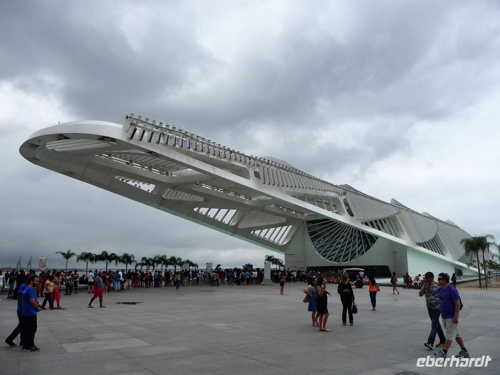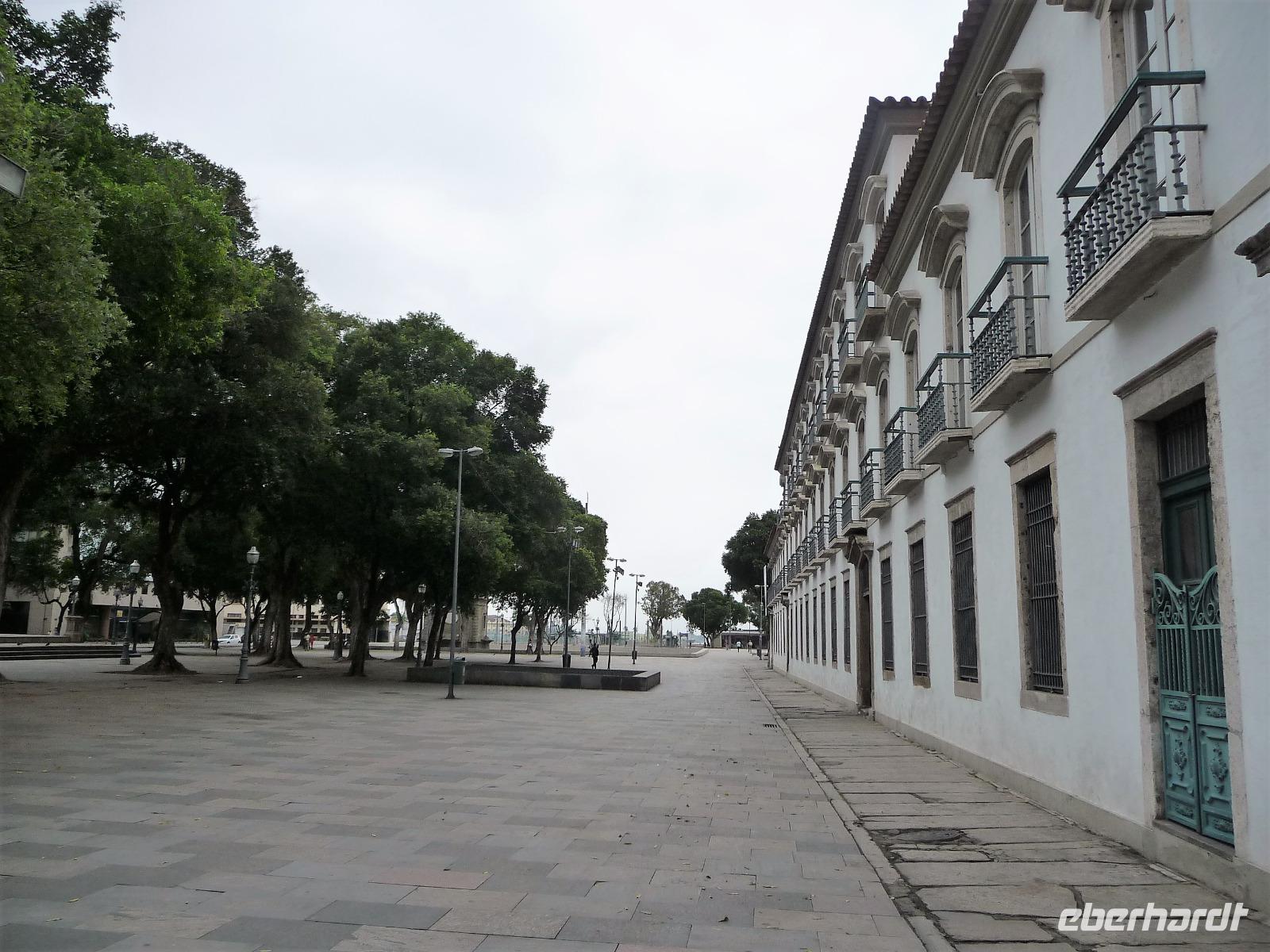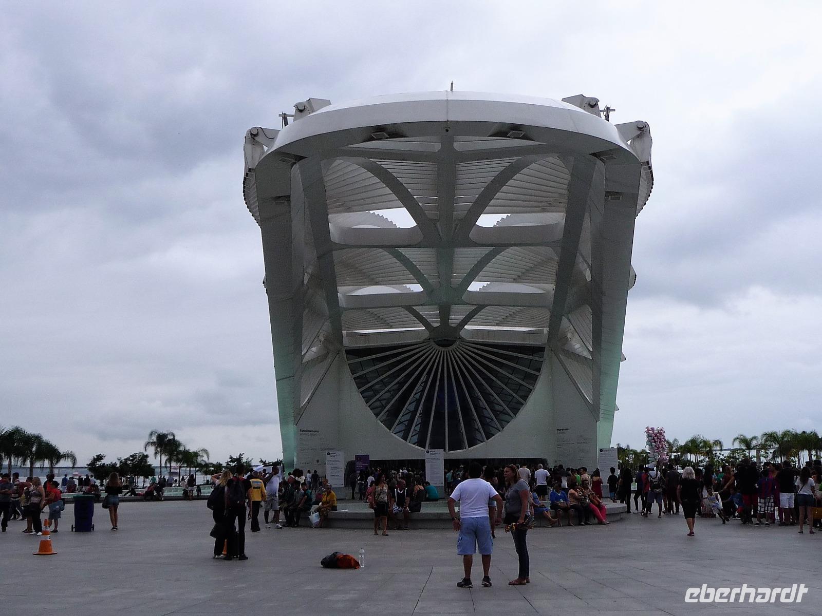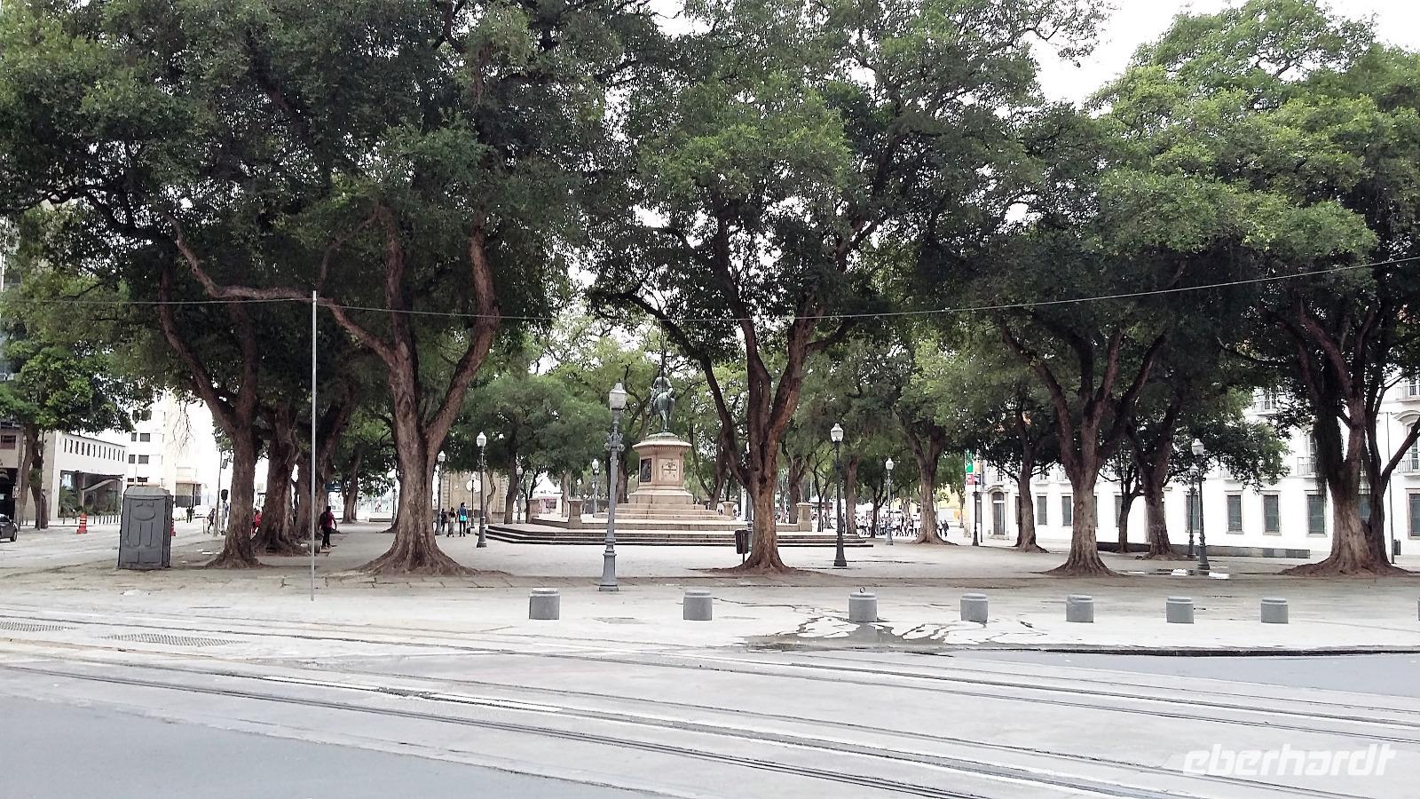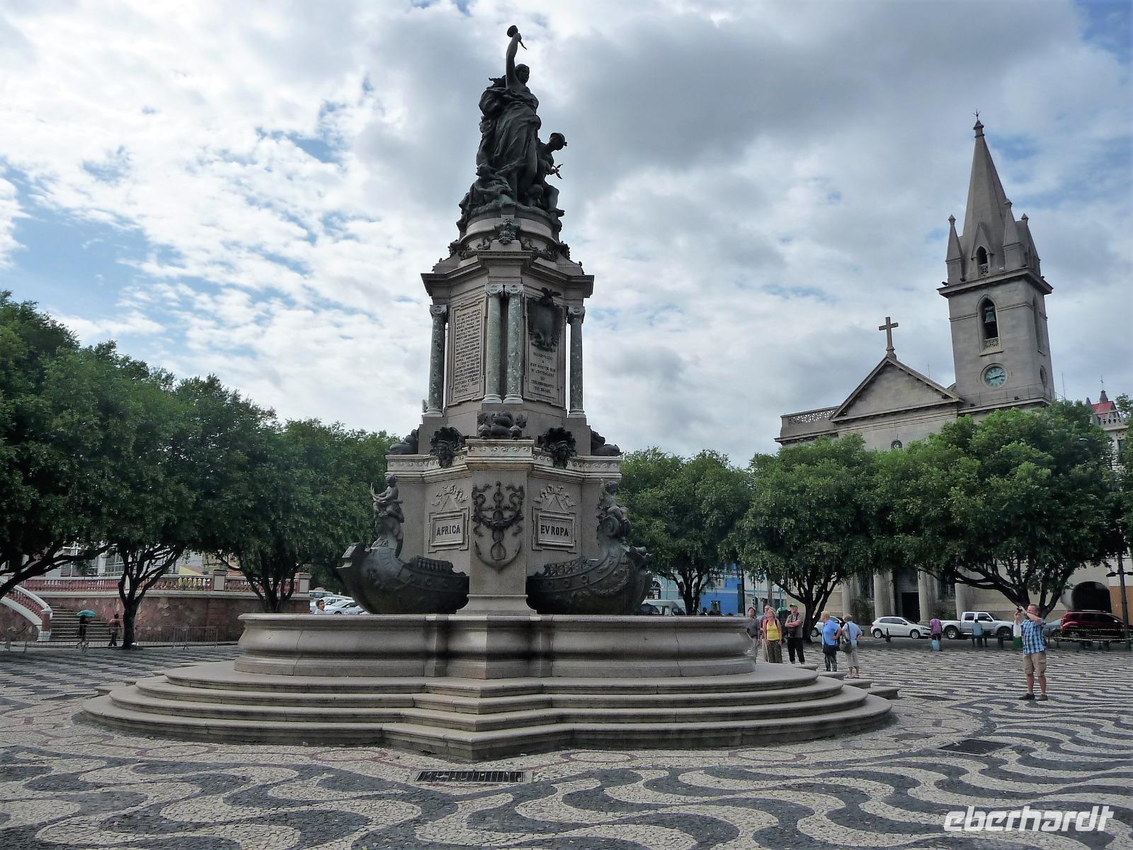 Der heutige Tag stand ganz im Zeichen von Rio. Gut gestärkt vom ausgezeichneten Frühstücksbüffet wollten wir heute den Corcovado erkunden. Da es aber wettermäßig nicht so gut aussah, hatte Natalina unsere Auffahrt auf den Nachmittag verschoben und wir fuhren zuerst in die Altstadt. Am Platz des 15. November, der für die Cariocas ein ganz besondere historische Bedeutung hat, stiegen wir aus. Natalina gab uns eine Einführung in die Geschichte der Stadt, dabei standen wir direkt auf den Straßenbahnschienen, die eigentlich zur Olympiade fertig sein sollten. Bisher ist nur ein Teil der Strecke in Betrieb, mal sehen, ob bei unserem nächsten Besuch in Rio alle Strecken befahren werden. Ein kurzer Abstecher führte uns zu einem Kanonenkugelbaum, den einige von uns bereits auf anderen Reisen gesehen hatten, aber noch niemand in voller Blüte. Toll!!! Wunderschön und völlig überrascht waren wir vom Inneren der alten Kathedrale. Wunderbar die komplette Innenausstattung aus Holz mit goldener Bemalung, prunkvoll aber nicht zu überladen. Hier konnten wir uns alle vorstellen, dass so mancher seine Hochzeit gern hier feiert. Unser Spaziergang führte uns weiter durch die Altstadt von Rio, wo doch noch so manches alte Gebäude zwischen den meist nicht so ansehnlichen Hochhäusern zu finden war. Leider sind die meisten der kleinen Häuser nicht restauriert, schön, dass sie aber wenigstens von vielen Restaurants entdeckt wurden. Entlang der zur Olympiade angelegten Promenade am Meer spazierten wir vorbei am alten Hafen bis zum modernen Gebäude des Museums der Zukunft. Futuristisch ragt das Schiff auf einer Länge von bis über die Bucht. Da es nach Regen aussah, entschied sich Natalina noch vor dem Mittagessen mit uns zum Maracana-Stadion zu fahren. Leider durften wir nur von außen ein Foto machen, da das Stadion erst am nächsten Tag mit einem Fußballspiel nach der Olympiade wiedereröffnet wurde. So blieb nur für ein kurzes Foto und den Kauf einiger Neymar-Shirts für die Enkel. Unser Mittagessen war heute im Programm enthalten. In einer der ältesten Kaffeehäuser Rios fuhren wir mit einer Art Paternoster in die erste Etage, natürlich von einem Liftboy begleitet. Die historischen Räume begeisterten uns alle und dazu hatten wir das Glück, dass am Samstag Fejada-Tag ist und wir uns nach Herzenslust am Büffet bedienen durften. Die Schweineohren und -schwänze fanden aber den Weg auf unsere Teller nicht. Dafür genossen wir die anderen Leckereien.