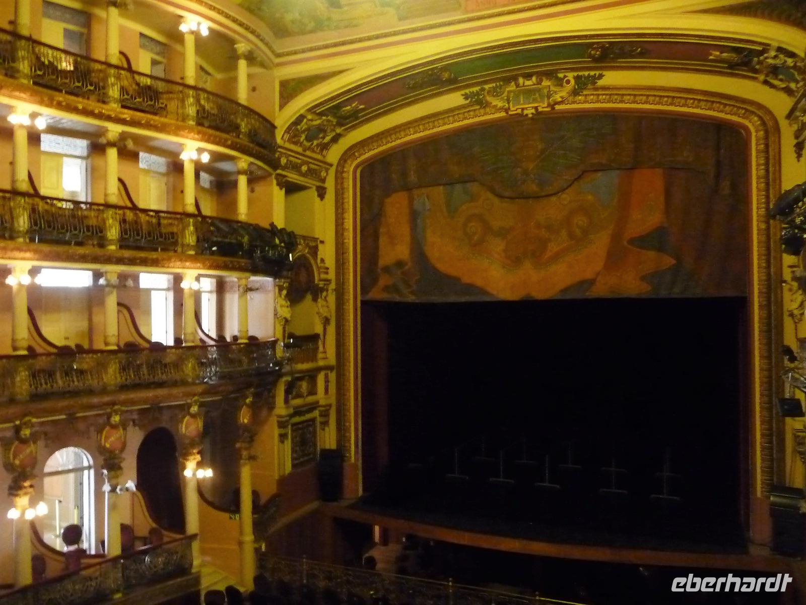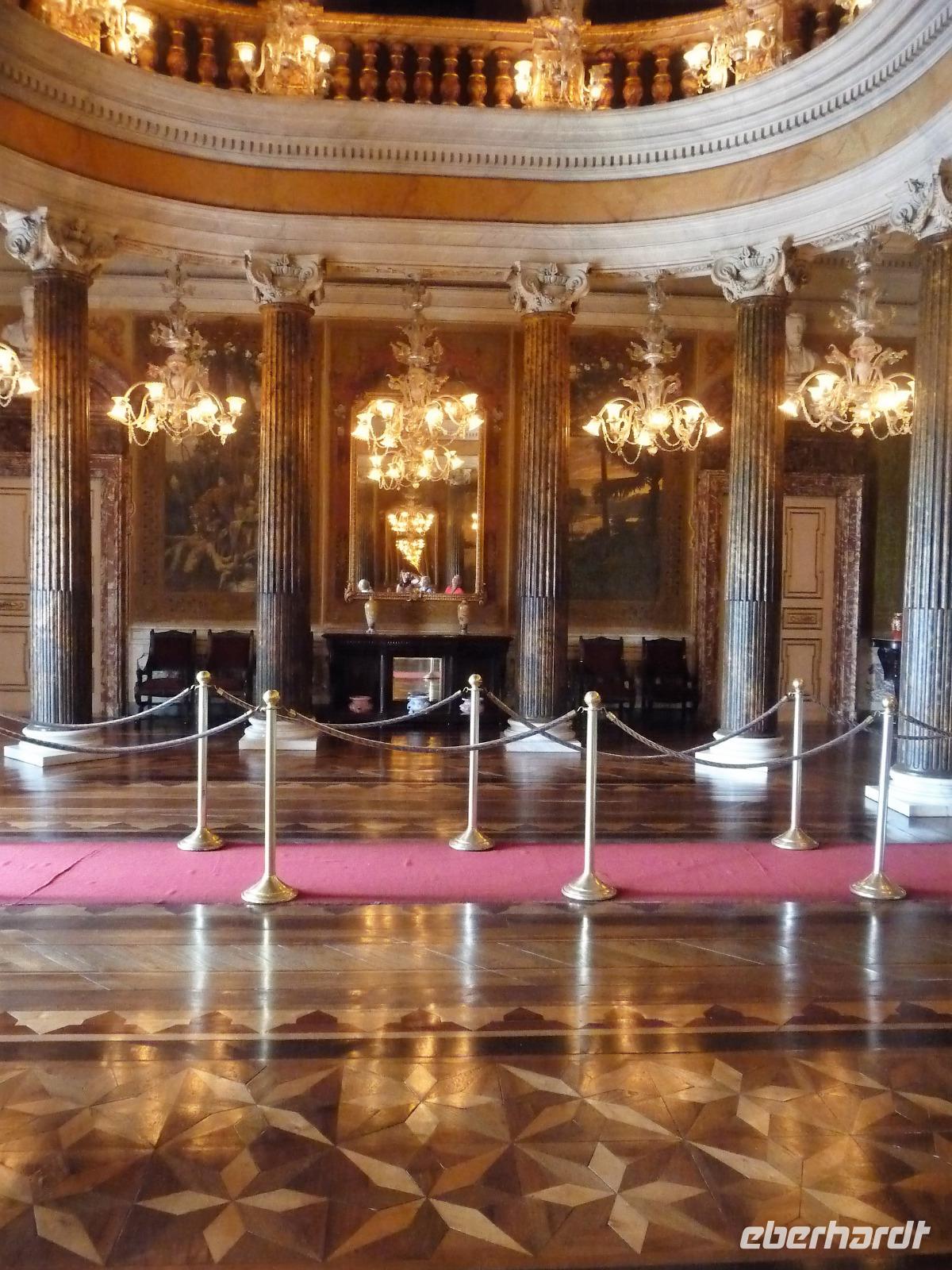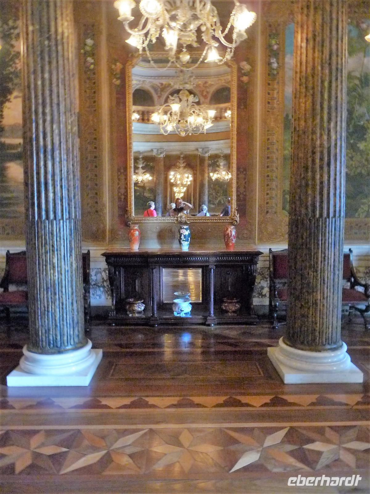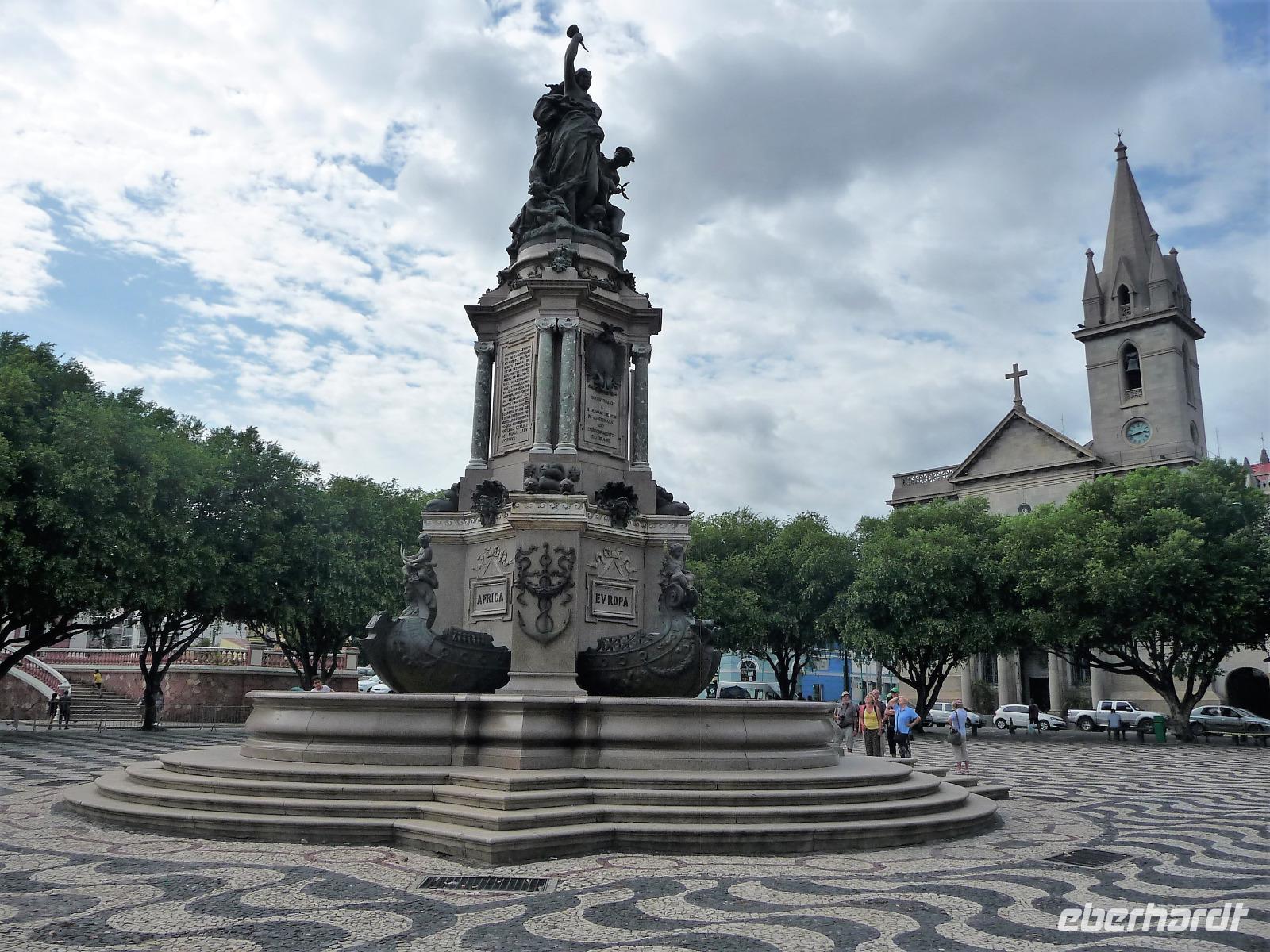 Der heutige Tag stand ganz im Zeichen von Rio. Gut gestärkt vom ausgezeichneten Frühstücksbüffet wollten wir heute den Corcovado erkunden. Da es aber wettermäßig nicht so gut aussah, hatte Natalina unsere Auffahrt auf den Nachmittag verschoben und wir fuhren zuerst in die Altstadt. Am Platz des 15. November, der für die Cariocas ein ganz besondere historische Bedeutung hat, stiegen wir aus. Natalina gab uns eine Einführung in die Geschichte der Stadt, dabei standen wir direkt auf den Straßenbahnschienen, die eigentlich zur Olympiade fertig sein sollten. Bisher ist nur ein Teil der Strecke in Betrieb, mal sehen, ob bei unserem nächsten Besuch in Rio alle Strecken befahren werden. Ein kurzer Abstecher führte uns zu einem Kanonenkugelbaum, den einige von uns bereits auf anderen Reisen gesehen hatten, aber noch niemand in voller Blüte. Toll!!! Wunderschön und völlig überrascht waren wir vom Inneren der alten Kathedrale. Wunderbar die komplette Innenausstattung aus Holz mit goldener Bemalung, prunkvoll aber nicht zu überladen. Hier konnten wir uns alle vorstellen, dass so mancher seine Hochzeit gern hier feiert. Unser Spaziergang führte uns weiter durch die Altstadt von Rio, wo doch noch so manches alte Gebäude zwischen den meist nicht so ansehnlichen Hochhäusern zu finden war. Leider sind die meisten der kleinen Häuser nicht restauriert, schön, dass sie aber wenigstens von vielen Restaurants entdeckt wurden. Entlang der zur Olympiade angelegten Promenade am Meer spazierten wir vorbei am alten Hafen bis zum modernen Gebäude des Museums der Zukunft. Futuristisch ragt das Schiff auf einer Länge von bis über die Bucht. Da es nach Regen aussah, entschied sich Natalina noch vor dem Mittagessen mit uns zum Maracana-Stadion zu fahren. Leider durften wir nur von außen ein Foto machen, da das Stadion erst am nächsten Tag mit einem Fußballspiel nach der Olympiade wiedereröffnet wurde. So blieb nur für ein kurzes Foto und den Kauf einiger Neymar-Shirts für die Enkel. Unser Mittagessen war heute im Programm enthalten. In einer der ältesten Kaffeehäuser Rios fuhren wir mit einer Art Paternoster in die erste Etage, natürlich von einem Liftboy begleitet. Die historischen Räume begeisterten uns alle und dazu hatten wir das Glück, dass am Samstag Fejada-Tag ist und wir uns nach Herzenslust am Büffet bedienen durften. Die Schweineohren und -schwänze fanden aber den Weg auf unsere Teller nicht. Dafür genossen wir die anderen Leckereien.