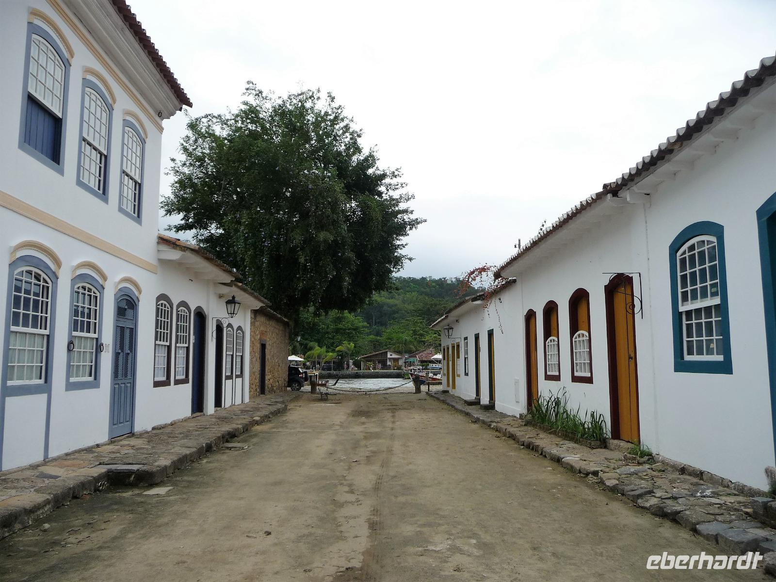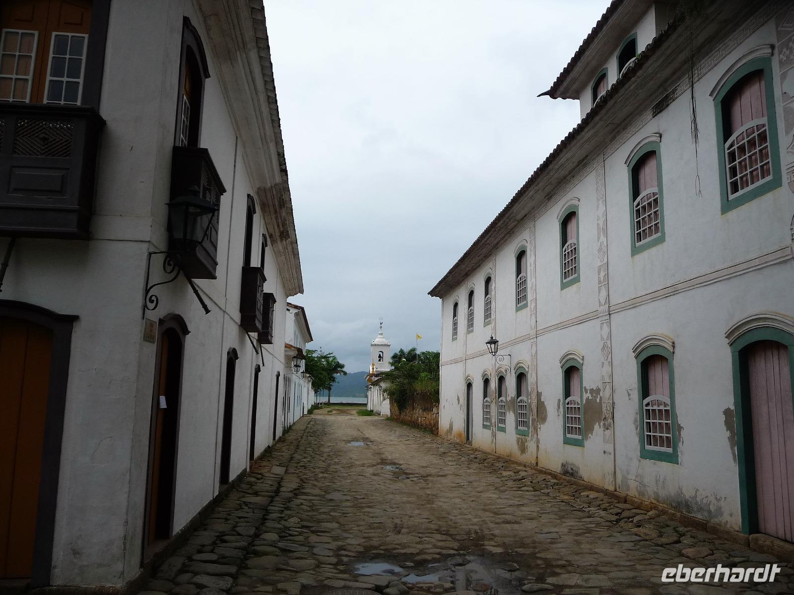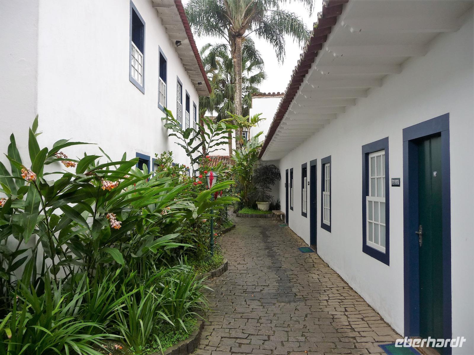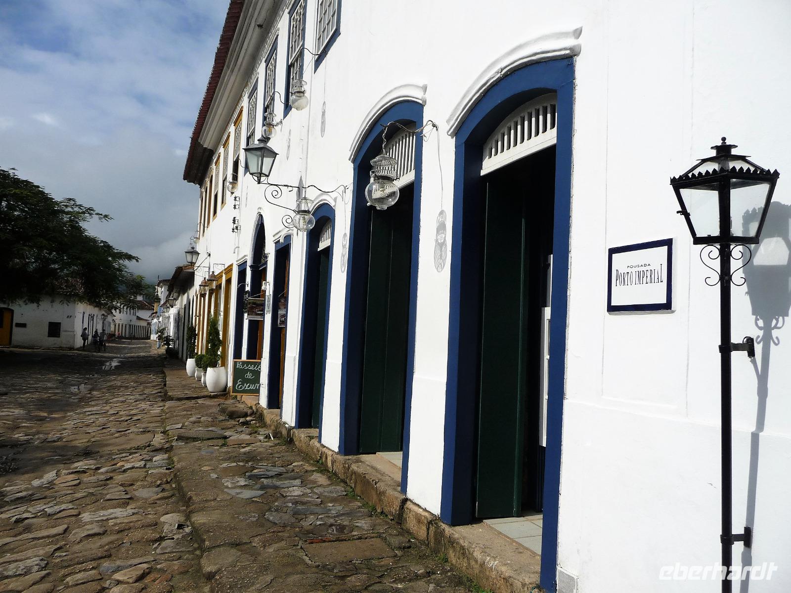 Mit Sack und Pack trafen wir uns in der Lobby des Hotels, denn wir wollten noch ins 4 Fahrstunden entfernte Paraty. Auch Natalina bestätigte uns, dass sie am Morgen die Christusstatue von ihrer Wohnung aus sehen konnte. Voller Vorfreude machten wir uns auf den Weg und waren die ersten, noch vor der Öffnung um 8.00 Uhr, die am Bahnhof der Zahnradbahn eintrafen. Wir hatten ja unsere vorreservierten Karten vom Vortag zurückgegeben und mussten uns heute an der allgemeinen Kasse anstellen. Schon die Fahrt mit der Bahn hinauf war ein Erlebnis. Mittlerweile hatte sich der Himmel aber zugezogen und es fing sogar an zu regnen. Wir waren schon etwas traurig, aber was soll's, wir hatten alles versucht und mussten nun das Wetter so nehmen, wie es war. Wir befanden uns nun mal im wahrsten Sinne des Wortes im Regenwald. In unsere Regensachen gehüllt stiegen wir in den Fahrstuhl, der uns zum Gipfel brachte. Immerhin war die Statue von Nahem zu sehen, s o dass wir das eine oder andere Foto machen konnten. Beim Hinuntergehen zum Fahrstuhl über die Treppe stellte Natalina fest, dass es auf einmal besser wird und wir vielleicht doch nochmal hinauf fahren sollten. Und es hat sich gelohnt, wir bekamen unser Foto vom Christus, bevor wir nach Paraty aufbrachen. Eine ca. 4-stündige Fahrt lag vor uns. Entlang der Costa Verde kamen wir am Nachmittag in unserer Pousada an. Bereits auf der Fahrt hatte Natalina von Paraty geschwärmt und natürlich waren wir dementsprechend auf den so besonderen Ort gespannt. Bereits bei der Ankunft wurden wir in unserem kleinen Bus kräftig durchgeschuckelt und konnten erahnen, was das alte Pflaster für uns die nächsten Tage bereithielt. Wunderschön und gemütlich war unsere Pousada und alle Zimmer ganz unterschiedlich. Der hübsche Garten mit einem kleinen Pool und einer Bar für den Abend wurde bereits kurz erkundet, bevor wir uns mit unserer örtlichen Reiseleiterin Daniela für den Rundgang durch Paraty trafen. Es war gar nicht so einfach und ganz schön anstrengend über das Pflaster zu laufen und immer daran zu denken, stehenzubleiben, wenn man ein Foto machen wollte. Wir staunten, welche Summen aktuell für die Häuser auf dem brasilianischen Immobilienmarkt gefordert werden. Es waren aber auch Schmuckstück dabei! Vor allem die Geschichte des Ortes, der viele Jahre in einer Art Dornröschenschlaf verfallen war, faszinierte uns. Kaum zu glauben, dass hier früher riesige Mengen an Gold auf die Schiffe Richtung Rio geladen worden. Bereits auf dem Spaziergang durch die Gassen, fiel so mancher Blick in die kleinen Kneipen und netten Kunsthandwerksgeschäfte. Auch am Hafen, von dem wir am nächsten Tag einen Ausflug unternehmen wollten, schauten wir kurz vorbei. Zum Schluß des Rundgangs probierten wir den bekannten Zuckerrohrschnaps von Paraty in verschiedensten Sorten. So manches kleine Fläschchen fand auch den Weg in unser Reisegepäck.