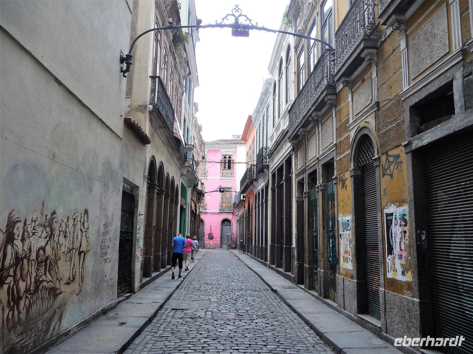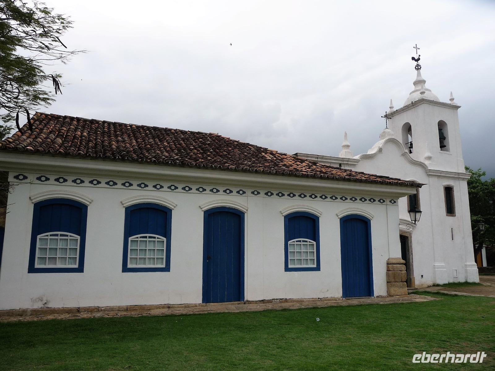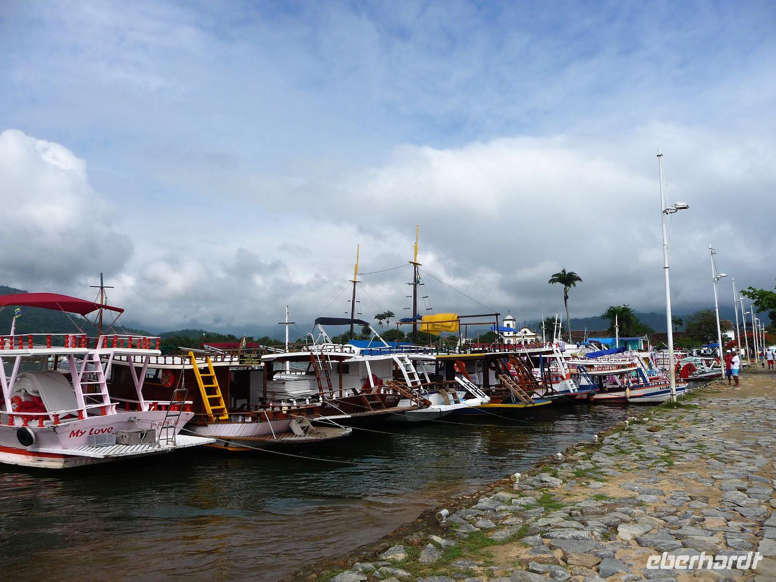 Mit Sack und Pack trafen wir uns in der Lobby des Hotels, denn wir wollten noch ins 4 Fahrstunden entfernte Paraty. Auch Natalina bestätigte uns, dass sie am Morgen die Christusstatue von ihrer Wohnung aus sehen konnte. Voller Vorfreude machten wir uns auf den Weg und waren die ersten, noch vor der Öffnung um 8.00 Uhr, die am Bahnhof der Zahnradbahn eintrafen. Wir hatten ja unsere vorreservierten Karten vom Vortag zurückgegeben und mussten uns heute an der allgemeinen Kasse anstellen. Schon die Fahrt mit der Bahn hinauf war ein Erlebnis. Mittlerweile hatte sich der Himmel aber zugezogen und es fing sogar an zu regnen. Wir waren schon etwas traurig, aber was soll's, wir hatten alles versucht und mussten nun das Wetter so nehmen, wie es war. Wir befanden uns nun mal im wahrsten Sinne des Wortes im Regenwald. In unsere Regensachen gehüllt stiegen wir in den Fahrstuhl, der uns zum Gipfel brachte. Immerhin war die Statue von Nahem zu sehen, s o dass wir das eine oder andere Foto machen konnten. Beim Hinuntergehen zum Fahrstuhl über die Treppe stellte Natalina fest, dass es auf einmal besser wird und wir vielleicht doch nochmal hinauf fahren sollten. Und es hat sich gelohnt, wir bekamen unser Foto vom Christus, bevor wir nach Paraty aufbrachen. Eine ca. 4-stündige Fahrt lag vor uns. Entlang der Costa Verde kamen wir am Nachmittag in unserer Pousada an. Bereits auf der Fahrt hatte Natalina von Paraty geschwärmt und natürlich waren wir dementsprechend auf den so besonderen Ort gespannt. Bereits bei der Ankunft wurden wir in unserem kleinen Bus kräftig durchgeschuckelt und konnten erahnen, was das alte Pflaster für uns die nächsten Tage bereithielt. Wunderschön und gemütlich war unsere Pousada und alle Zimmer ganz unterschiedlich. Der hübsche Garten mit einem kleinen Pool und einer Bar für den Abend wurde bereits kurz erkundet, bevor wir uns mit unserer örtlichen Reiseleiterin Daniela für den Rundgang durch Paraty trafen. Es war gar nicht so einfach und ganz schön anstrengend über das Pflaster zu laufen und immer daran zu denken, stehenzubleiben, wenn man ein Foto machen wollte. Wir staunten, welche Summen aktuell für die Häuser auf dem brasilianischen Immobilienmarkt gefordert werden. Es waren aber auch Schmuckstück dabei! Vor allem die Geschichte des Ortes, der viele Jahre in einer Art Dornröschenschlaf verfallen war, faszinierte uns. Kaum zu glauben, dass hier früher riesige Mengen an Gold auf die Schiffe Richtung Rio geladen worden. Bereits auf dem Spaziergang durch die Gassen, fiel so mancher Blick in die kleinen Kneipen und netten Kunsthandwerksgeschäfte. Auch am Hafen, von dem wir am nächsten Tag einen Ausflug unternehmen wollten, schauten wir kurz vorbei. Zum Schluß des Rundgangs probierten wir den bekannten Zuckerrohrschnaps von Paraty in verschiedensten Sorten. So manches kleine Fläschchen fand auch den Weg in unser Reisegepäck.