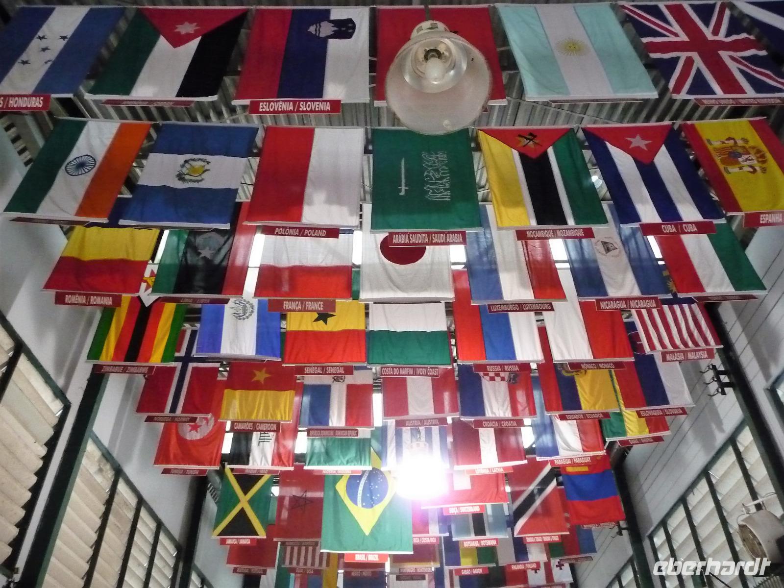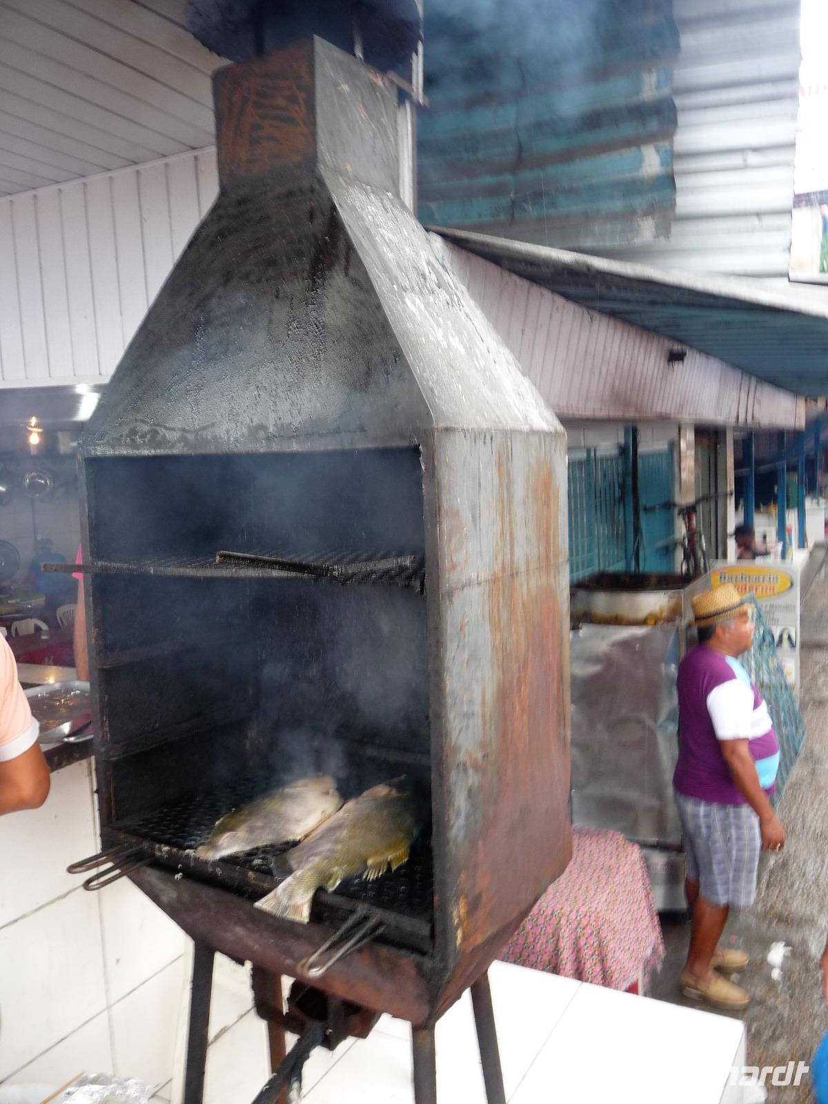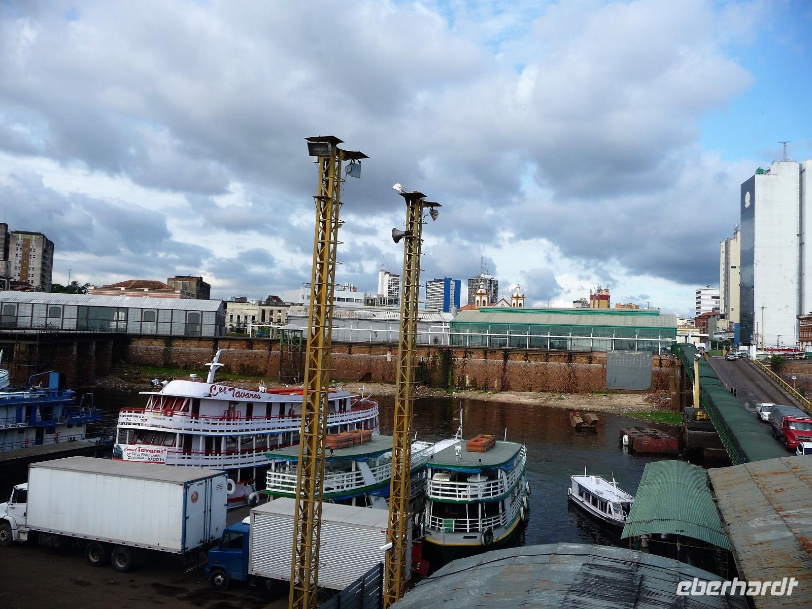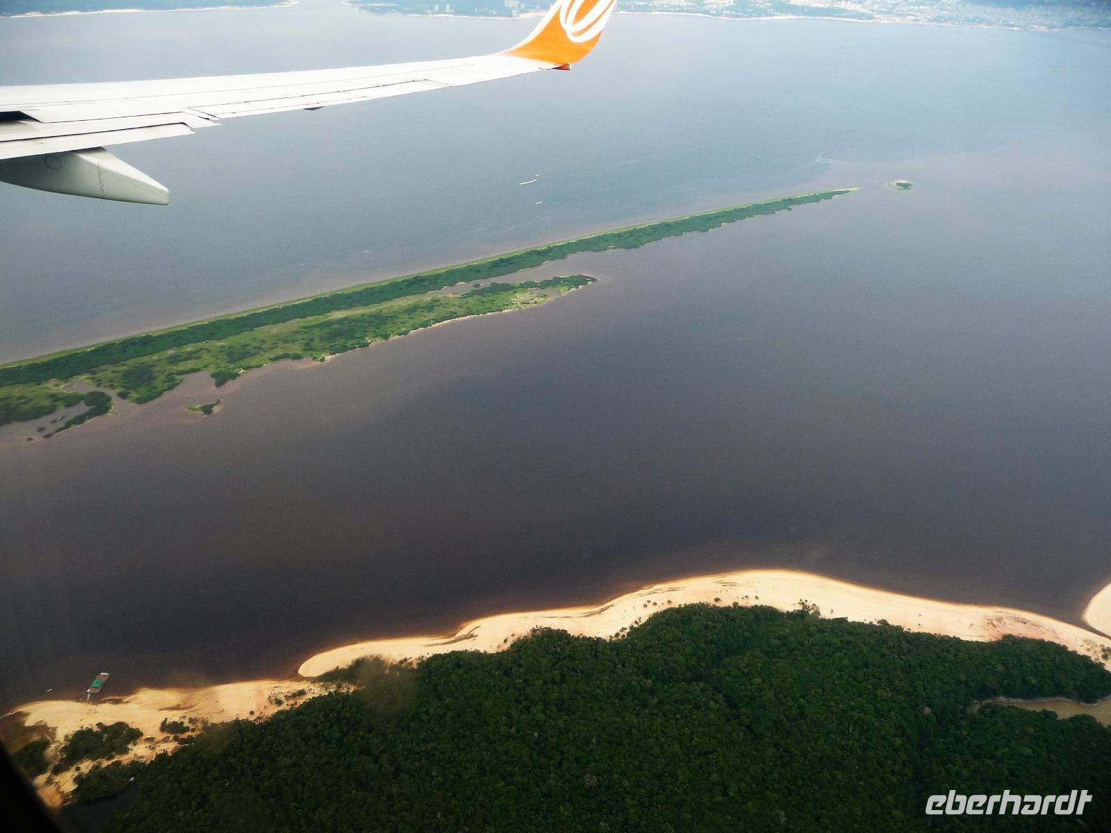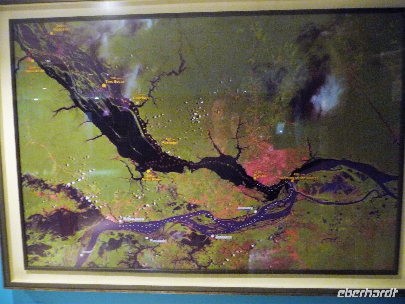 Ein ganz besonderes Ereignis erwartete uns am frühen Morgen, denn wir konnten den Zusammenfluss von Rio Negro und Rio Solimoes, den sogenannten Encontro das Aguas, ganz von Nahem erleben. Erst von hier ab, ist der Amazonas tatsächlich der Amazonas. Mehrere Kilometer lang dauert aufgrund der unterschiedlichen Fließgeschwindigkeit und des unterschiedlichen Wärmegrades das Vermischen des „schwarzen" Rio Negro und des schlammig-braun wirkenden Solimoes, wirklich ein Naturwunder an dem man sich nicht sattsehen kann, denn immer wieder zeigen sich neue Bilder - fast wie Kunstwerke aussehend - auf der Wasseroberfläche. Nach dem Frühstück hieß es dann „alle Mann von Bord" und unsere Reiseleiterin Maria erwartete uns bereits, um uns den zweiten Teil der Stadtrundfahrt von Manaus zu zeigen. Zuerst fuhren wir zum sogenannten Bananenmarkt. Riesige Bananenstauden, aber auch herrliche andere tropische Früchte ließen uns immer wieder staunen. Maria erzählte uns nebenbei so manche kleine Geschichte und der Rundgang über den Markt verging wie im Flug. Ein ungewöhnliches Andenken für 1 Real kauften wir uns bei einem Händler, eine getrocknete Schuppe des größten Amazonasfisches, den die Einheimischen als Nagelfeile verwenden. Besonders interessant war der großte Teil des Fischmarktes, erstaunt stellten wir fest, dass es keinen komischen Fischgeruch gab. Fangfrisch wurde hier der tollste Fisch präsentiert und verkauft. Außerhalb der Markthallen sahen wir die kleinen Räucheröfen, aus denen der Fisch direkt zum Mittagessen angeboten wurde. Wenn etwas mehr Zeit gewesen wäre, hätten wir sicher mal probiert. Interessant erzählte uns Maria an einem Kräuterstand von den natürlichen Heilmitteln, die von vielen Brasilianern der "neuen" Medizin vorgezogen wird. Im Kunsthandwerksmarkt hatte dann jeder etwas Freizeit, um noch das eine oder andere Andenken zu erstehen. Bevor wir es zu unserem nächsten Flug ging, zeigte uns Maria noch die ärmeren Seiten von Manaus und erklärte viel zur sozialen Lage im Land. Überpünktlich kamen wir am Flughafen von Manaus an, wo wir uns zum ersten Mal mit den Automaten der GOL abmühen mussten, denn vorher kam man nicht zur Gepäckabgabe. Mit den vielen Bordkarten für die Gruppe für den Flug von Manaus nach Sao Paulo und weiter nach Iguacu war der Check In Automat überfordert, immer wieder klemmte eine der Bordkarten. Mit viel Geduld schafften wir es aber dennoch. Durch unsere vielen bisherigen Flüge waren wir schon richtige Profis und schafften unsere nächsten 2 Flüge und die 2 Stunden Zeitumstellung wie im Schlaf. Als wir spät abends in Iguazu ankamen, waren wir aber doch froh, als wir ins Bett fallen konnten.