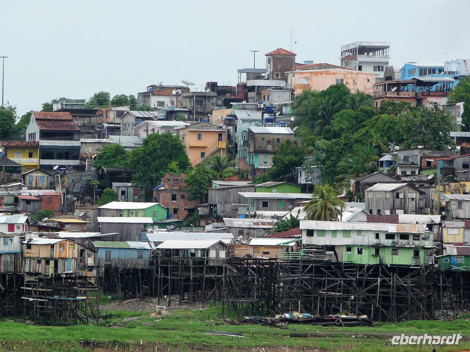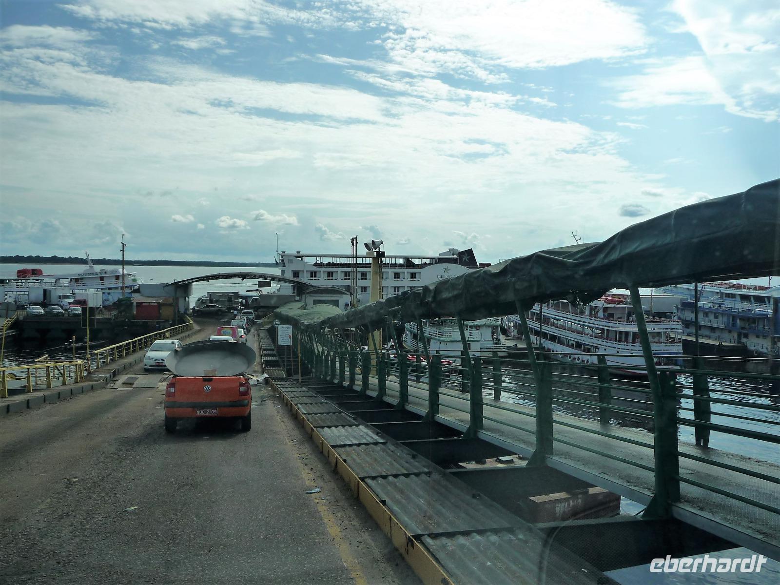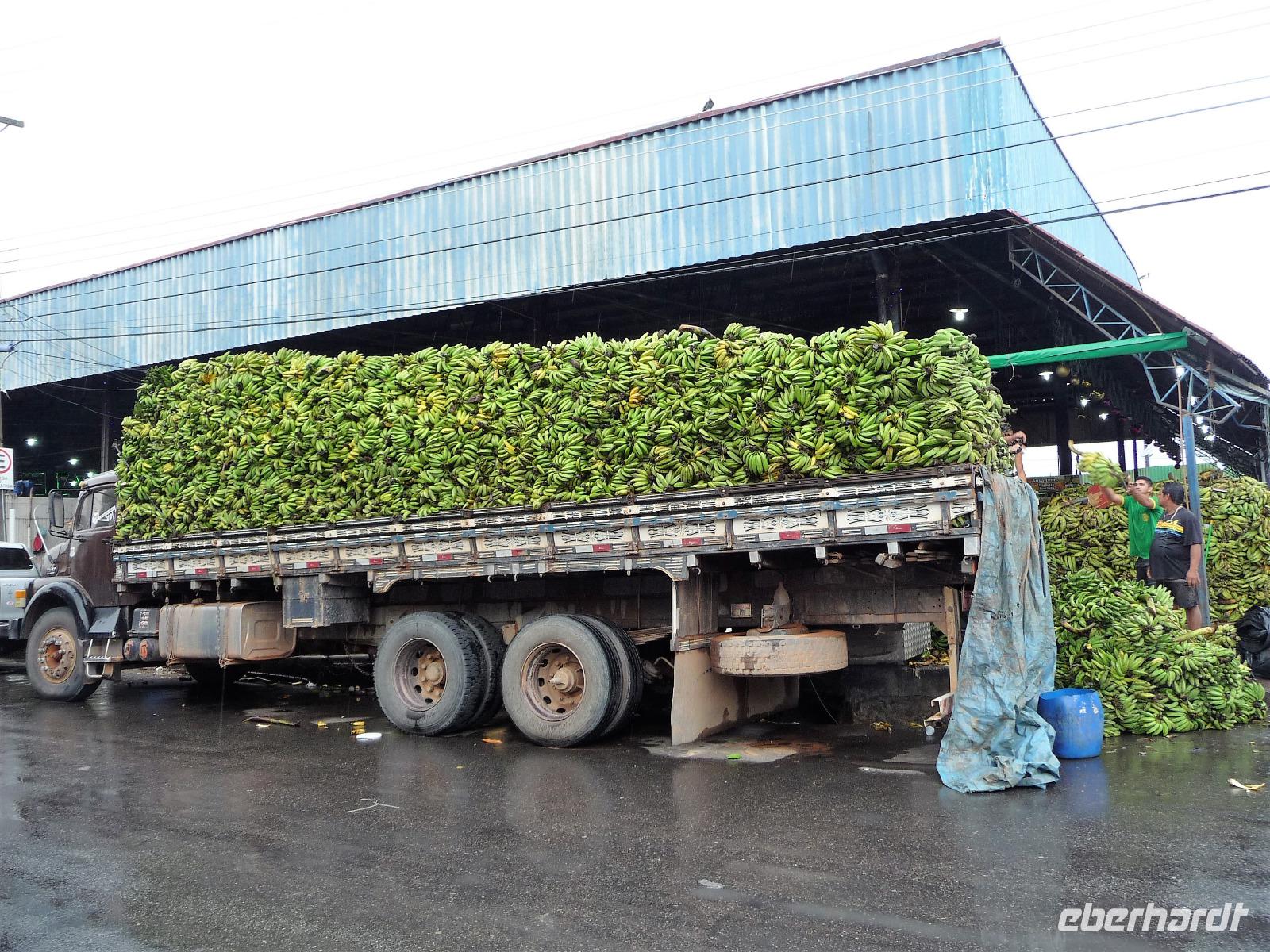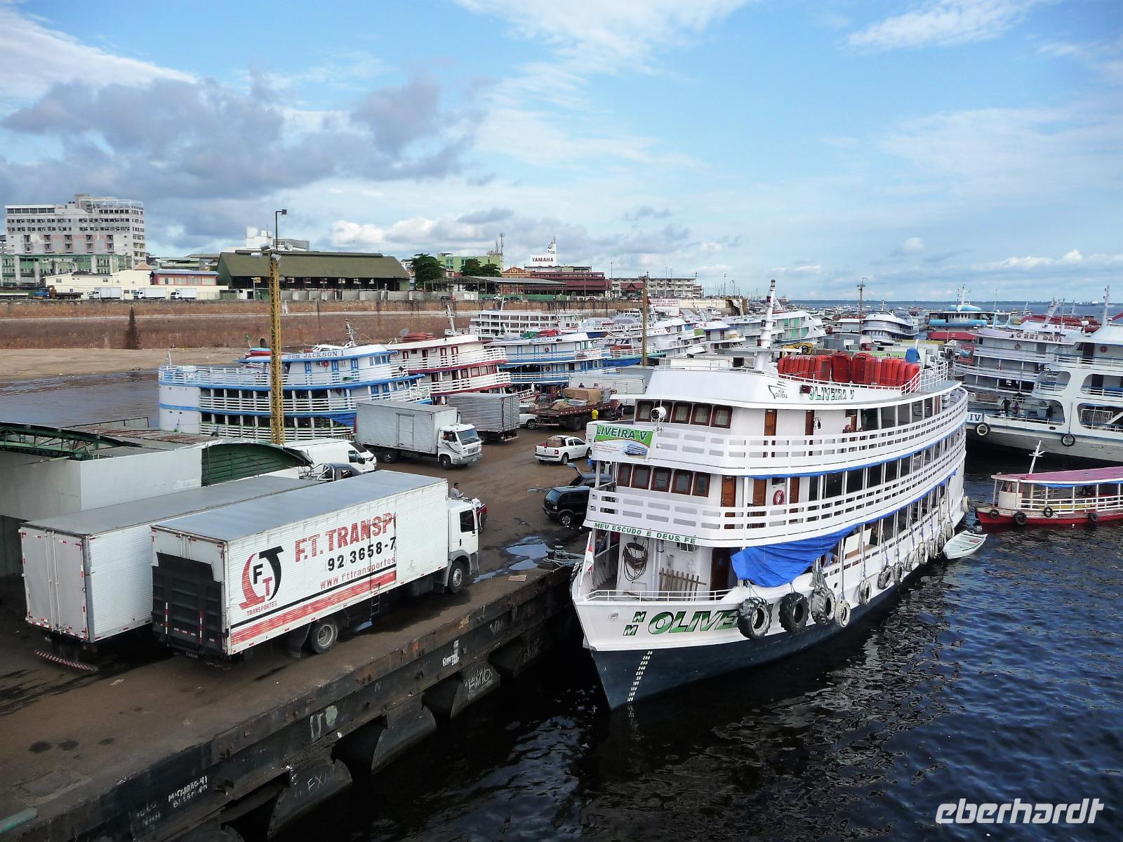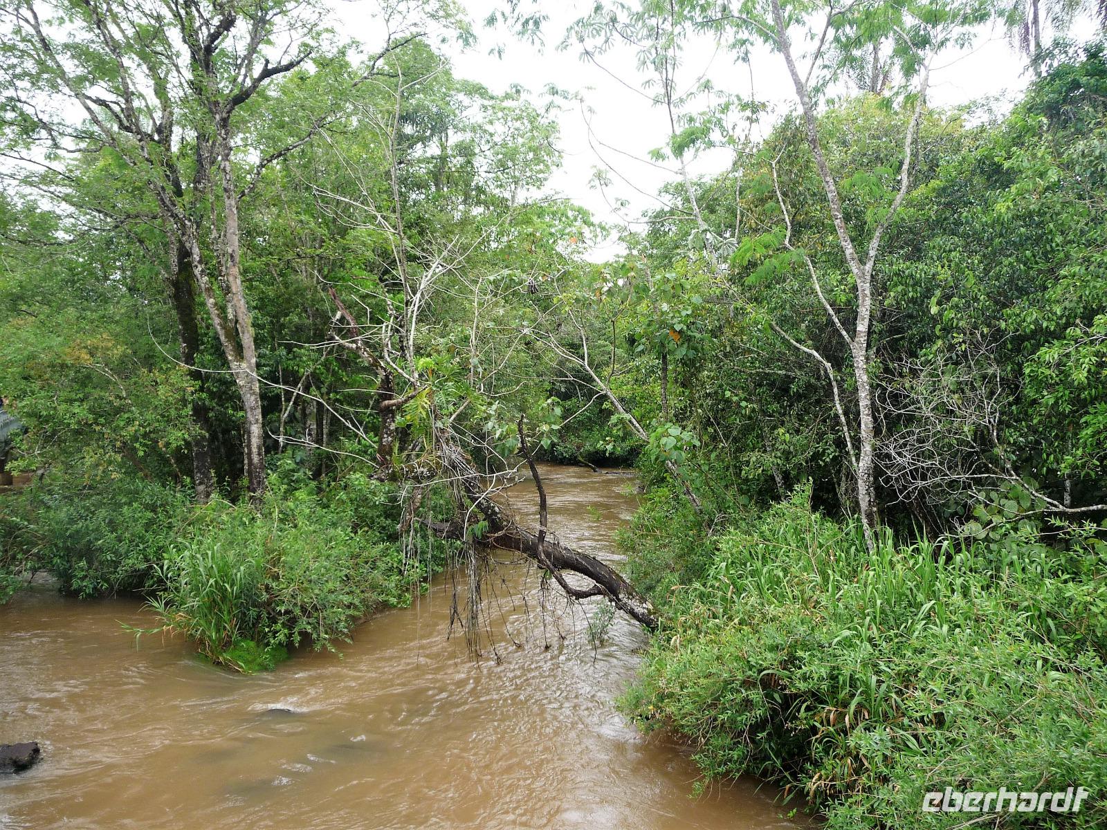 Ein ganz besonderes Ereignis erwartete uns am frühen Morgen, denn wir konnten den Zusammenfluss von Rio Negro und Rio Solimoes, den sogenannten Encontro das Aguas, ganz von Nahem erleben. Erst von hier ab, ist der Amazonas tatsächlich der Amazonas. Mehrere Kilometer lang dauert aufgrund der unterschiedlichen Fließgeschwindigkeit und des unterschiedlichen Wärmegrades das Vermischen des „schwarzen" Rio Negro und des schlammig-braun wirkenden Solimoes, wirklich ein Naturwunder an dem man sich nicht sattsehen kann, denn immer wieder zeigen sich neue Bilder - fast wie Kunstwerke aussehend - auf der Wasseroberfläche. Nach dem Frühstück hieß es dann „alle Mann von Bord" und unsere Reiseleiterin Maria erwartete uns bereits, um uns den zweiten Teil der Stadtrundfahrt von Manaus zu zeigen. Zuerst fuhren wir zum sogenannten Bananenmarkt. Riesige Bananenstauden, aber auch herrliche andere tropische Früchte ließen uns immer wieder staunen. Maria erzählte uns nebenbei so manche kleine Geschichte und der Rundgang über den Markt verging wie im Flug. Ein ungewöhnliches Andenken für 1 Real kauften wir uns bei einem Händler, eine getrocknete Schuppe des größten Amazonasfisches, den die Einheimischen als Nagelfeile verwenden. Besonders interessant war der großte Teil des Fischmarktes, erstaunt stellten wir fest, dass es keinen komischen Fischgeruch gab. Fangfrisch wurde hier der tollste Fisch präsentiert und verkauft. Außerhalb der Markthallen sahen wir die kleinen Räucheröfen, aus denen der Fisch direkt zum Mittagessen angeboten wurde. Wenn etwas mehr Zeit gewesen wäre, hätten wir sicher mal probiert. Interessant erzählte uns Maria an einem Kräuterstand von den natürlichen Heilmitteln, die von vielen Brasilianern der "neuen" Medizin vorgezogen wird. Im Kunsthandwerksmarkt hatte dann jeder etwas Freizeit, um noch das eine oder andere Andenken zu erstehen. Bevor wir es zu unserem nächsten Flug ging, zeigte uns Maria noch die ärmeren Seiten von Manaus und erklärte viel zur sozialen Lage im Land. Überpünktlich kamen wir am Flughafen von Manaus an, wo wir uns zum ersten Mal mit den Automaten der GOL abmühen mussten, denn vorher kam man nicht zur Gepäckabgabe. Mit den vielen Bordkarten für die Gruppe für den Flug von Manaus nach Sao Paulo und weiter nach Iguacu war der Check In Automat überfordert, immer wieder klemmte eine der Bordkarten. Mit viel Geduld schafften wir es aber dennoch. Durch unsere vielen bisherigen Flüge waren wir schon richtige Profis und schafften unsere nächsten 2 Flüge und die 2 Stunden Zeitumstellung wie im Schlaf. Als wir spät abends in Iguazu ankamen, waren wir aber doch froh, als wir ins Bett fallen konnten.