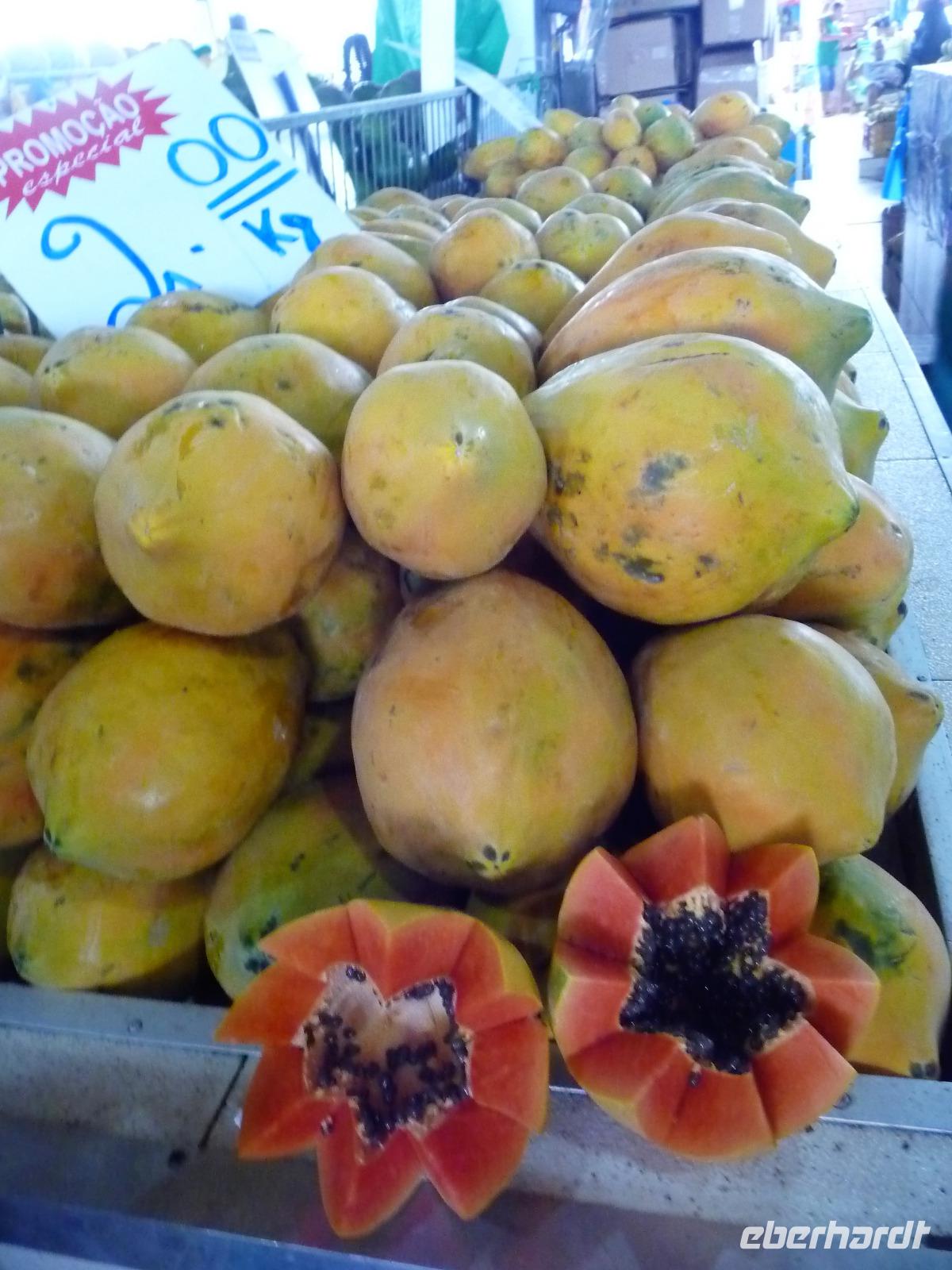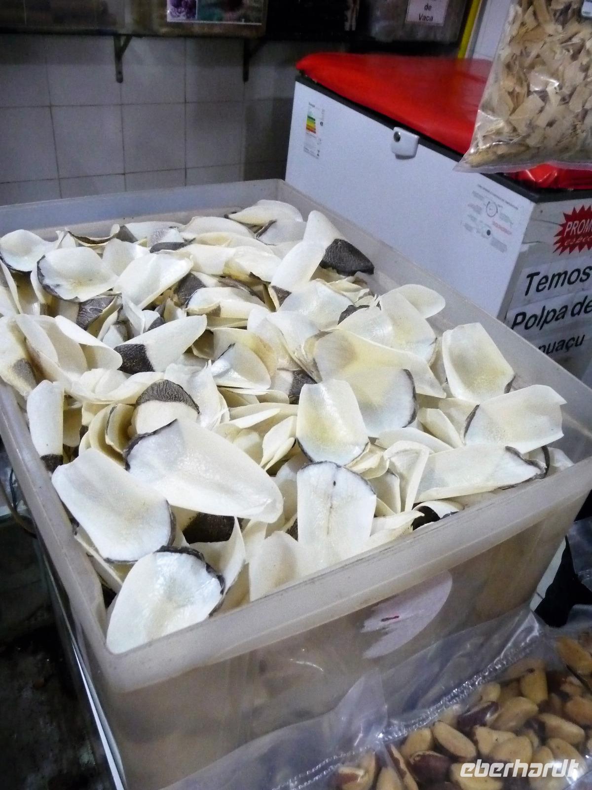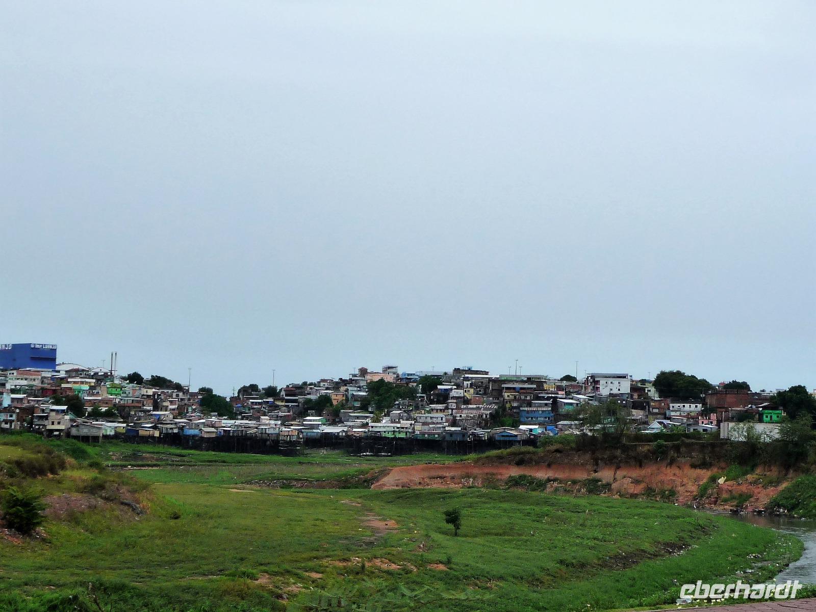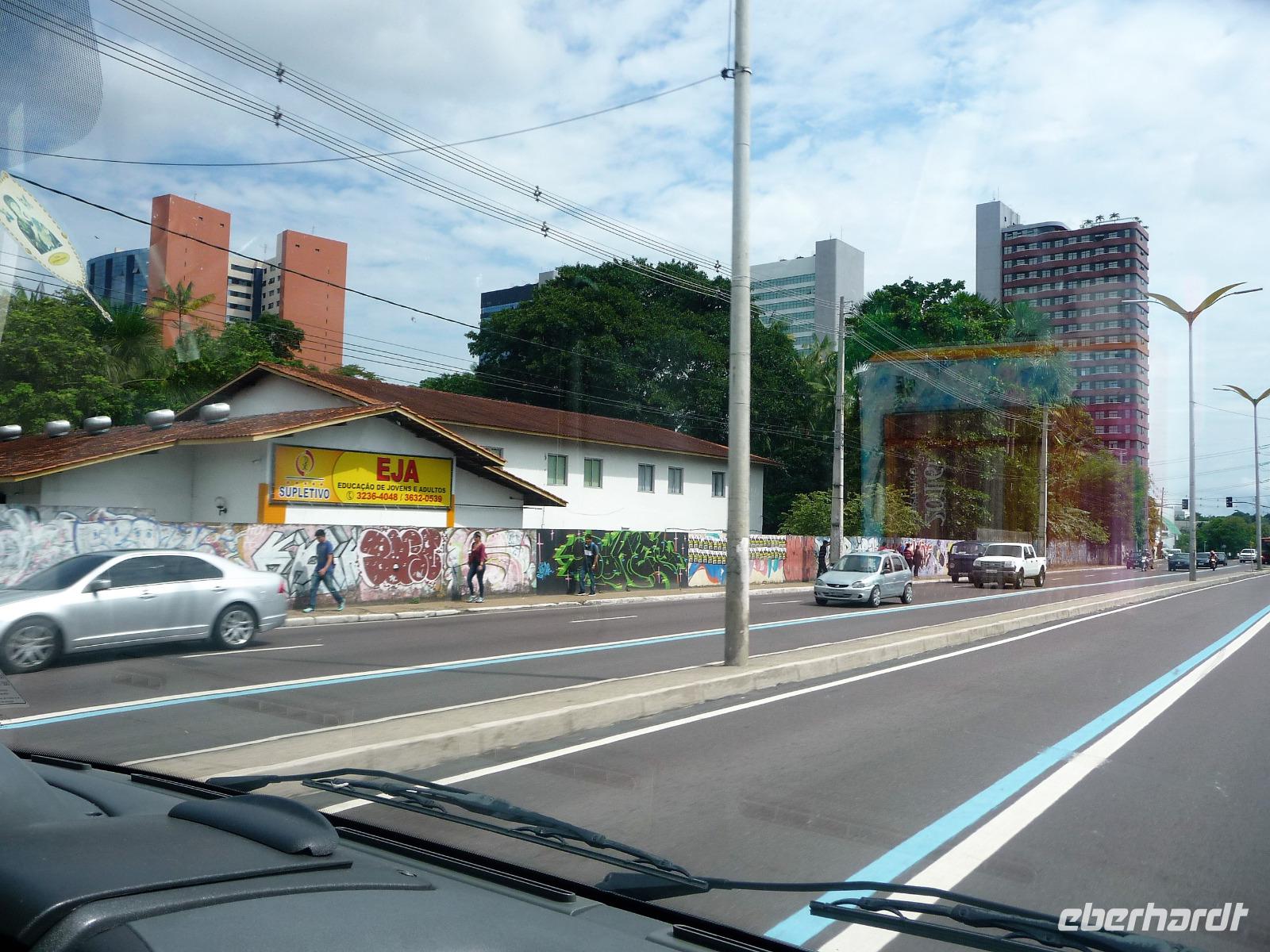 Ein ganz besonderes Ereignis erwartete uns am frühen Morgen, denn wir konnten den Zusammenfluss von Rio Negro und Rio Solimoes, den sogenannten Encontro das Aguas, ganz von Nahem erleben. Erst von hier ab, ist der Amazonas tatsächlich der Amazonas. Mehrere Kilometer lang dauert aufgrund der unterschiedlichen Fließgeschwindigkeit und des unterschiedlichen Wärmegrades das Vermischen des „schwarzen" Rio Negro und des schlammig-braun wirkenden Solimoes, wirklich ein Naturwunder an dem man sich nicht sattsehen kann, denn immer wieder zeigen sich neue Bilder - fast wie Kunstwerke aussehend - auf der Wasseroberfläche. Nach dem Frühstück hieß es dann „alle Mann von Bord" und unsere Reiseleiterin Maria erwartete uns bereits, um uns den zweiten Teil der Stadtrundfahrt von Manaus zu zeigen. Zuerst fuhren wir zum sogenannten Bananenmarkt. Riesige Bananenstauden, aber auch herrliche andere tropische Früchte ließen uns immer wieder staunen. Maria erzählte uns nebenbei so manche kleine Geschichte und der Rundgang über den Markt verging wie im Flug. Ein ungewöhnliches Andenken für 1 Real kauften wir uns bei einem Händler, eine getrocknete Schuppe des größten Amazonasfisches, den die Einheimischen als Nagelfeile verwenden. Besonders interessant war der großte Teil des Fischmarktes, erstaunt stellten wir fest, dass es keinen komischen Fischgeruch gab. Fangfrisch wurde hier der tollste Fisch präsentiert und verkauft. Außerhalb der Markthallen sahen wir die kleinen Räucheröfen, aus denen der Fisch direkt zum Mittagessen angeboten wurde. Wenn etwas mehr Zeit gewesen wäre, hätten wir sicher mal probiert. Interessant erzählte uns Maria an einem Kräuterstand von den natürlichen Heilmitteln, die von vielen Brasilianern der "neuen" Medizin vorgezogen wird. Im Kunsthandwerksmarkt hatte dann jeder etwas Freizeit, um noch das eine oder andere Andenken zu erstehen. Bevor wir es zu unserem nächsten Flug ging, zeigte uns Maria noch die ärmeren Seiten von Manaus und erklärte viel zur sozialen Lage im Land. Überpünktlich kamen wir am Flughafen von Manaus an, wo wir uns zum ersten Mal mit den Automaten der GOL abmühen mussten, denn vorher kam man nicht zur Gepäckabgabe. Mit den vielen Bordkarten für die Gruppe für den Flug von Manaus nach Sao Paulo und weiter nach Iguacu war der Check In Automat überfordert, immer wieder klemmte eine der Bordkarten. Mit viel Geduld schafften wir es aber dennoch. Durch unsere vielen bisherigen Flüge waren wir schon richtige Profis und schafften unsere nächsten 2 Flüge und die 2 Stunden Zeitumstellung wie im Schlaf. Als wir spät abends in Iguazu ankamen, waren wir aber doch froh, als wir ins Bett fallen konnten.