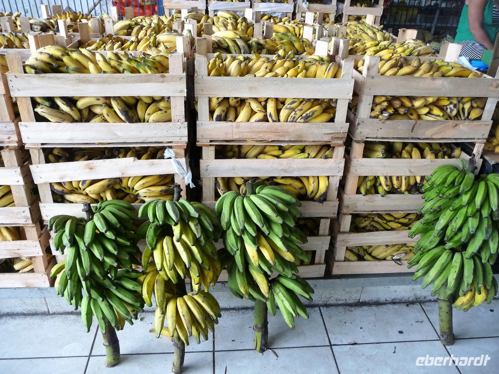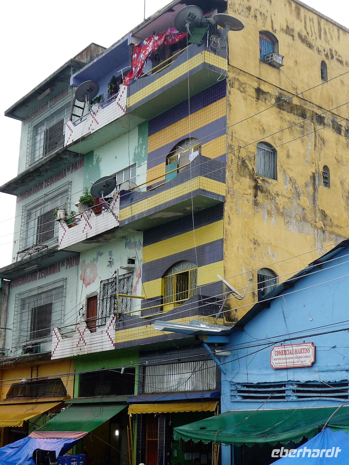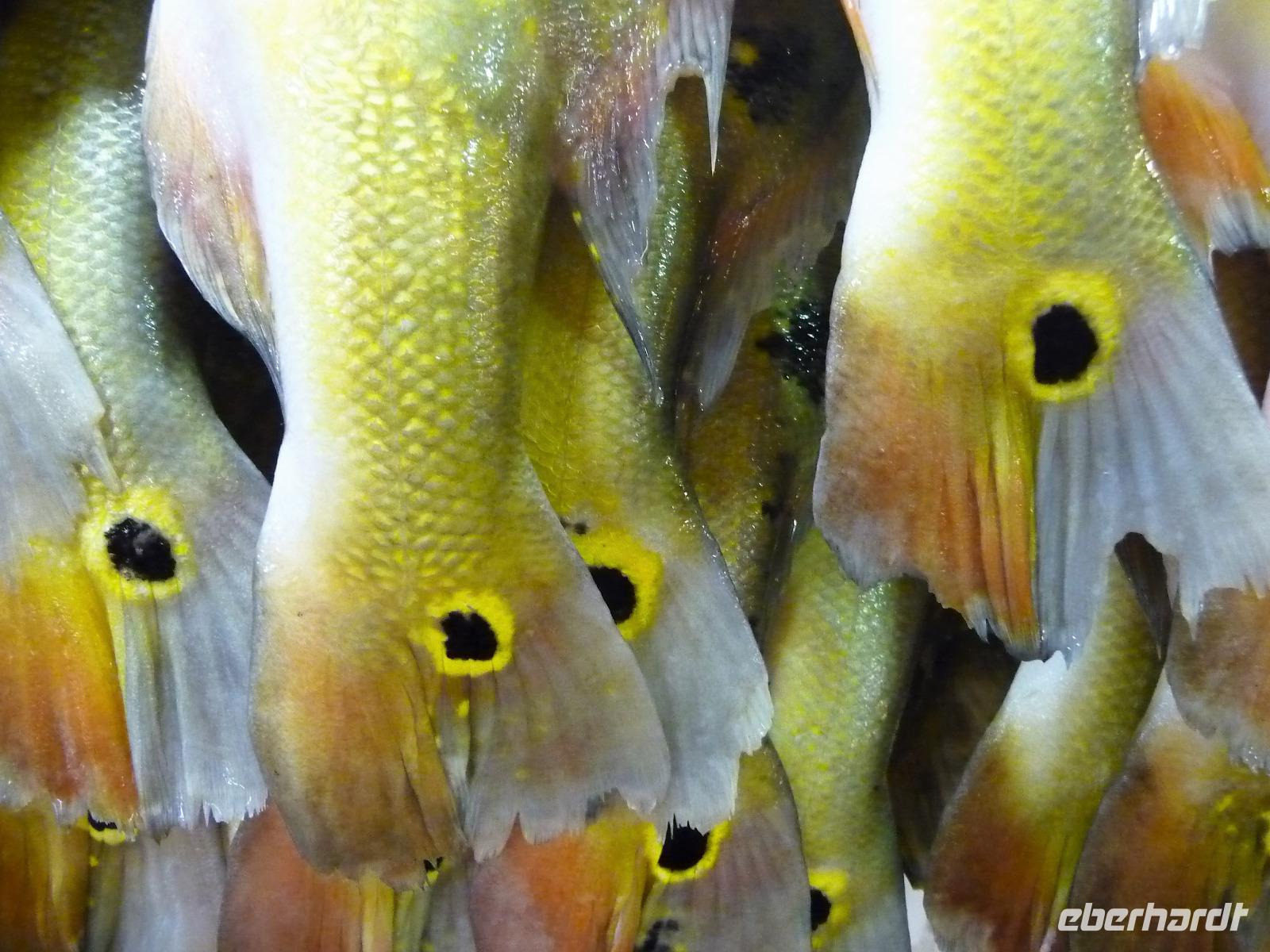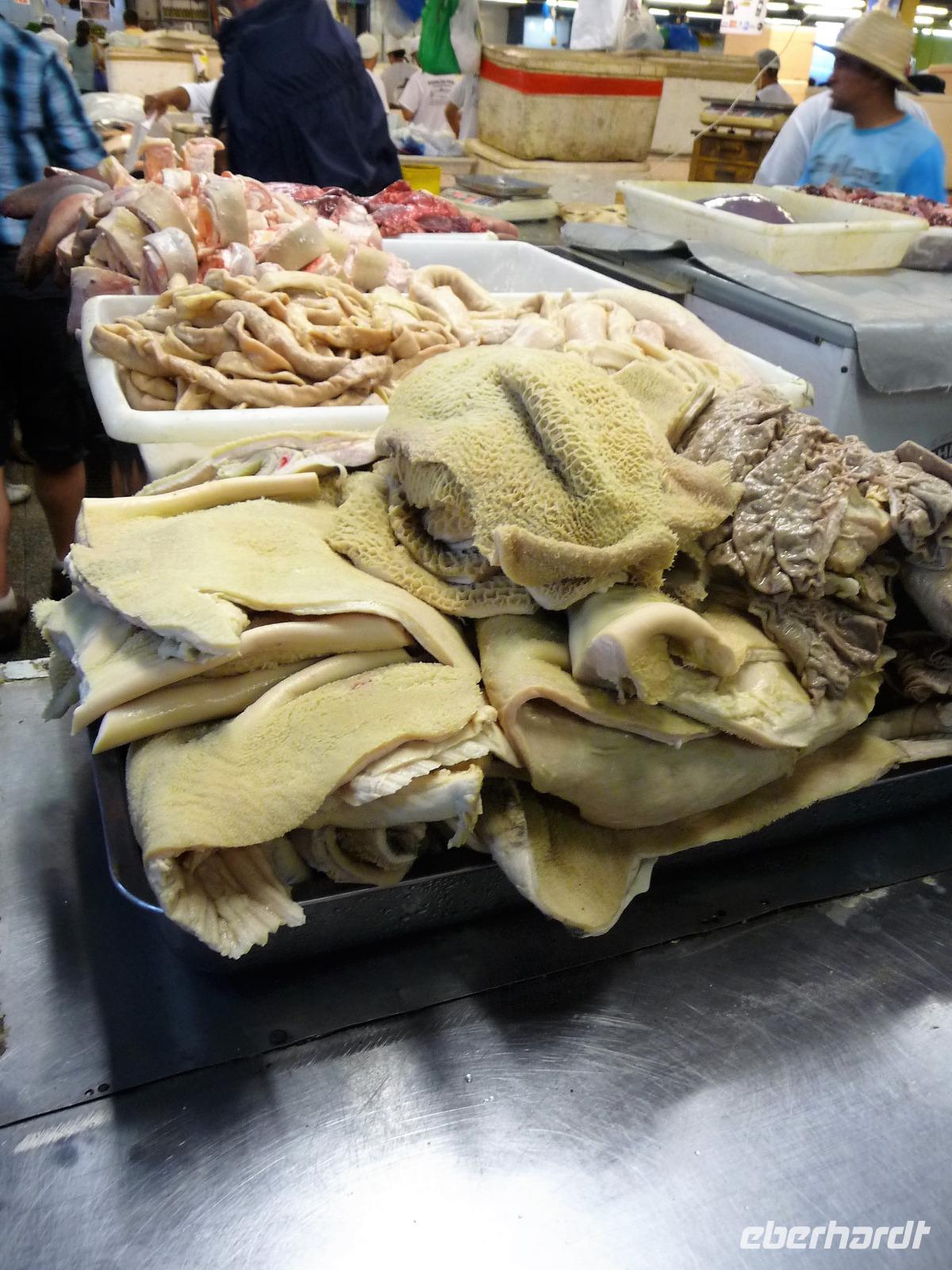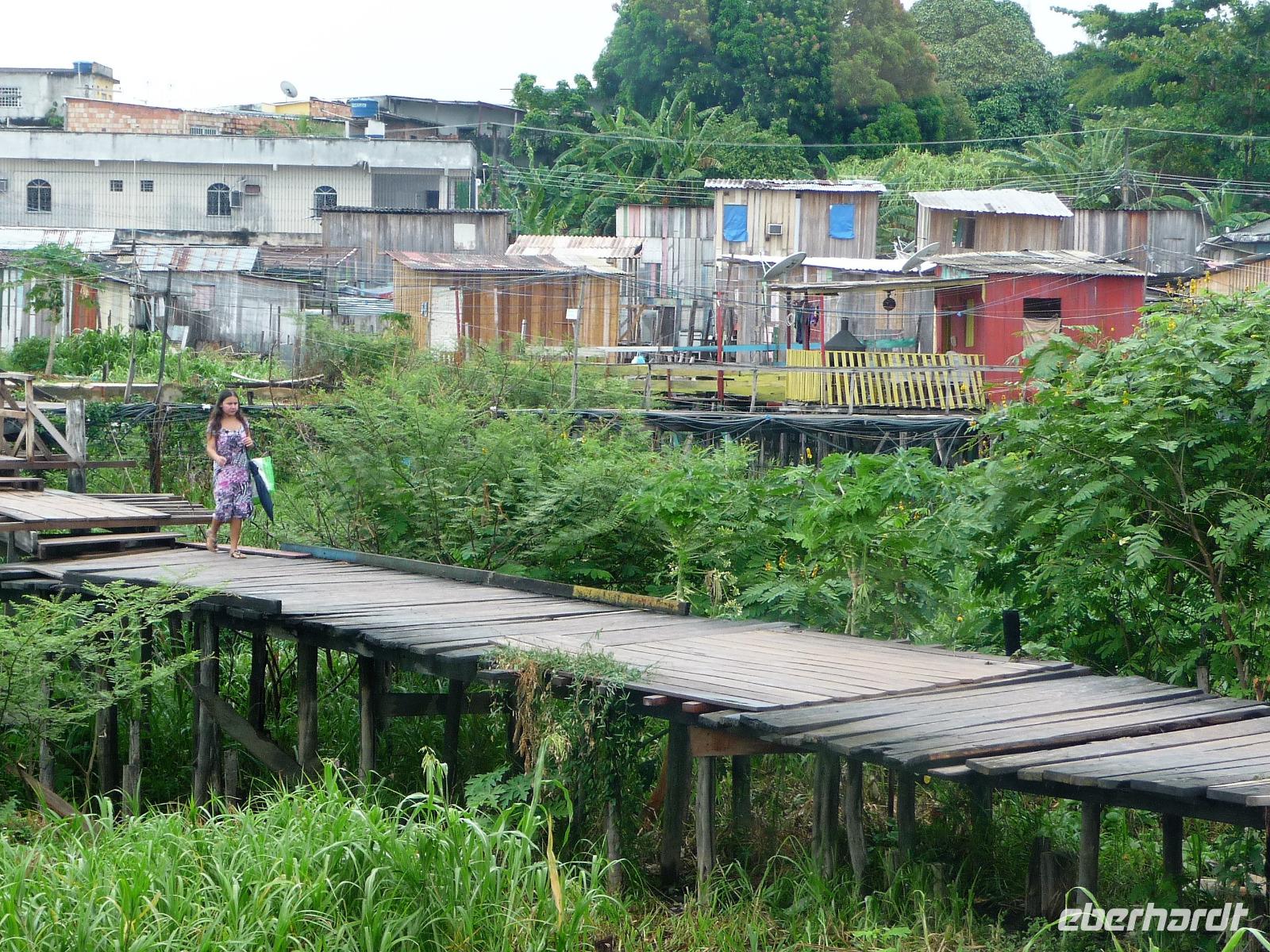 Ein ganz besonderes Ereignis erwartete uns am frühen Morgen, denn wir konnten den Zusammenfluss von Rio Negro und Rio Solimoes, den sogenannten Encontro das Aguas, ganz von Nahem erleben. Erst von hier ab, ist der Amazonas tatsächlich der Amazonas. Mehrere Kilometer lang dauert aufgrund der unterschiedlichen Fließgeschwindigkeit und des unterschiedlichen Wärmegrades das Vermischen des „schwarzen" Rio Negro und des schlammig-braun wirkenden Solimoes, wirklich ein Naturwunder an dem man sich nicht sattsehen kann, denn immer wieder zeigen sich neue Bilder - fast wie Kunstwerke aussehend - auf der Wasseroberfläche. Nach dem Frühstück hieß es dann „alle Mann von Bord" und unsere Reiseleiterin Maria erwartete uns bereits, um uns den zweiten Teil der Stadtrundfahrt von Manaus zu zeigen. Zuerst fuhren wir zum sogenannten Bananenmarkt. Riesige Bananenstauden, aber auch herrliche andere tropische Früchte ließen uns immer wieder staunen. Maria erzählte uns nebenbei so manche kleine Geschichte und der Rundgang über den Markt verging wie im Flug. Ein ungewöhnliches Andenken für 1 Real kauften wir uns bei einem Händler, eine getrocknete Schuppe des größten Amazonasfisches, den die Einheimischen als Nagelfeile verwenden. Besonders interessant war der großte Teil des Fischmarktes, erstaunt stellten wir fest, dass es keinen komischen Fischgeruch gab. Fangfrisch wurde hier der tollste Fisch präsentiert und verkauft. Außerhalb der Markthallen sahen wir die kleinen Räucheröfen, aus denen der Fisch direkt zum Mittagessen angeboten wurde. Wenn etwas mehr Zeit gewesen wäre, hätten wir sicher mal probiert. Interessant erzählte uns Maria an einem Kräuterstand von den natürlichen Heilmitteln, die von vielen Brasilianern der "neuen" Medizin vorgezogen wird. Im Kunsthandwerksmarkt hatte dann jeder etwas Freizeit, um noch das eine oder andere Andenken zu erstehen. Bevor wir es zu unserem nächsten Flug ging, zeigte uns Maria noch die ärmeren Seiten von Manaus und erklärte viel zur sozialen Lage im Land. Überpünktlich kamen wir am Flughafen von Manaus an, wo wir uns zum ersten Mal mit den Automaten der GOL abmühen mussten, denn vorher kam man nicht zur Gepäckabgabe. Mit den vielen Bordkarten für die Gruppe für den Flug von Manaus nach Sao Paulo und weiter nach Iguacu war der Check In Automat überfordert, immer wieder klemmte eine der Bordkarten. Mit viel Geduld schafften wir es aber dennoch. Durch unsere vielen bisherigen Flüge waren wir schon richtige Profis und schafften unsere nächsten 2 Flüge und die 2 Stunden Zeitumstellung wie im Schlaf. Als wir spät abends in Iguazu ankamen, waren wir aber doch froh, als wir ins Bett fallen konnten.