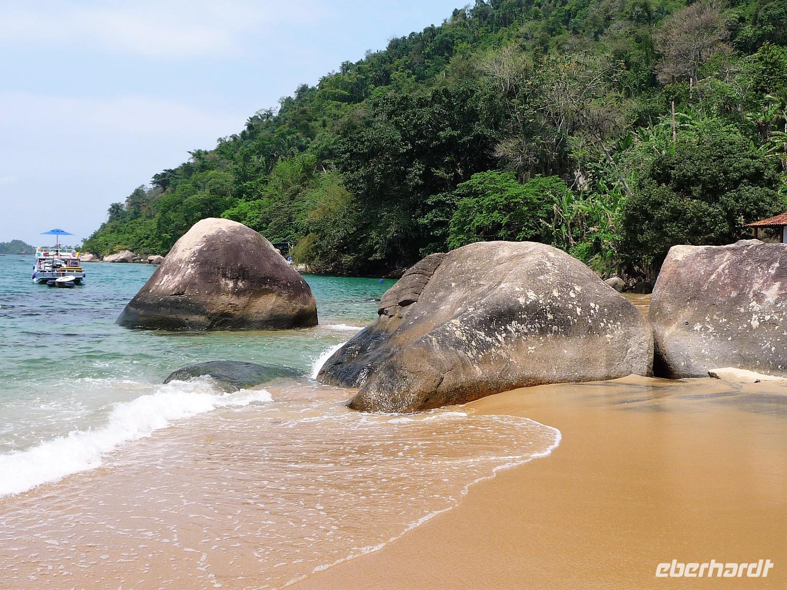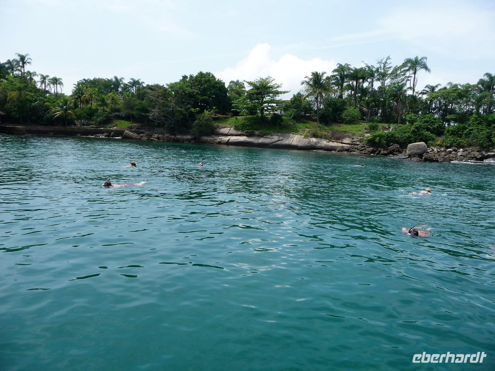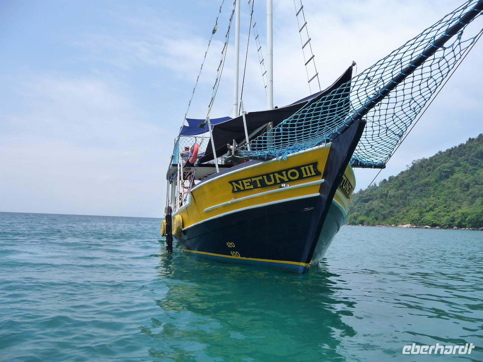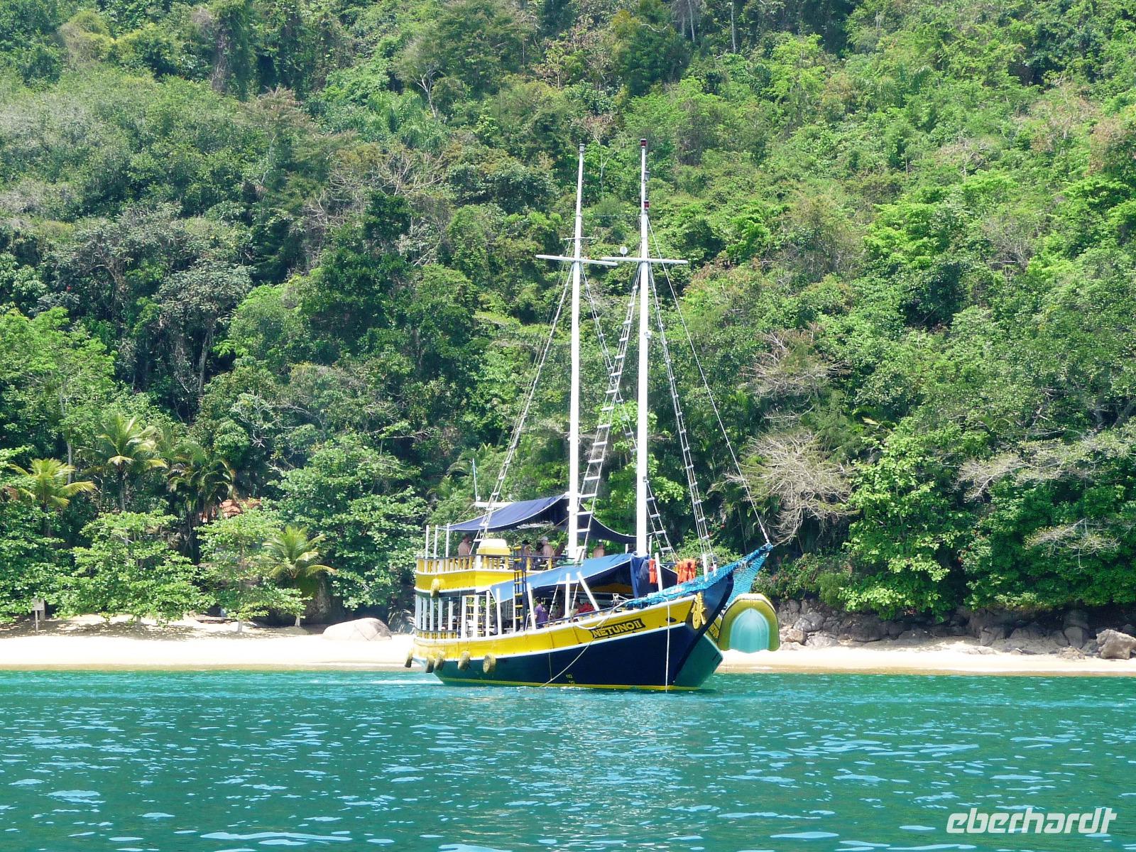 Heute verlebten wir einen entspannten Tag an Bord der Neptuno. Nach einem gemütlichen Frühstück spazierten wir zum Hafen und waren gespannt, ob das Wetter aushalten würde, die Regencapes waren für alle Fälle eingepackt. Fast pünktlich - als auch das letzte brasilianische Pärchen seine persönlichen 10.00 Uhr geschafft hatten - stachen wir in See, um den Nationalpark vor der Küste zu erkunden. Sobald wir aus dem Hafen ausliefen, lichteten sich die Regenwolken und wir sollten den ganzen Tag traumhaftes Wetter haben. Rund um Paraty zählt man mehr als 65 Inseln, herrliche Strände und kann im kristallklaren Wasser baden. Wir hielten, um zu Schnorcheln, zu Schwimmen sowie am Strand zu spazieren und einfach Sonne und Meer zu genießen. Zwischendurch war auch Zeit für einen kleinen Snack und den einen oder anderen Cocktail oder ein erfrischendes Bier. Am Nachmittag stöberte jeder für sich noch etwas durch Paraty und Abend genossen wir ein leckeres Abendessen mit frisch gebackenem Brot. Ein wunderschöner Tag, da waren wir uns alle einig.