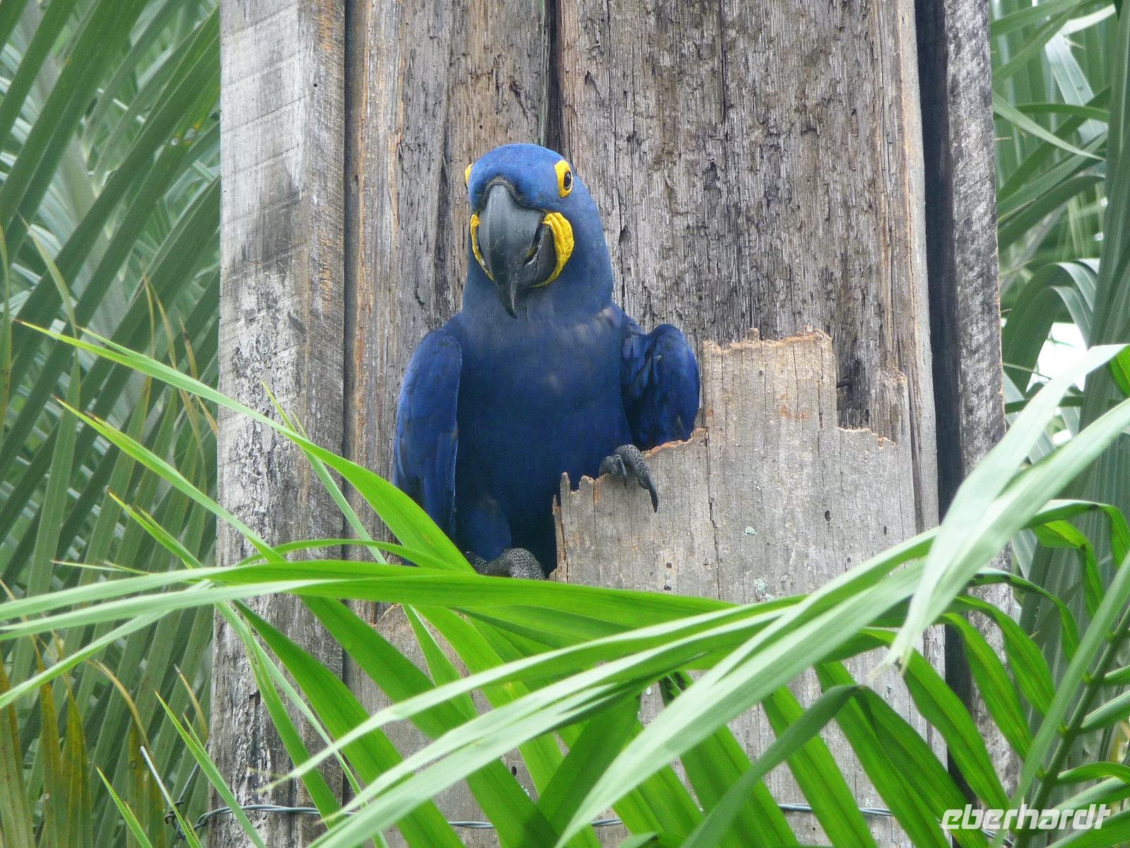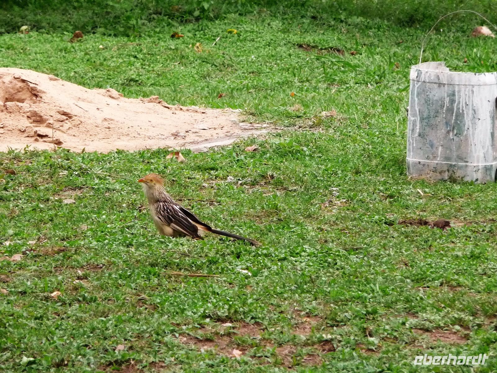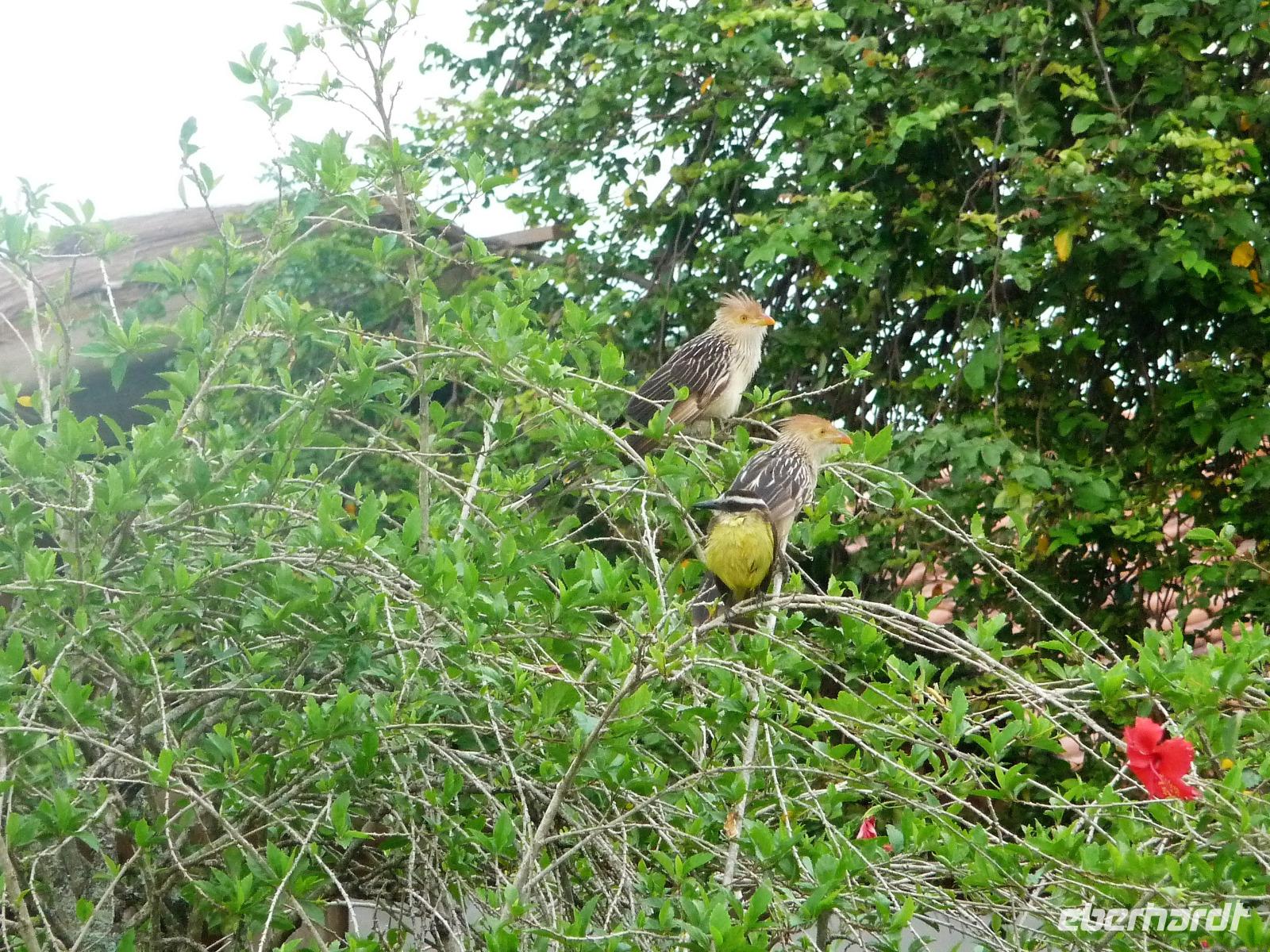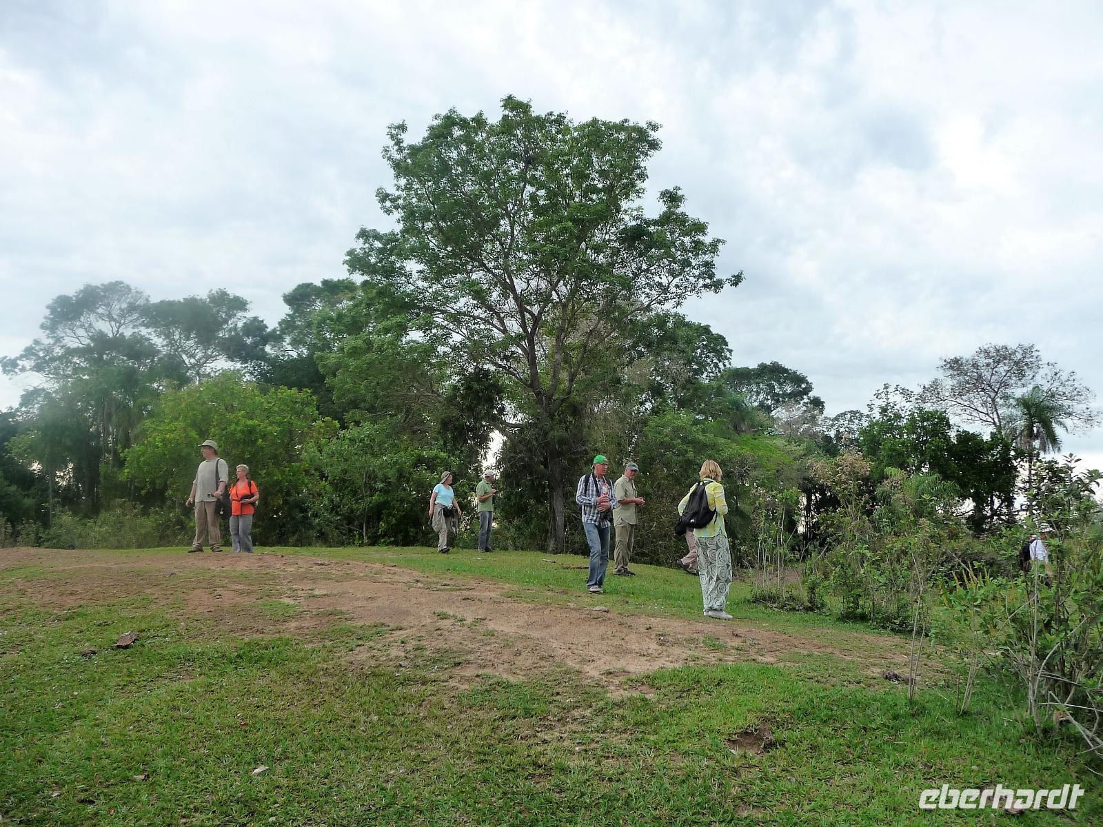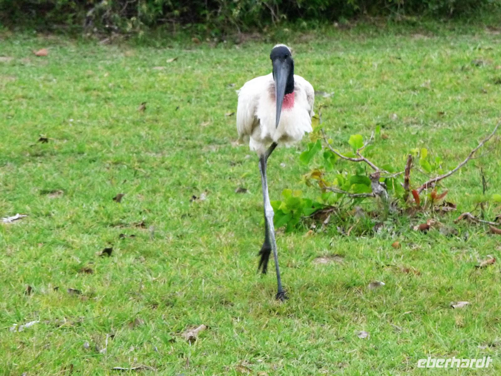 Heute hieß es wieder zeitig aufstehen, denn die Wanderung durch die Umgebung der Pousada wartete auf uns. Ein einfaches, aber leckeres Frühstück und ein herrliches Vogelgezwischer begrüßte uns am Morgen. Eine ganze Menge Hyazinth-Aras waren zu sehen und da wir natürlich alle fotografieren wollten, verzögerte sich unser Abmarsch. Gemeinsam mit Fabiano und Valdir starteten wir unsere kleine Wanderung. Schon jetzt war es drückend heiß, aber die Sonne schien nicht, was sich für uns als Glücksfall erweisen sollte, da wir so mehr Tiere sahen, die sich sonst eher ins Unterholz zurückziehen. Erstaunlich, welche Vielfalt an Vögeln wir sahen: den Jesusvogel, der über Wasser läuft, den farbenprächtigen Tropial, verschiedene Kukuks- und Spechtarten und sogar ein Tucan zeigt sich uns kurz. Etwas zu laut waren unsere Gespräche für die kleinen, flinken Nasenbären, die schnell das Weite suchten. Der Ameisenbär lief uns dagegen regelrecht in Fotoposition vor die Linse. Wir lernten eine ganze Menge von Valdir über die Flora, probierten eine falsche Erdnuss, testeten die rauhen, s chmirgelpapierähnlichen Blätter der Lixeira-Pflanze und sahen die nussartigen Früchte der kleinen Palme, von der sich die Aras ernähren. Selbst unsere Guides waren überrascht, als sie Reste einer seltenen Yuagana-Katze fanden, die wahrscheinlich eine brauner Puma gefressen hat. Nach fast 3 Stunden kamen wir zurück zur Lodge und konnten uns etwas im Pool oder bei einem frischen Drink an der Bar entspannen. Wunderbar schmeckten auch die regionalen Köstlichkeiten vom Mittagsbuffet und wir probierten Käse mit Doce di leite zum Nachtisch. Nach einer ausführlichen Siesta und individuellen Spaziergängen durch die Lodge ging es gleich nochmal zu einem kleinen Kaffeesnack, bei dem wir staunten, was der eine oder andere von uns, noch vor die Linse bekommen hatte. Vor allem das Gürteltier war für alle interessant. Am späten Nachmittag ging es dann auf Jeepsafari. Auf einem großen Lastwagen, der mit Sitzbänken umgebaut war, fuhren wir alle gemeinsam über die riesige Fläche der Pousada. Wieder erfuhren wir viel Neues von Valdir, sahen verschiedene Tiere vom Tuiuiui bis zum Wasserschwein. Besonders der Stopp an der tiefsten Stelle, die von Wasser bedeckt ist, wird uns in Erinnerung bleiben, denn als wir ausstiegen, kamen auf einmal 2 Kaimane direkt aus dem Wasser auf uns zu. Auch den Baum mit Früchten, die die Eingeborenen früher für die Körperbemalung nutzen, sahen wir nochmal in voller Pracht. Und das Beste: unsere Regencapes mussten wir nur ganz kurz auspacken.Nach dem Abendessen stand noch eine Nachtsafari auf dem Programm. Erstaunlich, was unsere Guides an den in der Nacht funkelnden Tieraugen alles erkennen konnten. In gemütlicher Runde ließen wir den Tag an der Bar ausklingen. Graviola - eine Art Yakfrucht, leicht säuerlich und mit viel Fruchtsaft, eine Barbadoskirsche. Dabei begleitete uns eine kleiner Emu, der Anschluss suchte.