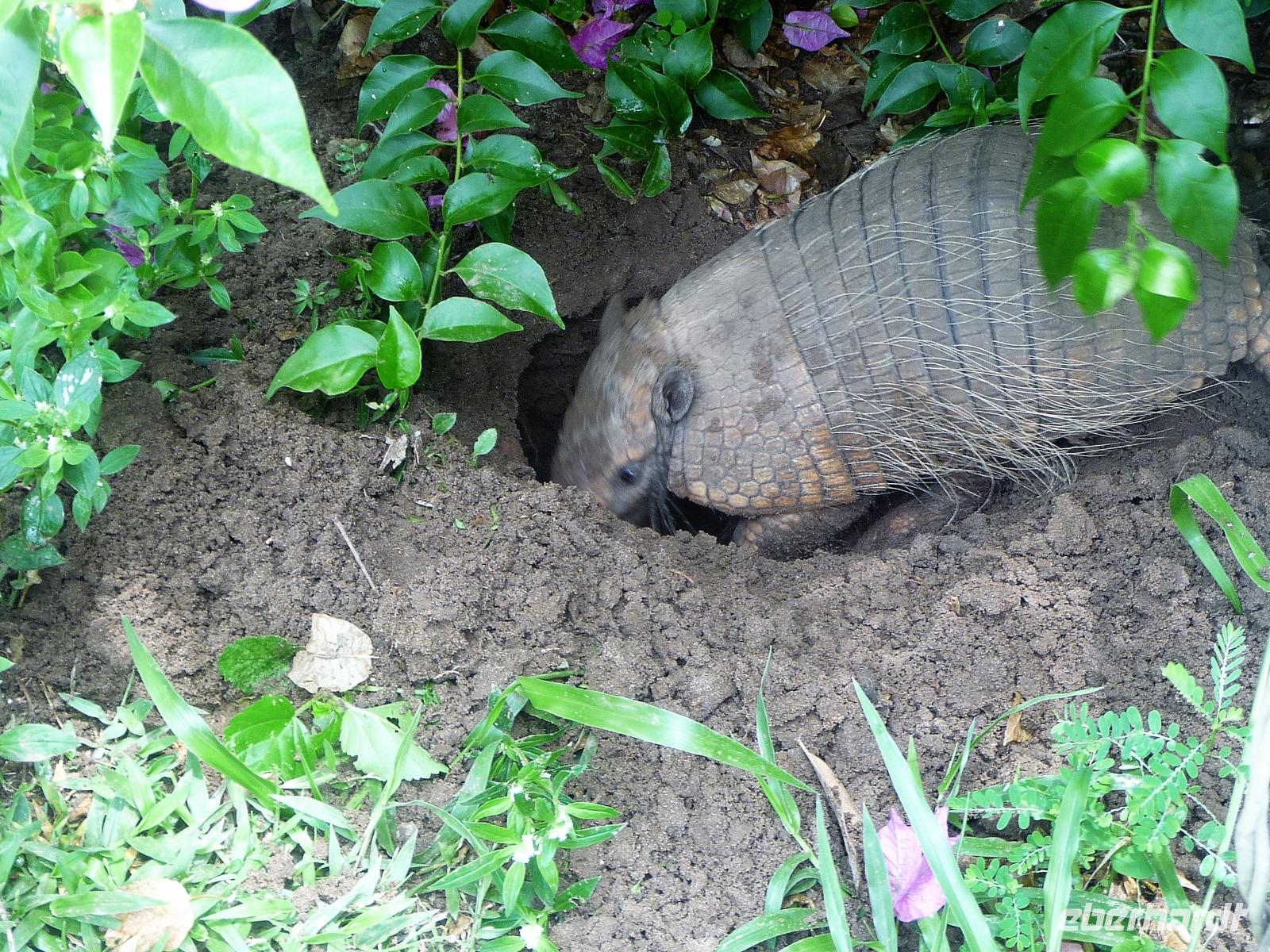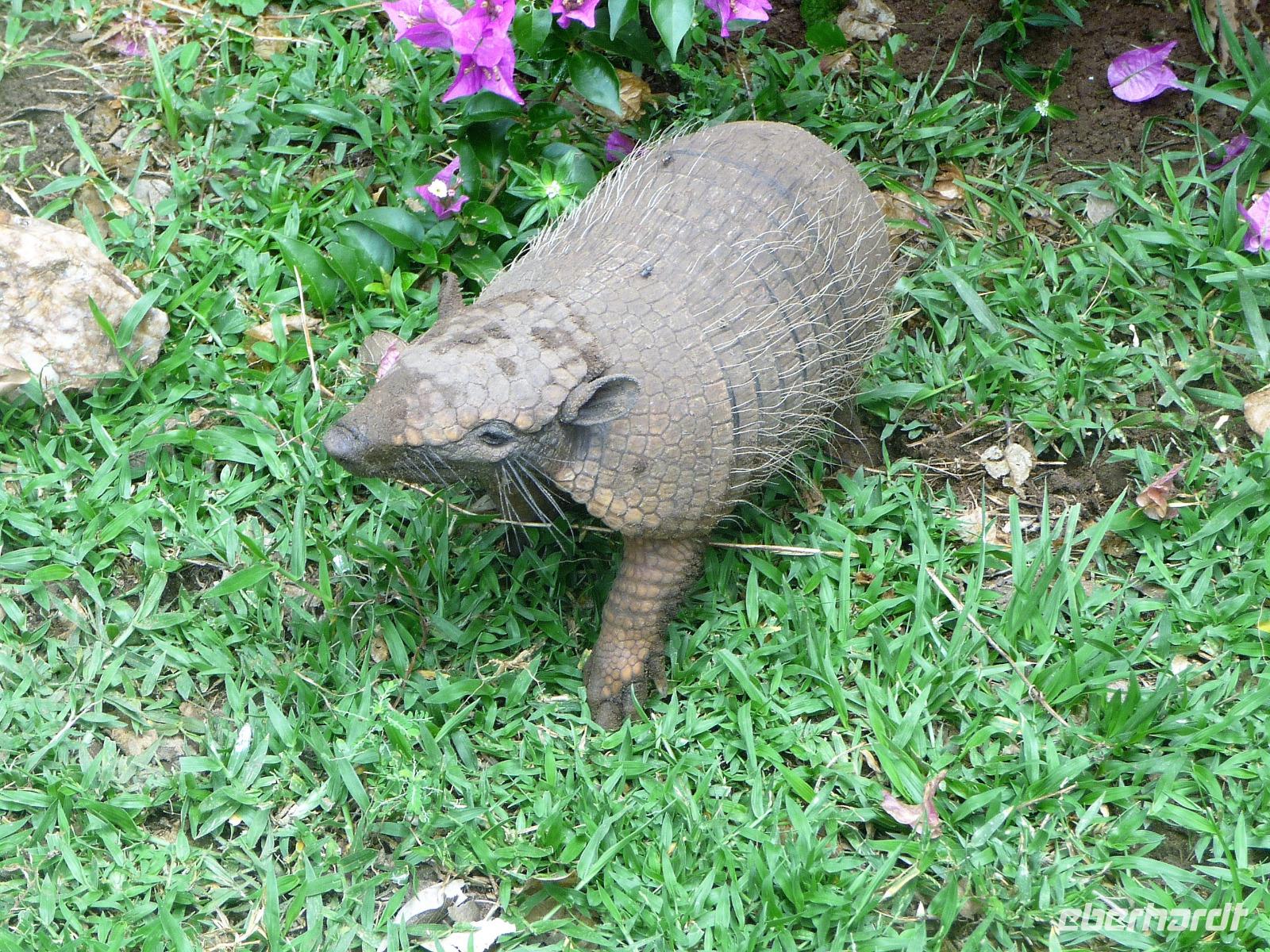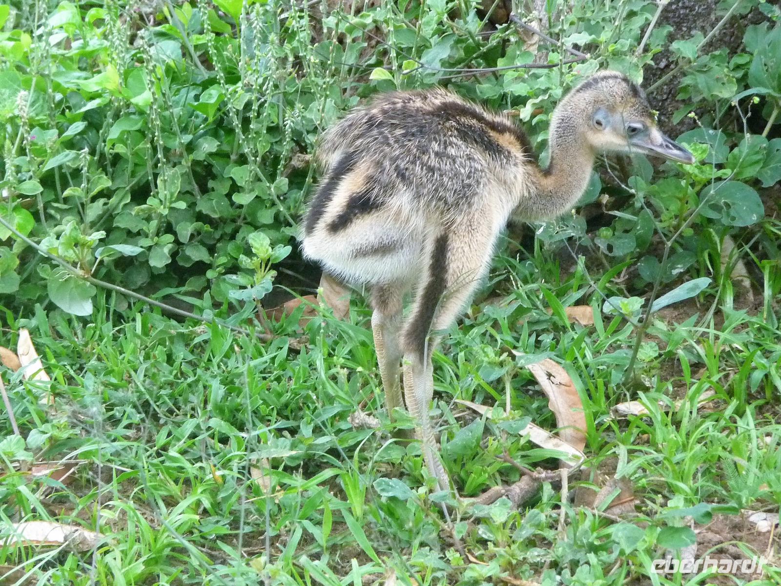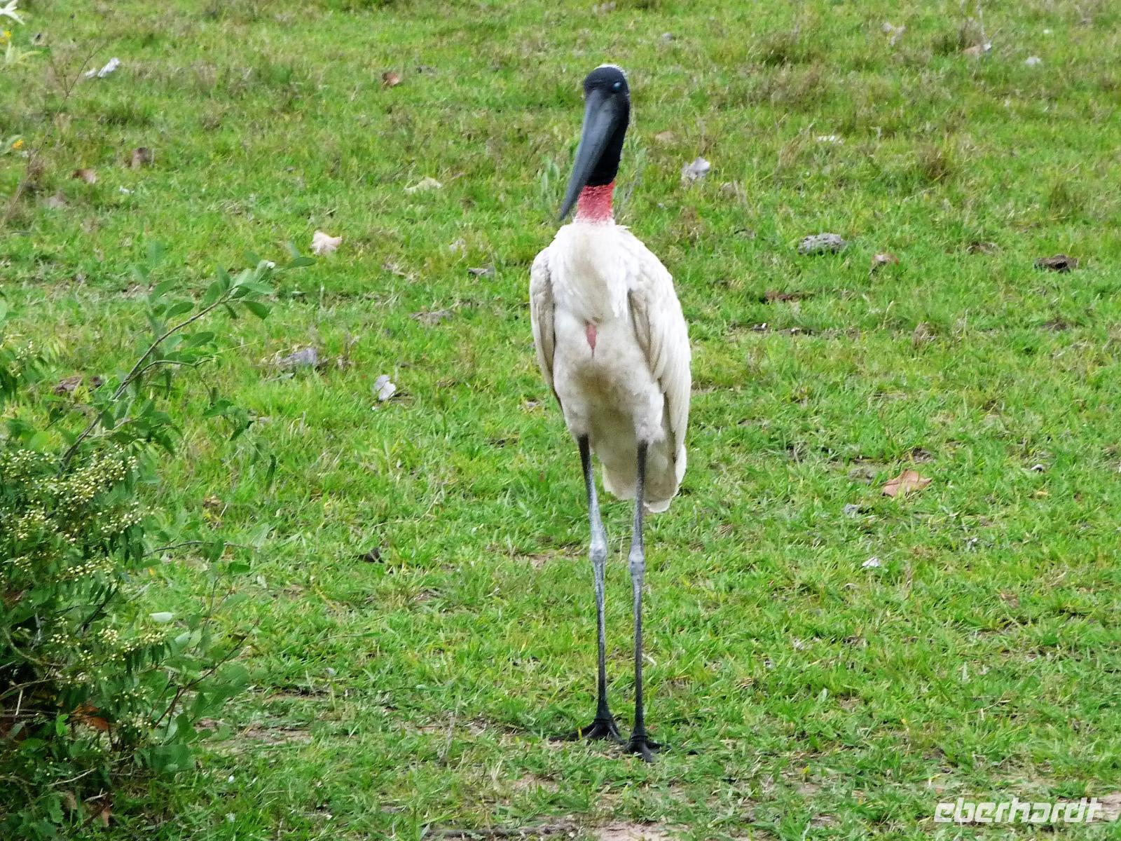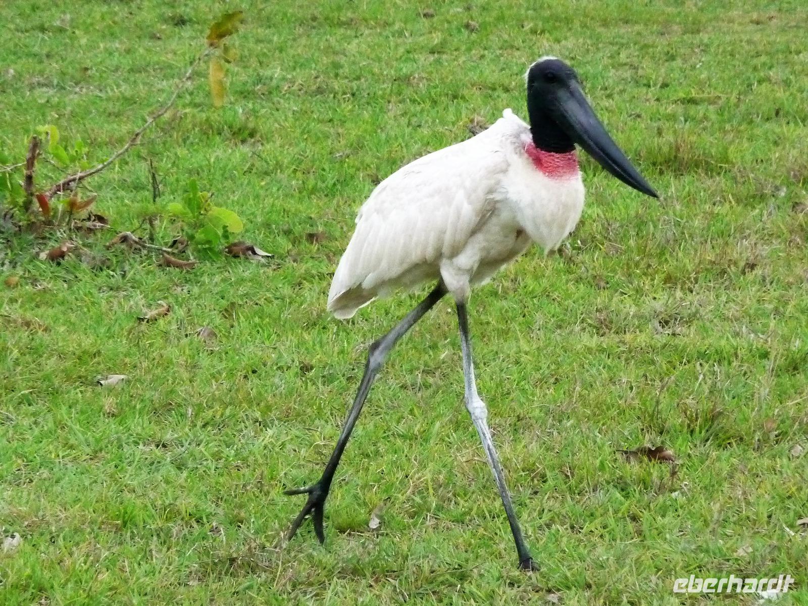 Heute hieß es wieder zeitig aufstehen, denn die Wanderung durch die Umgebung der Pousada wartete auf uns. Ein einfaches, aber leckeres Frühstück und ein herrliches Vogelgezwischer begrüßte uns am Morgen. Eine ganze Menge Hyazinth-Aras waren zu sehen und da wir natürlich alle fotografieren wollten, verzögerte sich unser Abmarsch. Gemeinsam mit Fabiano und Valdir starteten wir unsere kleine Wanderung. Schon jetzt war es drückend heiß, aber die Sonne schien nicht, was sich für uns als Glücksfall erweisen sollte, da wir so mehr Tiere sahen, die sich sonst eher ins Unterholz zurückziehen. Erstaunlich, welche Vielfalt an Vögeln wir sahen: den Jesusvogel, der über Wasser läuft, den farbenprächtigen Tropial, verschiedene Kukuks- und Spechtarten und sogar ein Tucan zeigt sich uns kurz. Etwas zu laut waren unsere Gespräche für die kleinen, flinken Nasenbären, die schnell das Weite suchten. Der Ameisenbär lief uns dagegen regelrecht in Fotoposition vor die Linse. Wir lernten eine ganze Menge von Valdir über die Flora, probierten eine falsche Erdnuss, testeten die rauhen, s chmirgelpapierähnlichen Blätter der Lixeira-Pflanze und sahen die nussartigen Früchte der kleinen Palme, von der sich die Aras ernähren. Selbst unsere Guides waren überrascht, als sie Reste einer seltenen Yuagana-Katze fanden, die wahrscheinlich eine brauner Puma gefressen hat. Nach fast 3 Stunden kamen wir zurück zur Lodge und konnten uns etwas im Pool oder bei einem frischen Drink an der Bar entspannen. Wunderbar schmeckten auch die regionalen Köstlichkeiten vom Mittagsbuffet und wir probierten Käse mit Doce di leite zum Nachtisch. Nach einer ausführlichen Siesta und individuellen Spaziergängen durch die Lodge ging es gleich nochmal zu einem kleinen Kaffeesnack, bei dem wir staunten, was der eine oder andere von uns, noch vor die Linse bekommen hatte. Vor allem das Gürteltier war für alle interessant. Am späten Nachmittag ging es dann auf Jeepsafari. Auf einem großen Lastwagen, der mit Sitzbänken umgebaut war, fuhren wir alle gemeinsam über die riesige Fläche der Pousada. Wieder erfuhren wir viel Neues von Valdir, sahen verschiedene Tiere vom Tuiuiui bis zum Wasserschwein. Besonders der Stopp an der tiefsten Stelle, die von Wasser bedeckt ist, wird uns in Erinnerung bleiben, denn als wir ausstiegen, kamen auf einmal 2 Kaimane direkt aus dem Wasser auf uns zu. Auch den Baum mit Früchten, die die Eingeborenen früher für die Körperbemalung nutzen, sahen wir nochmal in voller Pracht. Und das Beste: unsere Regencapes mussten wir nur ganz kurz auspacken.Nach dem Abendessen stand noch eine Nachtsafari auf dem Programm. Erstaunlich, was unsere Guides an den in der Nacht funkelnden Tieraugen alles erkennen konnten. In gemütlicher Runde ließen wir den Tag an der Bar ausklingen. Graviola - eine Art Yakfrucht, leicht säuerlich und mit viel Fruchtsaft, eine Barbadoskirsche. Dabei begleitete uns eine kleiner Emu, der Anschluss suchte.