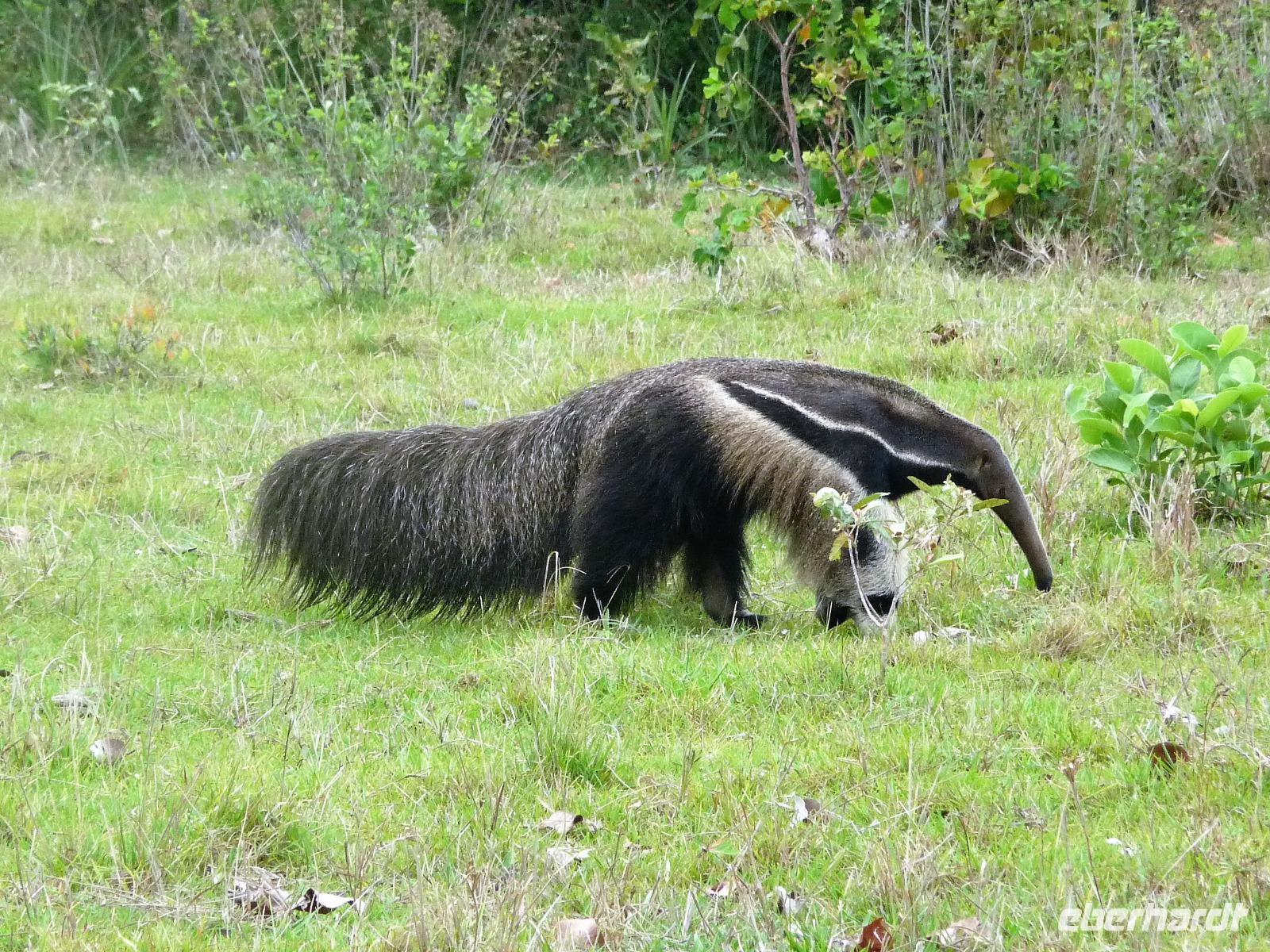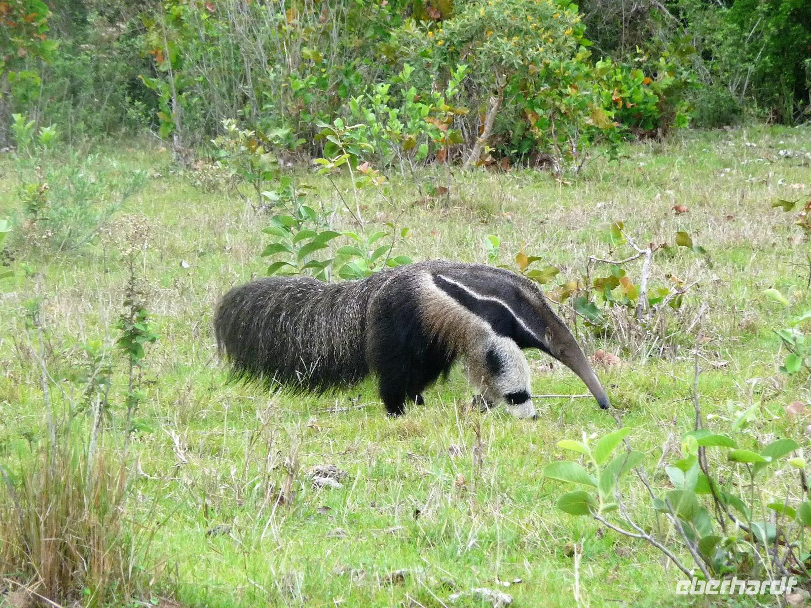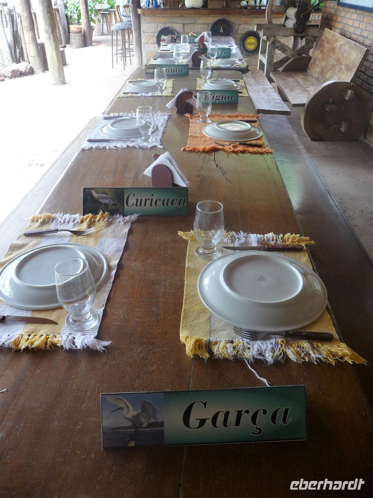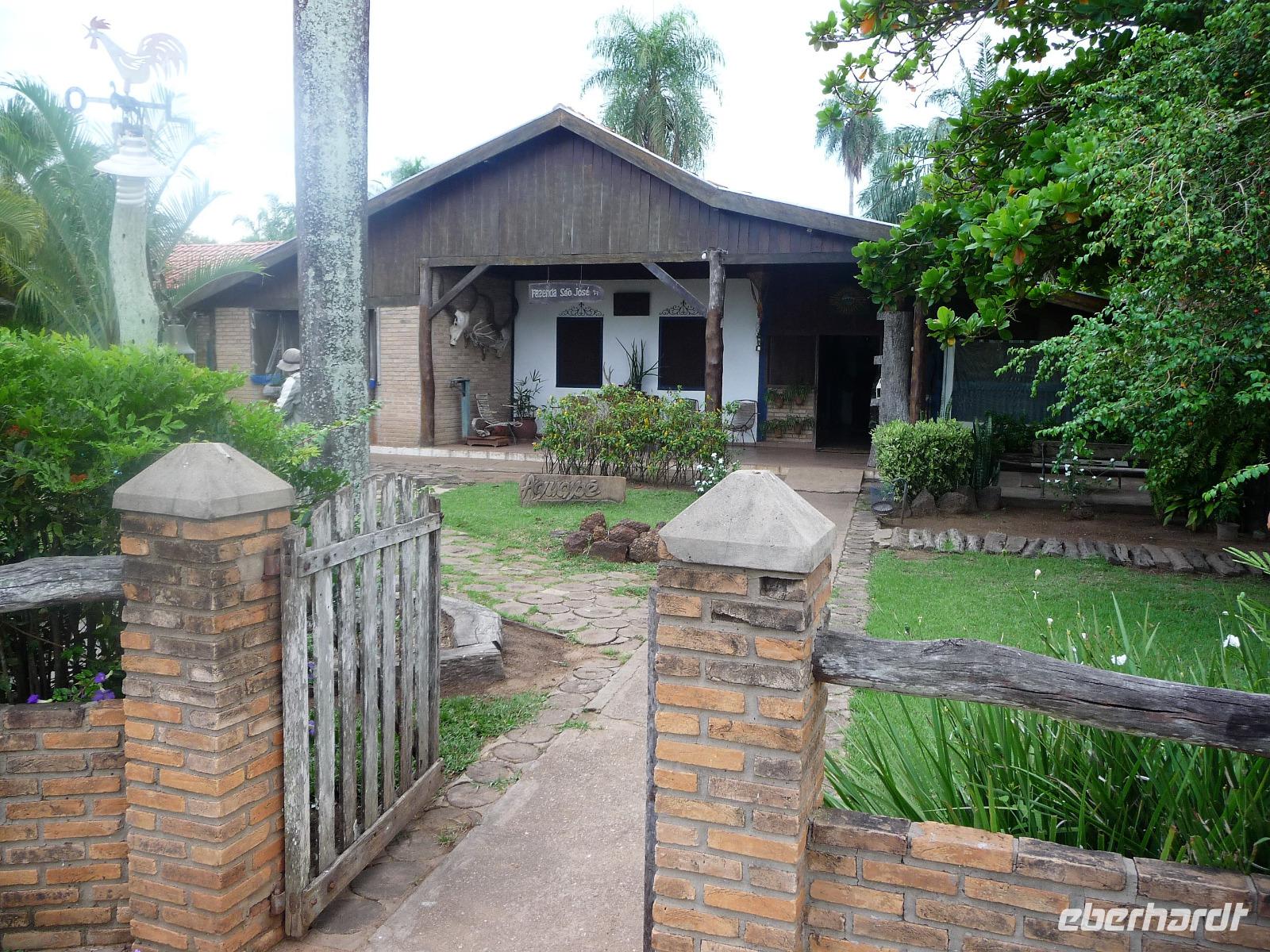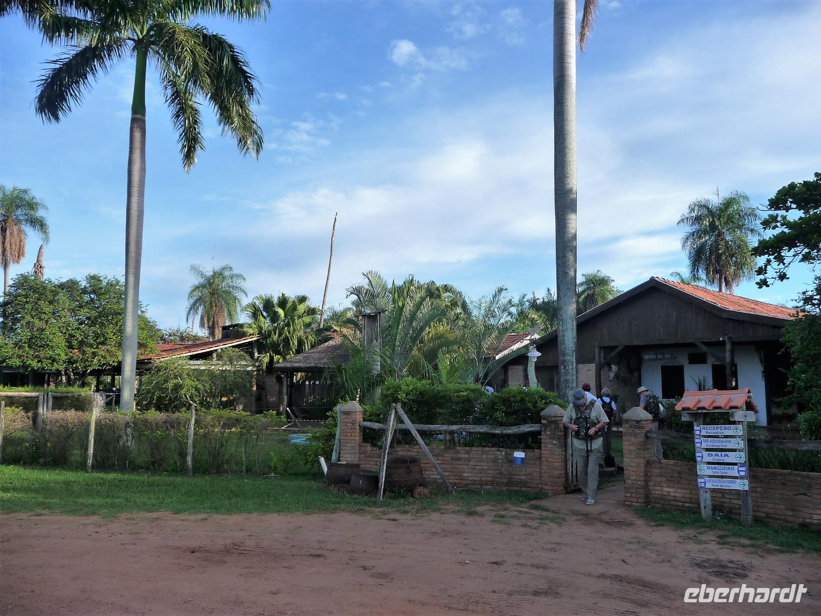Als wir durch die Schiebetür des Flughafens traten, strahlte bereits wieder die Sonne und unser Reiseleiter für die nächsten Tage, Valdir, erwartete uns. Mit dem kleinen Bus sollte es für die nächsten 3 ½ Stunden zunächst über eine asphaltierte Straße, die von riesigen Weiden mit unzähligen Rindern begrenzt würden und später fast 50 km über eine Schotterpiste. Bereits in der Dämmerung sahen wir unseren ersten Ameisenbär. Im Dunkeln erreichten wir unsere Pousada Aguape, die schon mit dem Abendessen auf uns wartete. Herzlich gelacht haben wir, als uns direkt beim Abendessen ein Pferd besuchte, kurz nach dem rechten sah und dann durch die Bar entschwand. Nachdem wir uns gestärkt und einen „Feierabenddrink" an der Bar genossen hatten, fielen wir nach dem langen Reisetag totmüde ins Bett.