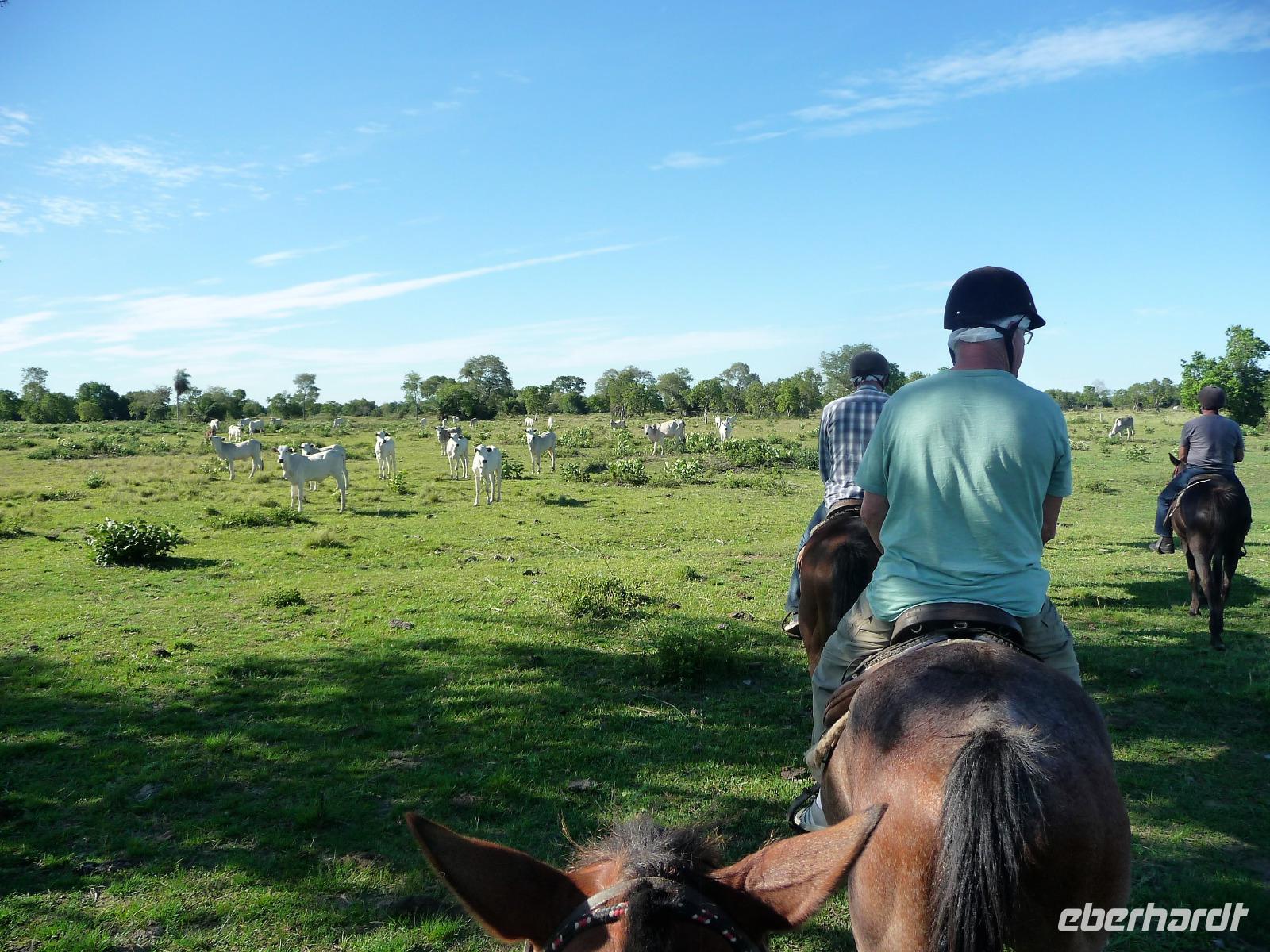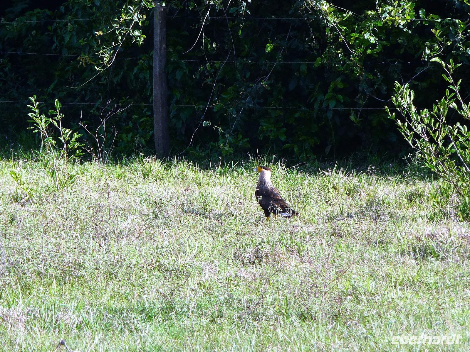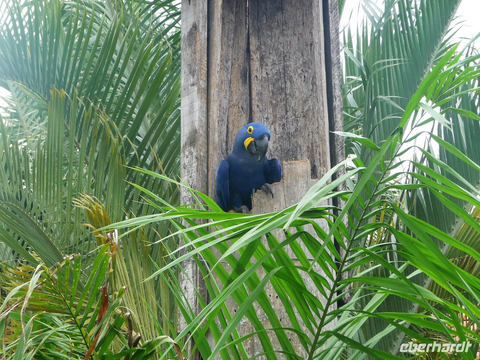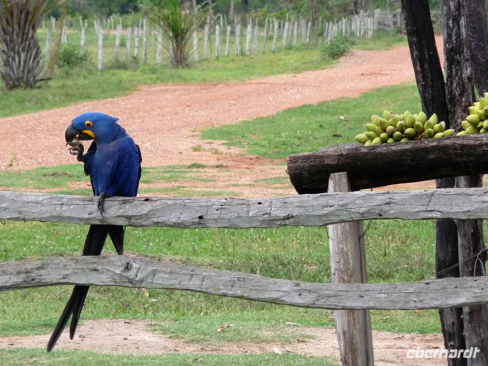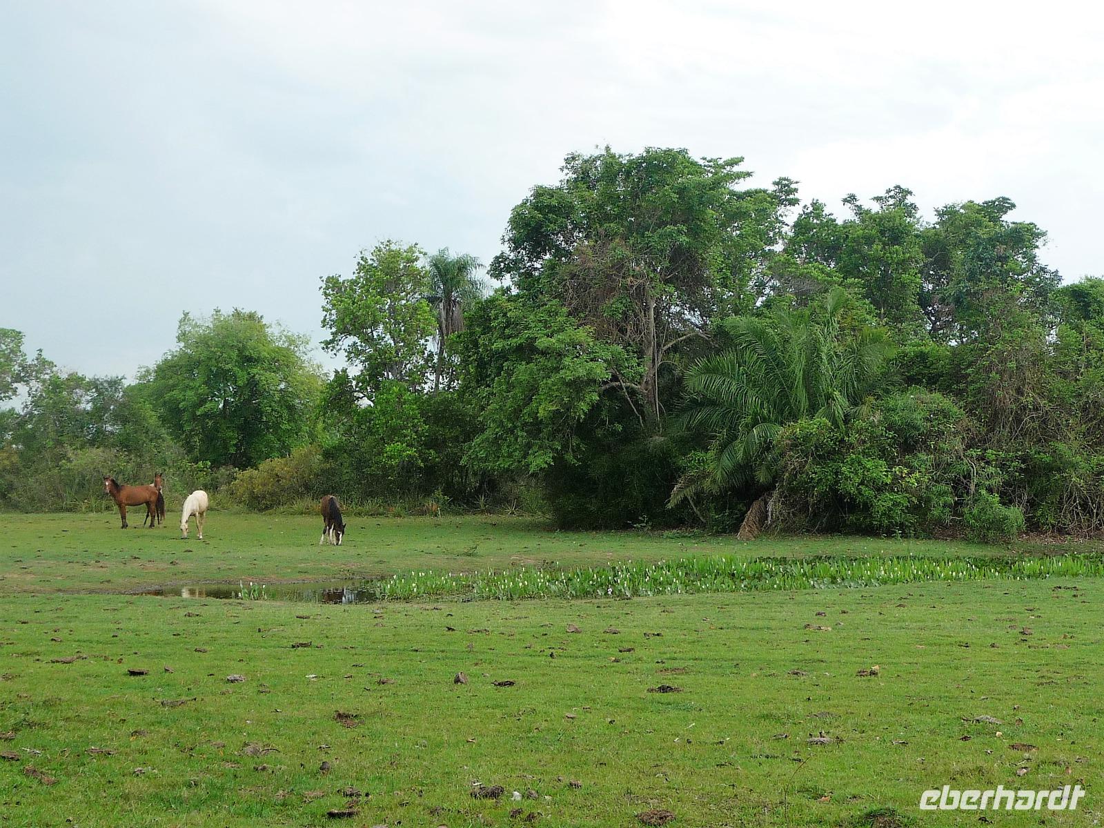 Als wir durch die Schiebetür des Flughafens traten, strahlte bereits wieder die Sonne und unser Reiseleiter für die nächsten Tage, Valdir, erwartete uns. Mit dem kleinen Bus sollte es für die nächsten 3 ½ Stunden zunächst über eine asphaltierte Straße, die von riesigen Weiden mit unzähligen Rindern begrenzt würden und später fast 50 km über eine Schotterpiste. Bereits in der Dämmerung sahen wir unseren ersten Ameisenbär. Im Dunkeln erreichten wir unsere Pousada Aguape, die schon mit dem Abendessen auf uns wartete. Herzlich gelacht haben wir, als uns direkt beim Abendessen ein Pferd besuchte, kurz nach dem rechten sah und dann durch die Bar entschwand. Nachdem wir uns gestärkt und einen „Feierabenddrink" an der Bar genossen hatten, fielen wir nach dem langen Reisetag totmüde ins Bett.