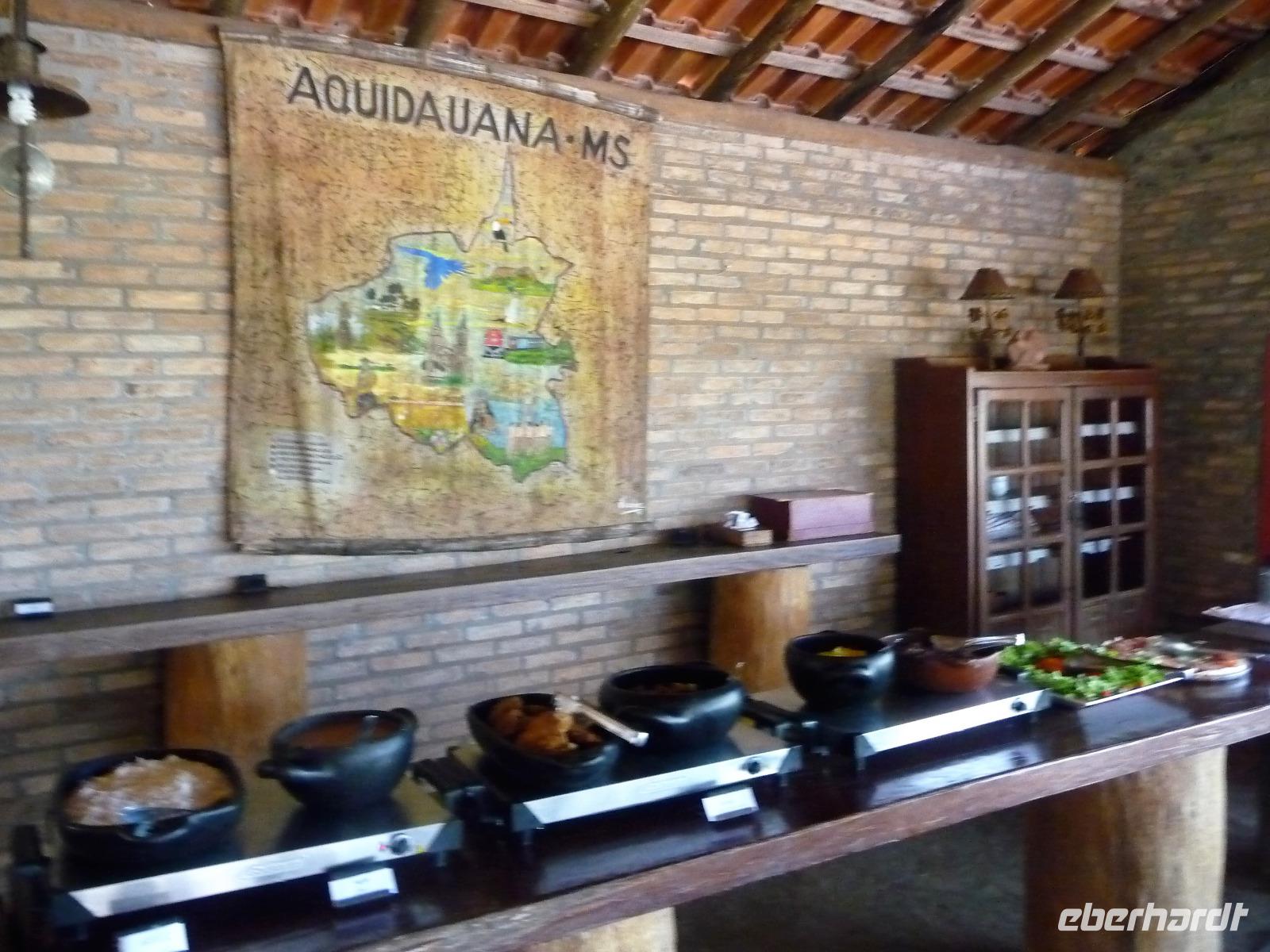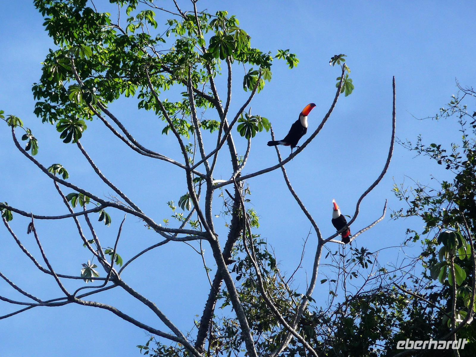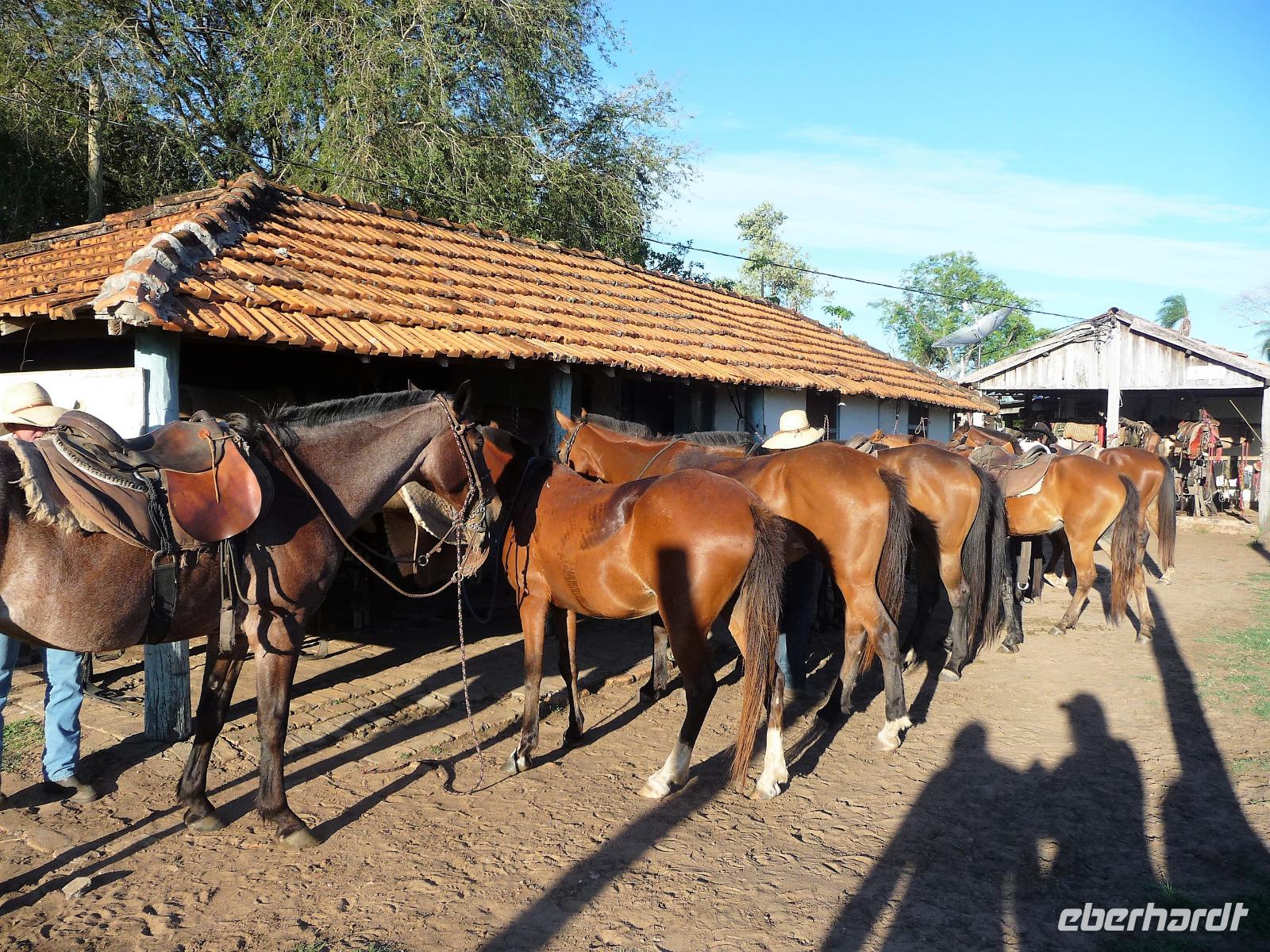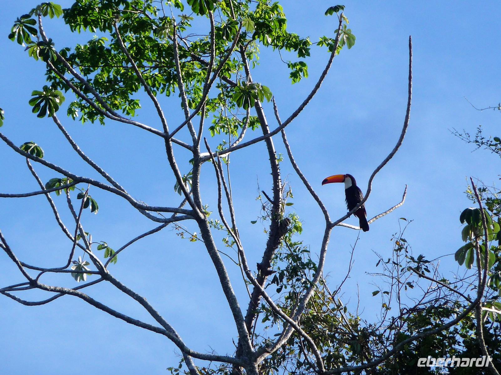 Guten Morgen Sonnenschein! - keine Wolke am Himmel, als wir nach dem zeitigen Frühstück auf unsere Bootstour auf dem Aquidauana-Fluss aufbrachen. In 2 Booten fuhren wir entspannt den Fluss entlang und staunten, welche Vögel es alles zu sehen gibt. Unsere Guides machten uns immer wieder auf Tiere aufmerksam, die unser ungeübtes Auge im Blätterwald überhaupt nicht gesehen hätte. Vor allem Tukane begleiteten uns auf der Fahrt immer wieder. Aber auch sonst, lernten wir wieder viel über die Region des Pantanals, an den Ufern war zu sehen, wie hoch die Unterschiede der Flusstiefe in der Trocken- und Regenperiode sind. Wir waren uns einig, ein wunderschöner Ausflug. Das sonnige Wetter nutzen wir natürlich auch zur Entspannung am Pool. Vaidir hatte noch eine freudig Nachricht, dass Abendessen, welches eigentlich sehr spät in Campo Grande geplant war, konnten wir auf vor die Abfahrt in der Lodge vorziehen und wir durften sogar bis abends in unseren Zimmern bleiben. Aber vorher wollten wir noch das Pantanal auf dem Rücken der Pferde erkunden. Da fast noch niemand von uns vorher auf einem Pferd gesessen hatte, war viel Spaß vorprogrammiert, sowohl auf unserer Seite als auch bei den Guides. Es war erstaunlich wie gut wir uns anstellten, so dass wir sogar zwischendurch eine Pause einlegen und absteigen konnten. Zur Begleitung hatten wir noch eine Kutsche bestellt, damit es für diejenigen, die sich hoch zu Roß nicht ganz so wohl fühlen, mit uns unterwegs sein konnten. Gern hätten wir noch einen schnelleren Trab ausprobiert, aber das war für das erste Mal doch zu viel. Traurig verließen wir die Pousada, wo wir uns richtig eingelebt hatten. Es stand noch eine anstrengende Rückfahrt nach Campo Grand an. Erst nach 23.00 Uhr konnten wir endlich ins Bett fallen. Obwohl das Hotel relativ hellhörig war, schätzten wir am nächsten Morgen nach einer kurzen Nacht sehr, dass es bereits 4.45 Uhr ein gutes Frühstück gab und es zum Flughafen nur 10 min Fahrt waren.