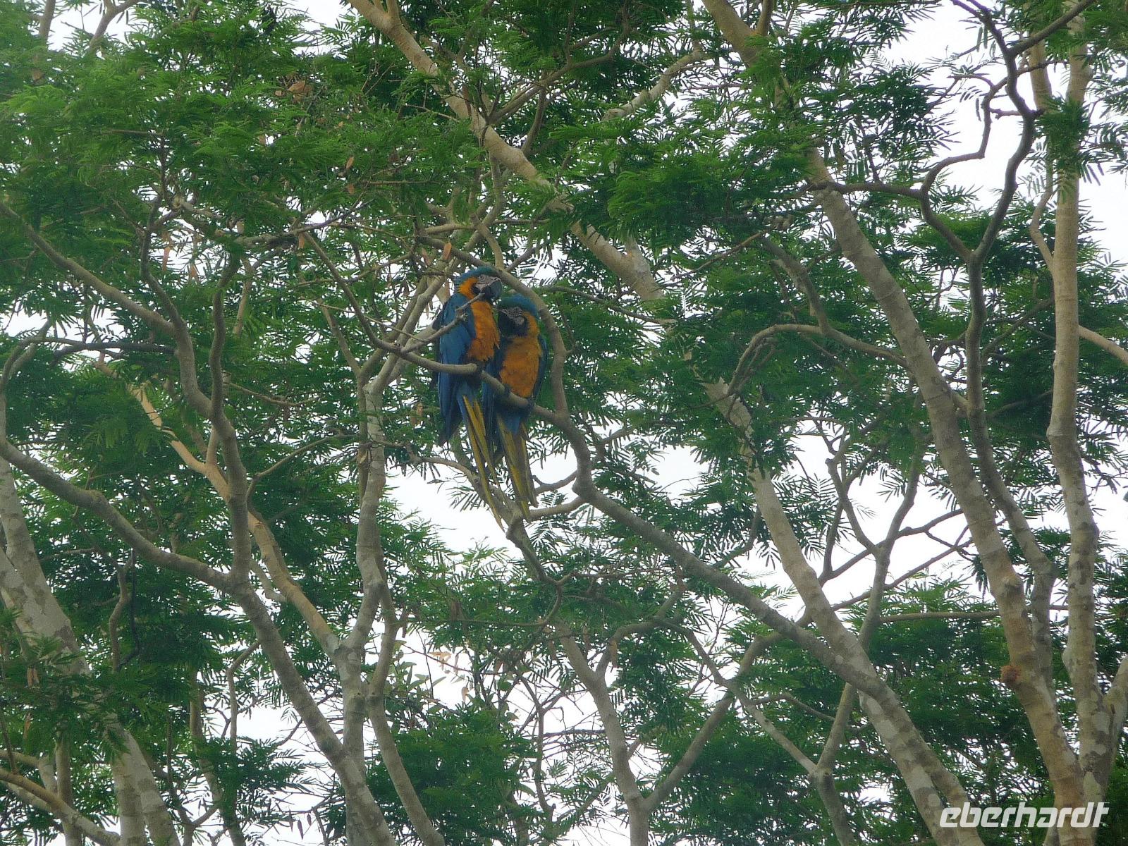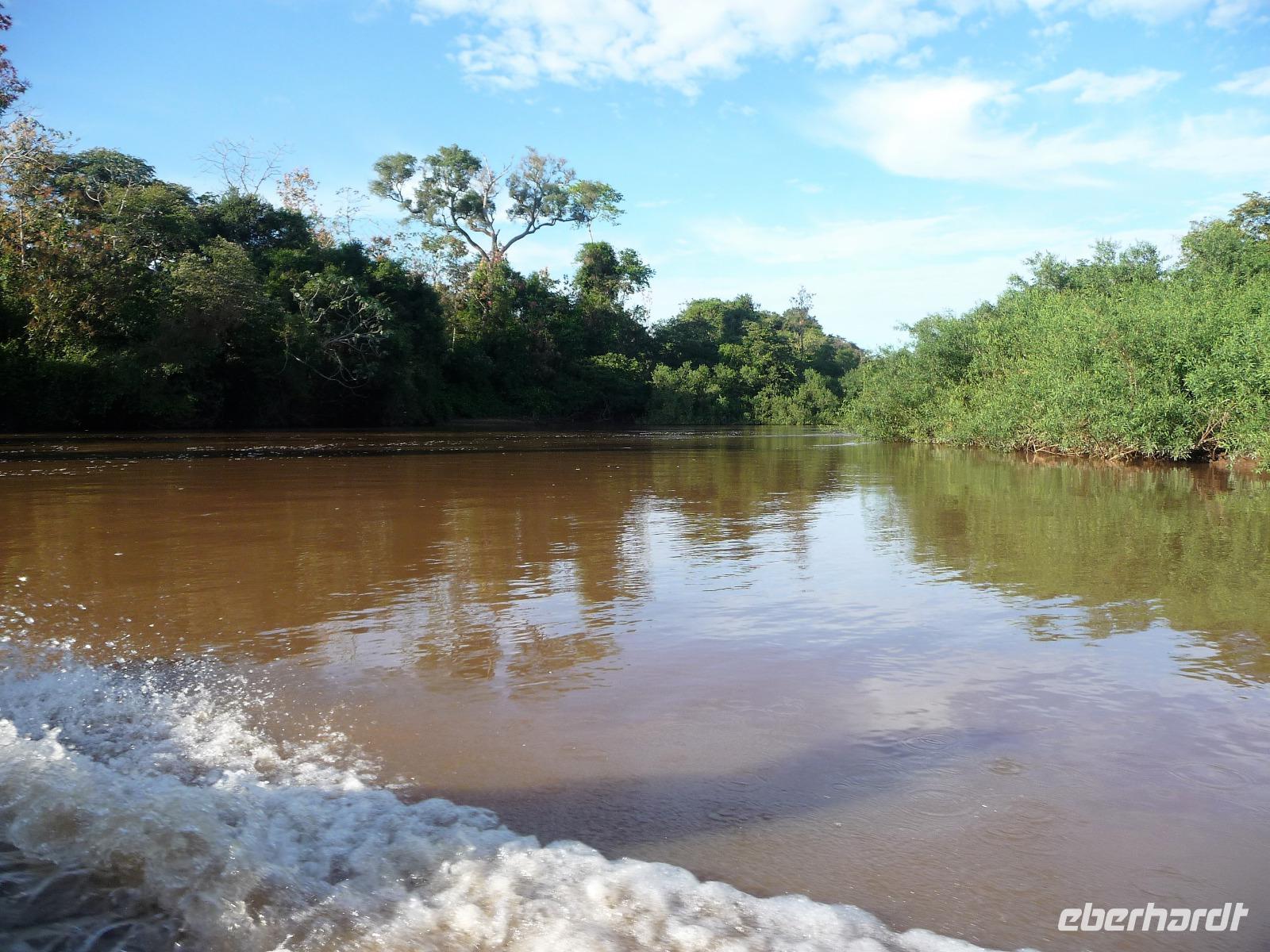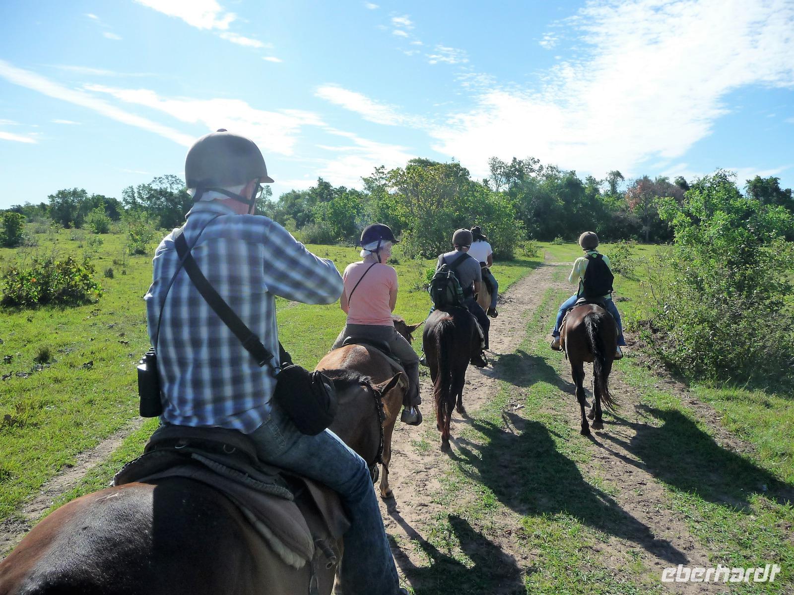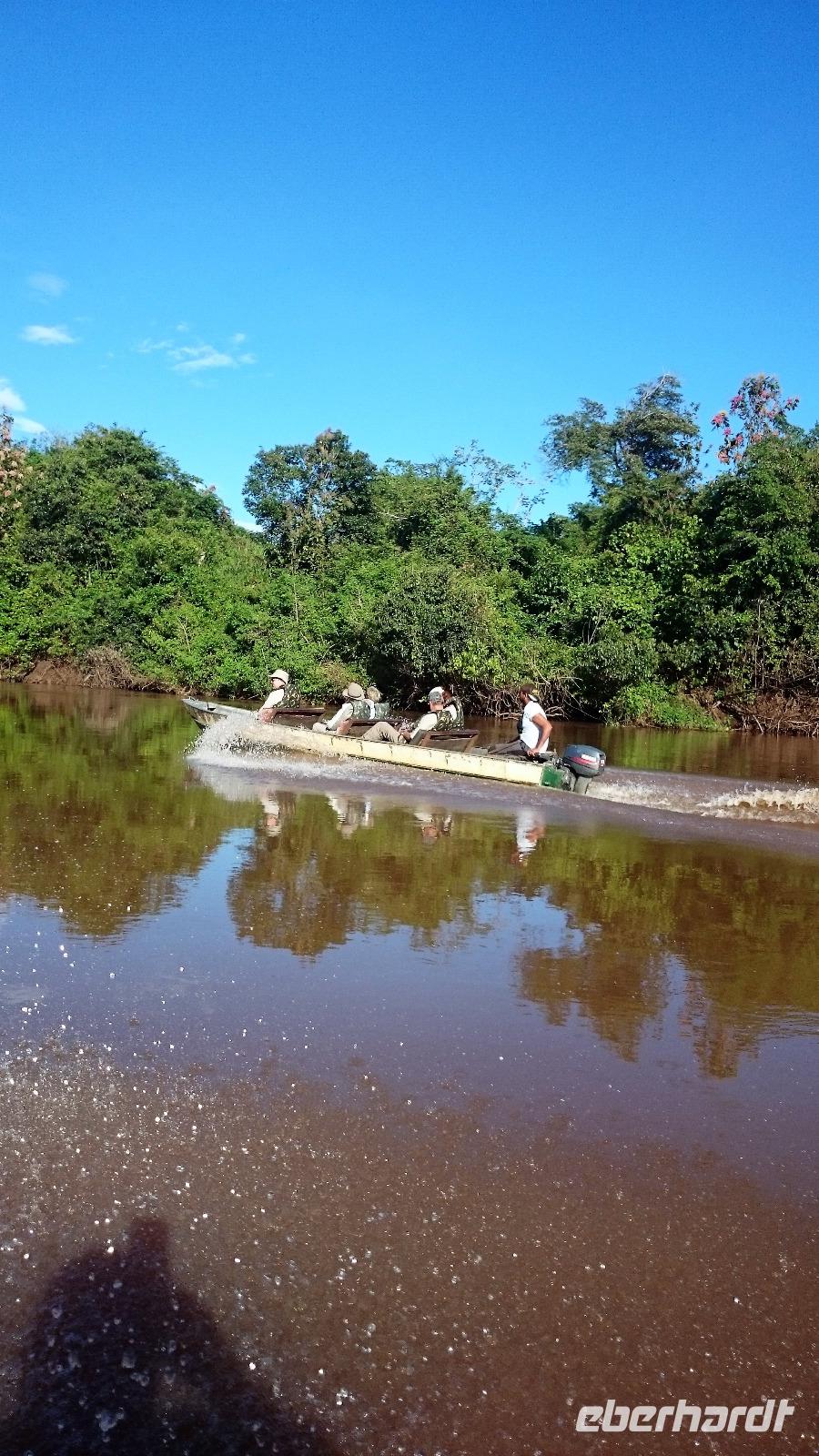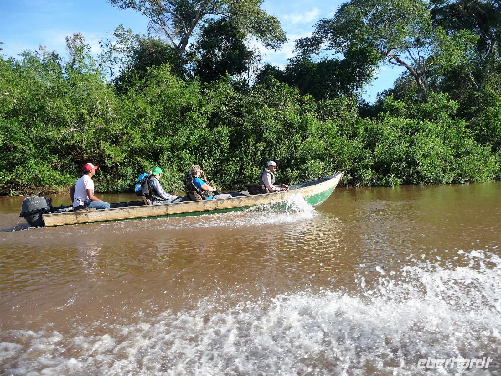 Guten Morgen Sonnenschein! - keine Wolke am Himmel, als wir nach dem zeitigen Frühstück auf unsere Bootstour auf dem Aquidauana-Fluss aufbrachen. In 2 Booten fuhren wir entspannt den Fluss entlang und staunten, welche Vögel es alles zu sehen gibt. Unsere Guides machten uns immer wieder auf Tiere aufmerksam, die unser ungeübtes Auge im Blätterwald überhaupt nicht gesehen hätte. Vor allem Tukane begleiteten uns auf der Fahrt immer wieder. Aber auch sonst, lernten wir wieder viel über die Region des Pantanals, an den Ufern war zu sehen, wie hoch die Unterschiede der Flusstiefe in der Trocken- und Regenperiode sind. Wir waren uns einig, ein wunderschöner Ausflug. Das sonnige Wetter nutzen wir natürlich auch zur Entspannung am Pool. Vaidir hatte noch eine freudig Nachricht, dass Abendessen, welches eigentlich sehr spät in Campo Grande geplant war, konnten wir auf vor die Abfahrt in der Lodge vorziehen und wir durften sogar bis abends in unseren Zimmern bleiben. Aber vorher wollten wir noch das Pantanal auf dem Rücken der Pferde erkunden. Da fast noch niemand von uns vorher auf einem Pferd gesessen hatte, war viel Spaß vorprogrammiert, sowohl auf unserer Seite als auch bei den Guides. Es war erstaunlich wie gut wir uns anstellten, so dass wir sogar zwischendurch eine Pause einlegen und absteigen konnten. Zur Begleitung hatten wir noch eine Kutsche bestellt, damit es für diejenigen, die sich hoch zu Roß nicht ganz so wohl fühlen, mit uns unterwegs sein konnten. Gern hätten wir noch einen schnelleren Trab ausprobiert, aber das war für das erste Mal doch zu viel. Traurig verließen wir die Pousada, wo wir uns richtig eingelebt hatten. Es stand noch eine anstrengende Rückfahrt nach Campo Grand an. Erst nach 23.00 Uhr konnten wir endlich ins Bett fallen. Obwohl das Hotel relativ hellhörig war, schätzten wir am nächsten Morgen nach einer kurzen Nacht sehr, dass es bereits 4.45 Uhr ein gutes Frühstück gab und es zum Flughafen nur 10 min Fahrt waren.