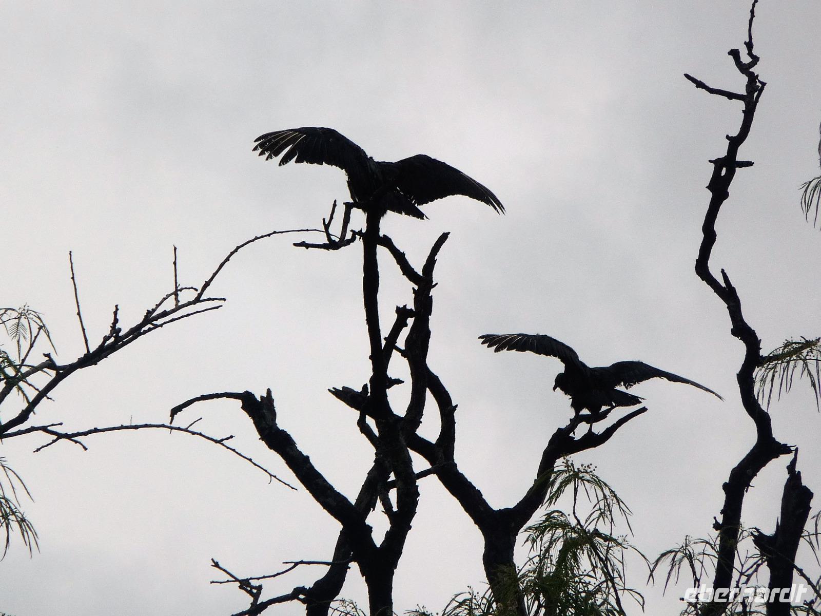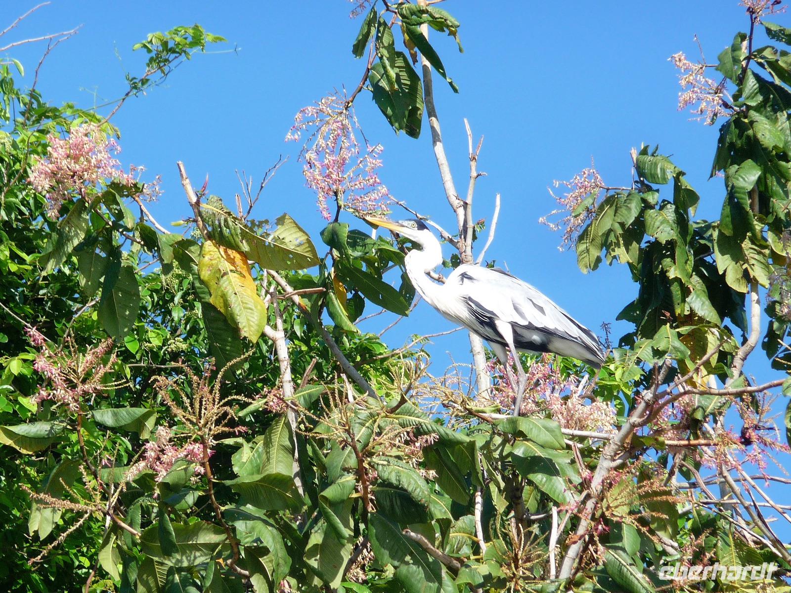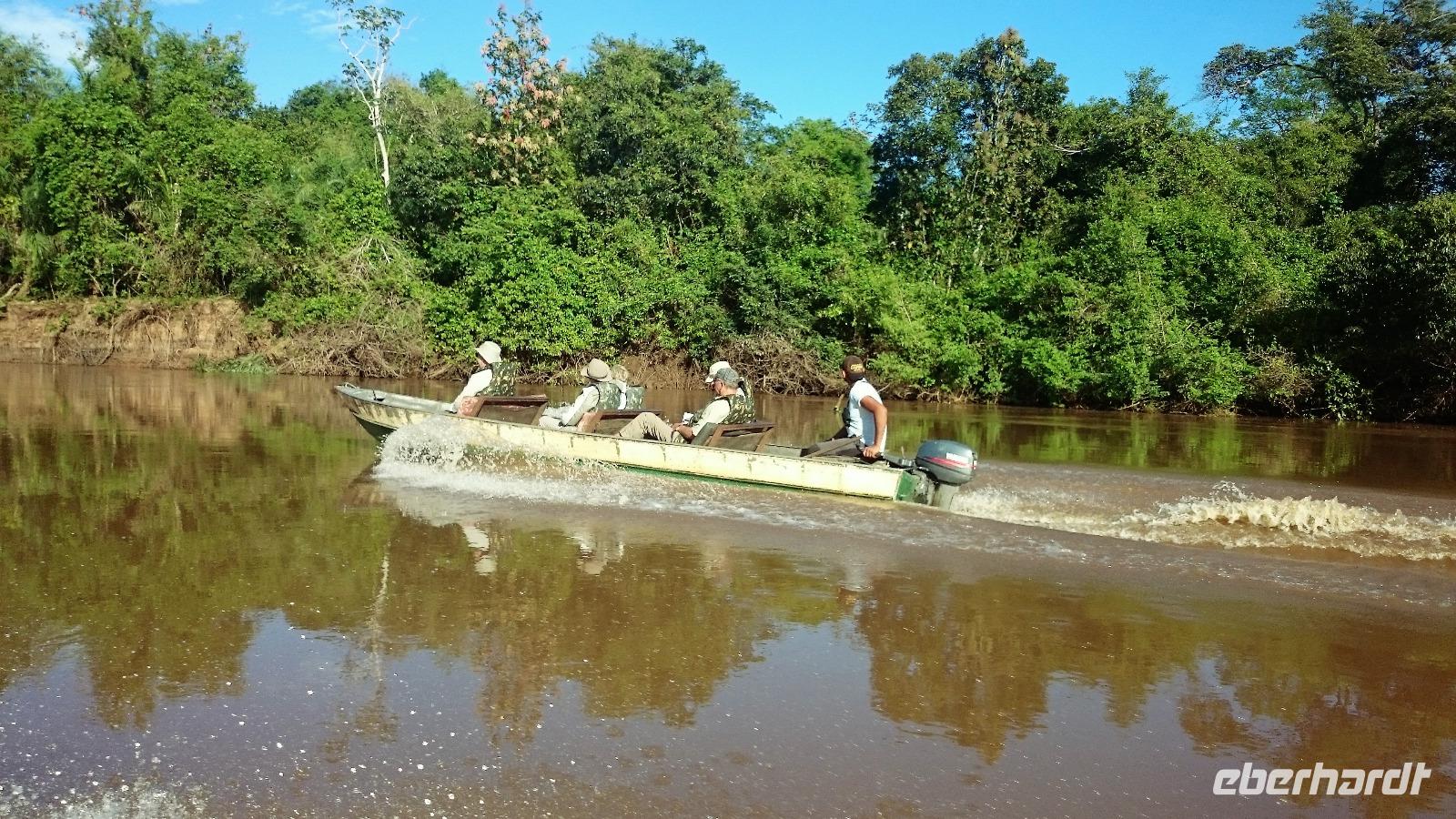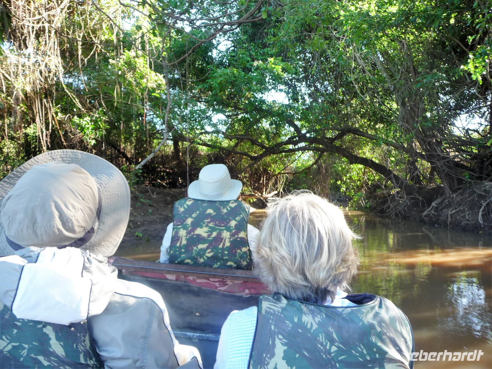 Guten Morgen Sonnenschein! - keine Wolke am Himmel, als wir nach dem zeitigen Frühstück auf unsere Bootstour auf dem Aquidauana-Fluss aufbrachen. In 2 Booten fuhren wir entspannt den Fluss entlang und staunten, welche Vögel es alles zu sehen gibt. Unsere Guides machten uns immer wieder auf Tiere aufmerksam, die unser ungeübtes Auge im Blätterwald überhaupt nicht gesehen hätte. Vor allem Tukane begleiteten uns auf der Fahrt immer wieder. Aber auch sonst, lernten wir wieder viel über die Region des Pantanals, an den Ufern war zu sehen, wie hoch die Unterschiede der Flusstiefe in der Trocken- und Regenperiode sind. Wir waren uns einig, ein wunderschöner Ausflug. Das sonnige Wetter nutzen wir natürlich auch zur Entspannung am Pool. Vaidir hatte noch eine freudig Nachricht, dass Abendessen, welches eigentlich sehr spät in Campo Grande geplant war, konnten wir auf vor die Abfahrt in der Lodge vorziehen und wir durften sogar bis abends in unseren Zimmern bleiben. Aber vorher wollten wir noch das Pantanal auf dem Rücken der Pferde erkunden. Da fast noch niemand von uns vorher auf einem Pferd gesessen hatte, war viel Spaß vorprogrammiert, sowohl auf unserer Seite als auch bei den Guides. Es war erstaunlich wie gut wir uns anstellten, so dass wir sogar zwischendurch eine Pause einlegen und absteigen konnten. Zur Begleitung hatten wir noch eine Kutsche bestellt, damit es für diejenigen, die sich hoch zu Roß nicht ganz so wohl fühlen, mit uns unterwegs sein konnten. Gern hätten wir noch einen schnelleren Trab ausprobiert, aber das war für das erste Mal doch zu viel. Traurig verließen wir die Pousada, wo wir uns richtig eingelebt hatten. Es stand noch eine anstrengende Rückfahrt nach Campo Grand an. Erst nach 23.00 Uhr konnten wir endlich ins Bett fallen. Obwohl das Hotel relativ hellhörig war, schätzten wir am nächsten Morgen nach einer kurzen Nacht sehr, dass es bereits 4.45 Uhr ein gutes Frühstück gab und es zum Flughafen nur 10 min Fahrt waren.