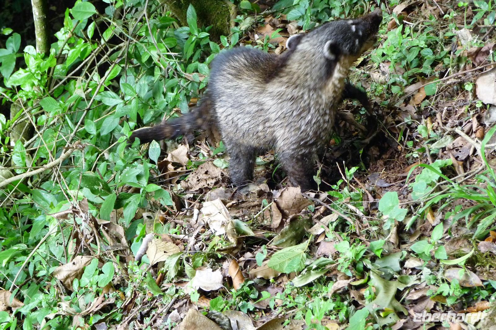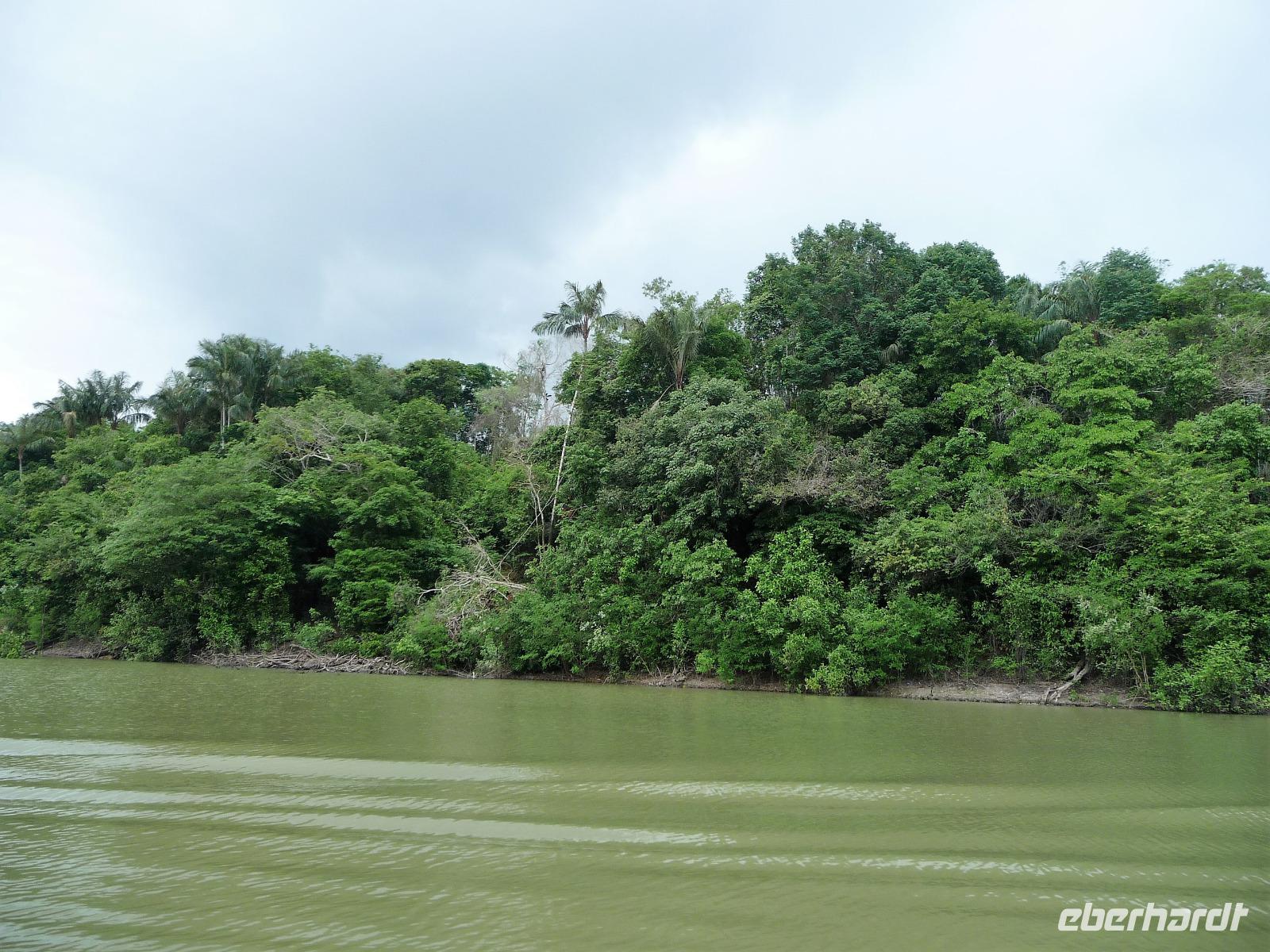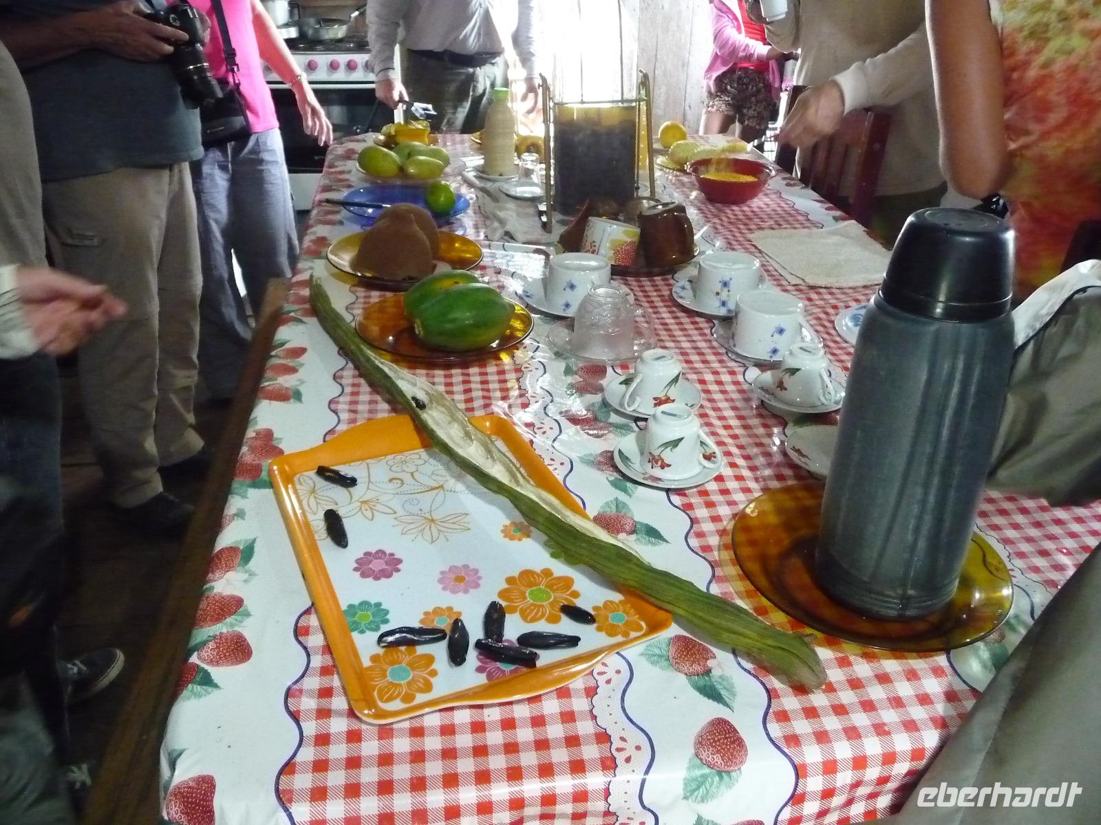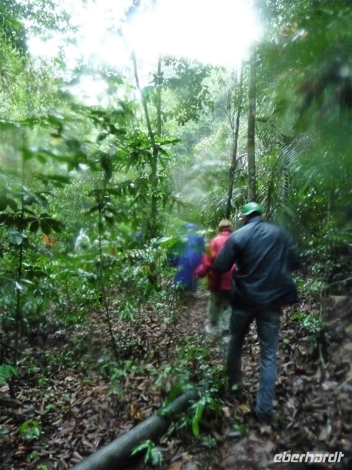 Nach dem Frühstück brachen wir dann zu unserer Regenwaldwanderung auf, die ihrem Namen im wahrsten Sinne des Wortes alle Ehre machte. Kaum verließen wir das Schiff, schon begann es in Strömen zu regnen. Bloß gut, dass wir alle unsere Regencapes dabei hatten, aber so richtig halfen sie auch nicht. Teilweise sahen wir bei unserer Wanderung die Hand vor Augen nicht, nahmen es aber mit Humor und folgten unserem Reiseleiter Jefferson brav auf Schritt und Tritt. Ab und zu machten wir uns Sorgen, als er ohne Vorwarnung im Dickicht des Regenwaldes verschwand, zum Glück tauchte er aber immer wieder auf und brachte uns letztendlich wohlbehalten zurück. Als wir auf dem Schiff ankamen, erklang von super tolle Livemusik. Die Animateure spielten von typisch südamerikanischen Rhythmen bis hin zu AC/DC alles, was zum Tanzen einlud. So mancher von uns, verpasste fast das leckere Mittagsbuffet, was aber auch nicht weiter schlimm war, denn die Crew versorgt uns auch mit kleinen Snacks an Deck und unser Kuchen schmeckte etwas später mit Kaffee um so besser.
