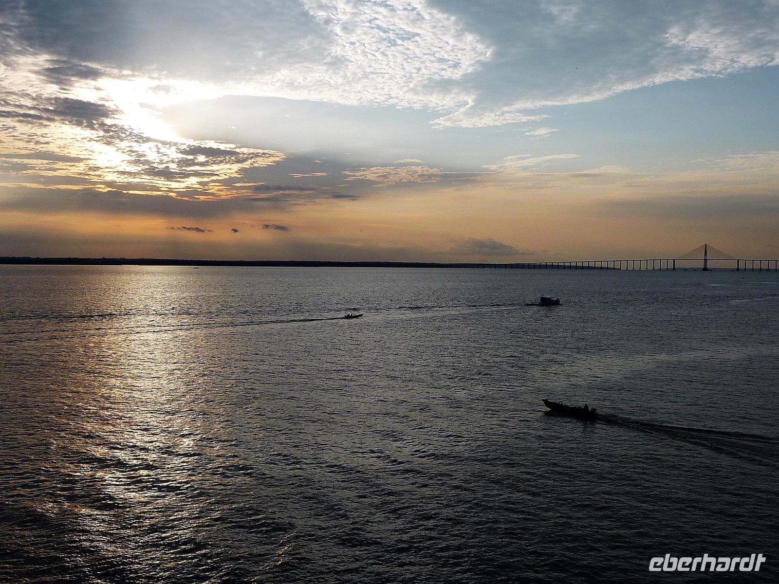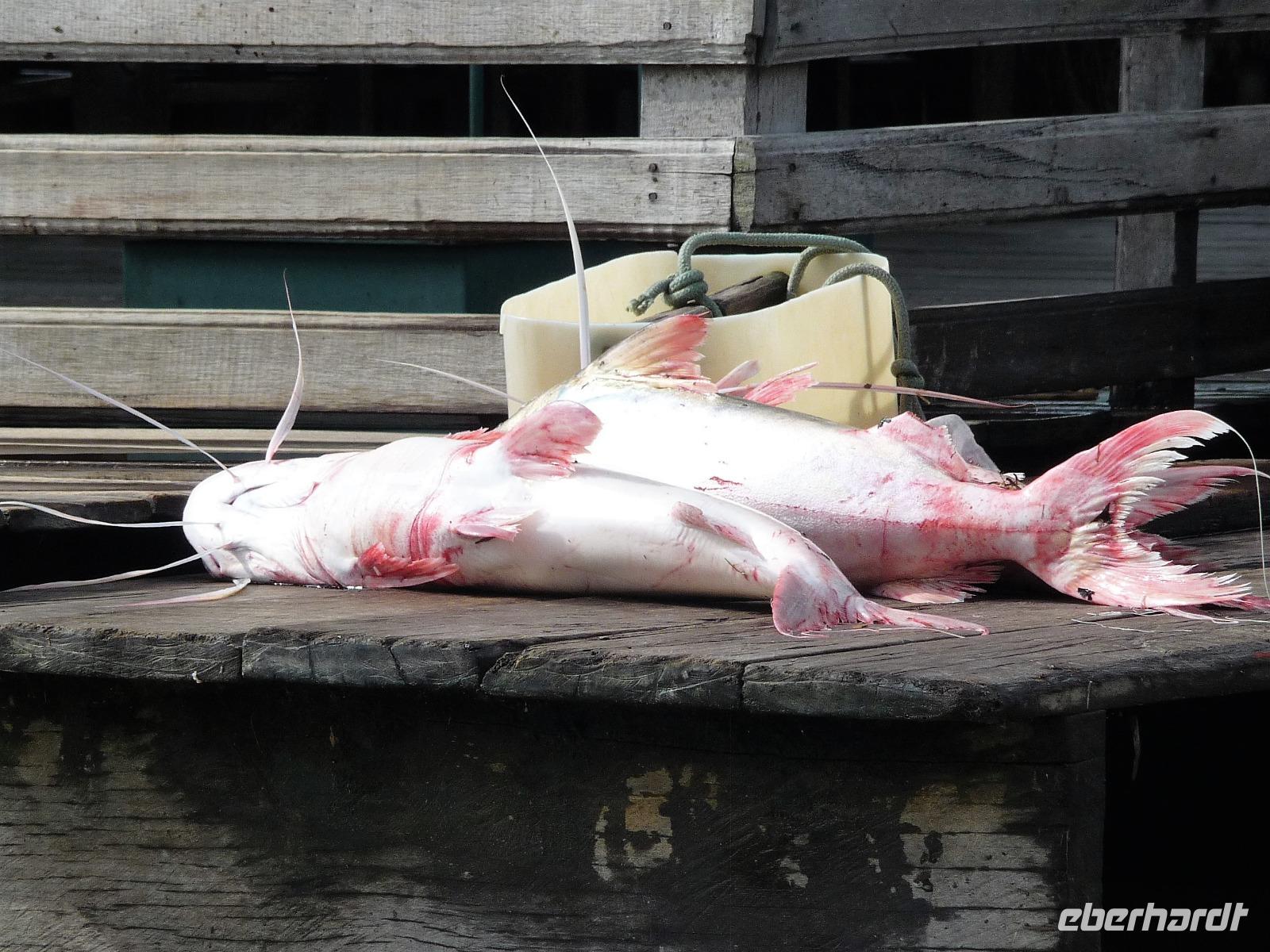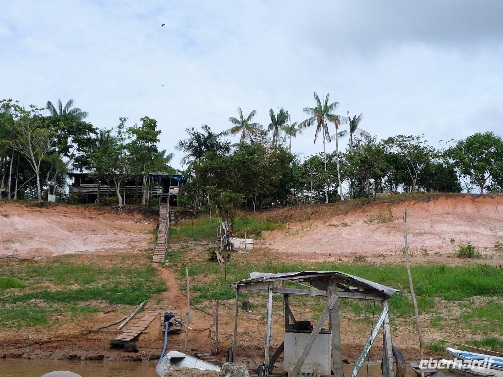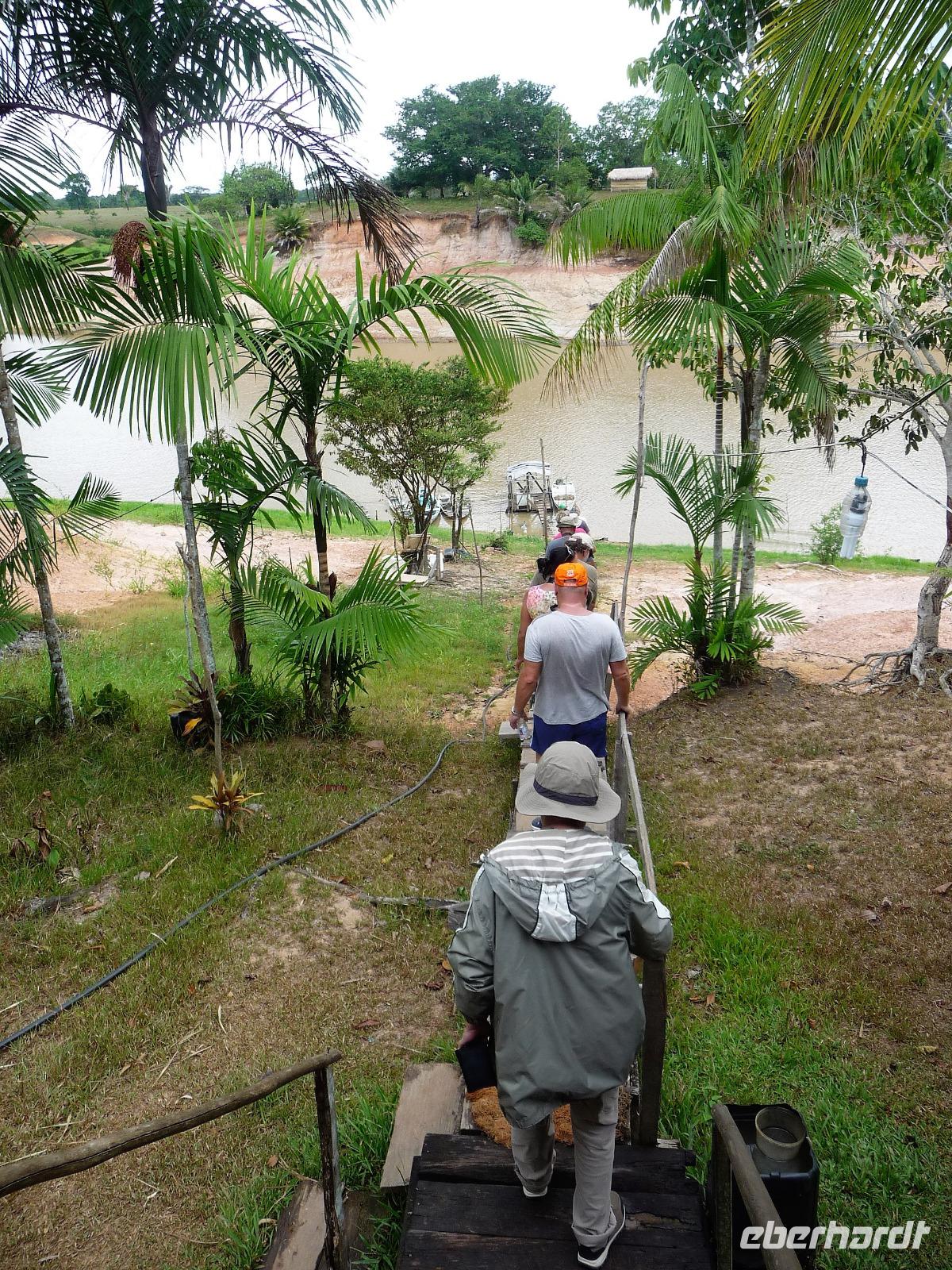 Über Nacht waren wir fast 75 km den Rio Negro und weiter der Rio Solimaos hinaufgefahren. Nach dem ausgezeichneten Frühstücksbüffet starteten wir um 8.00 Uhr zu unserem ersten Ausflug. Gemeinsam mit unserem Guide Jefferson sollte es auf eine einheimische Farm gehen. Herrlich war es den Fahrtwind mitten auf dem Amazonas zu spüren. Eigentlich hatten wir gehofft, am Flussufer einige Tiere zu entdecken, aber dazu ist der Amazonas viel zu breit und die Tiere sind viel zu scheu. Aber auch so war die Fahrt interessant. Bereits auf dem Weg sahen wir die Hausboote der Fischer, die ihre ersten riesigen Fische gefangen hatten und mit der Verarbeitung begannen. Sogar an einem Dorf mit einer kleinen Werft, auf der die Boote repariert wurden, kamen wir vorbei. Hier gab es auch eine Schule, in die die Kinder der Umgebung jeden Tag per Boot fuhren. Auf dem Weg zur am hohen Ufer gelegenen Farm mussten wir zunächst einen schmalen Steg entlang balancieren. Die Farm gehörte der Familie laut Grundbuch und aufgrund ihrer erhöhten Lage war sie auch bei Hochwasser gut geschützt. Wie wir erfuhren bringen hier andere Bewohner in der Regenzeit ihre Tiere her, um sie gegen eine Pacht weiden zu lassen. In einer kleinen offenen Scheune konnten wir eine Yukapresse sehen und bei einem Rundgang entdeckten wir so manche für uns kuriose Frucht. Am Ende des Rundgangs konnten wir sogar verschiedene Früchte probieren. Mittags legten wir eine gemütliche Pause auf dem Schiff ein, um uns fürs Piranha-Angeln am Nachmittag zu rüsten. Mit unserem kleinen "Schnellboot" ging es in ruhigeres Gewässer, um auch wirklich Erfolg beim Angeln zu haben. Alle waren wir mit an Bord und jeder, der die Angel ins Wasser warf, fing - wenn auch mit etwas Geduld - seinen Piranha. Einige von uns waren sogar richtig erfolgreich und es kam fast zu einem Wettangeln, wer die meisten Piranhas an den Haken bekam. Ein lustiges Erlebnis für uns alle! Auf dem Rückweg zum Schiff sahen wir sogar noch einige Flussdelphine und fuhren in die Abenddämmerung hinein. Am Abend hatte sich das Animationsteam etwas besonderes einfallen lassen. Bei herrlicher Panflötenmusik, natürlich live präsentiert, gingen wir auf eine Bilder- und Geschichtenreise entlang des Amazonas. Bei einem Cocktail auf dem Oberdeck ließen wir den Tag gemütlich alle zusammen ausklingen.