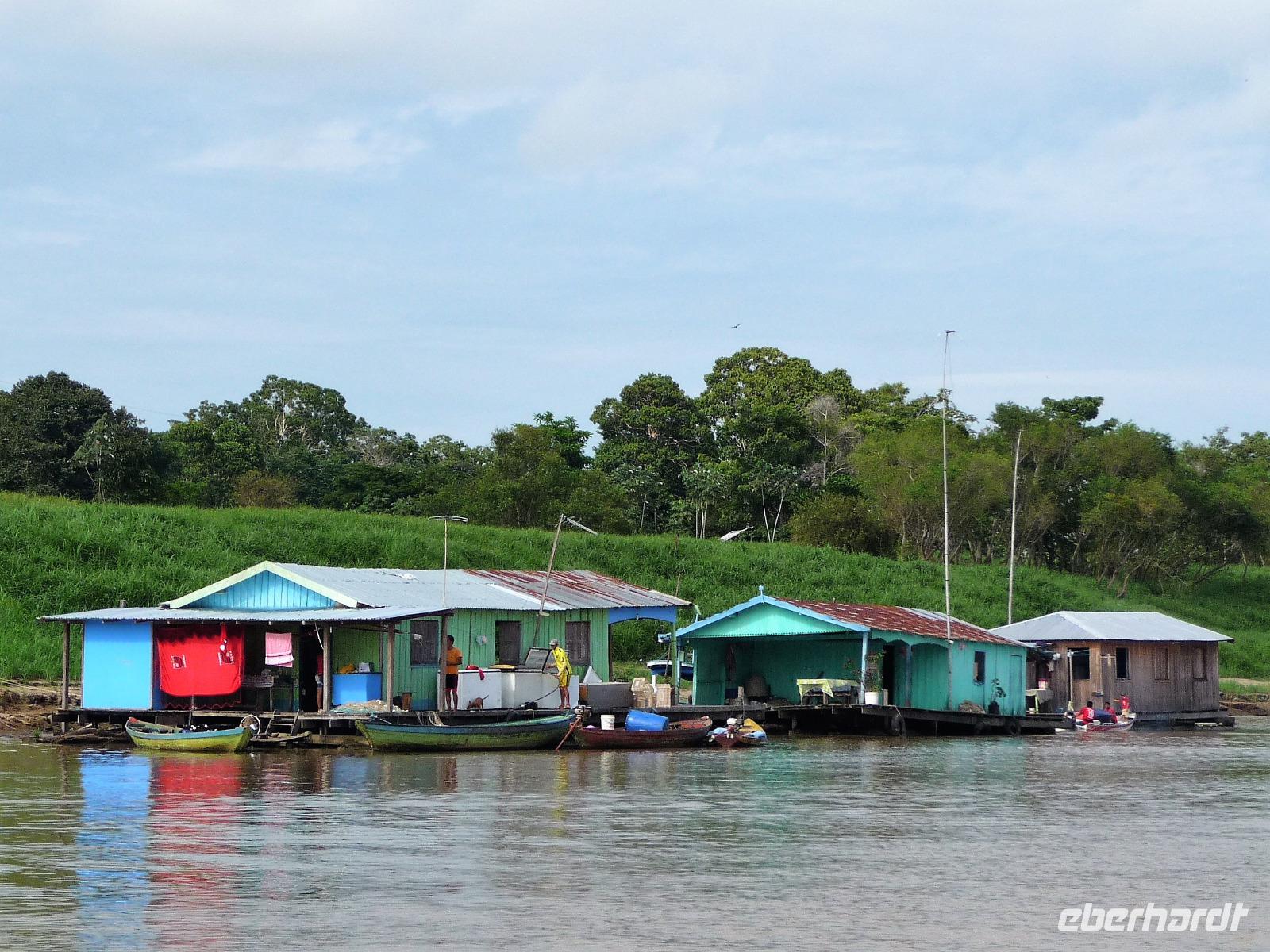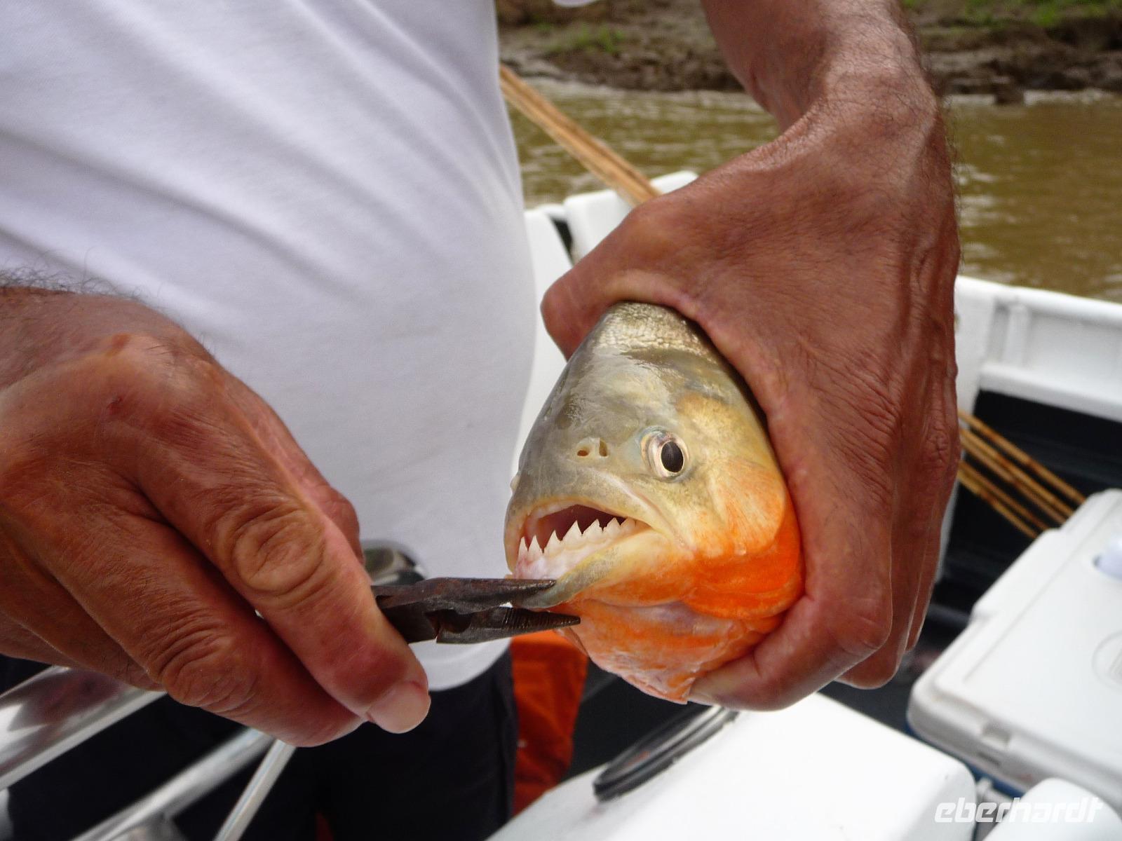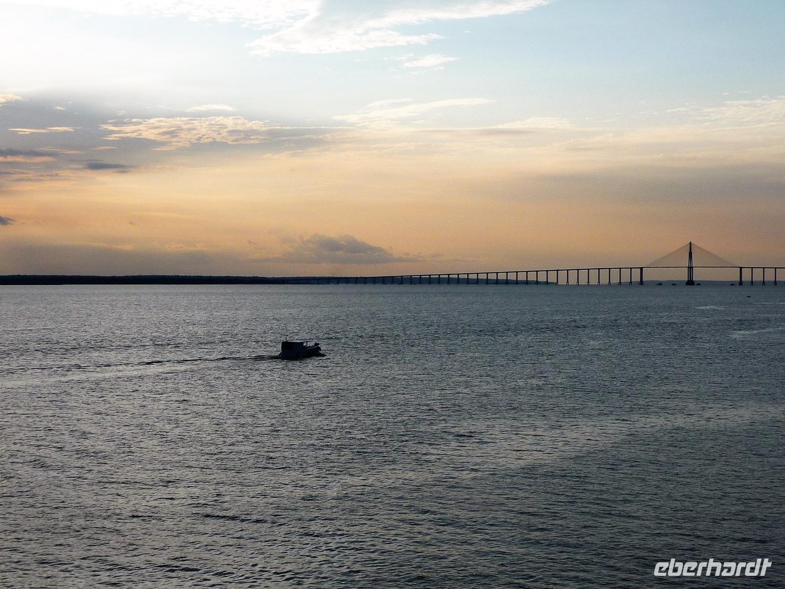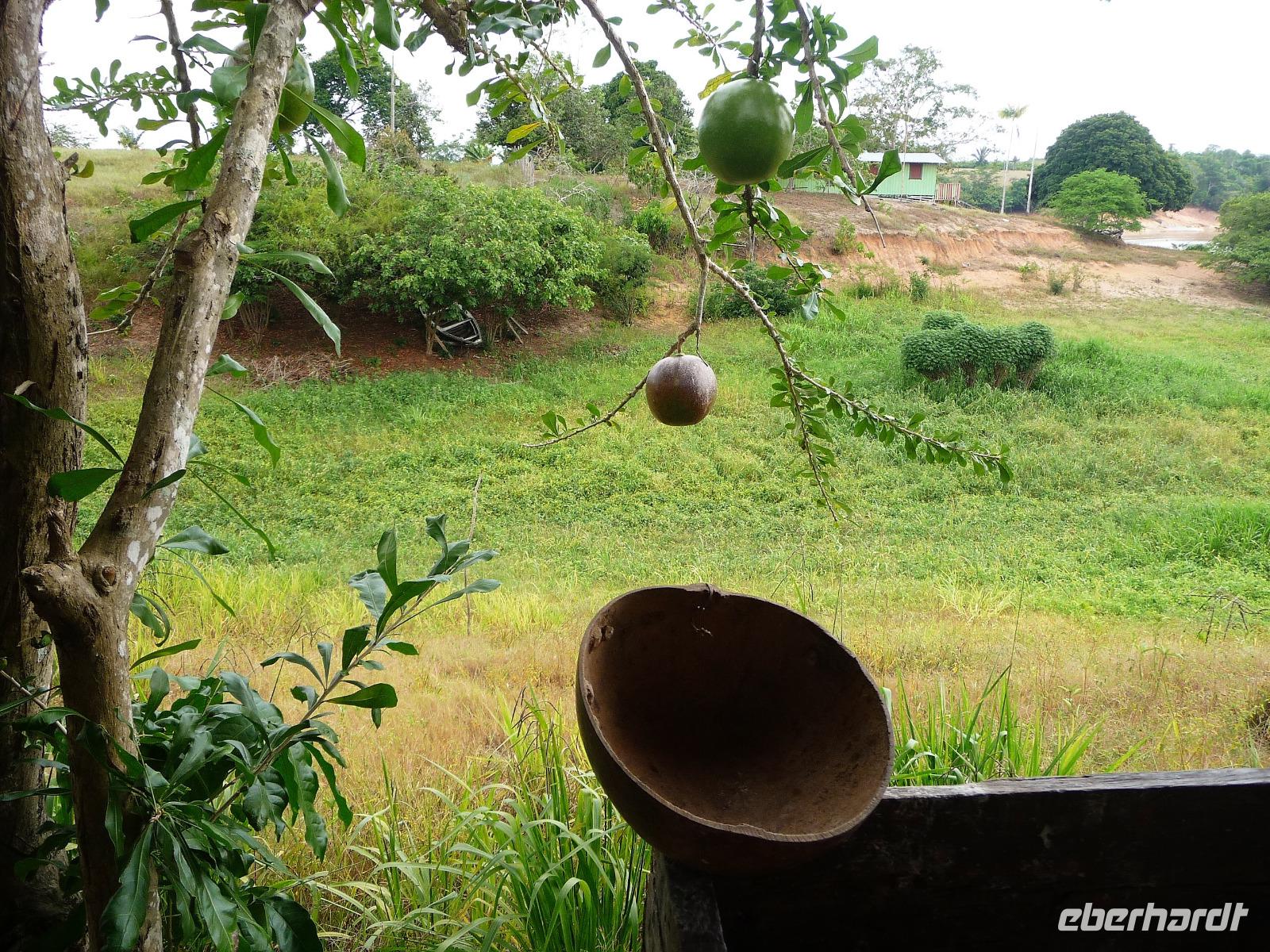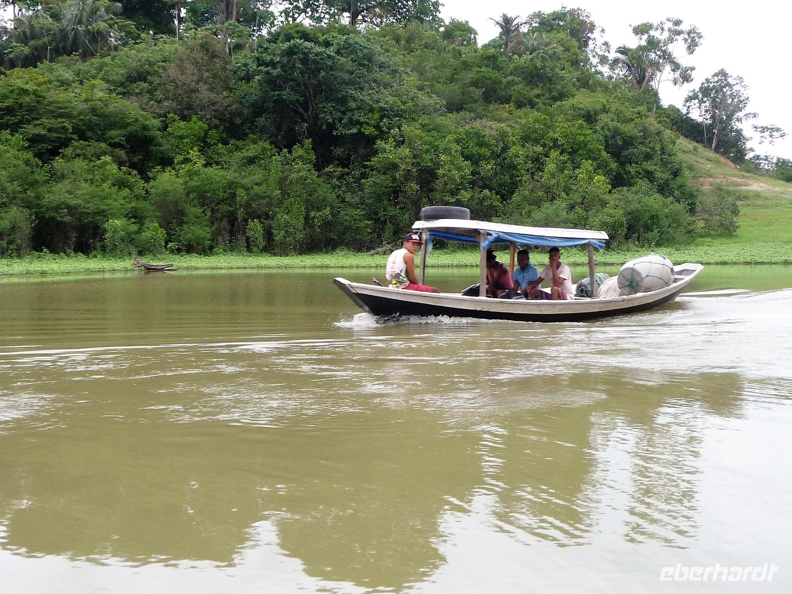 Über Nacht waren wir fast 75 km den Rio Negro und weiter der Rio Solimaos hinaufgefahren. Nach dem ausgezeichneten Frühstücksbüffet starteten wir um 8.00 Uhr zu unserem ersten Ausflug. Gemeinsam mit unserem Guide Jefferson sollte es auf eine einheimische Farm gehen. Herrlich war es den Fahrtwind mitten auf dem Amazonas zu spüren. Eigentlich hatten wir gehofft, am Flussufer einige Tiere zu entdecken, aber dazu ist der Amazonas viel zu breit und die Tiere sind viel zu scheu. Aber auch so war die Fahrt interessant. Bereits auf dem Weg sahen wir die Hausboote der Fischer, die ihre ersten riesigen Fische gefangen hatten und mit der Verarbeitung begannen. Sogar an einem Dorf mit einer kleinen Werft, auf der die Boote repariert wurden, kamen wir vorbei. Hier gab es auch eine Schule, in die die Kinder der Umgebung jeden Tag per Boot fuhren. Auf dem Weg zur am hohen Ufer gelegenen Farm mussten wir zunächst einen schmalen Steg entlang balancieren. Die Farm gehörte der Familie laut Grundbuch und aufgrund ihrer erhöhten Lage war sie auch bei Hochwasser gut geschützt. Wie wir erfuhren bringen hier andere Bewohner in der Regenzeit ihre Tiere her, um sie gegen eine Pacht weiden zu lassen. In einer kleinen offenen Scheune konnten wir eine Yukapresse sehen und bei einem Rundgang entdeckten wir so manche für uns kuriose Frucht. Am Ende des Rundgangs konnten wir sogar verschiedene Früchte probieren. Mittags legten wir eine gemütliche Pause auf dem Schiff ein, um uns fürs Piranha-Angeln am Nachmittag zu rüsten. Mit unserem kleinen "Schnellboot" ging es in ruhigeres Gewässer, um auch wirklich Erfolg beim Angeln zu haben. Alle waren wir mit an Bord und jeder, der die Angel ins Wasser warf, fing - wenn auch mit etwas Geduld - seinen Piranha. Einige von uns waren sogar richtig erfolgreich und es kam fast zu einem Wettangeln, wer die meisten Piranhas an den Haken bekam. Ein lustiges Erlebnis für uns alle! Auf dem Rückweg zum Schiff sahen wir sogar noch einige Flussdelphine und fuhren in die Abenddämmerung hinein. Am Abend hatte sich das Animationsteam etwas besonderes einfallen lassen. Bei herrlicher Panflötenmusik, natürlich live präsentiert, gingen wir auf eine Bilder- und Geschichtenreise entlang des Amazonas. Bei einem Cocktail auf dem Oberdeck ließen wir den Tag gemütlich alle zusammen ausklingen.