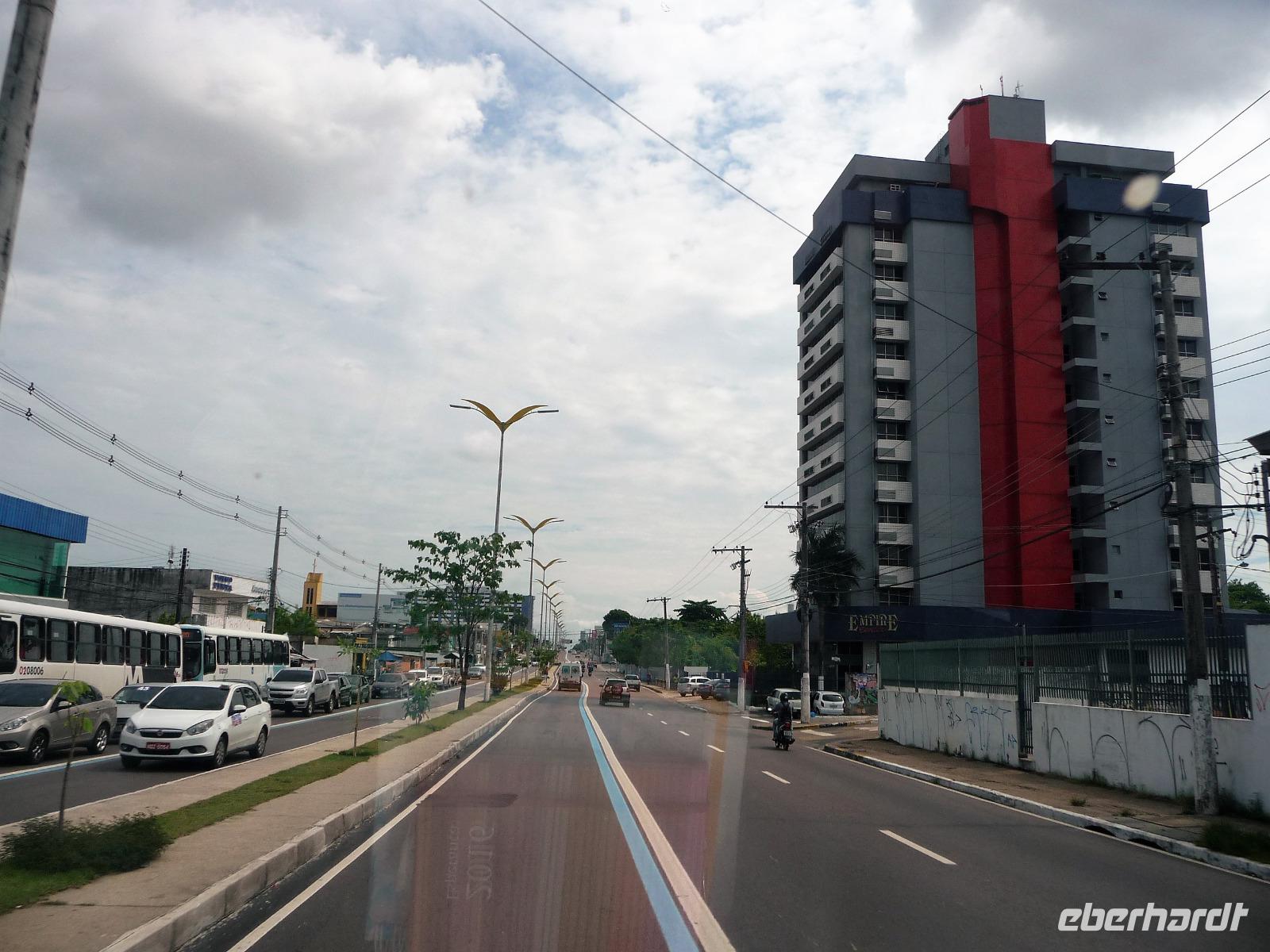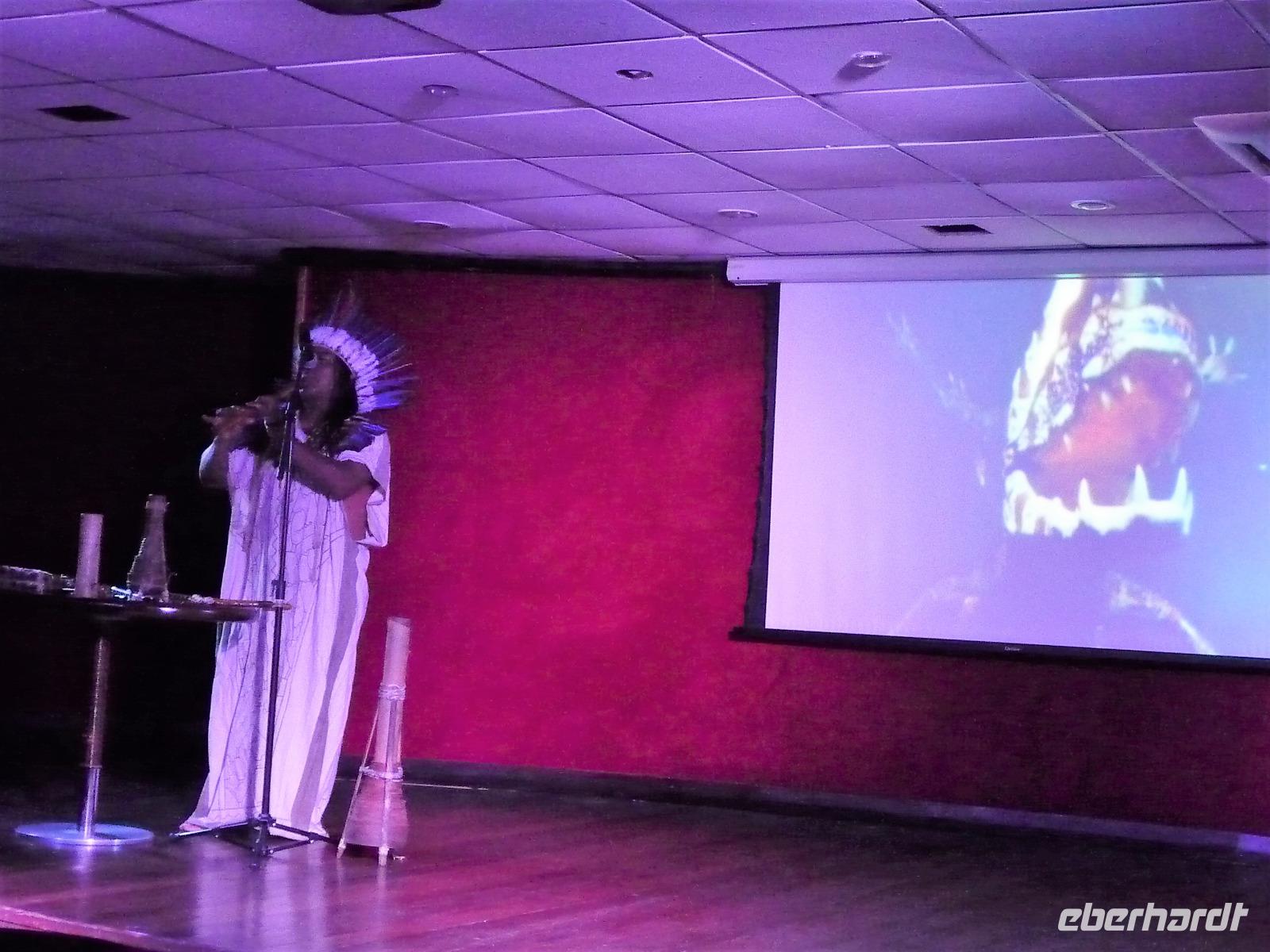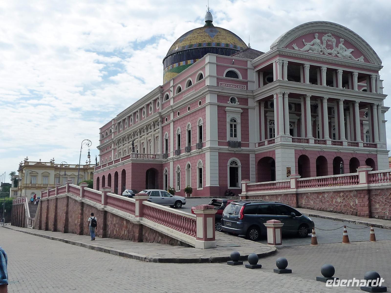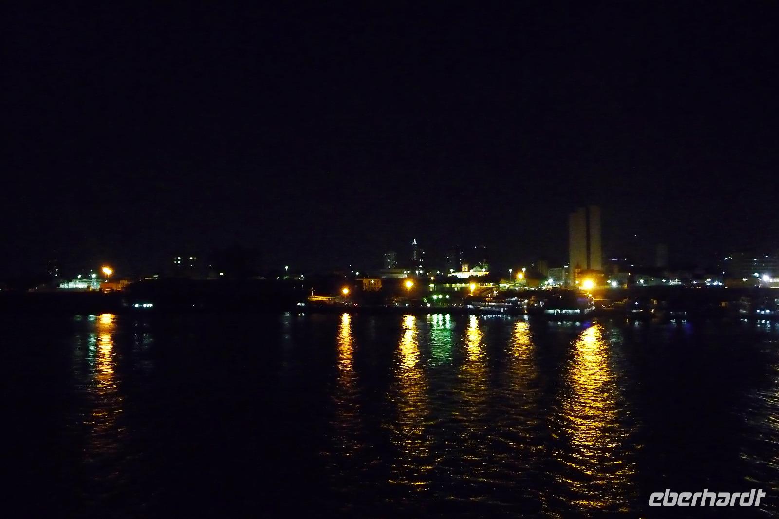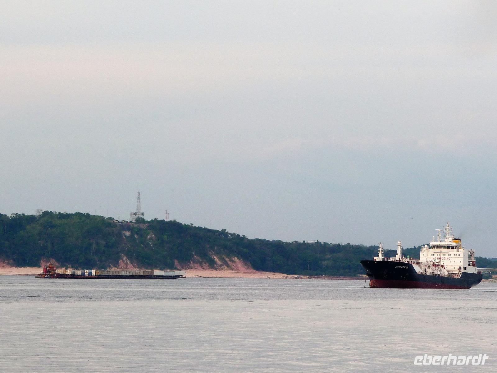 Heute stand unser längster innerbrasilianischer Flug vor uns, mit einem Zwischenstopp auf dem internationalen Flughafen von Sao Paulo ging es in die Urwaldmetropole Manaus. Die Flugzeit von Sao Paolo betrug 4 Stunden. Beim Umsteigen mussten wir daran denken, die Uhr 1 Stunde gegenüber Campo Grande vorzustellen, damit wir rechtzeitig beim Weiterflug waren. In Manaus wurde die Uhr später wieder 2 Stunden zurückgestellt. Ganz schnell hatten wir unser Gepäck und außerhalb des Flughafens wurden wir von Maria bereits erwartet. Da wir noch etwas Zeit hatten, fuhren wir gleich noch zum Opernhaus, da es am Tag unsere Abreise am Montag geschlossen hatte. Uns war gar nicht bewusst, dass Manaus über 2,4 Mio Einwohner hat. Wir erfuhren, wie Manaus nach dem Niedergang der ehemaligen Kautschukhochburg durch die Freihandelszone seine Wirtschaftskraft gewann. Auf dem Weg ins Zentrum fuhren wir am modernen Stadion vorbei, welches extra für die Fußball-WM 2014 anstelle des alten gebaut wurde, obwohl Manaus gar keine Mannschaft in der ersten Liga hat. Vom Opernhaus waren wir alle begeistert, welche tolles Interieur! Man fühlte sich 100 Jahre zurückversetzt. Gern hätten wir eine der Opern im Original gesehen, leider blieb die Zeit dafür nicht. Vor der Oper besichtigten wir noch das Denkmal, welches die bekannten Kontinente zur Zeit des Kautschuks zeigte. Australien war zu dieser Zeit noch nicht entdeckt. Faszinierend fanden wir alle die Fahrt zum Hafen, gern wären wir ausgestiegen und wären durch die quirligen Straßen gebummelt, aber unser Schiff die Iberostar Grand Amazon wartete auf uns. Gegen 15.00 Uhr waren wir am Schiff und wurden freundlich begrüßt. Ein kühler Waschlappen tat bei der schwülen Wärme richtig gut. Schnell füllten wir die Check In Formulare aus und dann durften wir schon unsere Kabinen beziehen. Großzügige Kabinen mit Balkon erwarteten uns. Nur durch die Funktion der Klimaanlage und der Safes mussten wir uns erstmal kämpfen, bis alles klappte. Wer kommt schon auf die Idee, dass die Batterie im Safe nicht korrekt eingesetzt ist. So schnell wie möglich erkundeten wir das Oberdeck und den Pool, bevor wir unser erstes gekühltes Getränk genossen. Dabei besprachen wir auch gleich, an welchen Ausflügen wir teilnehmen wollten. Schnell einigten wir uns und bis auf den zeitigen Ausflug zum Sonnenaufgang waren immer alle mit von der Partie. Kurz nach 18.00 Uhr hieß es Leinen los und wir starteten gespannt von Manaus Richtung Rio Solimaos. Eine Stunde später erhielten wir nochmal einige Informationen zu den Ausflüge und zu den Sicherheitsvorkehrungen an Bord. Danach hatten wir ganz schön zu tun, rechtzeitig bei Abendessen zu sein. Obwohl die runden Tische nur für 7 Personen gedacht waren, fanden wir alle zusammen zu neunt Platz an einem Tisch. Für die nächsten Tage bekamen wir das ok, den „Captains-Tisch" für unsere Gruppe zu reservieren. Wir staunten nicht schlecht ob des tollen Buffets und schafften es nicht, alles zu probieren.