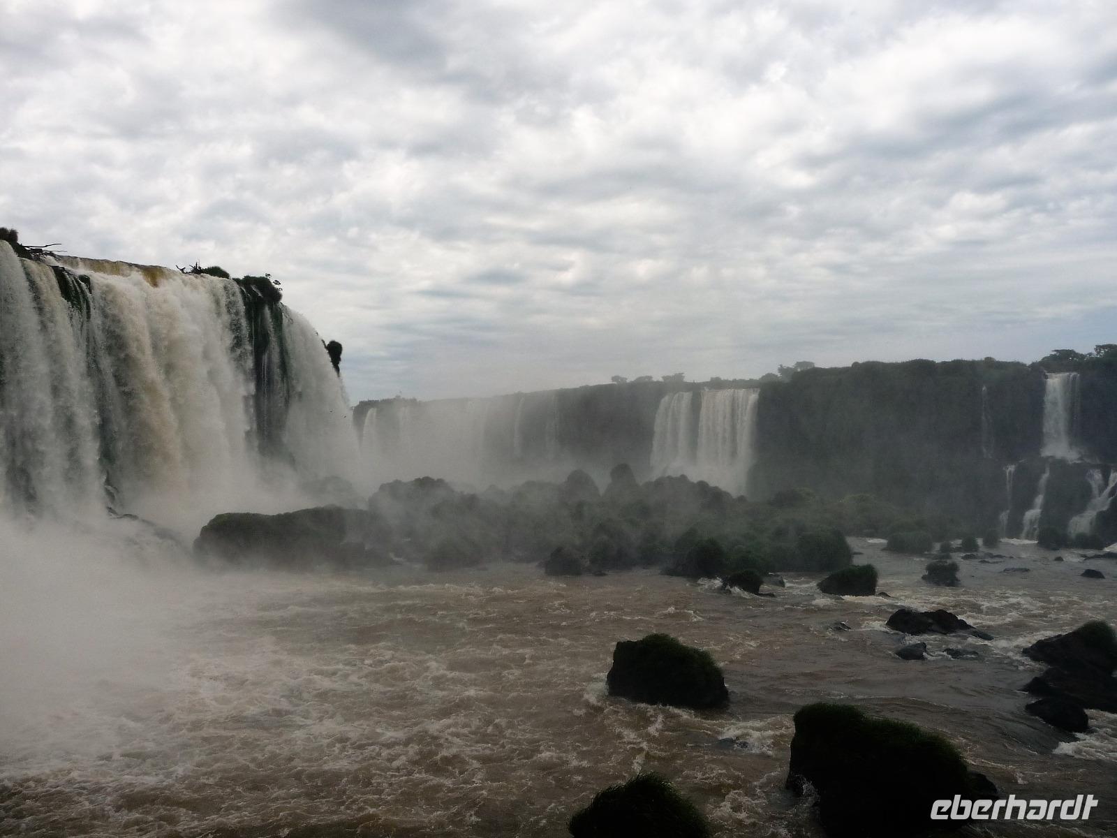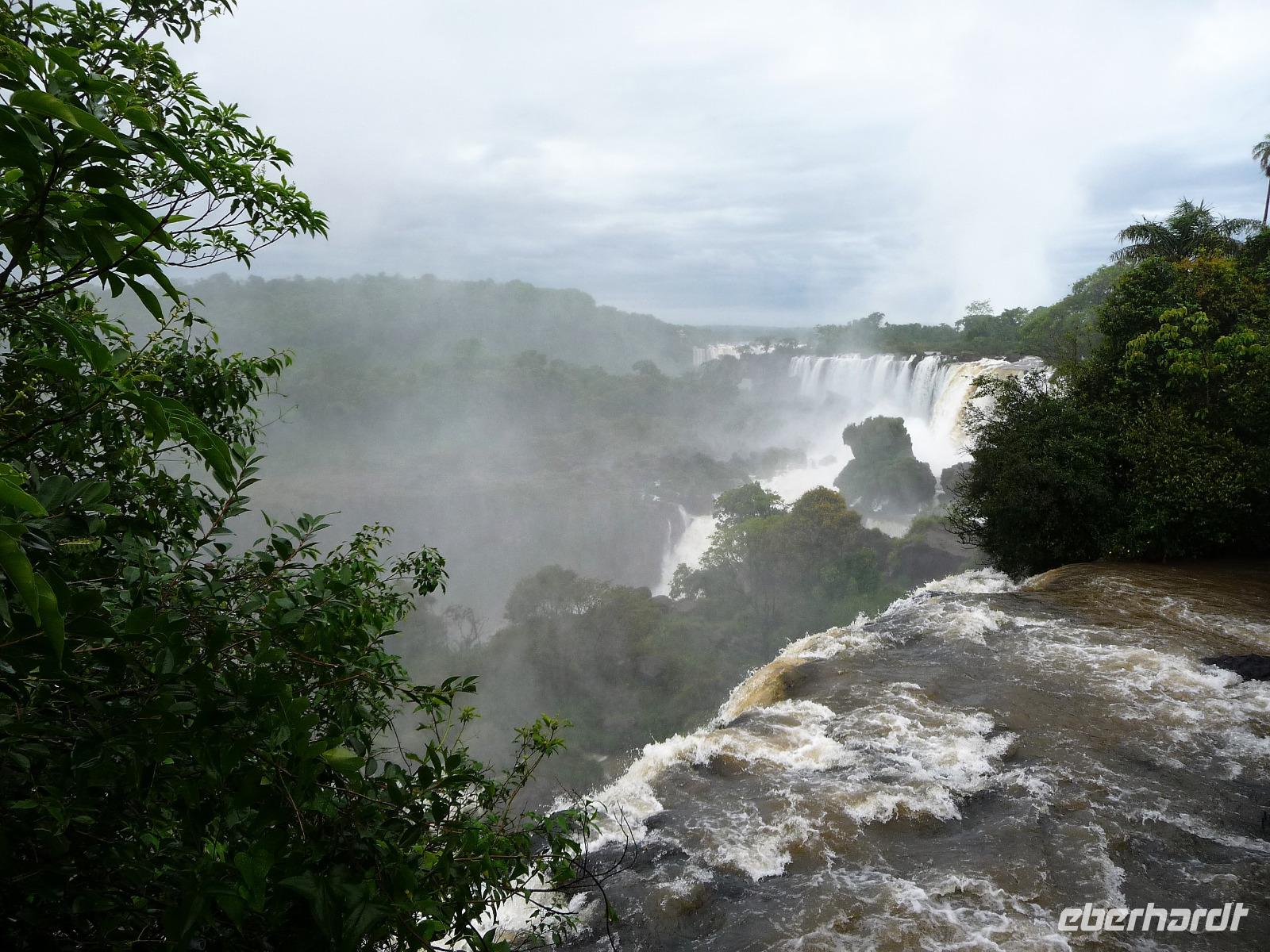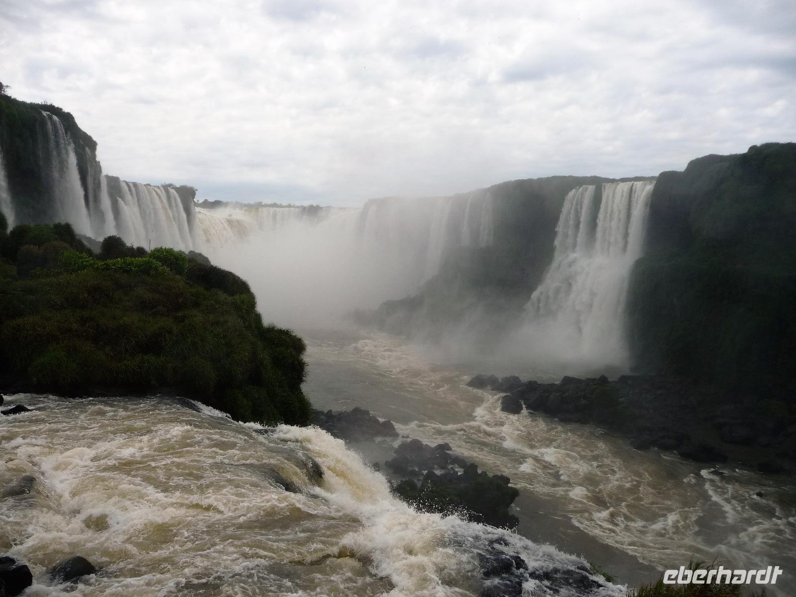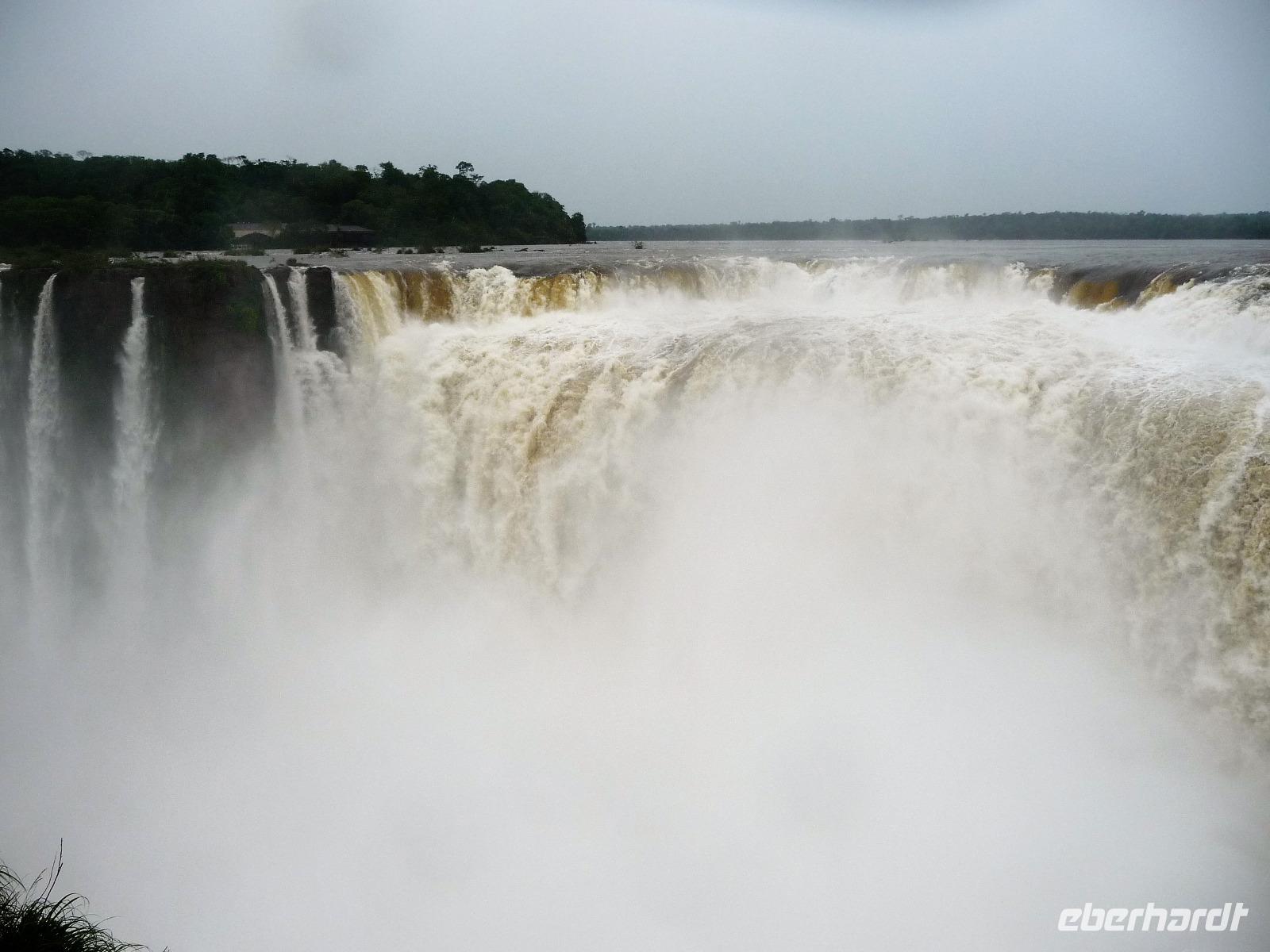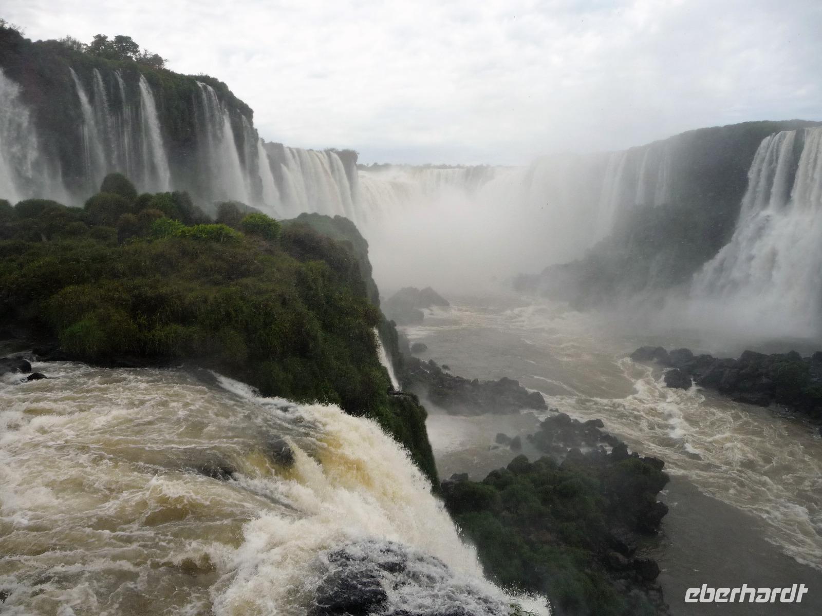Da es am Vortag so heiß war, hatten wir unseren Ausflug auf die argentinische Seite der Wasserfälle vorverlegt und starteten bereits zeitig, um die Mittagshitze und die eventuellen Warteschlagen an der Grenze möglichst zu umgehen. Bereits in der Nacht gab es heftige Regenfälle und Hitzegewitter und der Regen sollte uns auch noch einen Teil des Tages begleiten. Aber wir waren gespannt, welche der Seite - die brasilianische oder die argentinische Seite - denn nun die schönere sein sollte. Unproblematisch konnten wir ohne viel Wartezeit die Grenze überqueren und waren schon einige Minuten vor der Öffnung des Parks am Eingang. Immer wieder bekräftigten wir unsere Zuversicht, dass es bestimmt ganz bald mit dem Regen aufhören würde. Man muss einfach nur Geduld haben! Mit dem kleinen Bummelzug fuhren wir bis zur Endstation und machten uns auf den Weg zum "Garganta del Diablo", dem "Teufelsschlund". Welch ein Tosen hörten wir bereits von der Ferne. Noch konnten wir uns nicht vorstellen, vor welchen Wassermassen wir gleich stehen würden. Immer näher kam das Donnern des Wassers und dann eröffnete sich ein gigantischer Ausblick. Durch den vielen Regen in den letzten Stunden, war der Iguazufluss schnell angeschwollen und entsprechend hoch war die Wassermenge, die sich über die Fälle ergoß. Fasziniert rückte man immer näher an die Absperrungen und vergaß regelrecht, dass man - wenn es denn möglich war - durch die Gischt noch nasser wurde. Aber egal, ein gigantisches Erlebnis, dass man so schnell nicht wieder haben sollte. Ein ganz anderes Erlebnis war dann der Rundweg. Hier sahen wir die Iguazu-Fälle nochmal in ganz anderen Perspektiven und endlich lichteten sich auch die dunklen Wolken und die ersten Sonnenstrahlen des Tages durchbrachen den Regen. Gleich machte es doppelt so viel Freude, die immer neuen Aussichtspunkte zu genießen. Wir waren uns einig: der richtige und passende Abschluss unserer Reise! Am Nachmittag plünderten wir nochmal das Büffet des kleinen Restaurants vom Vortag, kauften ein paar letzte Souvenirs, spazierten nochmal den kleinen Rundweg des Hotels bis zum Aussichtspunkt und trafen uns nochmal am Pool. Gemütlich ging der Tag nach dem Abendessen bei einem letzten Drink in der Bar des Hotels zu Ende.